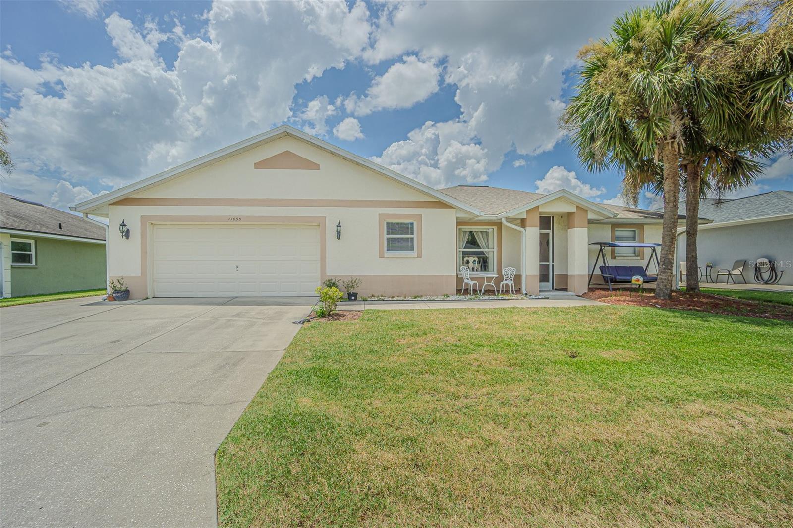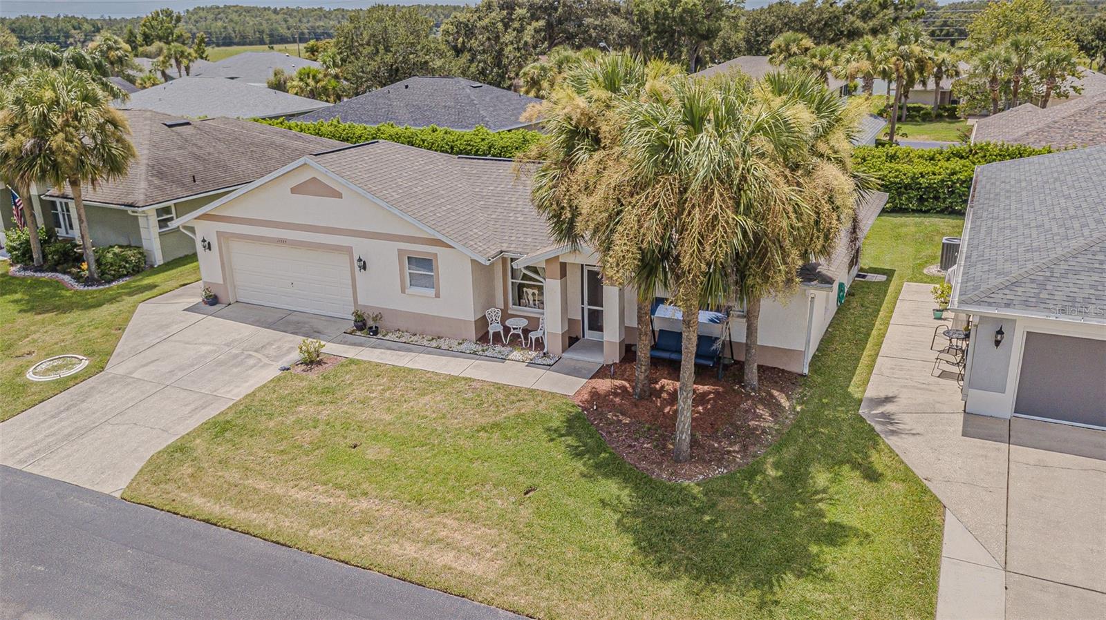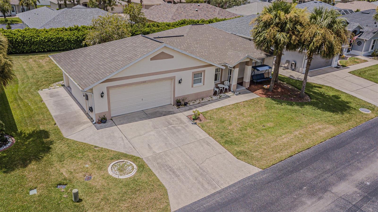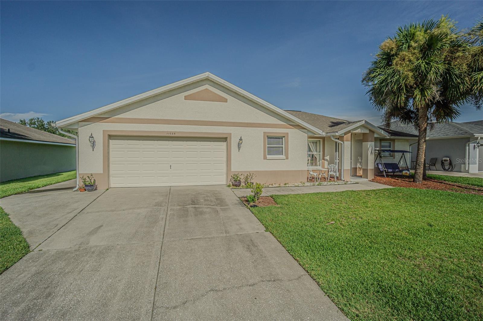 Live the RESORT Lifestyle in this updated 2-bedroom, 2-bath home located in the highly sought after 55+ gated community of Tampa Bay Golf & Tennis Club! Situated on an oversized lot, this modified Riviera model offers a thoughtfully expanded great room floor plan and a rare side-entry golf cart garage. The home boasts cathedral ceilings, double-pane windows, and a fully enclosed Florida room with vinyl windows... perfect for enjoying your morning coffee or entertaining guests overlooking your private backyard. Screened front entry welcomes you and once inside you will be greeted with a Light, Bright, OPEN floorplan with Cathedral ceilings. The U-shaped kitchen offers a window over the sink overlooking the front landscape, white cabinets with contrasting drawers for added storage, breakfast bar OPEN to dining area plus a closet pantry. All appliances are included... Stainless steel refrigerator, smooth top range, dishwasher, counter microwave, washer/dryer, as well as all window treatments and upgraded ceiling fans. The new garage door opener comes with two transmitters for added convenience. Split bedroom layout ensures privacy for both homeowners and guests with the cathedral ceiling, SPACIOUS Great room in the center to make entertaining a breeze! Great room and spacious primary suite features sliding glass doors to enclosed lanai, with spacious walk-in closet and a bath ensuite off the primary bedroom, featuring a walk-in shower, while the guest bath offers a tub/shower combo. Modified Rivera plan includes an inside utility closet off the kitchen instead of the washer and dryer in the garage. Major upgrades include a brand NEW ROOF in August 2023 with a limited lifetime warranty, newer A/C unit (August 2023) with a 5-year warranty plus a Culligan whole-house water softener system (owned, not leased). Additional highlights include gutters, an extra-wide driveway, screened-in entry and lanai areas under roof, creating cross breezes and wonderful outdoor living space. This Move in Ready property offers fantastic value, with a lot large enough to add your own private pool. Residents of Tampa Bay Golf & Tennis Club enjoy access to two championship golf courses, 15,000 sq. ft. clubhouse, heated community pool, full-service restaurant and bar, fitness center, library, billiards, shuffleboard, poker tables, two dog parks, and a vibrant calendar of social clubs and activities including dance lessons, painting, crafts... in addition to planned onsite entertainment, dinner shows and travel excursions. This is your opportunity to enjoy RESORT SYTLE living in a tranquil yet active community—perfect for downsizing or retiring in comfort. Located just North of Tampa with easy access to Ocala, Orlando, Tampa, Lakeland, Wesley Chapel, International airports or the beaches! CALL TODAY!