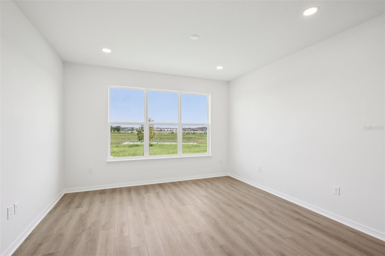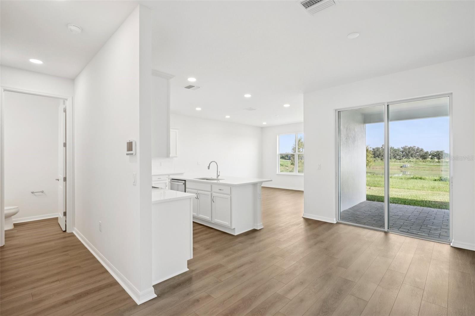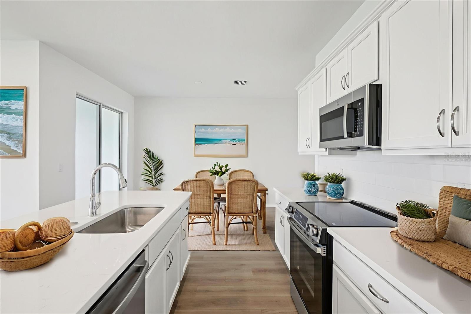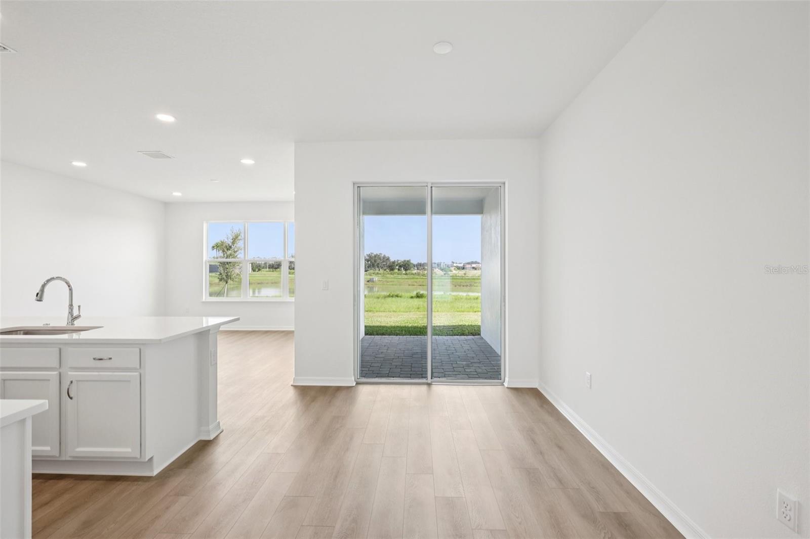 Enjoy bright, modern living in this beautifully finished 3-bedroom, 2.5-bath Aruba townhome with a 2-car garage, located in the gated Isla Mirada community within the Mirada master-planned development. With a fresh, light interior design and peaceful wetland views, this home offers both comfort and style in a low-maintenance setting. Inside, you’ll find luxury vinyl plank flooring throughout—no carpet—plus soaring ceilings and large windows that fill the home with natural light. The kitchen is finished cabinetry, light quartz countertops, and a designer backsplash, creating a clean and inviting space that flows into the open-concept living and dining areas. Upstairs, three generously sized bedrooms include a serene primary suite with modern finishes and two versatile guest rooms or work-from-home options. Outside, your private lanai overlooks tranquil water views with no rear neighbors—perfect for enjoying peaceful mornings or winding down in the evenings. With access to resort-style amenities and just a short walk from the 15-acre Mirada Lagoon, this home offers the best of Florida living in one of Pasco County’s fastest-growing communities.