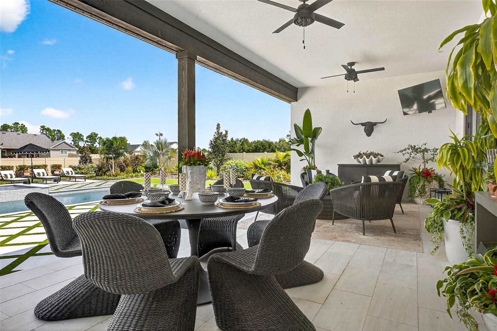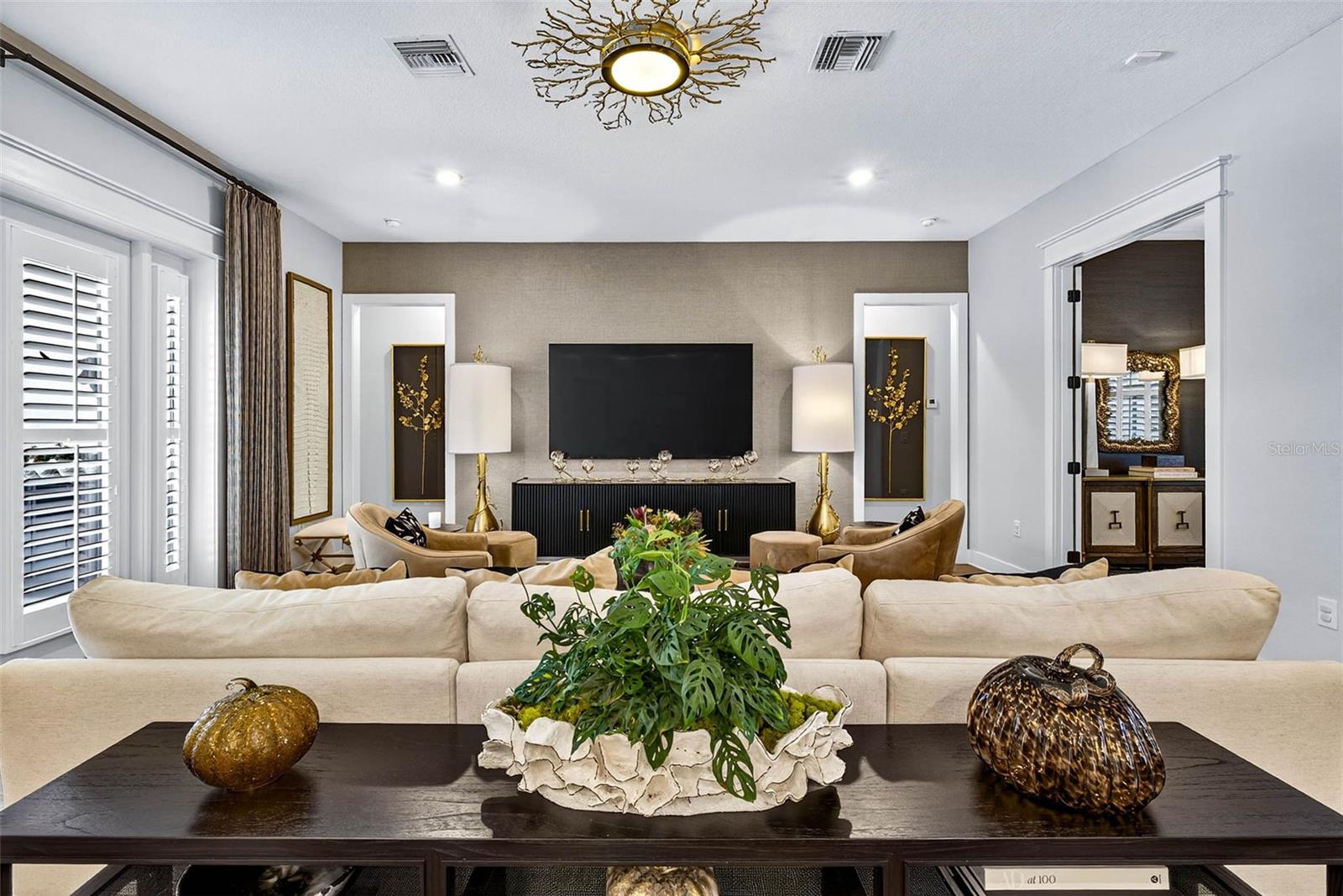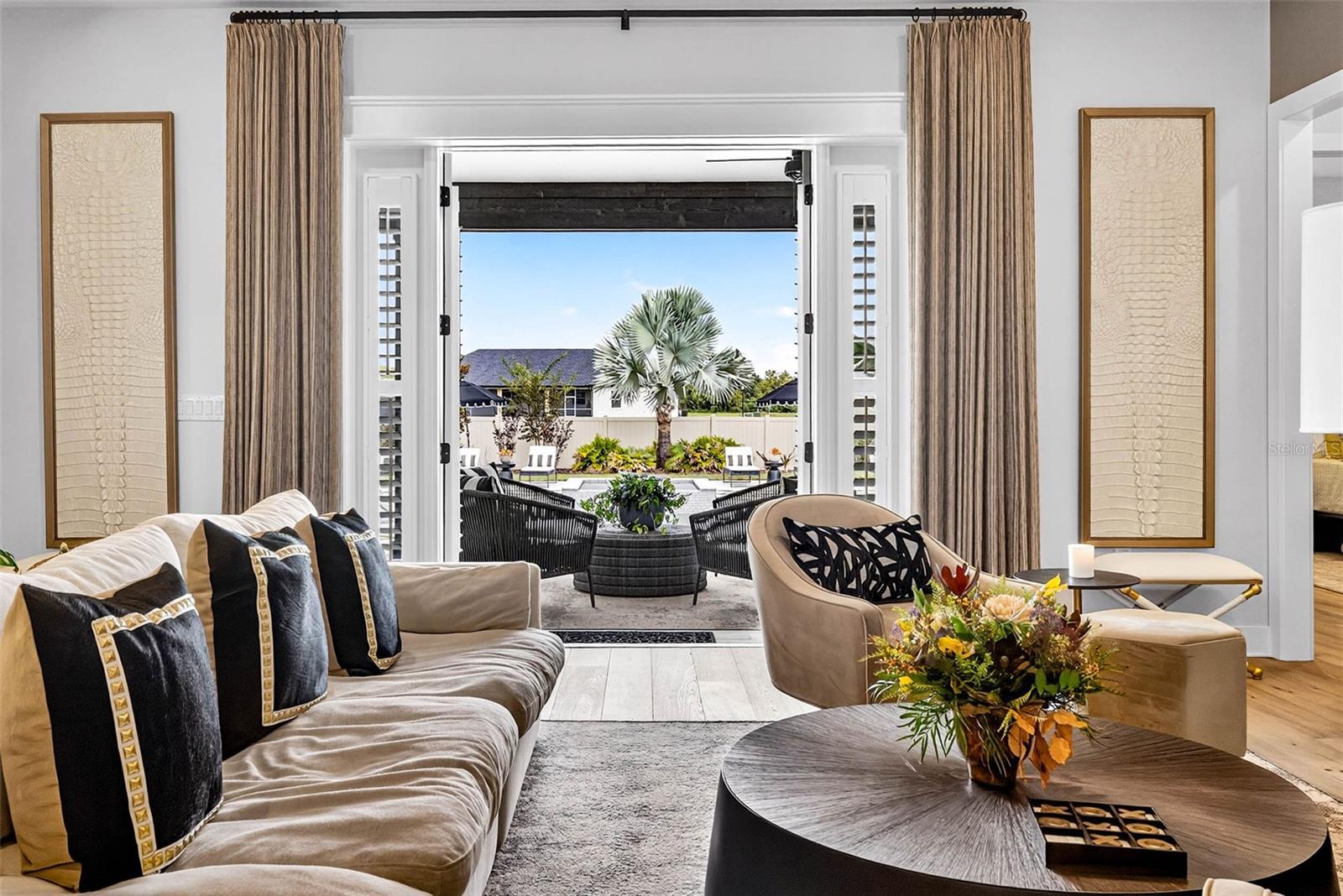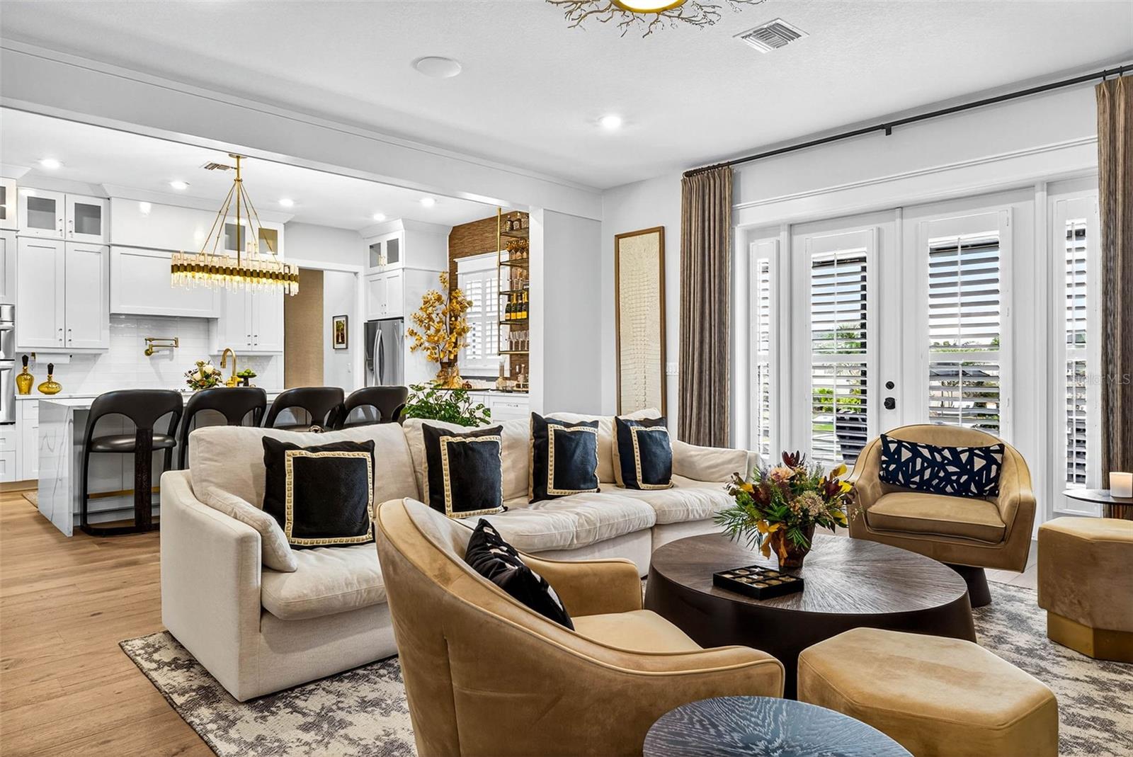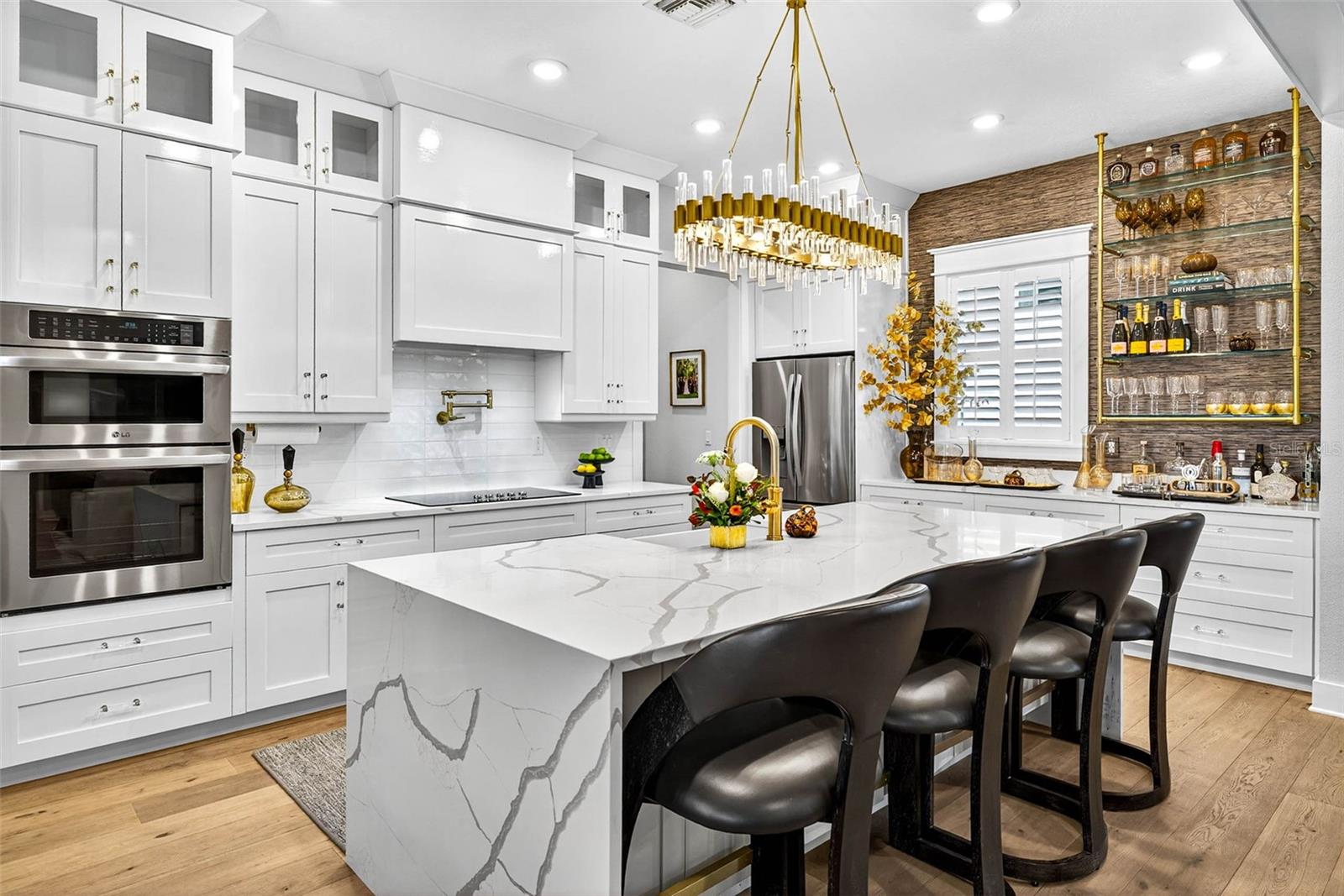 Welcome to your dream home! Featured in Florida Design Magazine, this stunning 4-bedroom, 3.5-bath modern farmhouse blends classic charm with modern luxury finishes throughout, including high end Arteriors and Hinkley lighting features, Emtek Cabinetry hardware and Brizo plumbing features. Step inside to 10 foot ceilings, wide-plank hardwood floors, and an open-concept layout that’s perfect for entertaining. The gourmet kitchen features quartz countertops, stainless steel appliances and a beautiful waterfall island.The plantation shutters and large windows flood the family room/entertainment area with natural light. Custom draperies and high end wallpaper have elevated this home to the next level. French doors open to the professionally landscaped back yard and pool area where you can enjoy serene evenings cooking in the outdoor kitchen on the covered back porch. Retreat to the primary suite with a spa-inspired bathroom, double vanities, soaking tub, and oversized walk-in closet. Three additional bedrooms offer plenty of space and comfort. This property provides flexibility for a home office with the den/office located off the family room. It is conveniently located near top schools, shopping, and dining—you won’t want to miss it! Schedule your private tour today.