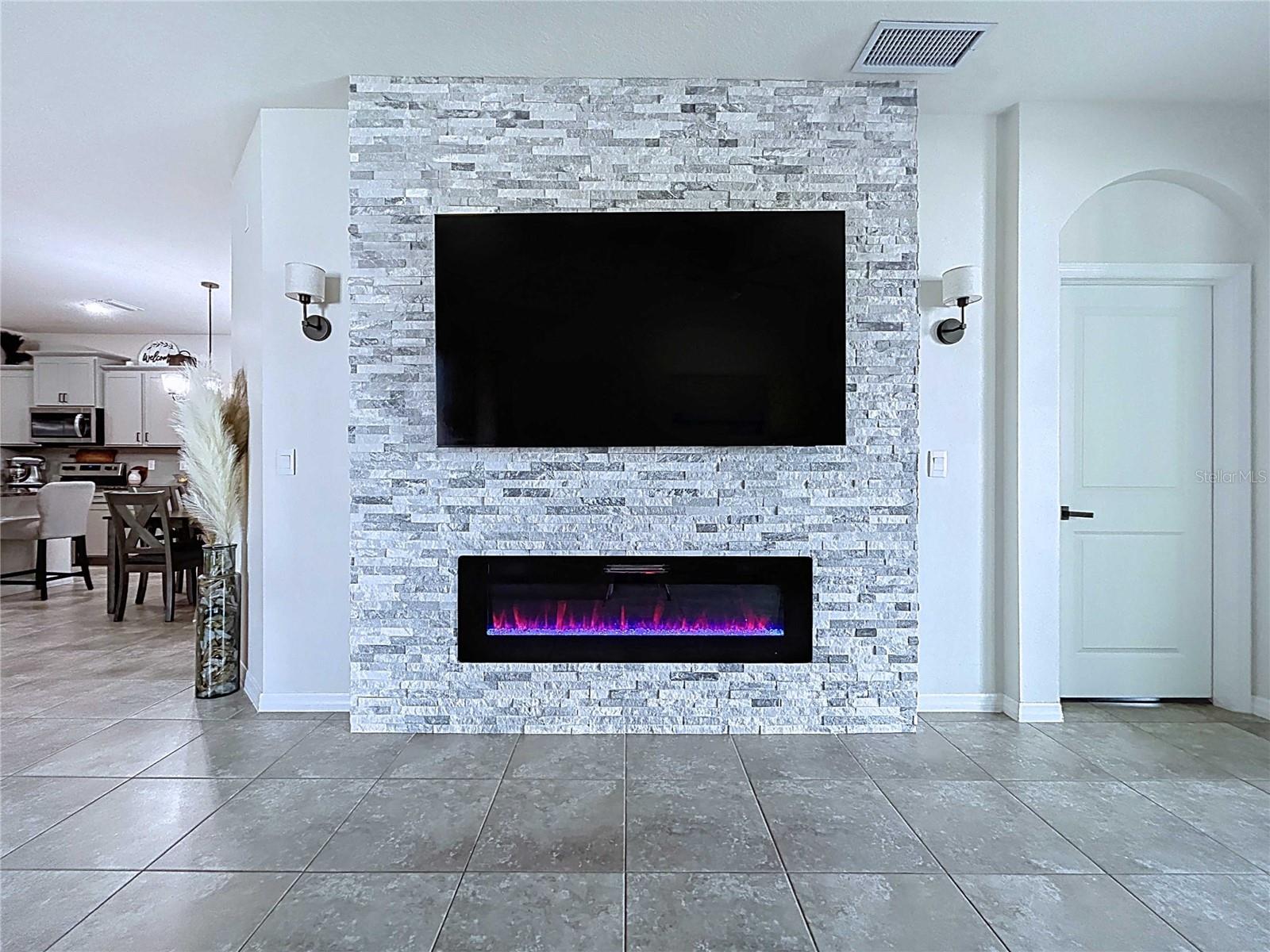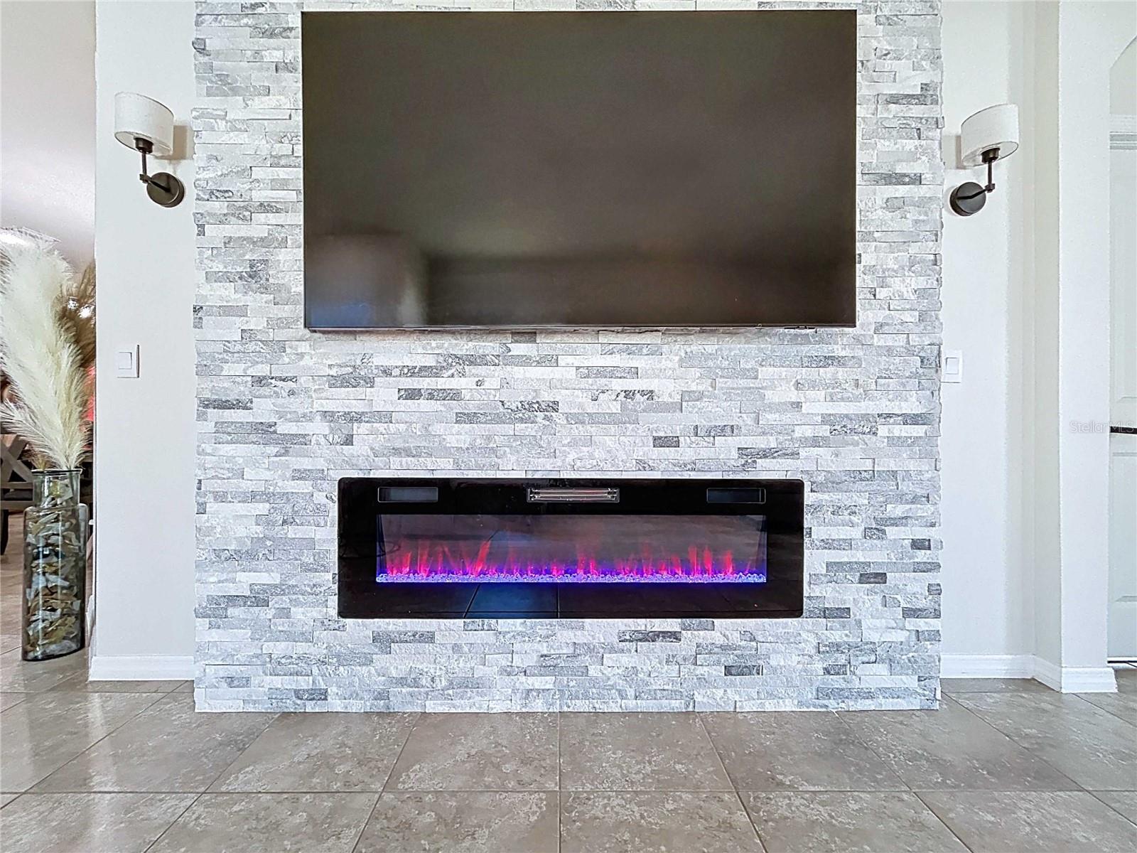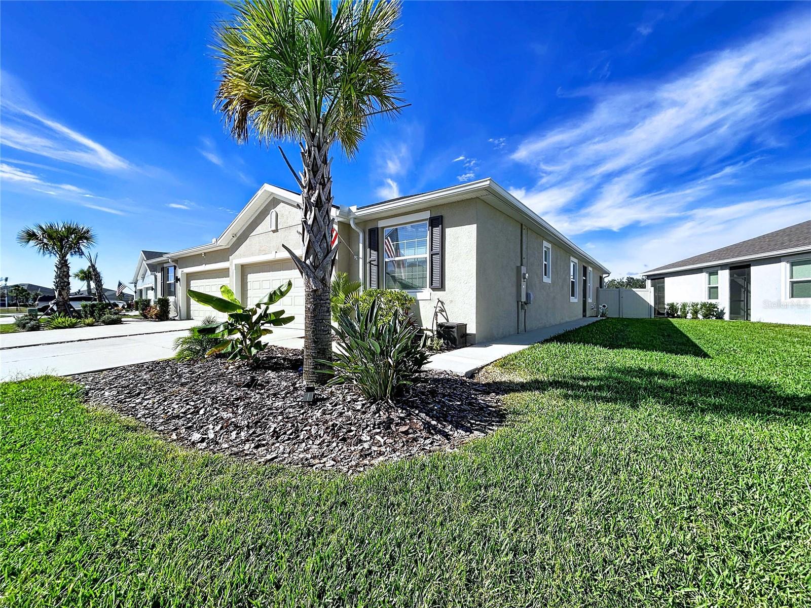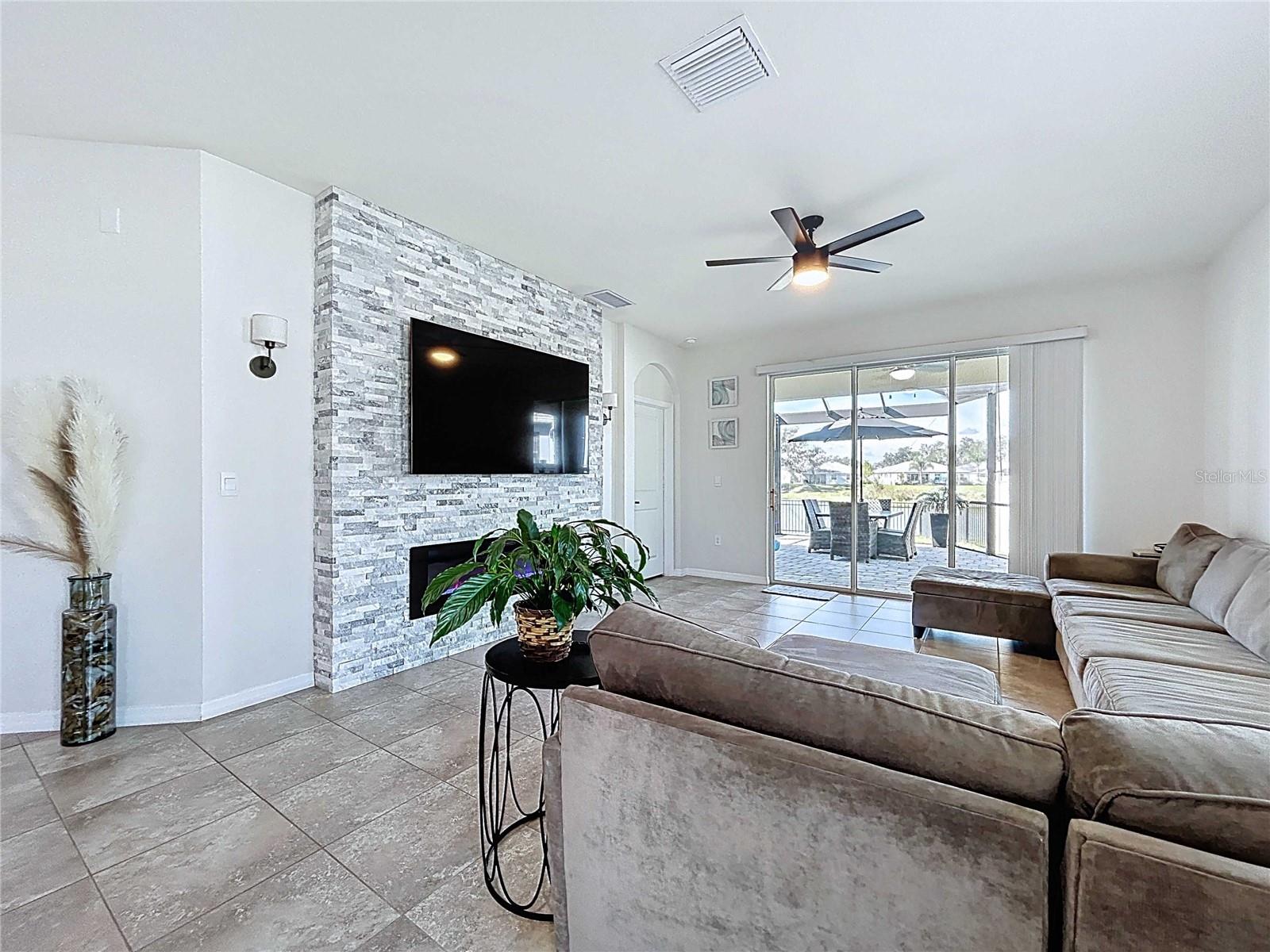 Introducing a villa like no other in the Mirada Lagoon community. Completed in 2023 and upgraded with over $50,000 in post-construction enhancements, this home blends modern finishes, a pond-view homesite, and low-maintenance living in one of Pasco County’s most active growth corridors. The interior features luxury vinyl plank and tile flooring throughout, with no carpet anywhere, and a custom feature wall with a built-in electric fireplace that anchors the great room. The kitchen includes staggered 36" cabinets with crown, granite counters, stainless steel appliances, a tile backsplash, and an open layout transitioning toward the expanded outdoor living space. Both bathrooms have been upgraded with floor-to-ceiling tile, and the primary walk-in shower now features a pebble-mosaic spa-style floor. The primary suite also includes a professionally installed closet system for optimized storage. Mechanical and functional upgrades continue with a whole-home water softener, smart-home system, and an epoxied garage floor, enhancing the attached two-car garage. Outdoors, the home impresses with an extended and fully screened lanai overlooking the pond, plus a fenced backyard with privacy side panels. A premium glass entry door further elevates curb appeal. Concrete block construction, public utilities, and underground electric add long-term practicality. Mirada delivers deed-restricted living, park space, and access to the region’s 15-acre MetroLagoon, all supported by convenient proximity to I-75, SR-52, Publix, and Wesley Chapel’s shopping corridors.