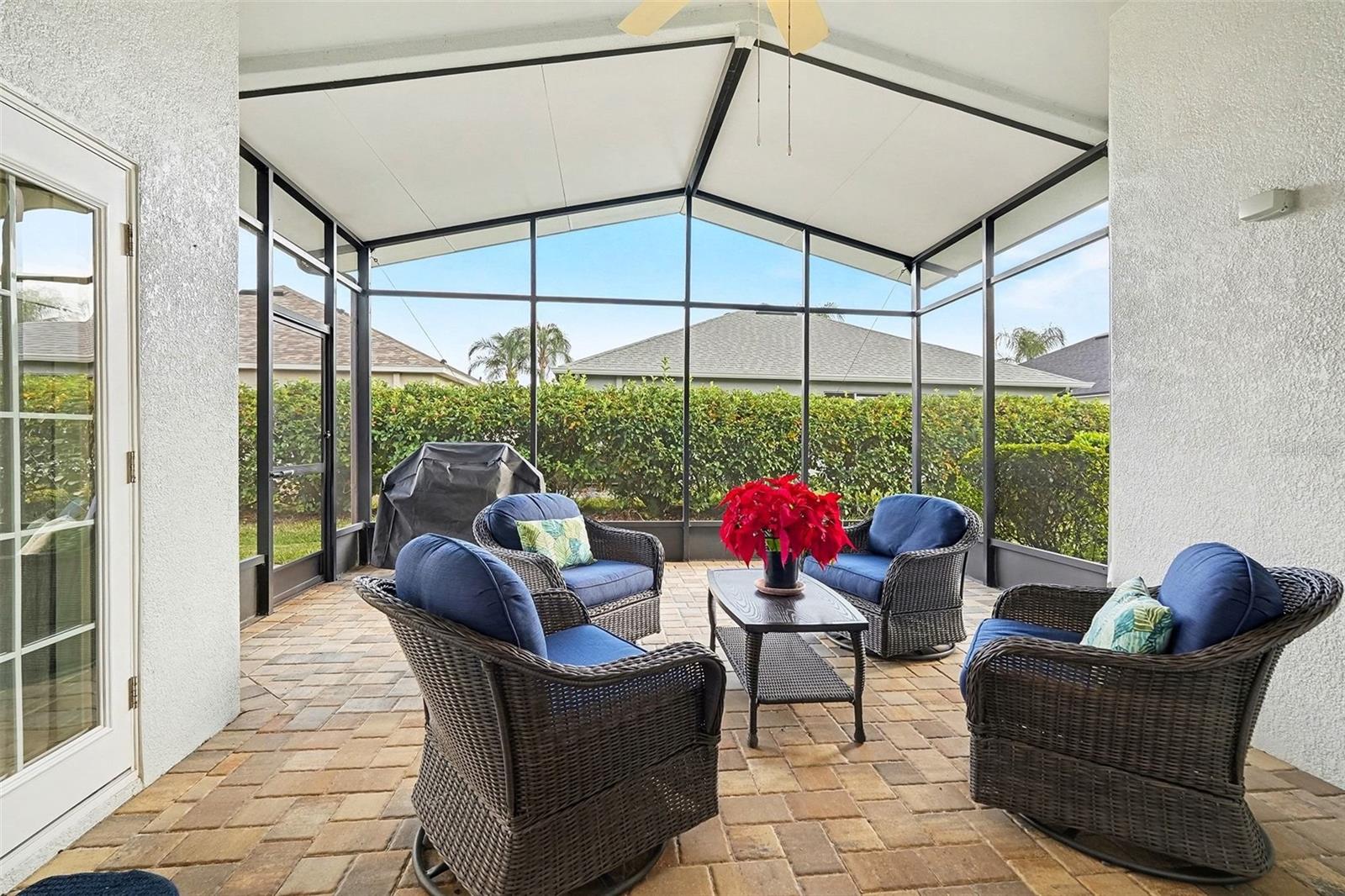 Welcome to this beautifully updated home offering inviting spaces and tranquil views. This thoughtfully designed residence features an open, light-filled layout. The kitchen has been tastefully renovated with new cabinetry, stainless steel appliances, and quartz countertops, creating a clean, modern space that opens to the main living area. Built in cabinetry offers additional storage in the kitchen and living space. Both bathrooms have been remodeled with updated finishes and taller vanity cabinets, adding a fresh, stylish touch. Bottom-up, top-down blinds on all windows provide flexible control of natural light while maintaining privacy. Beautiful French doors lead to the extended screened lanai with paver flooring, offering a comfortable outdoor retreat. The paver driveway enhances curb appeal, while across the street a peaceful pond and golf course provide picturesque views with abundant native birds and natural beauty. Recent improvements include a new roof in 2024, A/C system replaced in 2025, dual paned windows in 2019. Located in the desirable San Antonio community, residents enjoy resort-style amenities including pools, clubhouse, fitness center, on site restaurant & pub, golf course, and so much more. HOA fees include Cable, Internet, and Lawn Care. This move-in-ready home is a wonderful opportunity to enjoy relaxed Florida living. Most Furniture is available under separate agreement.