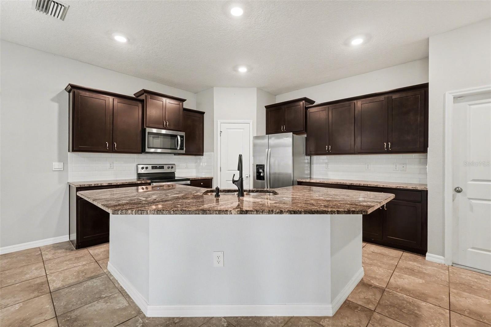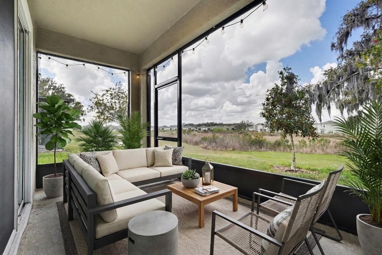 One or more photo(s) has been virtually staged. LIVE like you are on VACATION everyday in this Stunning Siesta floorplan villa in Mirada! This 3 bedroom, 2 bath, 2-car garage home offers 1,587 sq. ft. of living space on a rare OVERSIZED 10,000 sq. ft. pie-shaped PREMIUM lot with CONSERVATAION and WATER views. Features include lofty 9'4" ceilings, 18" tile in main areas, French doors to a flex/office, tray ceiling in the primary suite, and a screened lanai with breathtaking sunsets! The gourmet kitchen shines with 42" espresso staggered cabinets with crown molding, granite counters, subway backsplash, and stainless Whirlpool appliances. Additional upgrades: smart home system, washer/dryer with storage, new lighting, and garage shelving. Built by D.R. Horton, this villa was carefully designed with a bright open layout which makes entertaining a breeze. Tropical Bahama decor in the casually elegany primary suite features a tray ceiling, large windows overlooking conservation, plus a spa-like bath with granite counters, rubbed oil bronze fixtures, and ample storage. Additional upgrades include new lighting and ceiling fans, shelves added in the garage, and a utility closet with washer/dryer and overhead storage. The screened lanai offers breathtaking sunsets and serene views of two ponds and conservation, creating the perfect outdoor retreat to REST EASY! This smart home comes Continued... See Addendum Public Remarks 1