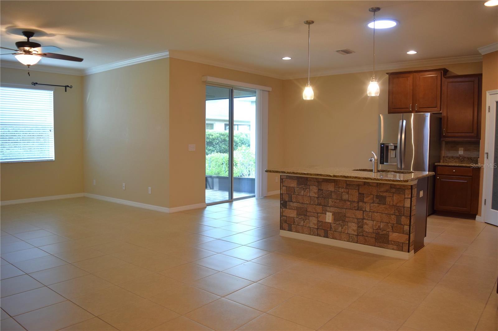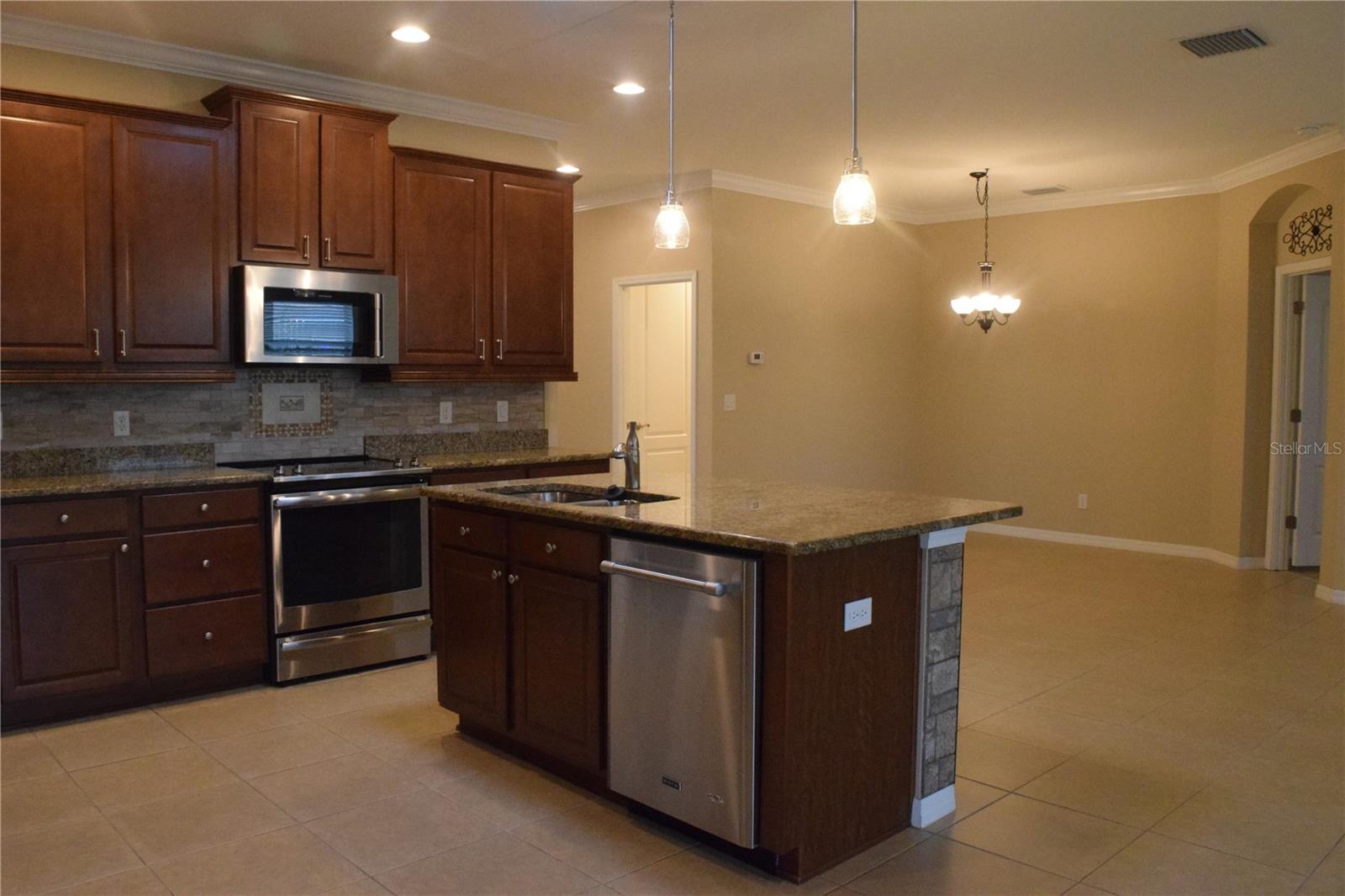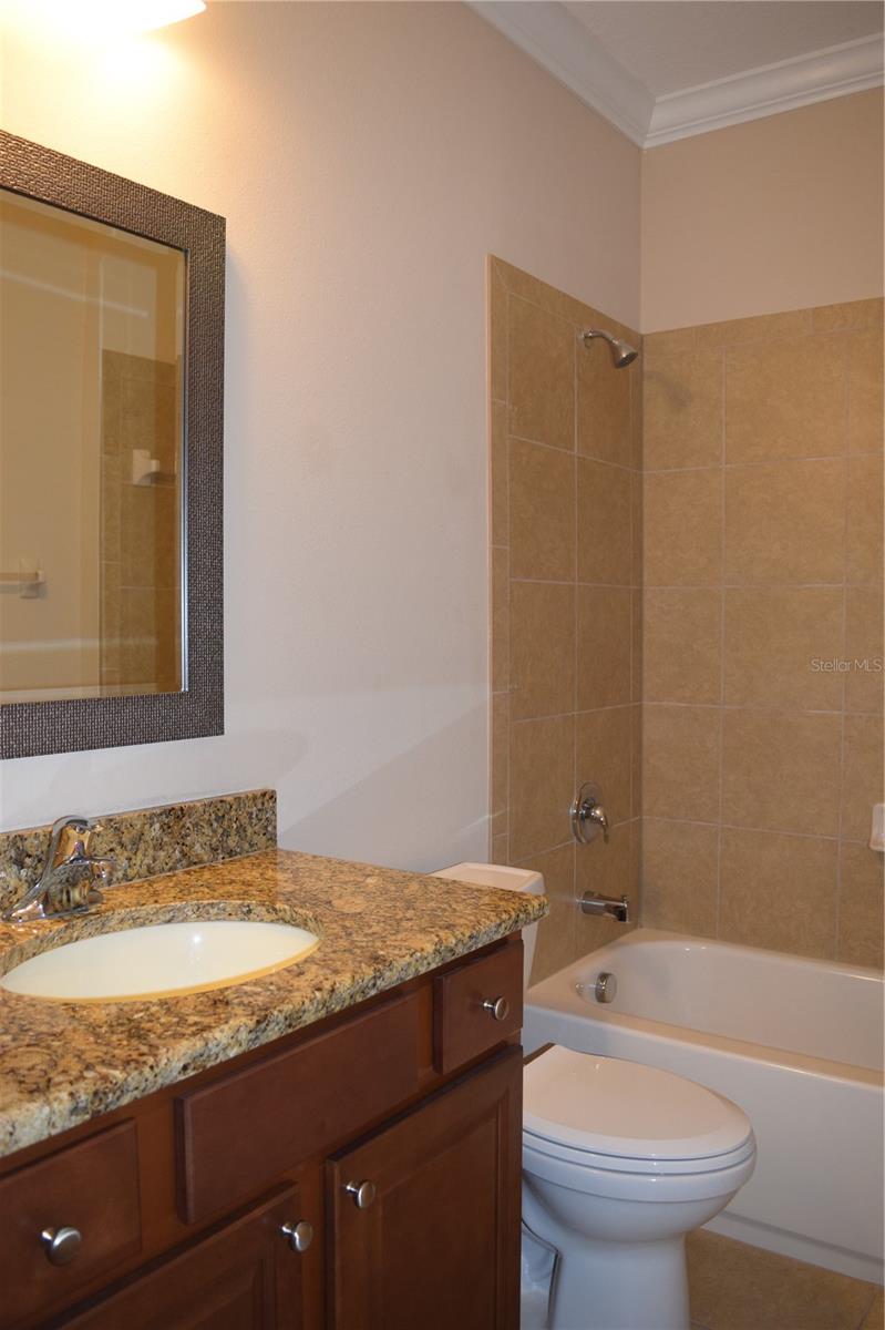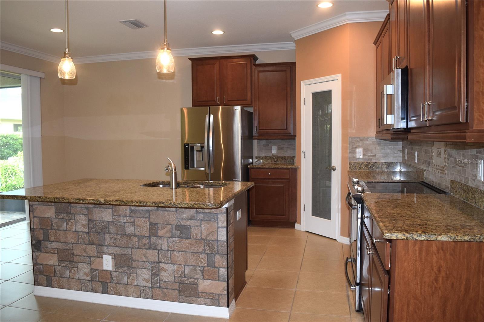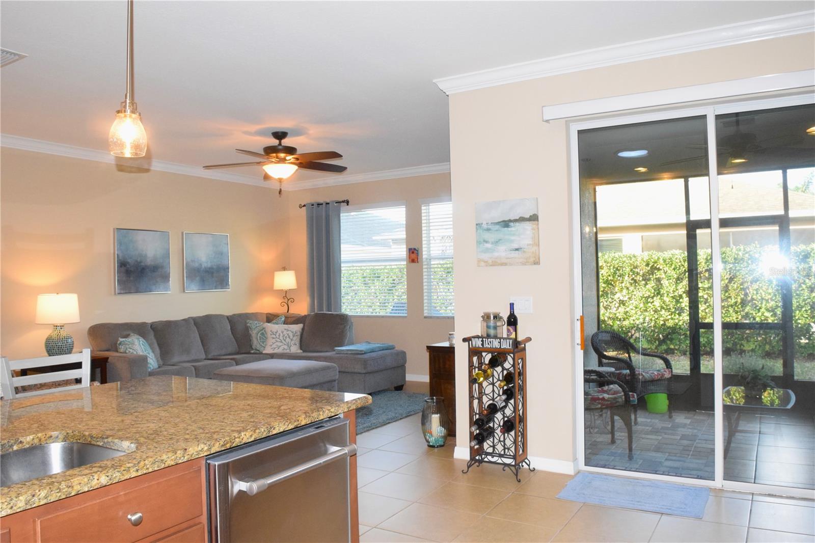 Welcome to your ideal move-in ready home! This well-kept residence offers a seamless blend of comfort and style. The interior boasts tile flooring throughout, creating a sleek and low-maintenance environment. Step into the kitchen, a culinary haven featuring granite counters, a corner closet pantry, stainless steel appliances, and a stunning tile backsplash that adds a touch of elegance. The master bathroom is a retreat with a counter-height granite dual sink vanity, a tiled walk-in shower with a bench, a separate water closet, and a spacious walk-in closet. Guests can have their own hall leading to the guest bedroom and second bath complete with a counter-height granite vanity and a tiled shower with a tub. The den, featuring double doors and a small closet, can serve as an additional bedroom or a flexible space to suit your needs. Experience outdoor relaxation on the private screened lanai, leading to a brick paver patio - an ideal spot for grilling and entertaining. The 2-car garage includes overhead storage shelves, and the extended driveway on both sides adds convenience. Enjoy the perks of a 55+ community with the HOA covering cable, internet, lawn care, and access to a range of amenities, including swimming pools, fitness center, clubhouses, and more. Don't miss the chance to call this meticulously maintained property your home!