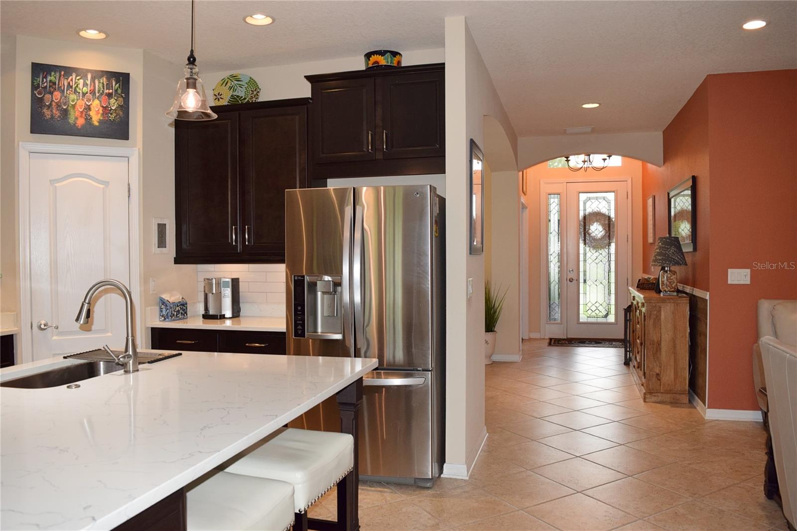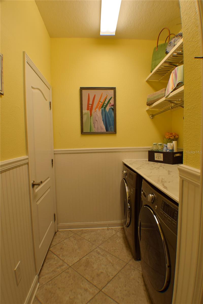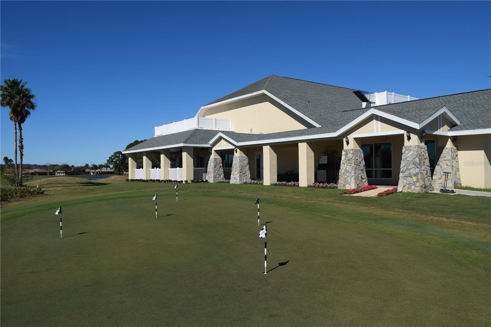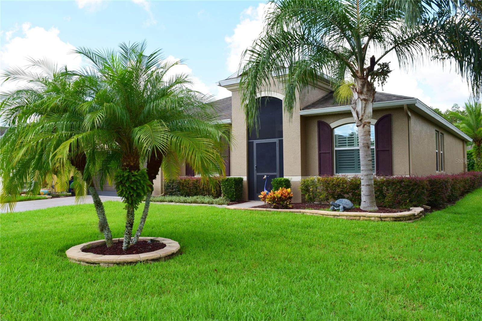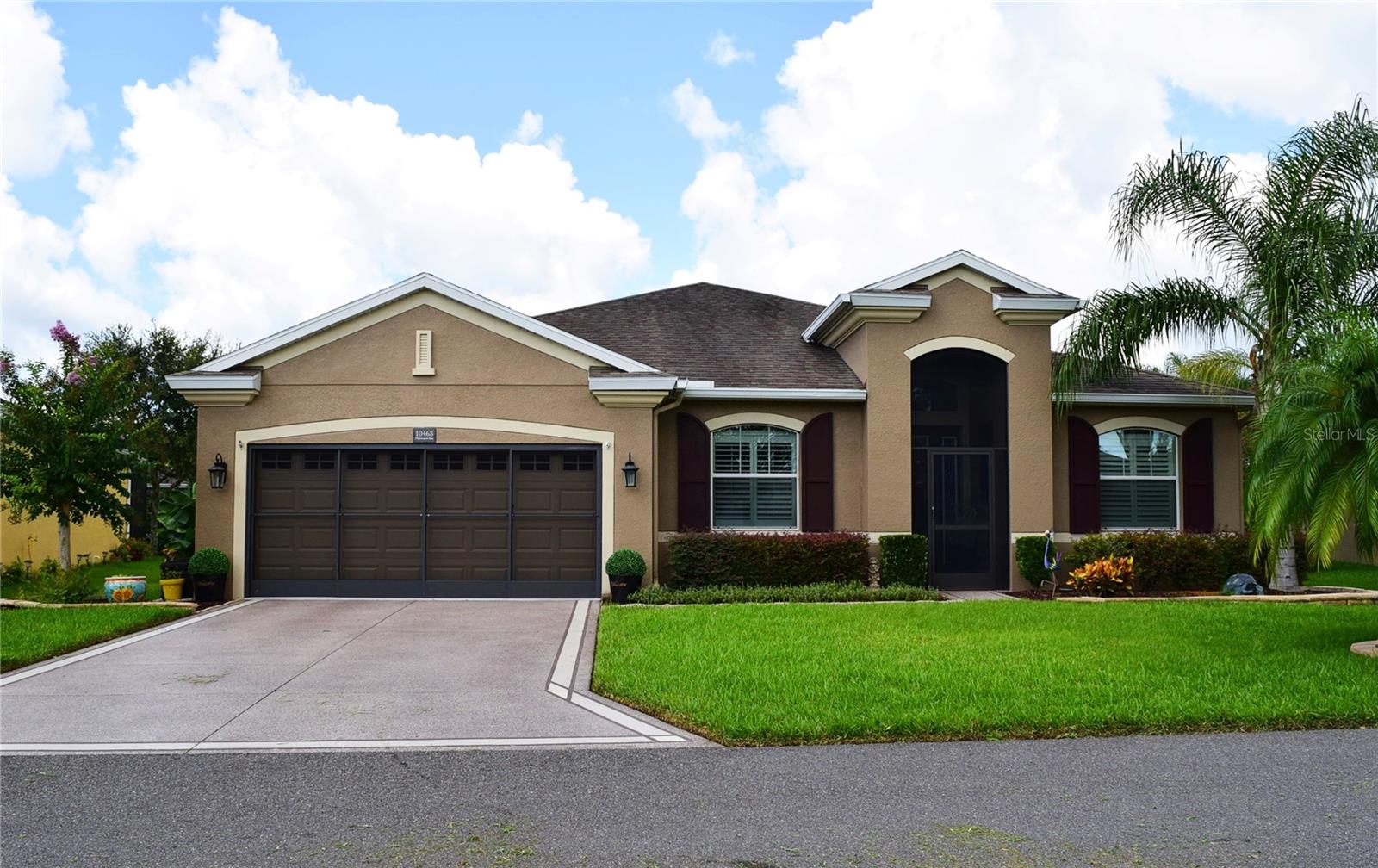Greeted with a decorative driveway and walkway leading to the leaded glass front door, step inside this Beautiful home to the tall foyer. Look past the bedroom count, this home has 2 Bedrooms, a Den, and a formal dining room that could be utilized in a variety of ways. Tile floors installed on a diagonal pattern and plantation shutters on all windows add character to the home. The kitchen is a must-see, with an island that is nearly a 5 x 8 foot single slab quartz countertop, beautiful cabinetry, and upgraded stainless steel appliances. The kitchen is truly a great place for guests to gather as it is a focal point of the home with openness to the dinette and living room. The expanded screen lanai with travertine tile floors adorned with three stately planters offers a quiet relaxation area or additional space for entertaining guests. A four foot extension makes not only the common space larger, but the primary bedroom becomes a spacious room with a walk in closet, a built in desk/shelf, and beautiful hardwood floors. Primary ensuite offers a dual sink quartz countertop, tiled wall-in shower, and generous linen closet. Small details like the accent wall leading to the guest bedroom and bath makes this home extra special. Guest bath has a walk-in tile shower with glass doors. Oversized garage has additional storage area or space for 2 cars and a tandem parked golf cart. Garage features built in storage racks, tool organizers, and a sliding screen. Well maintained home also has a freshly painted exterior. Located in the gated, 55+ Community of Tampa Bay Golf and Country Club. HOA fees include lawn care, Cable, Internet, and a long list of amenities. Community features tennis/pickleball courts, fitness center, swimming pools, and three clubhouses. Come see why this home should be your own!