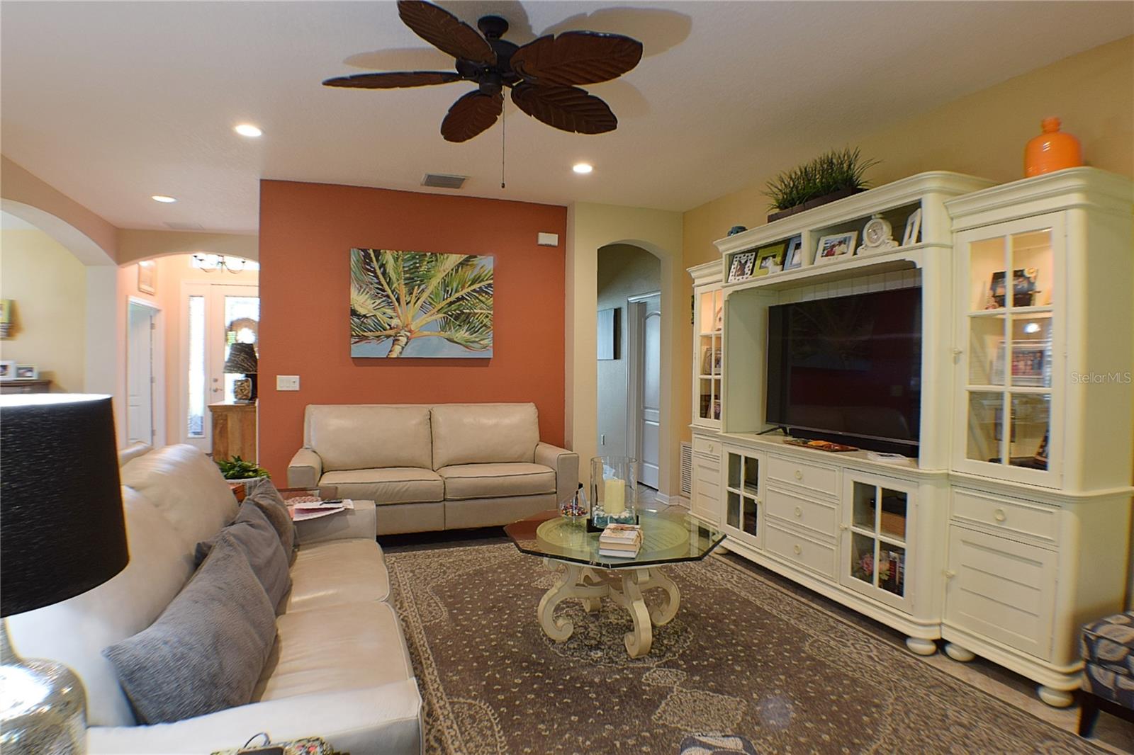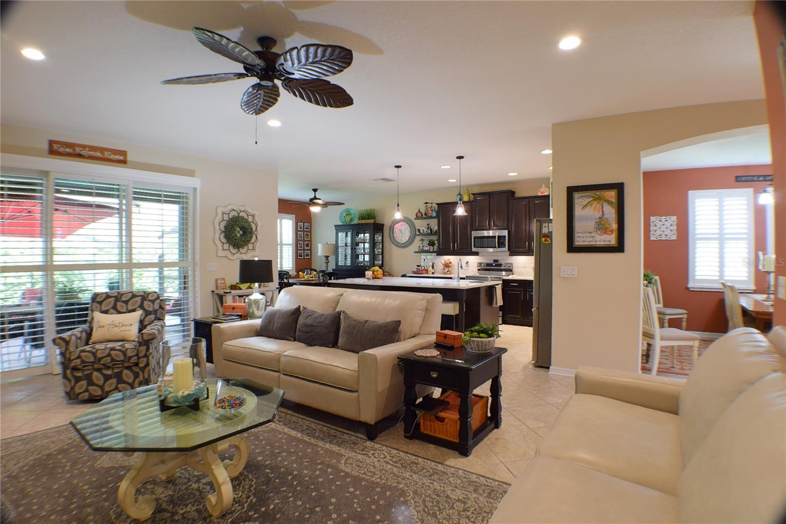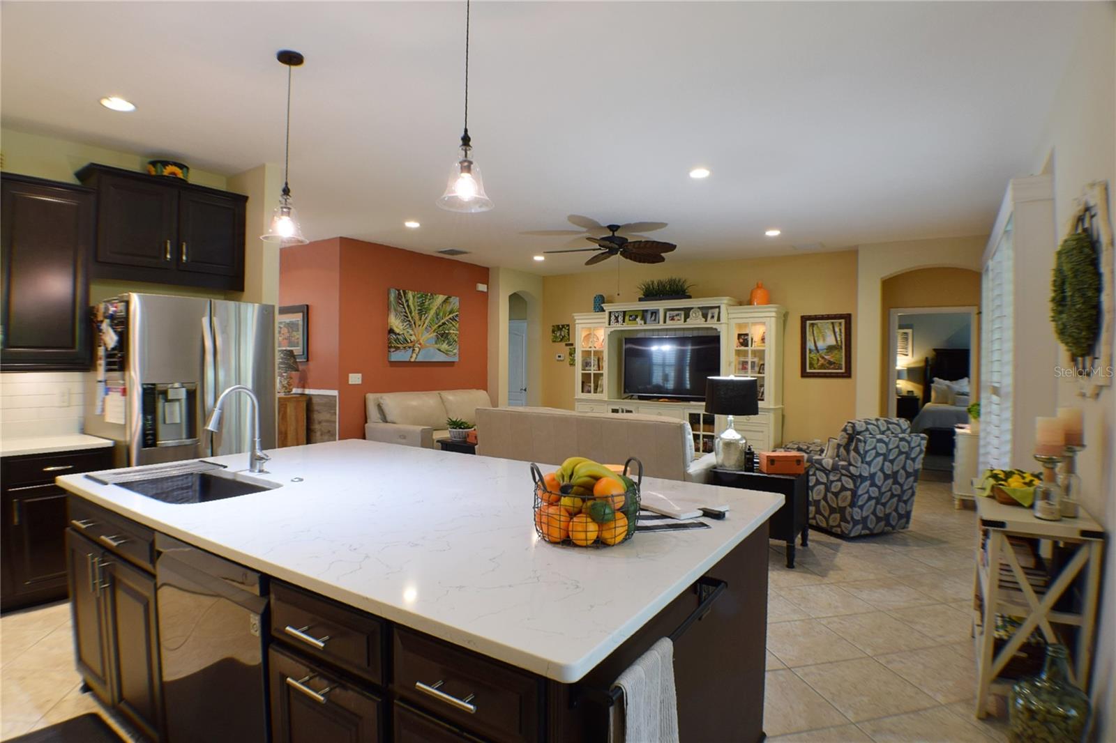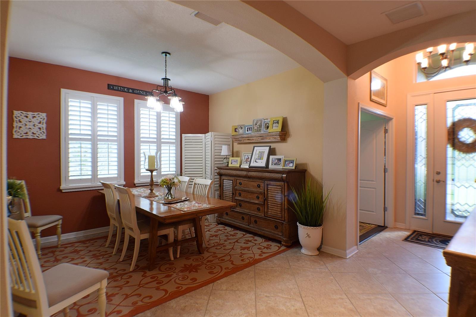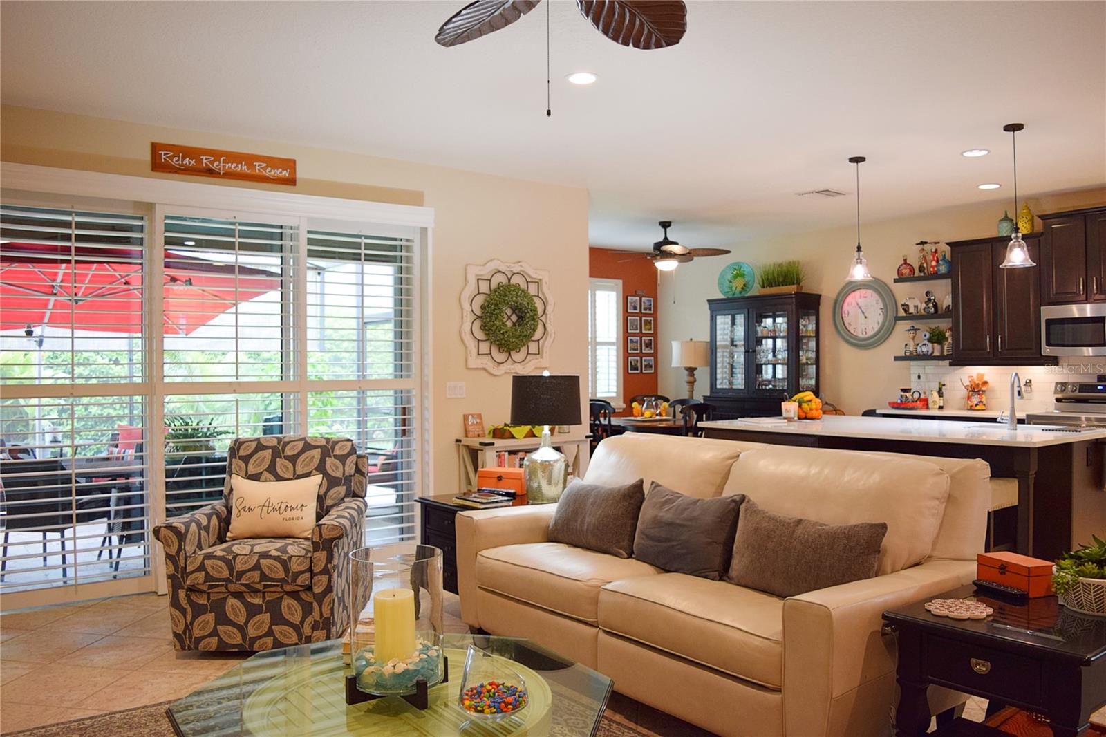 Greeted with a decorative driveway and walkway leading to the leaded glass front door, step inside this Beautiful home to the tall foyer. Look past the bedroom count, this home has 2 Bedrooms, a Den, and a formal dining room that could be utilized in a variety of ways. Tile floors installed on a diagonal pattern and plantation shutters on all windows add character to the home. The kitchen is a must-see, with an island that is nearly a 5 x 8 foot single slab quartz countertop, beautiful cabinetry, and upgraded stainless steel appliances. The kitchen is truly a great place for guests to gather as it is a focal point of the home with openness to the dinette and living room. The expanded screen lanai with travertine tile floors adorned with three stately planters offers a quiet relaxation area or additional space for entertaining guests. A four foot extension makes not only the common space larger, but the primary bedroom becomes a spacious room with a walk in closet, a built in desk/shelf, and beautiful hardwood floors. Primary ensuite offers a dual sink quartz countertop, tiled wall-in shower, and generous linen closet. Small details like the accent wall leading to the guest bedroom and bath makes this home extra special. Guest bath has a walk-in tile shower with glass doors. Oversized garage has additional storage area or space for 2 cars and a tandem parked golf cart. Garage features built in storage racks, tool organizers, and a sliding screen. Well maintained home also has a freshly painted exterior. Located in the gated, 55+ Community of Tampa Bay Golf and Country Club. HOA fees include lawn care, Cable, Internet, and a long list of amenities. Community features tennis/pickleball courts, fitness center, swimming pools, and three clubhouses. Come see why this home should be your own!