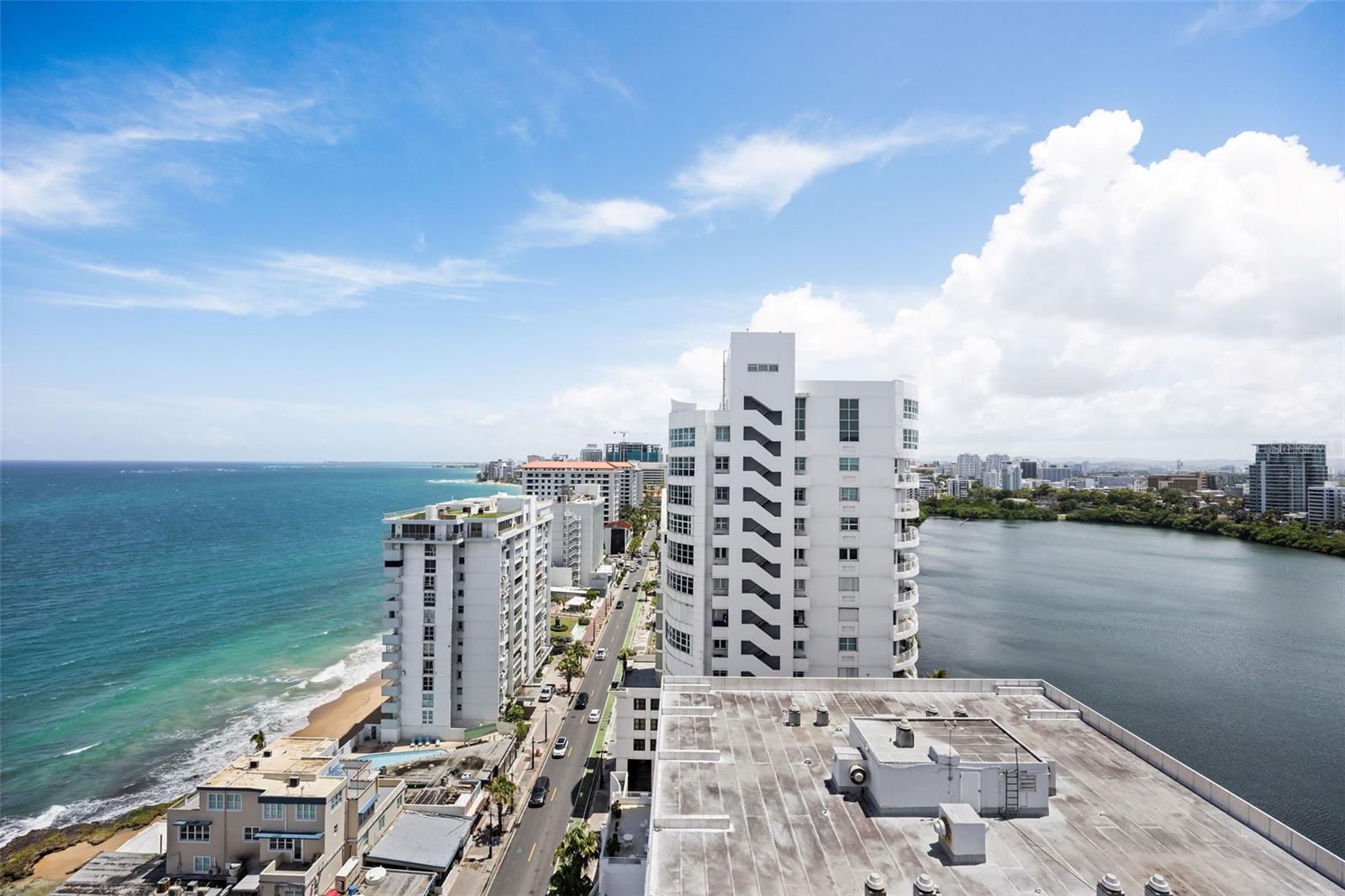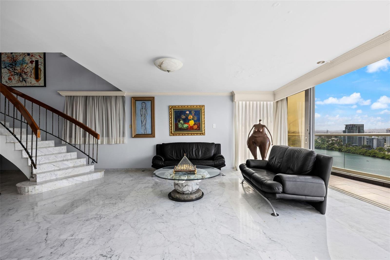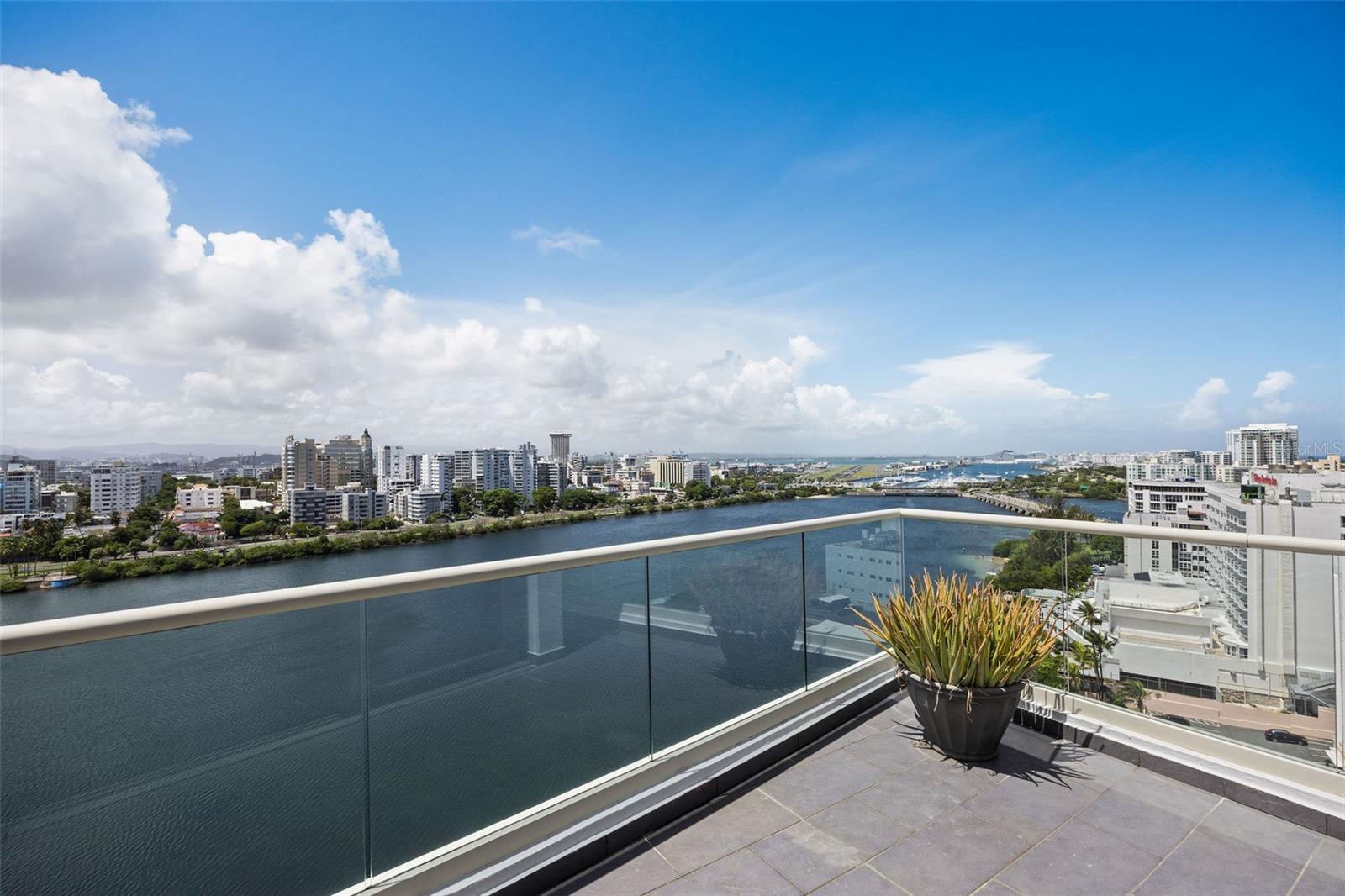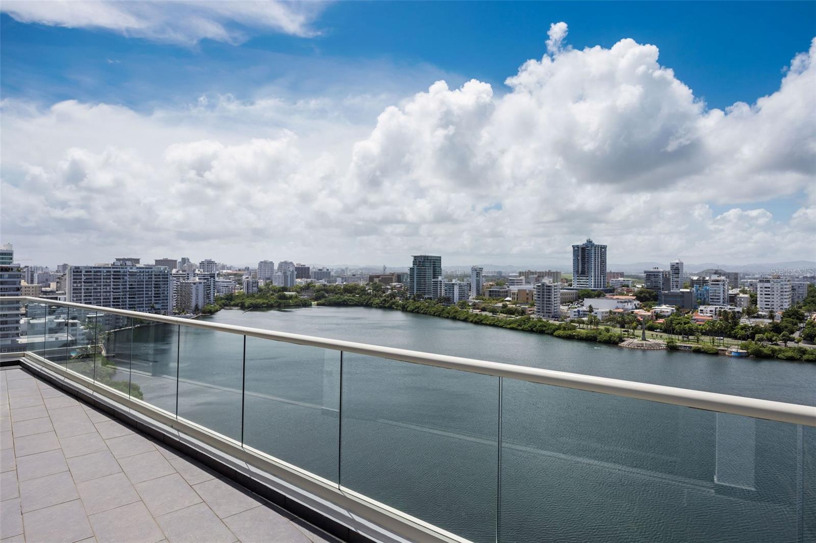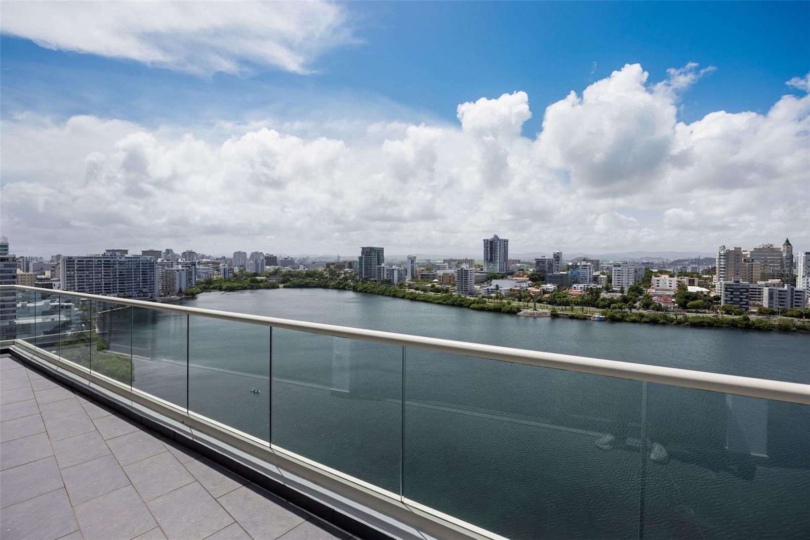 PENTHOUSE FLOOR 17 · 8 COVERED PARKING (4 BACK-TO-BACK) · 6,600 SQ FT · 360° OCEAN VIEWS · 6 BED · 4 FULL + 2 HALF BATHS · Located in Ashford Lagoon Plaza on Condado’s Ashford Avenue, this penthouse occupies the entire 17th floor (PH-17) across two levels plus a mezzanine (third level), 6,600 sq ft (5,729 sq ft GLA). It features 6 bedrooms, 4 full bathrooms, and 2 half baths. From three open terraces you’ll enjoy spectacular vistas: to the south, the city and Condado Lagoon; to the north, the Atlantic Ocean with permanently unobstructed views. Access is exclusive, with two key-access elevators arriving directly into the residence via a private foyer. Interior highlights include space for a private gym, a large family room/lounge overlooking the city and lagoon, and a wine cellar. The building provides direct lagoon access with a small wooden dock, lobby, gym, restrooms/storage, and a full-capacity backup generator for the entire residence—an offering hard to replicate in the area. As an extraordinary advantage, the PH includes 8 covered parking spaces, configured as four back-to-back pairs, a key differentiator for multi-car households or collectors. Compared with Condado market references—where standout penthouses range 2,895–3,991 sq ft and typically with 4–5 parking spaces—this PH far exceeds the size and doubles the parking capacity, positioning it as a truly rare opportunity.