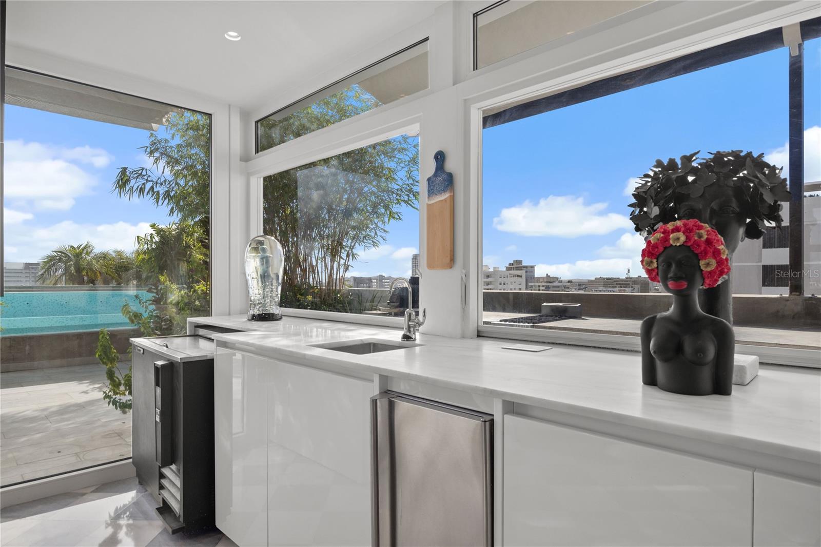 Welcome to the Penthouse at the Crowne Plaza! Located in coveted Luchetti Street in Condado, this exceptional property offers a harmonious blend of luxury, comfort, and modern design. Spanning two full floors – with an impressive 5,820.34 square feet, including 1,980.44 square feet of exterior space – this residence was thoughtfully designed by Pili & Co to cater to the most discerning tastes. Upon entering, you are greeted by expansive open spaces that seamlessly integrate with modern finishes, creating an inviting atmosphere. Lower level is the private one, featuring four bedrooms (truly convertible to five), 4 full bathrooms, a gym, a home office, a family room, and a balcony with city and ocean views. Main level is upstairs and is the social floor. There, you find an open kitchen, dining and living rooms, covered and uncovered terraces, an outdoor kitchen, a wine cellar, a fully equipped bar, pet area, and a wraparound balcony. Both levels are connected via a grand staircase and the elevators. The kitchen is open and bright. It features Italian CopatLife cabinets, a center-piece island with impressive Avalon marble countertops, and top of the line appliances: Miele induction stove – with a real vented range hood –, built-in Miele coffee system, Frigidaire Professional microwave/oven combo and an additional convection oven, dishwasher, and side-by-side refrigerator and freezer. The Bar also has Avalon marble countertops and is equipped with a True refrigerator, an ice maker, and a temperature-controlled 378-bottle wine cellar. The finishes are all custom: from Turkish marble to Swedish wooden floors, marble bathroom mosaics, custom marble sinks, and custom built-ins and doors. The windows are also hurricane-proof with integrated shutter system. The outdoor kitchen is a highlight of its own: Vision Grills bbq system, Thor range stove, Sunterra Argentinian grill, and an Italian Fontana Forni pizza oven. An entertainer’s dream for al-fresco dining! This penthouse is distinguished by its unique two-floor layout, providing a sense of grandeur and exclusivity. The wraparound terrace is unique and offers breathtaking 360-degree city skyline vistas, making it an ideal setting for both relaxation and entertainment. The rooftop pool adds an element of luxury, allowing you to unwind while taking in the panoramic vistas. For those who value fitness and wellness, the home gym is equipped to meet your exercise needs. The amenities are in your own space: the salt-water pool, the outdoor kitchen, the wraparound balcony, the home office, and the gym. The terrace is a garden retreat, from bamboo to palm trees, is all about the views and the privacy. Additional features include 4 parking spaces, full power generator, and water cistern, all in a pet-friendly building with only 11 residences. The Penthouse renovation was completed in 2022 and is ready to move in. In a prime location in Luchetti Street, the Penthouse offers convenient access to local amenities, the best schools, the beaches, fine dining, and the international airport. The neighborhood is known for its dynamic atmosphere and is a desirable location for those seeking both tranquility and urban excitement. Experience the perfect blend of style, comfort, and convenience at this magnificent Penthouse. Contact us today to schedule a private showing and take the first step toward making this extraordinary residence your own.