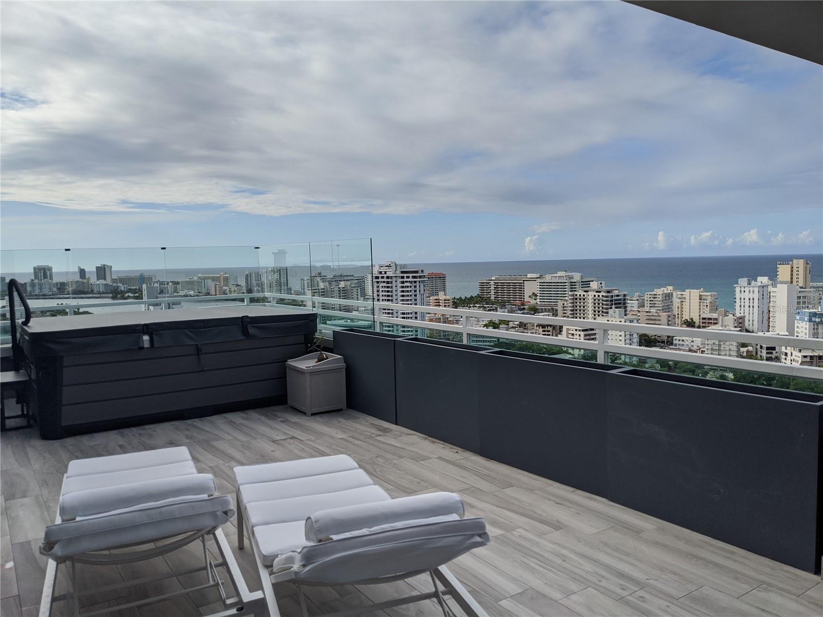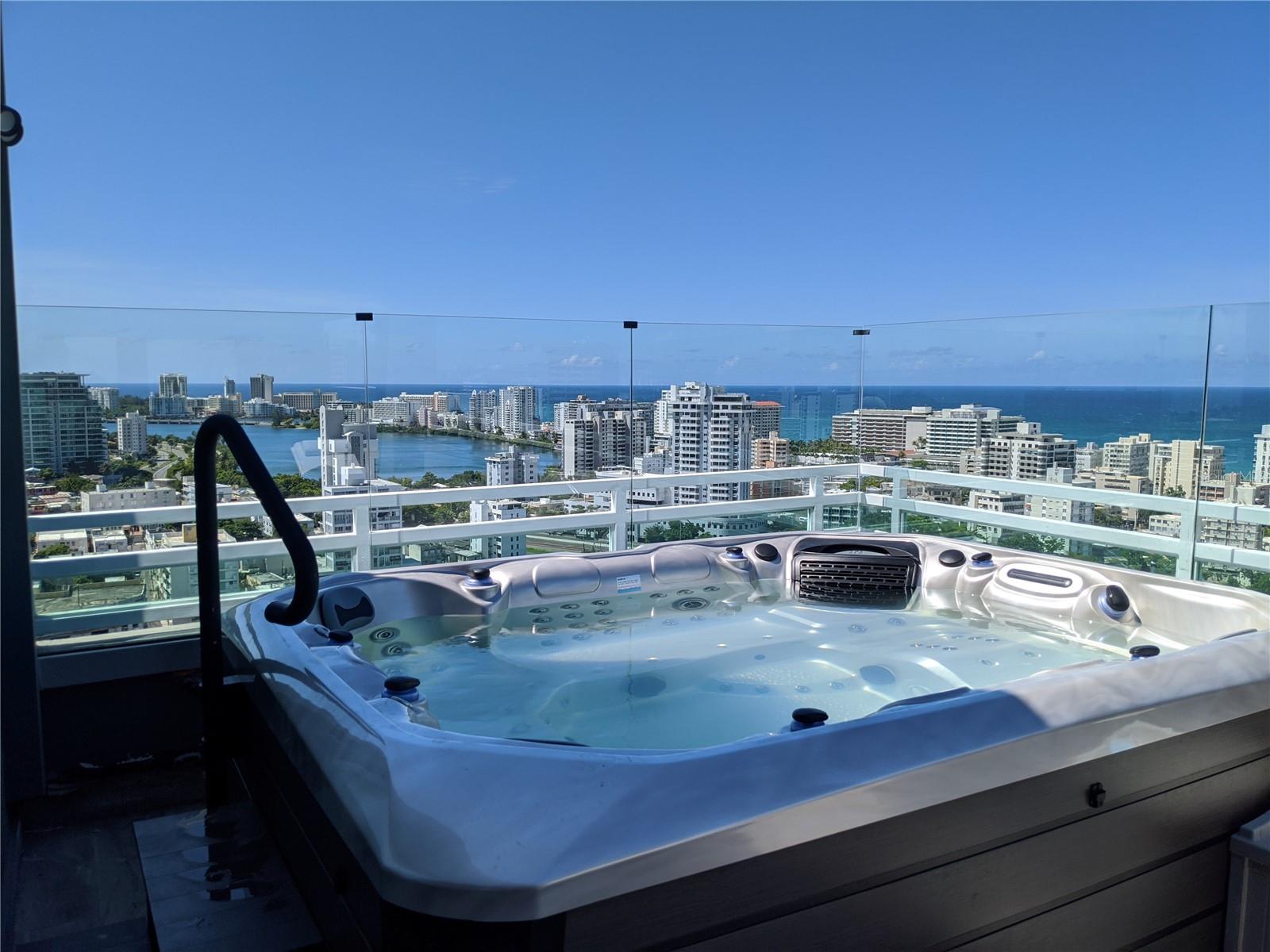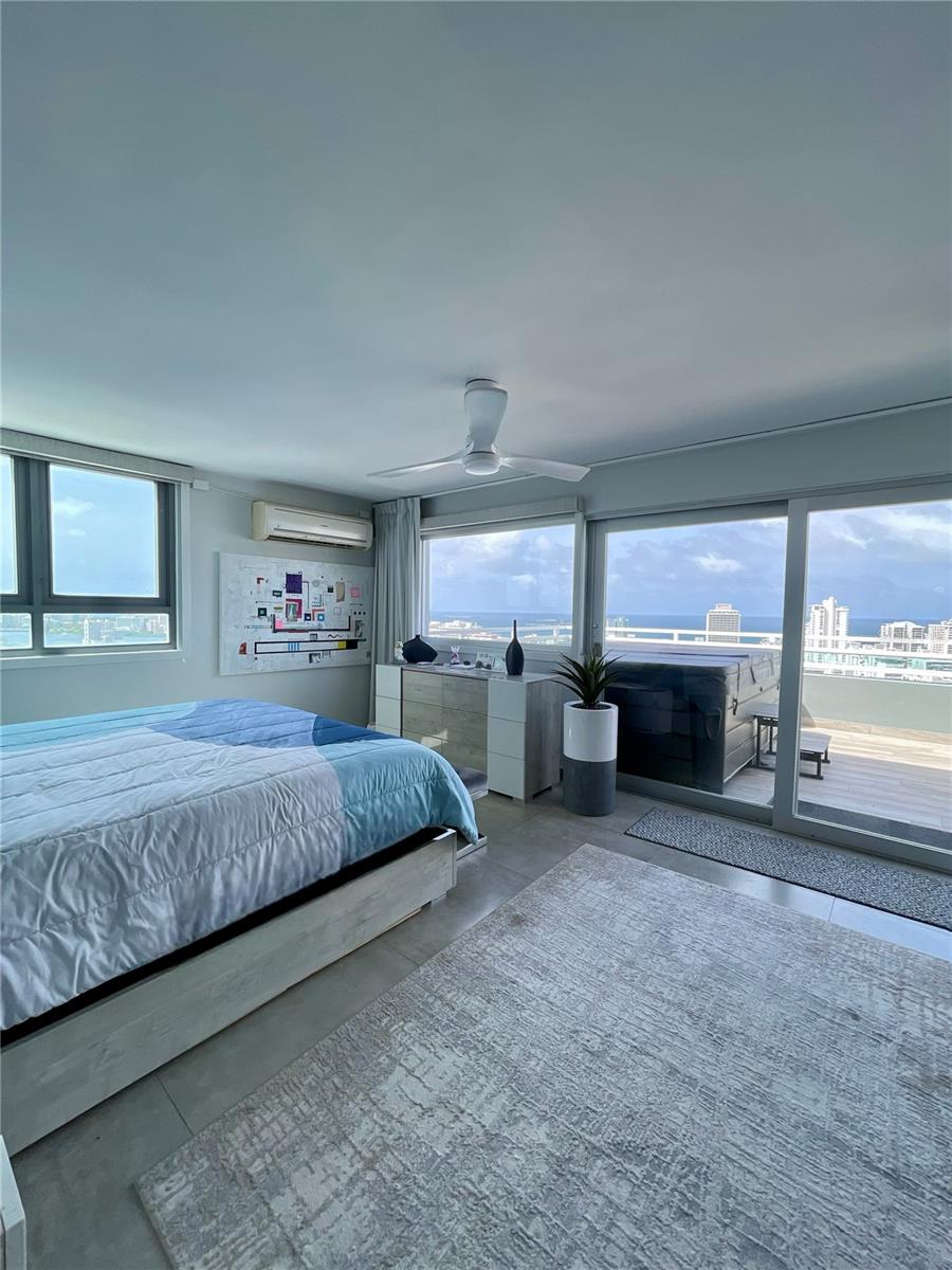 Art-Deco loft-style penthouse located in the renowned Metro Plaza Towers in Santurce. Facing northeast with unobstructed ocean, lagoon, and city views, this two-level residence offers approximately 2,400 sq. ft. of interior living space and 1,100 sq. ft. of private outdoor terrace. The penthouse features three spacious bedrooms filled with natural light, three full bathrooms, a modern kitchen, double-height ceilings, and two family areas. The expansive terrace includes a private jacuzzi—ideal for entertaining or relaxing while enjoying panoramic views. Offered fully furnished and equipped, with two assigned parking spaces, full power generator, and water cistern. The building provides 24/7 concierge and security, pool, gym, and pet-friendly policies. Prime walkable location near restaurants, coffee shops, schools, movie theaters, La Placita, and just minutes from Condado and Old San Juan.