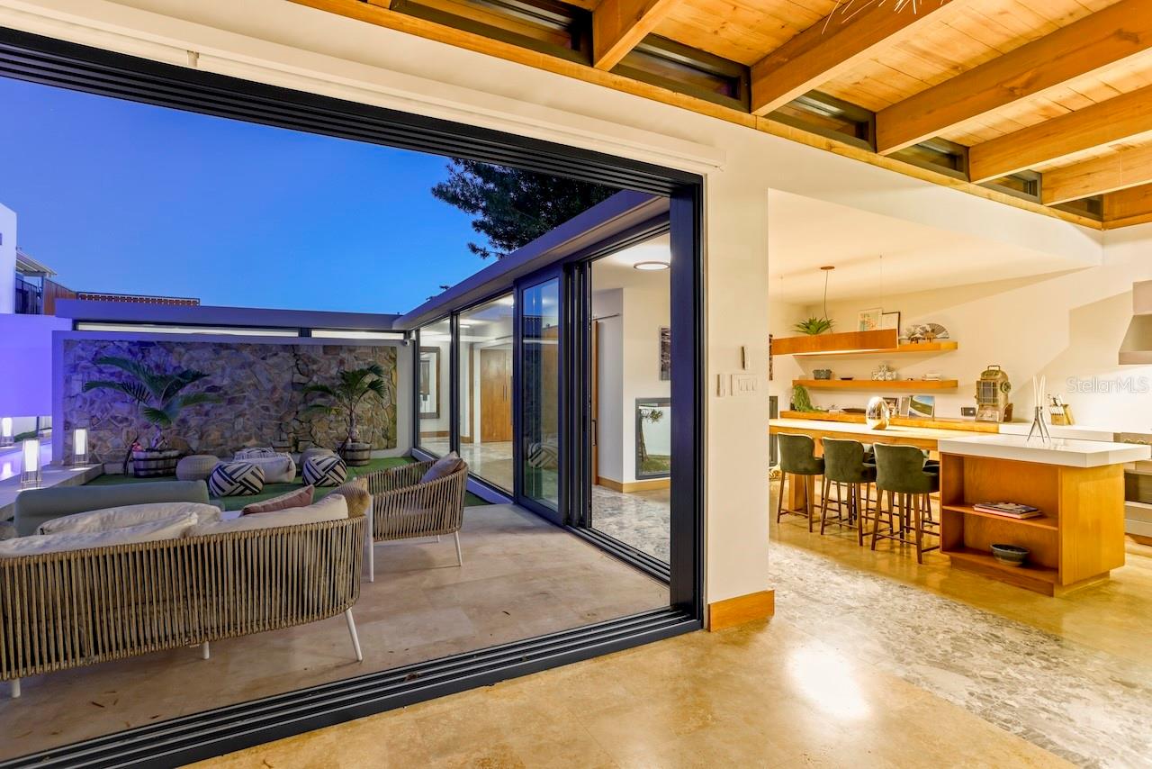 Architectural Masterpiece in the Beachside Gated Community of Ocean Park | Welcome to 2054 Calle España, an extraordinary residence where design, security, and innovation converge. Originally built in 2001 and inspired by the timeless architectural philosophy of Frank Lloyd Wright, this one of a kind home seamlessly blends natural elements with modern luxury. Thoughtfully remodeled, it stands as one of the most unique and secure homes in all of Puerto Rico. Bathed in natural light from above and below, the home features distinctive skylights and floor level windows that accentuate its open, organic feel. Locally sourced wood accents, natural stone floors, and textured exterior walls echo the harmony between nature and architecture. Fortified with new triple pane break resistant glass throughout the entire house in 2024, this provides even more peace of mind in the gated community of Ocean Park. Triple pane glass additionally reduces outside noise by over 30 decibels, making the interior a true sanctuary. Built to endure, it also provides exceptional hurricane resilience above and beyond traditional hurricane resistant glass. Multiple entry points are equipped with state of the art biometric access systems including fingerprint, passcode, facial recognition, and smartphone connectivity. Inside, no detail has been spared: Fulgor Milano kitchen appliances, white quartz countertops, elegant wallpaper finishes, designer sinks, reverse osmosis drinking water system plus whole-home water filtration, remote controlled blackout curtains in all bedrooms and living room, Midea air conditioning systems and Ring security cameras operable from anywhere in the world, and custom wood lighting throughout including a floating canoe light in the dining area paying tribute to Puerto Rico’s cultural heritage. Offering approximately 2,000 sq ft of refined interior space and over 3,000 sq ft of inviting exterior space, the home includes 3 bedrooms and 2.5 bathrooms. Indoor/outdoor living is enhanced by three large sliding doors in the living room, two in the hallway, and two more in the master suite, blurring the line between interior comfort and lush outdoor surroundings. The master suite features dual walk in closets, dual vanities, and dual rainfall showers. A guest bedroom with both interior and exterior access adds privacy and flexibility, while a third bedroom doubles as an office with a built in queen sized Murphy’s bed and generous storage. Outside there is: a heated salt water pool with multi colored lighting, a propane generator with an additional noise dampening box, a large water cistern on the roof, a Tesla vehicle charger, remote controlled parking gates, and an additional spacious storage unit accessible outside. The house is being sold furnished and the closing can happen as early as December 31st 2025.