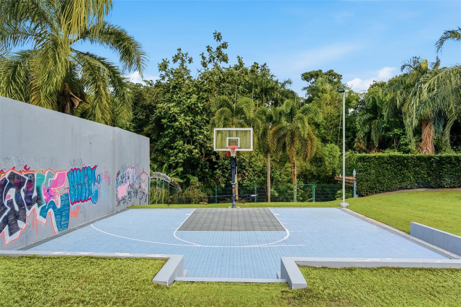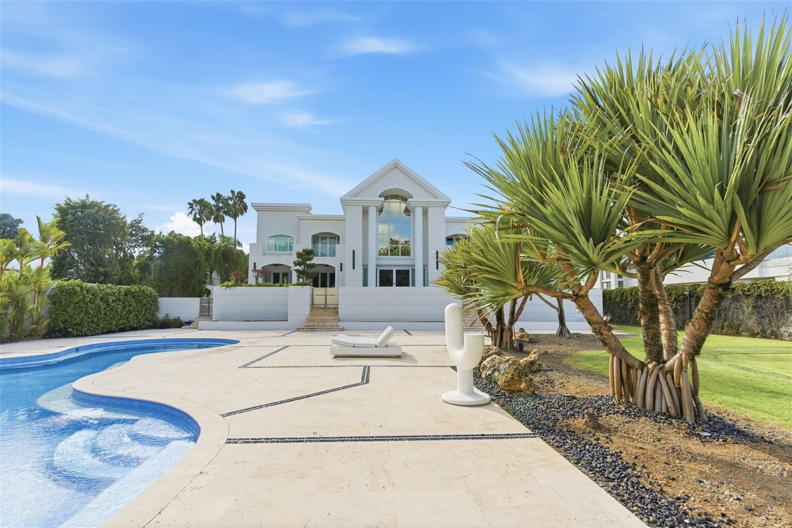 A Landmark Estate on Orquídea Street in Santa María. Set on one of Santa María’s most desirable streets, this distinguished estate occupies over one acre of impeccably landscaped grounds, offering a level of scale, privacy, and architectural presence that is exceptionally rare in San Juan. Approached through an opulent motorcourt, the residence rises with quiet authority. A grand façade, framed by classical columns and symmetrical lines, introduces approximately 9,500 square feet of refined interior living, where double-height ceilings and expansive proportions define every arrival. The home is designed as both a private retreat and a destination for entertaining. Formal and informal living areas flow effortlessly, anchored by a chef’s kitchen, a spacious family room with dry bar and media wall, a dedicated cinema, wine room, pool room, and private office—each space thoughtfully positioned to balance elegance with comfort. Outdoor living unfolds on a true estate scale. Manicured lawns frame a resort-style swimming pool, expansive terraces, and grand balconies overlooking the grounds. An outdoor kitchen and deck create a natural gathering point for entertaining, while a half basketball court adds a lifestyle-driven dimension rarely found in homes of this caliber. Multiple levels are seamlessly connected by a private elevator and dumbwaiter, enhancing everyday functionality without compromising the home’s formal character. Expansive bedroom suites offers privacy and tranquility, completing a layout designed for multigenerational living or extended stays. This is a residence for those who value architectural presence, generous proportions, and enduring quality—a true Santa María estate that stands apart for its scale, setting, and sense of permanence.