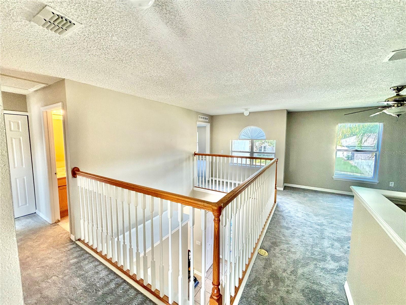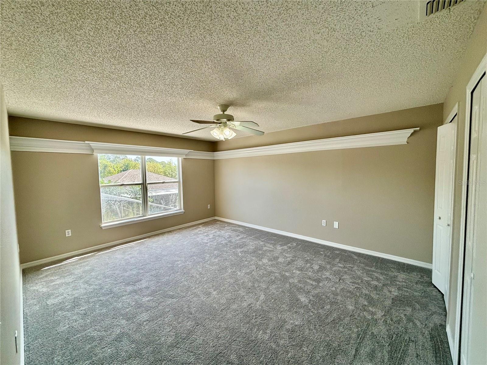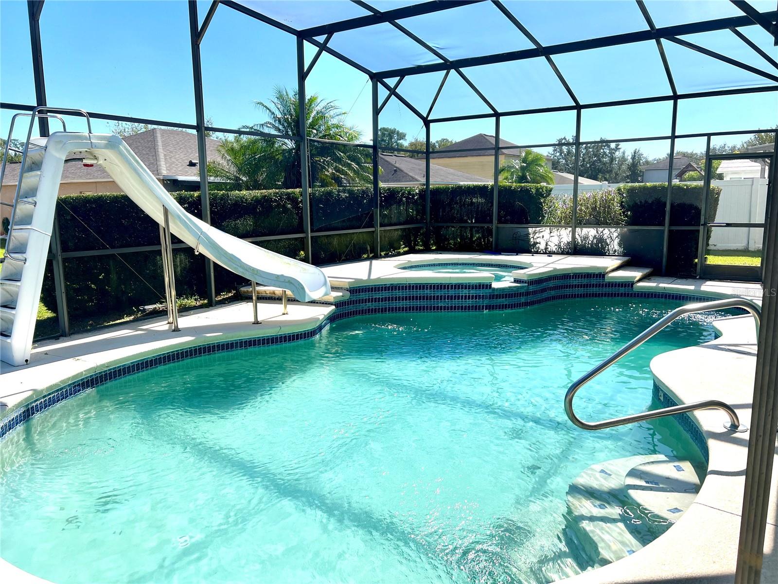 This 4 bedroom pool home on corner lot in the Crown Colony community As you walk in, you will notice the cherry wood flooring of the formal dining room, the high ceilings, natural light and open floor plan. The Kitchen has a prep island with a second sink and 2 corner pantries. The Living room has a unique built-in with a dog kennel. All bedrooms are upstairs with a nice retreat. This home has a screened salt water pool with a heated spa and a slide.