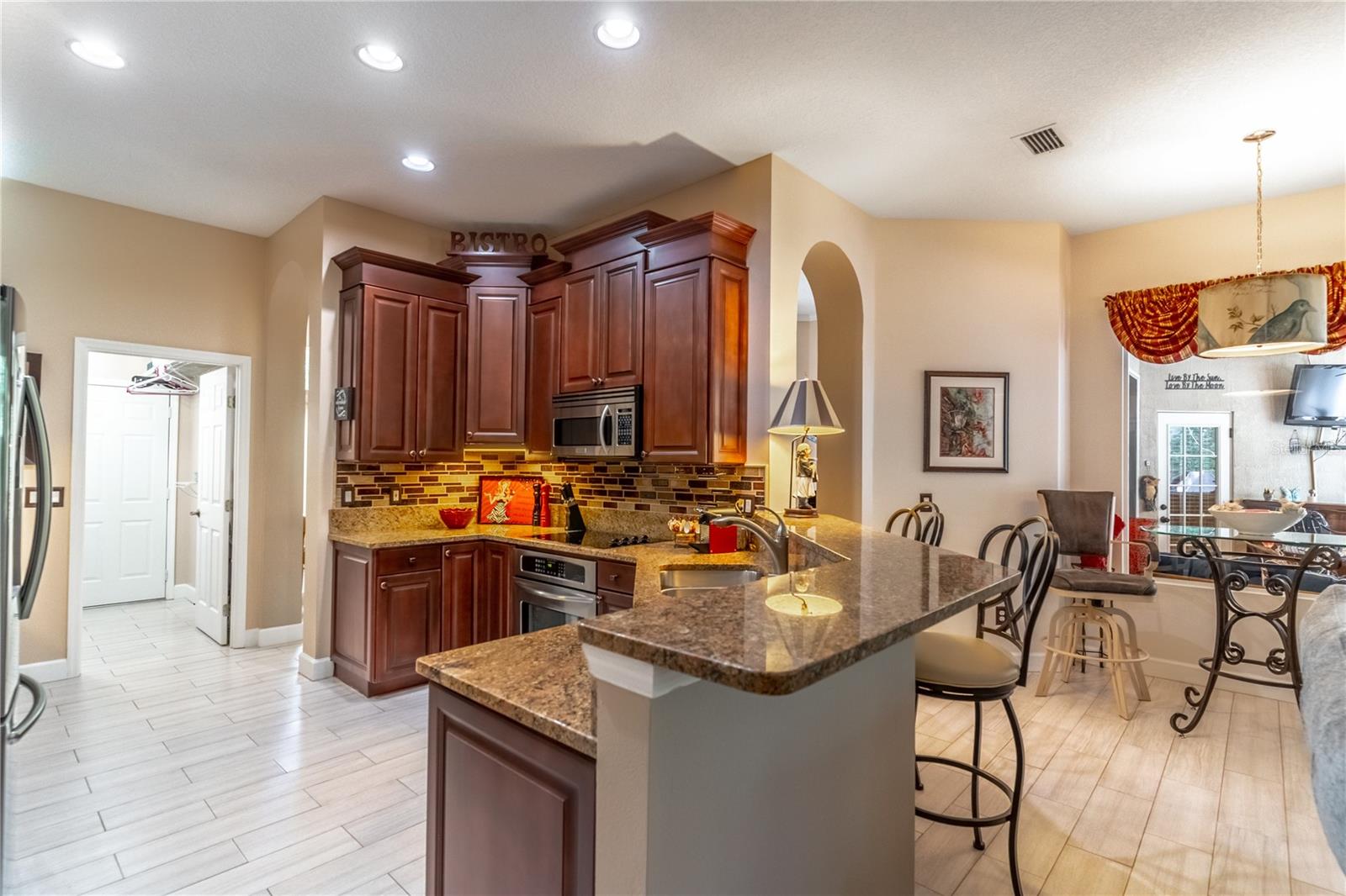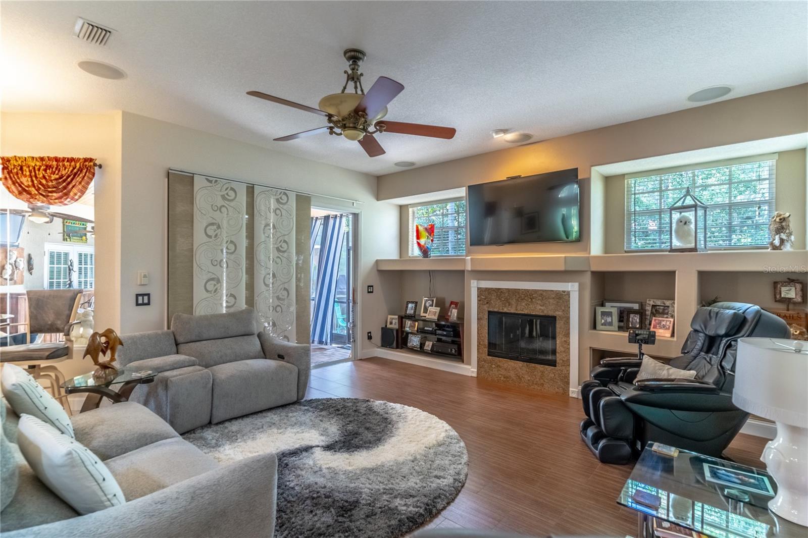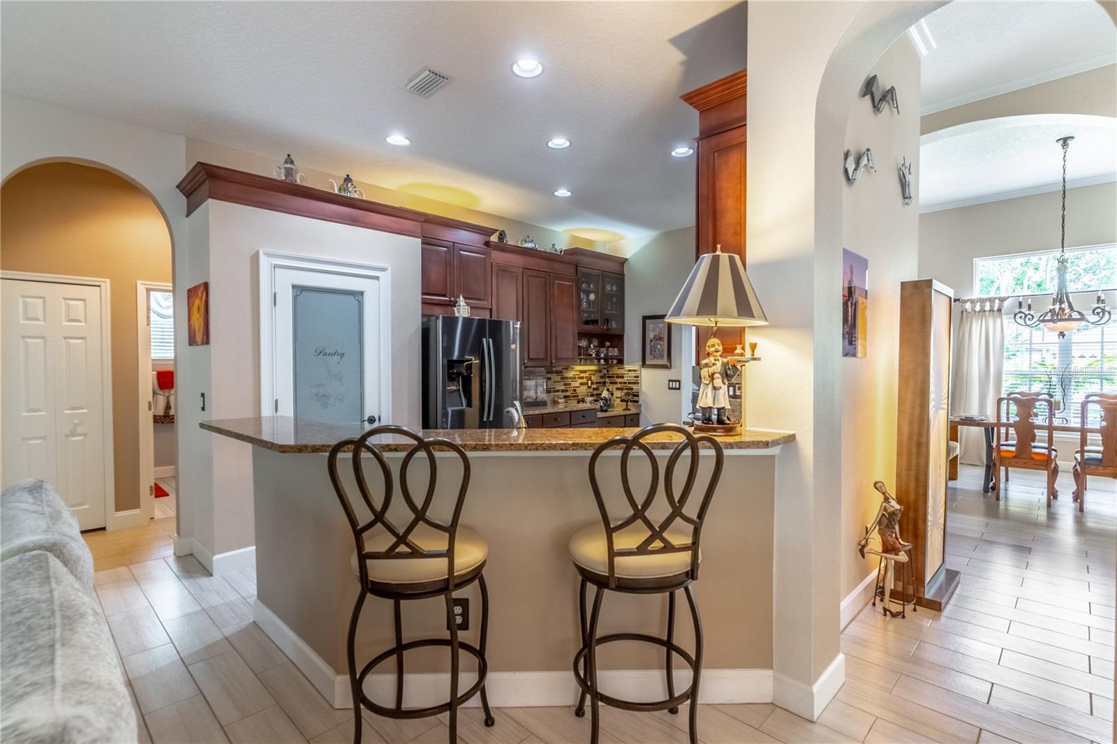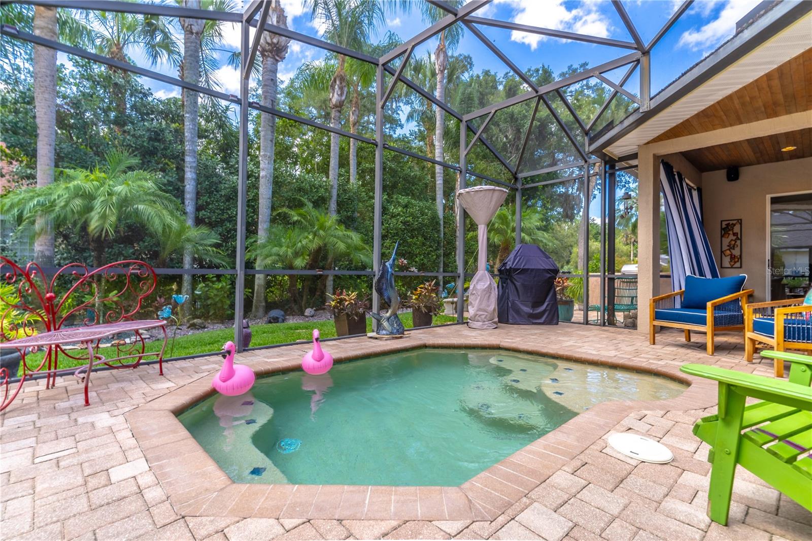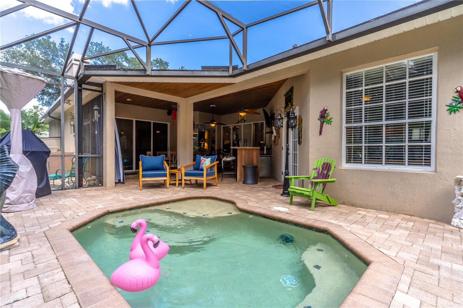 Welcome to your dream home! This stunningly remodeled 4-bedroom, 3-bathroom residence with a 2-car garage and "cocktail pool" is located in the very desirable, highly sought after, 24-hour guard-gated community of Lake Forest in Sanford, FL. Situated on a .33-acre corner lot near a cul-de-sac, this home offers extra privacy and tranquility. The thoughtfully designed split-bedroom layout boasts elegant crown molding, separate living and dining rooms, and a cozy family room featuring porcelain tile wood plank flooring, a wood-burning fireplace, and a built-in entertainment center. The family room & living room opens up to a spacious 21'x26' pavered screened lanai with "cocktail pool", built-in bar, and built-in grill just off patio, making it perfect for entertaining. The primary bedroom suite features two walk-in closets and a remodeled bathroom with dual sinks, porcelain tile, a custom shower with a luxurious Dynamic Infrared Maxxus 2-person Bluetooth compatible FAR Infrared Sauna in Hemlock Wood. The modern kitchen is a chef’s delight, featuring 42" cherrry wood cabinets, closet pantry, stainless steel appliances including a built-in oven, cooktop, microwave, and dishwasher, under-cabinet lighting, granite countertops, and a tiled backsplash. Recent upgrades include a NEW ROOF and WATER HEATER (2024), NEW HVAC with dual blue light filtration (2023), REPIPED (2018), and fresh exterior paint. This exceptional home is perfect for both family living and entertaining. The Lake Forest community is known for its natural beauty and resort-style amenities situated on a 55-acre spring-fed lake, with walking trails and plenty of wildlife. The community features designated conservation areas throughout, 10,000 square foot clubhouse with a full fitness center, kitchen, and meeting rooms, a Junior Olympic sized swimming pool with a heated spa and a kiddie pool, lighted tennis courts and two lighted pickleball courts, Basketball courts, playground, and a private sand beach with a volleyball court and fishing dock. Opportunity for canoeing, kayaking, and fishing on the lake. The Lake Forest Social Club organizes events year-round for all ages. Beautifull Gated entrance with 24-hour security. Fantastic location, close to shopping centers, restaurants, and entertainment options in Sanford and Lake Mary area with easy access to I-4 and 417 & Wekiva Parkway for reaching all of Central Florida, including World Famous Beaches & Amusement Parks and Downtown Mt Dora. Don’t miss this opportunity! Schedule a showing today!