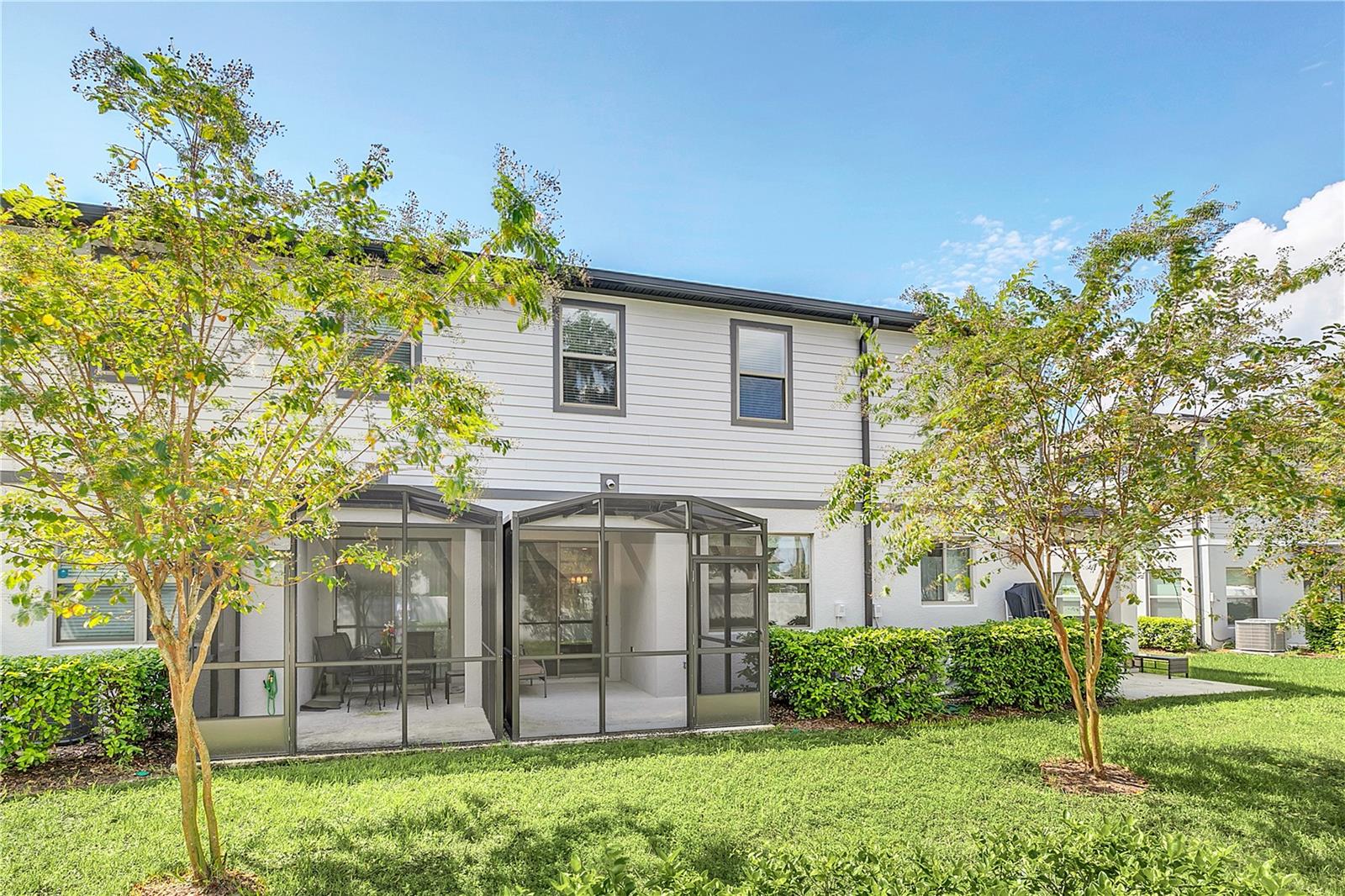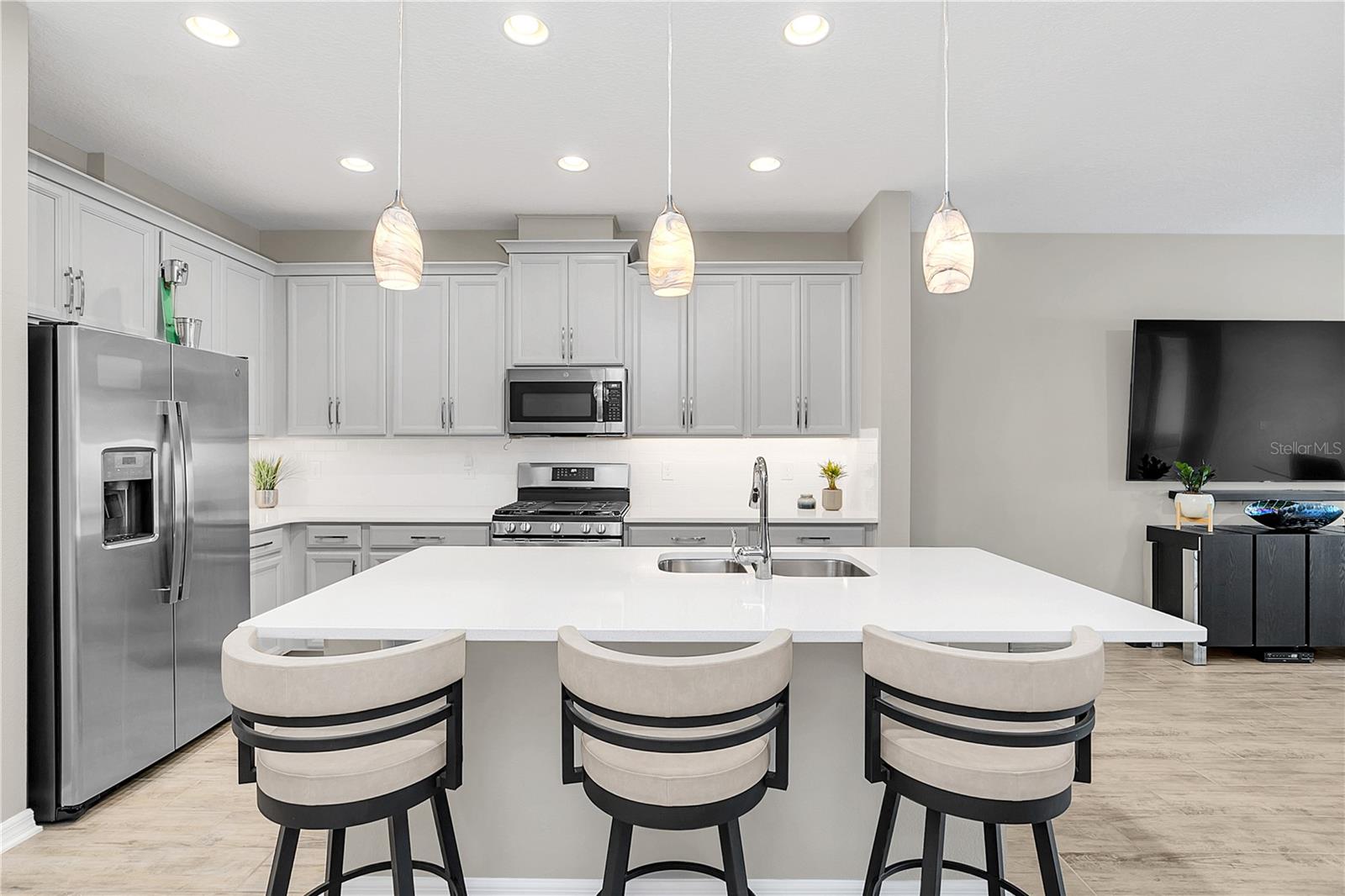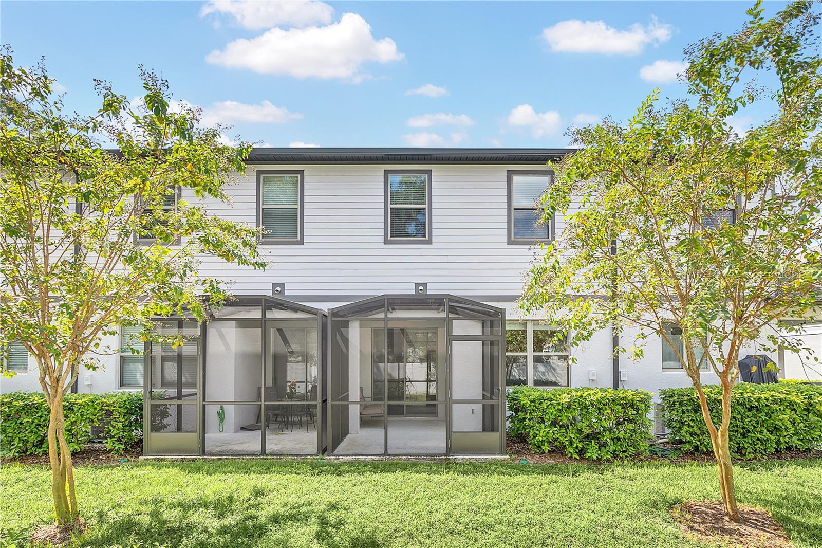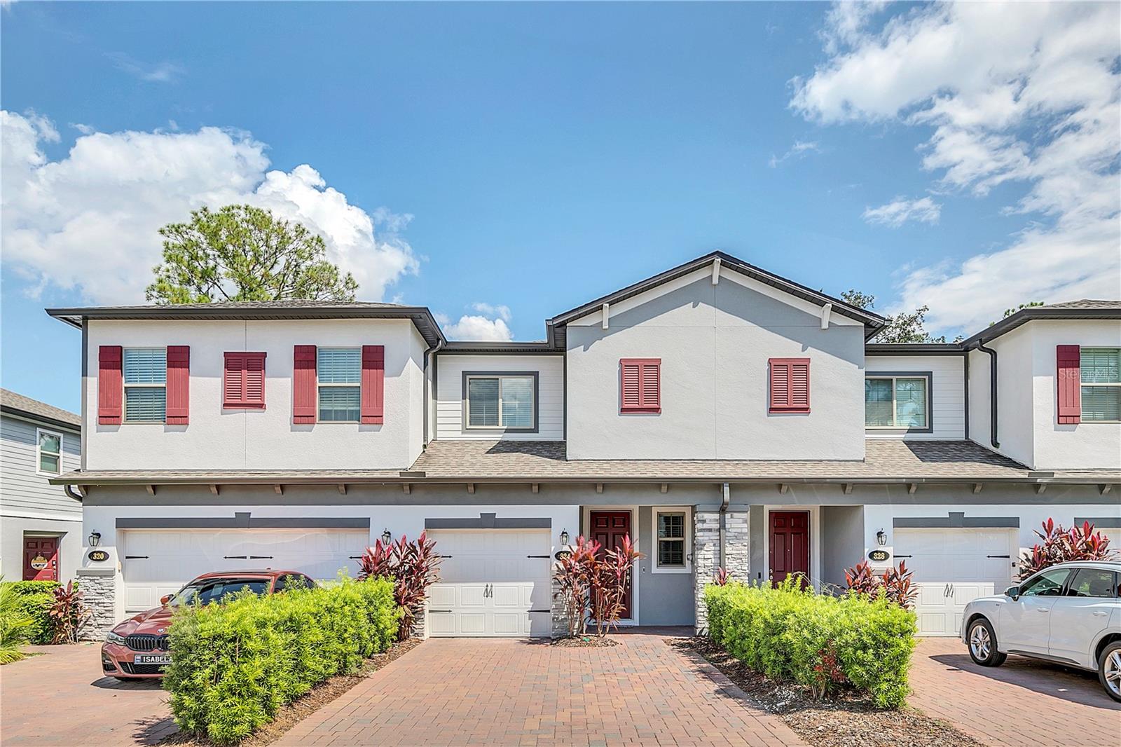 Immaculate, energy efficient townhouse in the back of the complex on a quiet dead-end street with extra parking across the street. This home looks new with nice upgrades and amenities. Gorgeous, light, bright and open floor plan that is tastefully decorated. Spacious kitchen has 42-inch gray colored cabinets with built-in lighting under the cabinets, crown molding, brushed polished door handles, quartz countertops and a large island designed to accommodate seating. All kitchen appliances are Stainless Steel and included. Refrigerator is side-by-side with ice and water in the door. The kitchen has a spacious pantry, vented microwave and tile backsplash. All walls are painted a light gray taupe color with white accents. The entire downstairs has a light-colored ceramic wood look flooring. The spacious owner suite has a nice-sized walk-in closet, dual sinks, and a separate tub and shower. Upstairs, there is an air-conditioned laundry area, and the washer and dryer are included. There is a nice loft area between the upstairs bedrooms. Modern recessed lighting throughout and fire prevention water sprinklers built into the volume knockdown ceilings, garage door opener with two controls, decor epoxy floor covering, a sliding glass door looks out onto the screened covered porch with no neighbors behind the home. The backyard is nicely landscaped and partially fenced. Brick paver driveway and entryway. There are blinds on all windows and the sliding glass door. The security-gated community offers a dog park, swimming pool and playground with a scenic fountain in the community pond. Low HOA fee, low power bill with lots of energy efficiencies built in including gas appliances and termite prevention system. Great schools and conveniently near Seminole Town Center, restaurants, the Orlando/Sanford airport, Interstate 4, the zoo, Sunrail, Amtrak station and downtown Sanford.