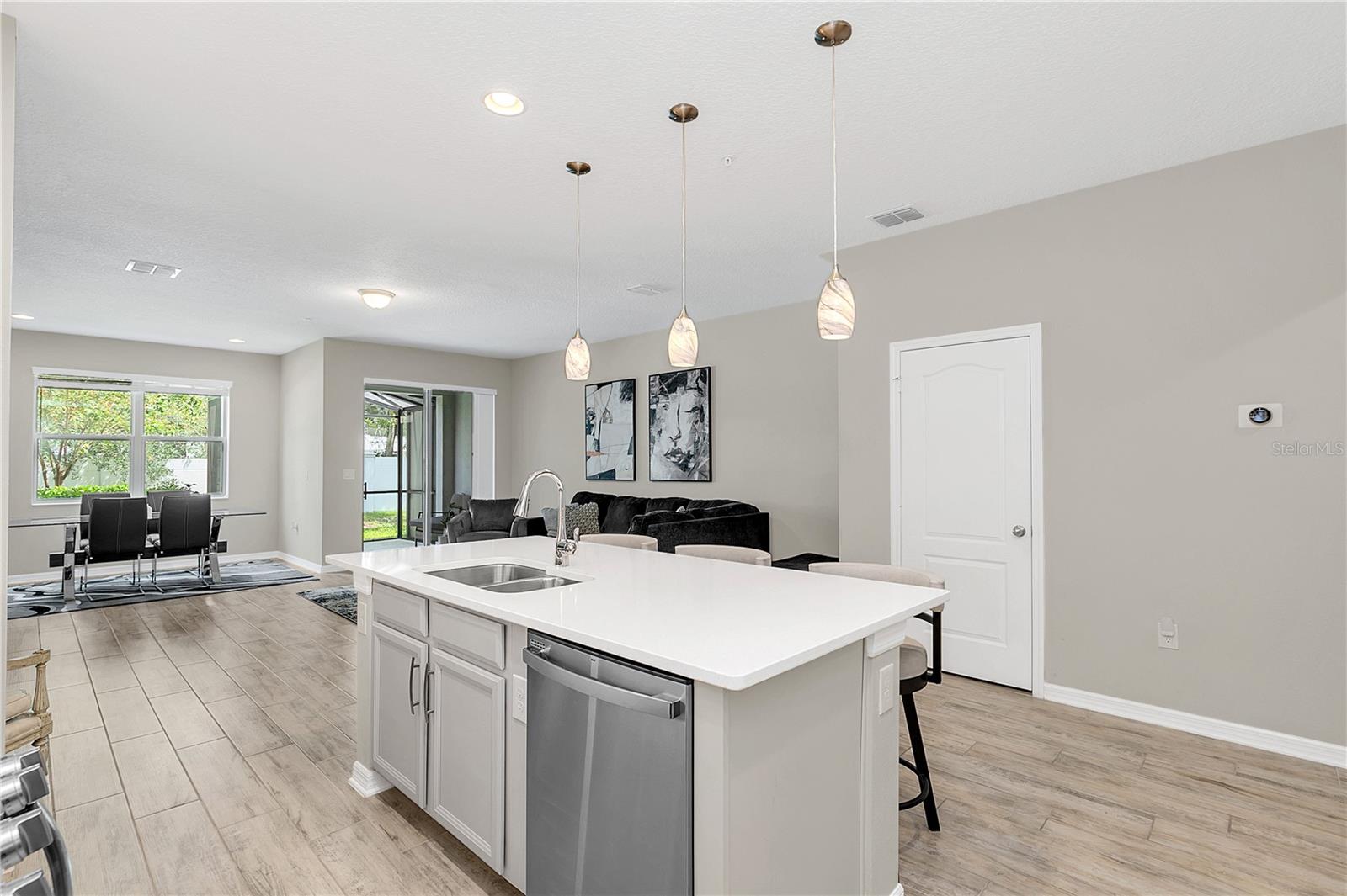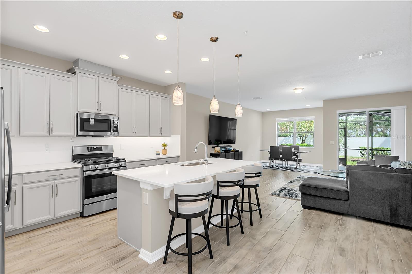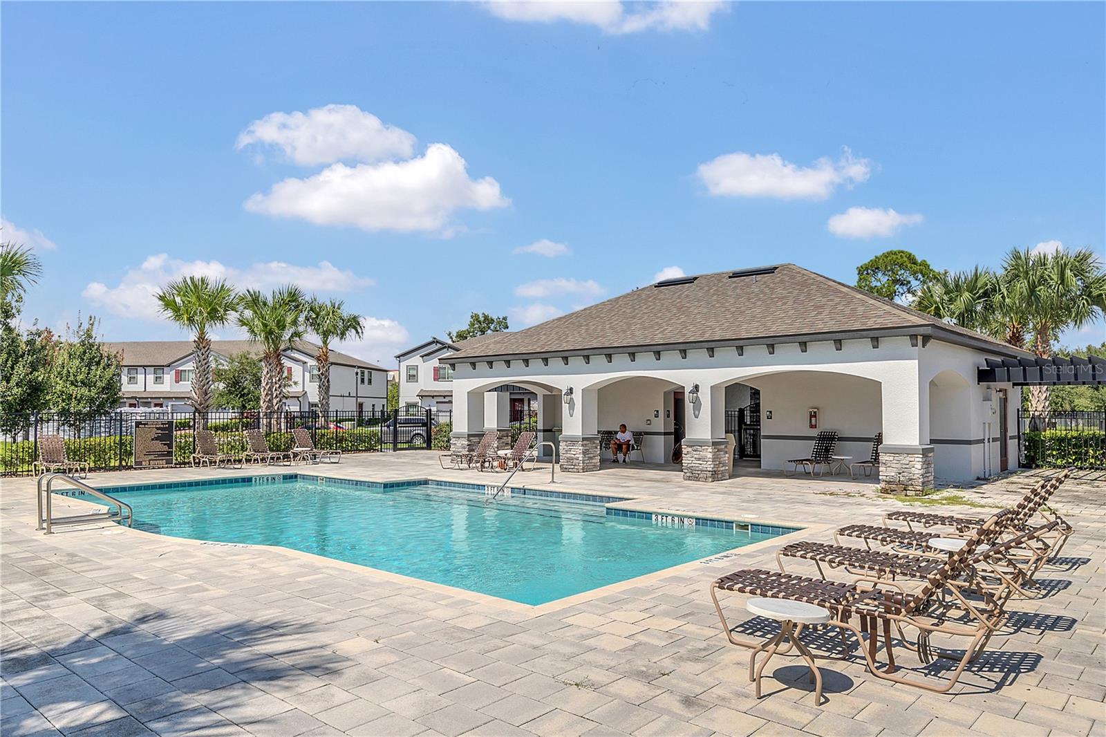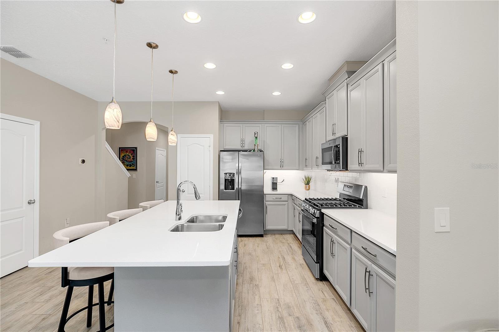 Immaculate, energy efficient townhouse in the back of the complex on a quiet dead-end street with extra parking across the street. This home looks new with nice upgrades and amenities. Gorgeous, light, bright and open floor plan that is tastefully decorated. Spacious kitchen has 42-inch gray colored cabinets with built-in lighting under the cabinets, crown molding, brushed polished door handles, quartz countertops and a large island designed to accommodate seating. All kitchen appliances are Stainless Steel and included. Refrigerator is side-by-side with ice and water in the door. The kitchen has a spacious pantry, vented microwave and tile backsplash. All walls are painted a light gray taupe color with white accents. The entire downstairs has a light-colored ceramic wood look flooring. The spacious owner suite has a nice-sized walk-in closet, dual sinks, and a separate tub and shower. Upstairs, there is an air-conditioned laundry area, and the washer and dryer are included. There is a nice loft area between the upstairs bedrooms. Modern recessed lighting throughout and fire prevention water sprinklers built into the volume knockdown ceilings, garage door opener with two controls, decor epoxy floor covering, a sliding glass door looks out onto the screened covered porch with no neighbors behind the home. The backyard is nicely landscaped and partially fenced. Brick paver driveway and entryway. There are blinds on all windows and the sliding glass door. The security-gated community offers a dog park, swimming pool and playground with a scenic fountain in the community pond. Low HOA fee, low power bill with lots of energy efficiencies built in including gas appliances and termite prevention system. Great schools and conveniently near Seminole Town Center, restaurants, the Orlando/Sanford airport, Interstate 4, the zoo, Sunrail, Amtrak station and downtown Sanford.