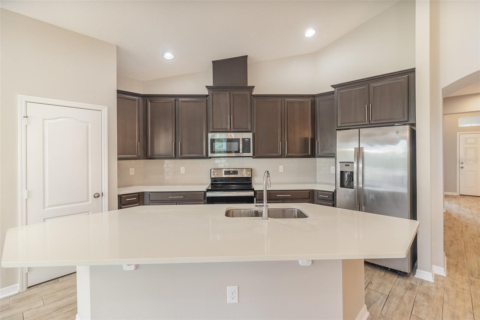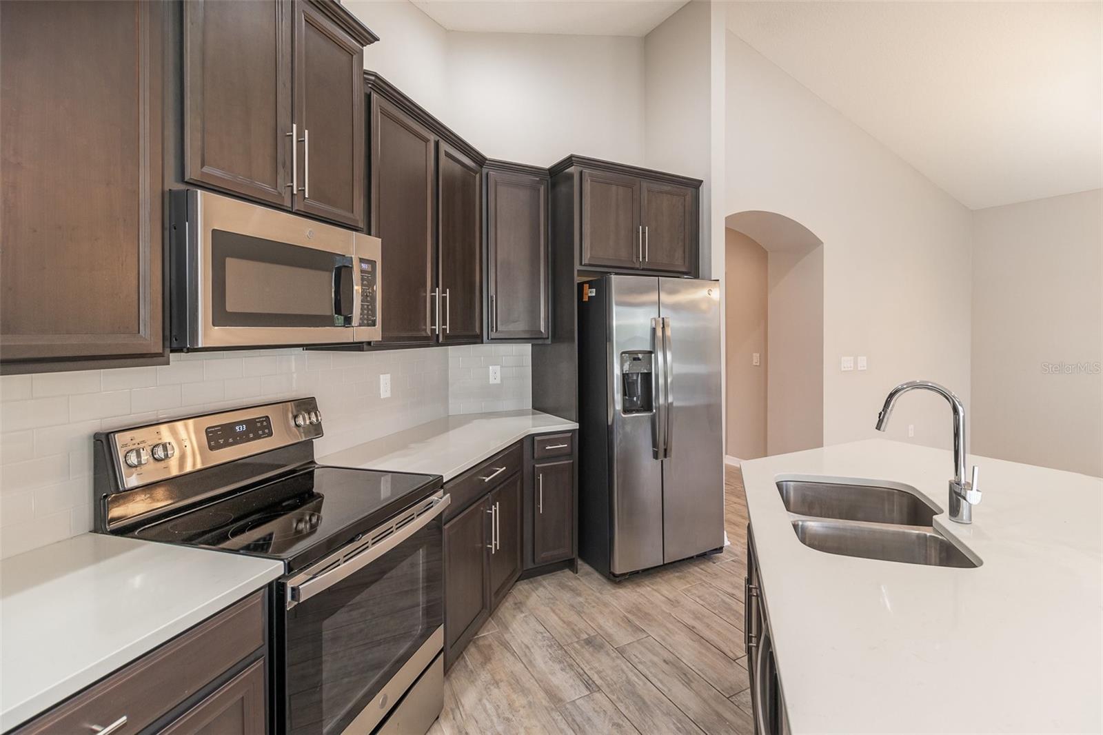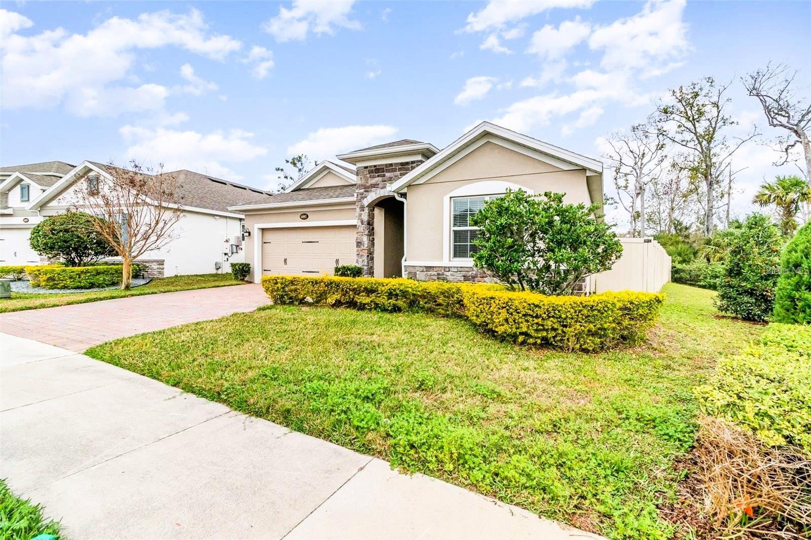 This lovely 3-bedroom, 2-bath home with a 2-car garage masterfully combines style and comfort within the serene, gated community of Cadence Park. Guests and family will revel in the privacy of the thoughtfully designed floor plan, featuring two welcoming bedrooms and a full bath at the front, while the master suite offers a tranquil retreat at the back. The elegant high ceilings in the main living areas creating a sense of openness, The open concept kitchen is the true centerpiece, 42 inch slate cherry wood cabinets, crown molding, modern hardware, quartz counter tops, beautiful backsplash, and the kitchen island with an under-mount sink. Complete with stainless steel appliances and a spacious pantry.
