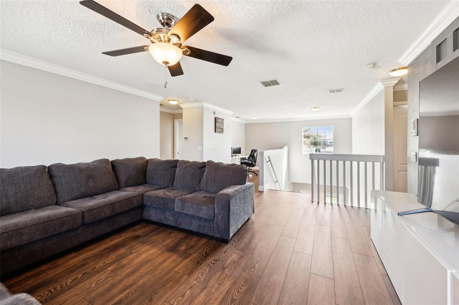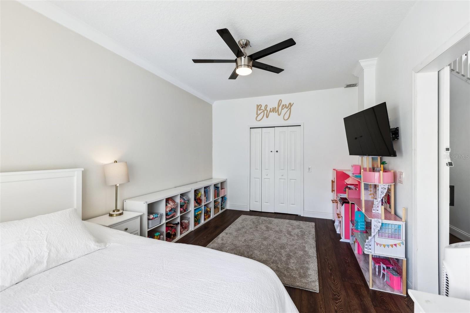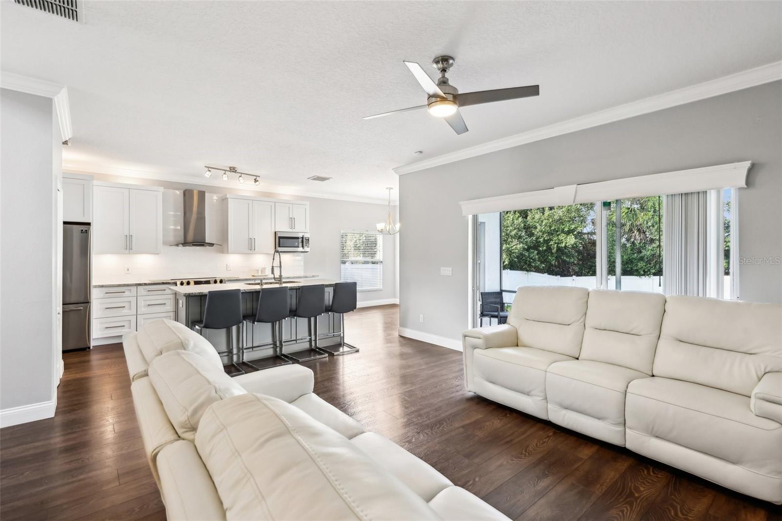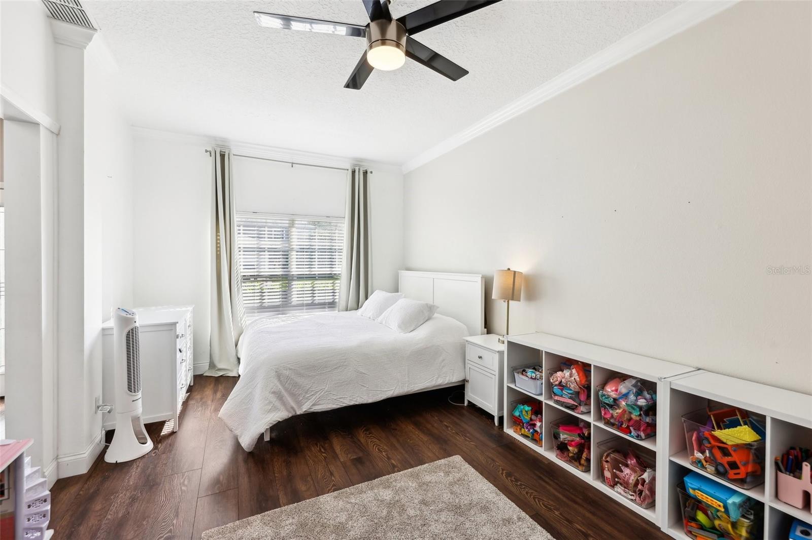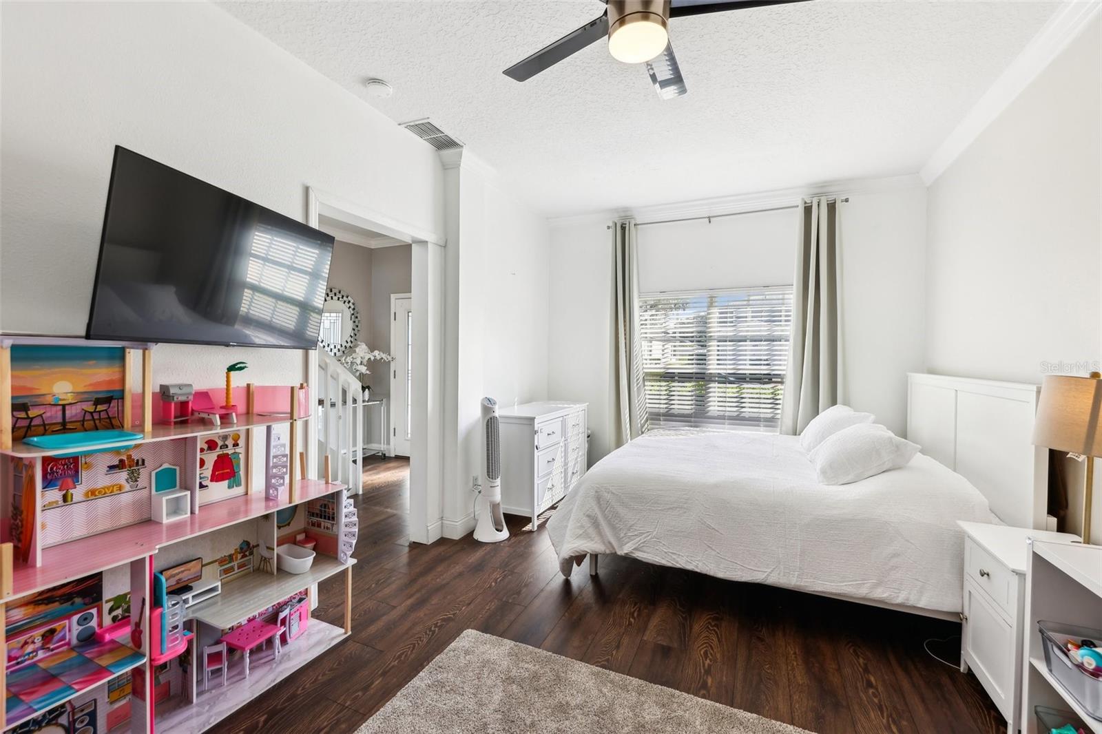 Walking distance from Bentley Elementary and Mike Kirby park as well as close proximity to SR 417 and 1-4 make this house in a gated community a great place to call home. Calabria Cove, is a. beautifully updated 5 BEDROOM 3.5 BATHROOM home offers the perfect blend of style, warmth, and modern living. Step through the grand double doors and into a space where soaring ceilings, crown molding, and an abundance of natural light create an inviting atmosphere that feels like home from the moment you arrive. The thoughtfully designed layout offers flexibility to suit your lifestyle. The formal dining room is a versatile space—whether you envision it as a home office, a second downstairs bedroom, or a cozy flex area, the choice is yours. Just down the hall, an additional large bedroom with a chic barn door provides even more options for a guest suite, creative studio, or media room. At the heart of the home, renovated chef’s kitchen is a true showstopper—boasting brand-new cabinets, sleek countertops, a spacious island, stainless steel appliances, and a charming breakfast nook that’s perfect for casual dining or morning coffee. The main-level primary suite is a private retreat, featuring a spa-like ensuite with dual vanities, a soaking tub, and a separate shower for the ultimate in comfort. Upstairs, a spacious second family room offers a perfect hangout or study space, complete with a built-in niche ideal for a home office or homework station. Three additional generously sized bedrooms and a full bath complete the upper level, making it easy to accommodate family and guests alike. This home has been thoughtfully refreshed throughout—new light fixtures, fans, and bathroom vanities (all replaced within the last two years), updated laminate flooring, custom wood steps on the staircase, and fresh exterior paint that gives the home a crisp, modern look. The roof is only three years old, and all toilets have been updated, ensuring peace of mind for years to come. Outside, enjoy the screened lanai and fully fenced backyard—your own private retreat with no rear neighbors. Whether it’s quiet mornings, afternoon gatherings, or laid-back weekends, this outdoor space was designed for relaxation. With only 37 homes, Calabria Cove offers a rare boutique community vibe, all while keeping you close to top-rated schools, shopping, dining, and major highways for an easy commute. Don’t miss your chance to experience the lifestyle this home offers—schedule your private tour
