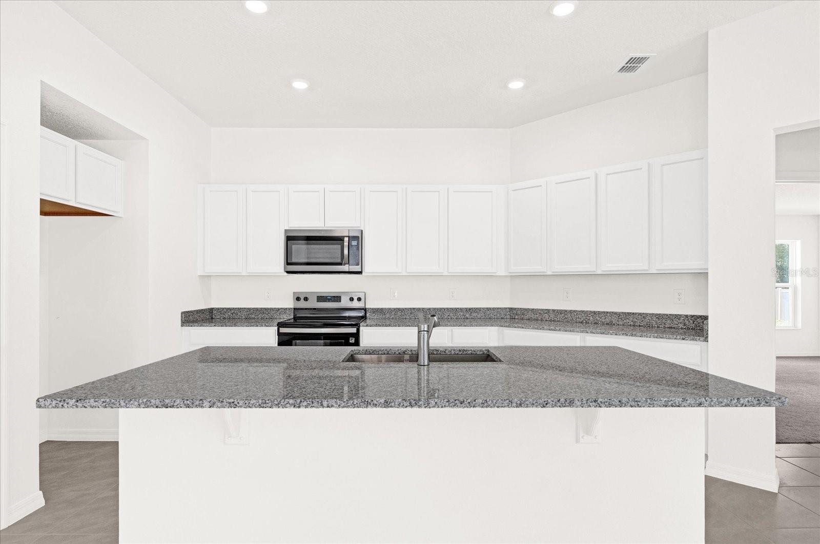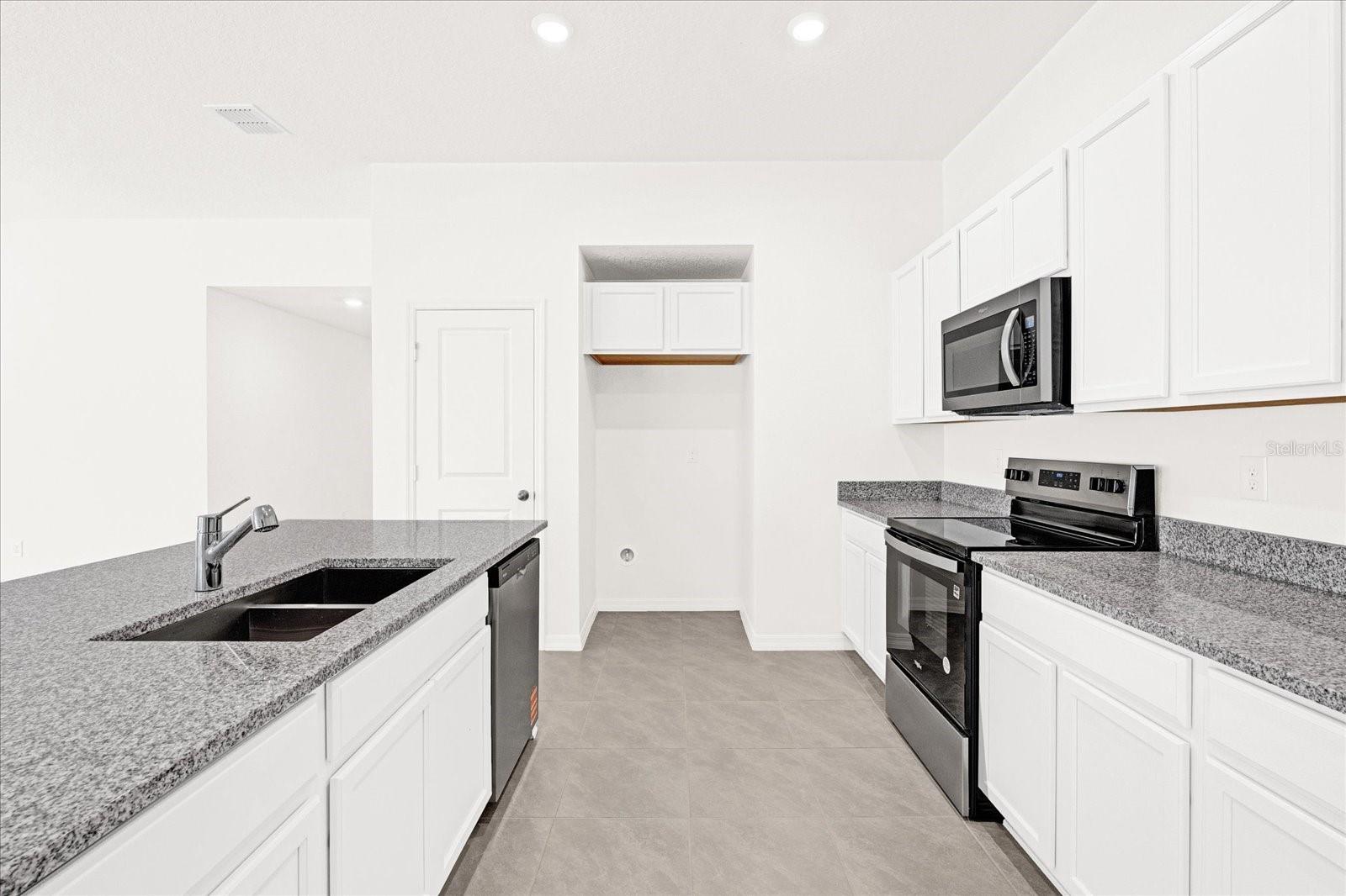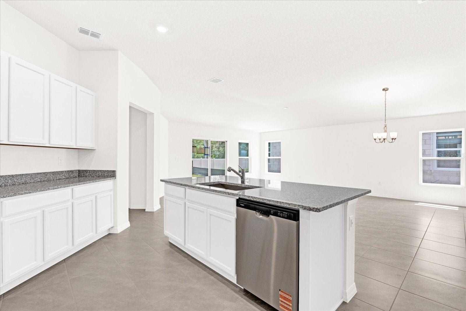 This beautiful, single-story home showcases an open floor plan with tile flooring and a spacious great room that features volume ceilings. Enjoy the convenience of a dedicated laundry room. The modern kitchen boasts 36-in. cabinets, granite countertops, an island, a Moen® faucet, a Kohler® sink and Whirlpool® appliances. Relax in the primary suite, which includes a walk-in closet and connecting bath that offers a linen closet, dual-sink vanity and walk-in shower with tile surround. Relax after a long day on the extended covered back patio.