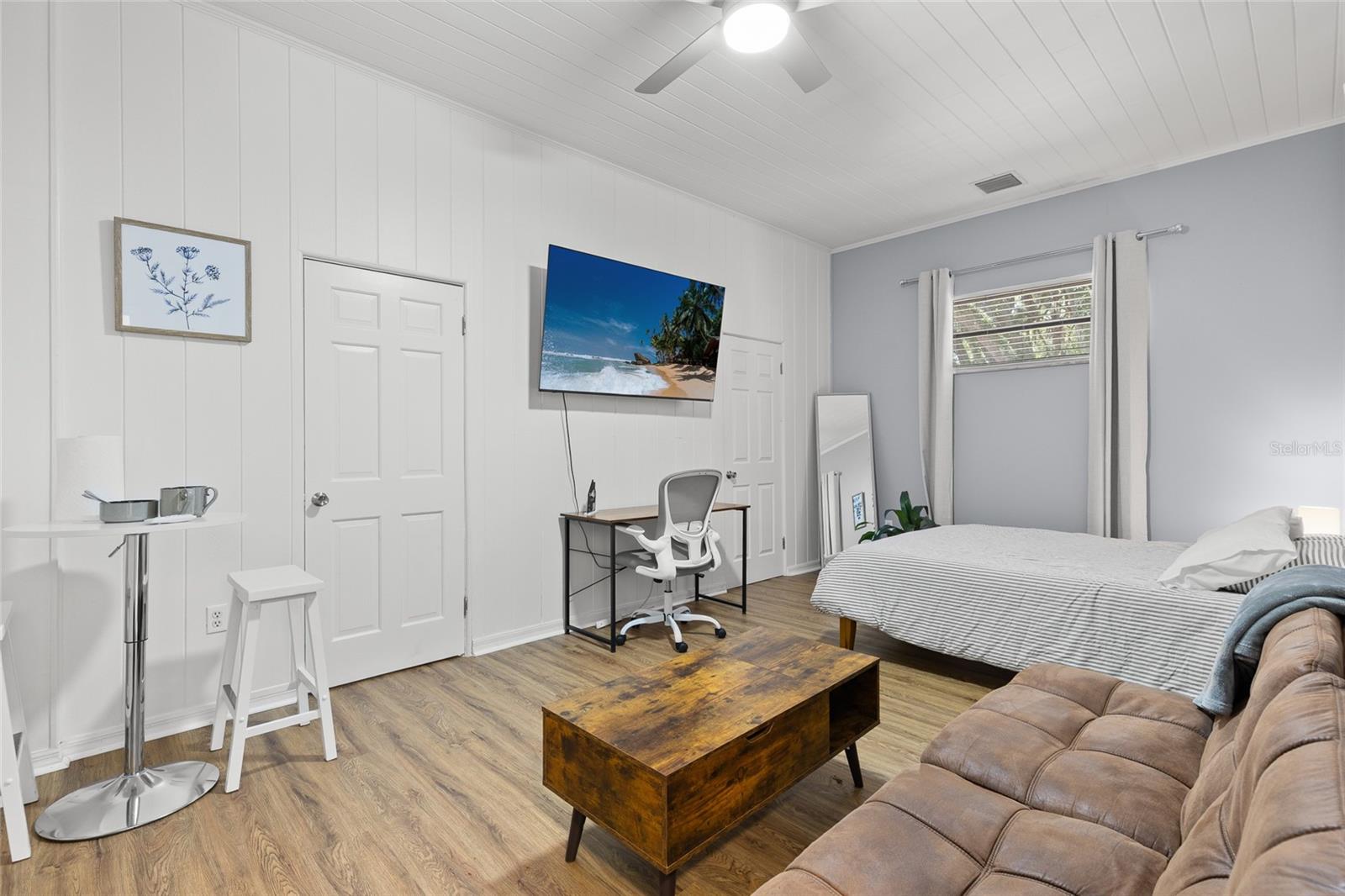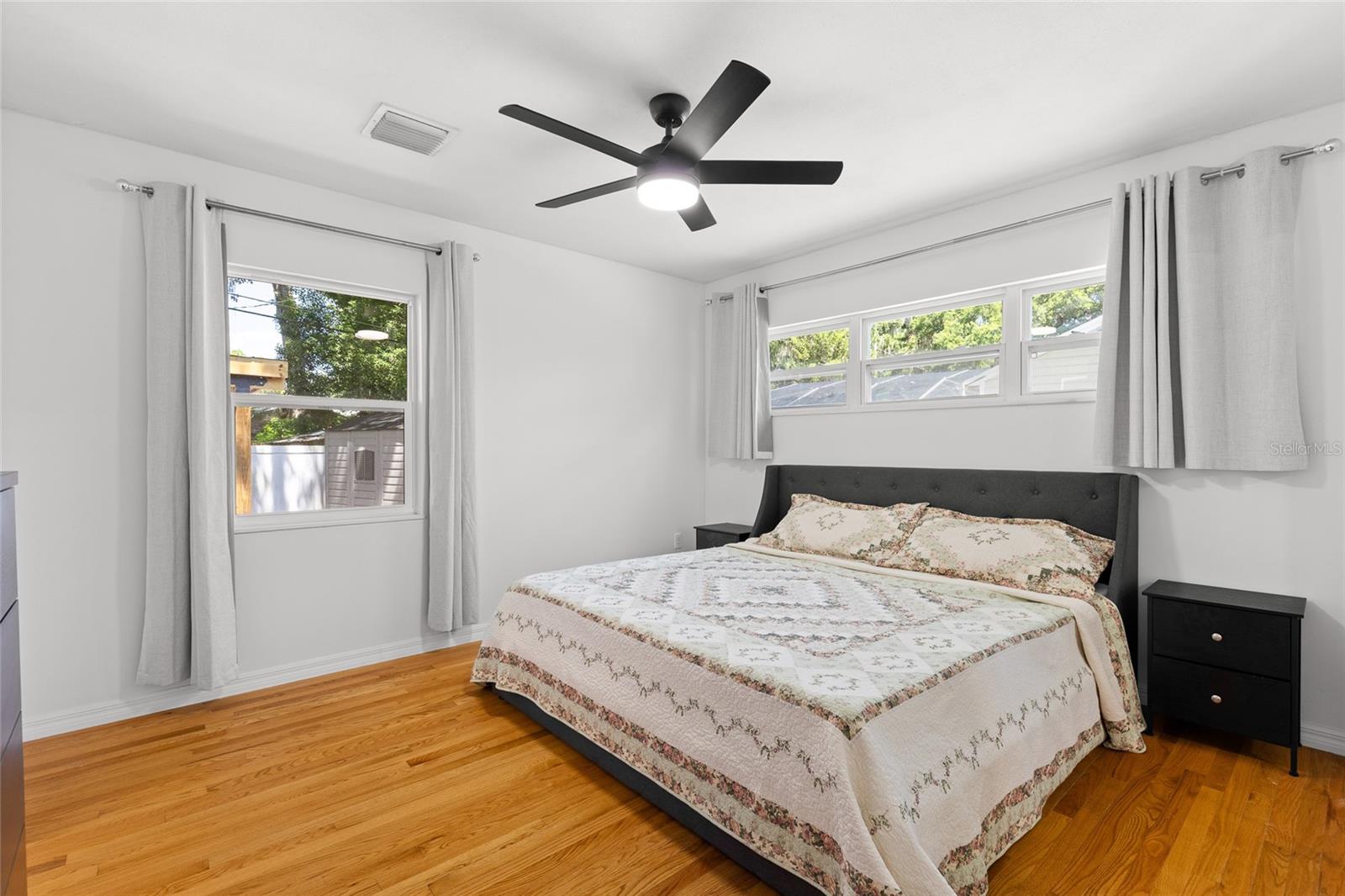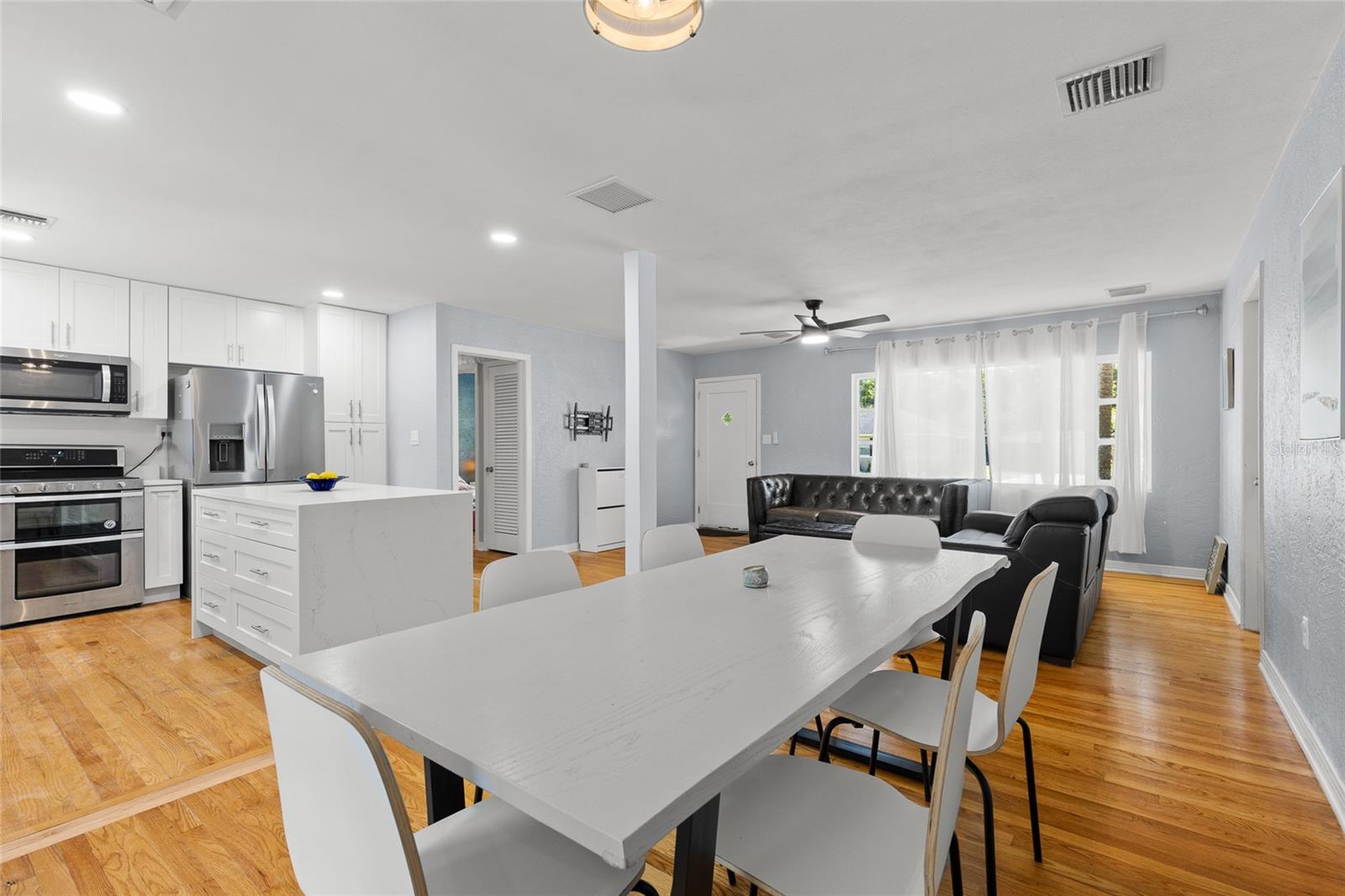 Located just outside the Sanford Historic District, this established neighborhood welcomes you to mid-century charm. This beautifully updated home blends classic charm with modern upgrades. The newly renovated kitchen features quartz countertops, waterfall island, gas double oven and soft-close cabinetry - perfect for entertaining or staying connected with the family fun. Original hardwood floors flow throughout the main house complemented by two updated bathrooms with Carrera marble counters, porcelain tile floors and touch-controlled LED mirrors with automatic defoggers. The sunroom opens to a enchanting back patio with new pavers, a picturesque pergola, and gas fire pit - an inviting space to unwind and savor the beauty of the Florida outdoors. Recent updates include new double pane windows and added insulation in two bedrooms, new pavers to front door, gutters, gas water heater, heat pump, upgraded electrical panel and electric car charger. A private in-law suite offers its own entrance, bathroom, laundry and basic kitchen essentials, and has functioned successfully as an Airbnb - especially convenient given the limited nearby hotel options and proximity to the Sanford/Orlando International Airport. Enjoy the vibrant lifestyle of downtown Sanford just minutes away, with festivals, riverfront parks and dining, Farmers Market, and unique local shops. American Home Shield warranty provided by Sellers with acceptable terms
