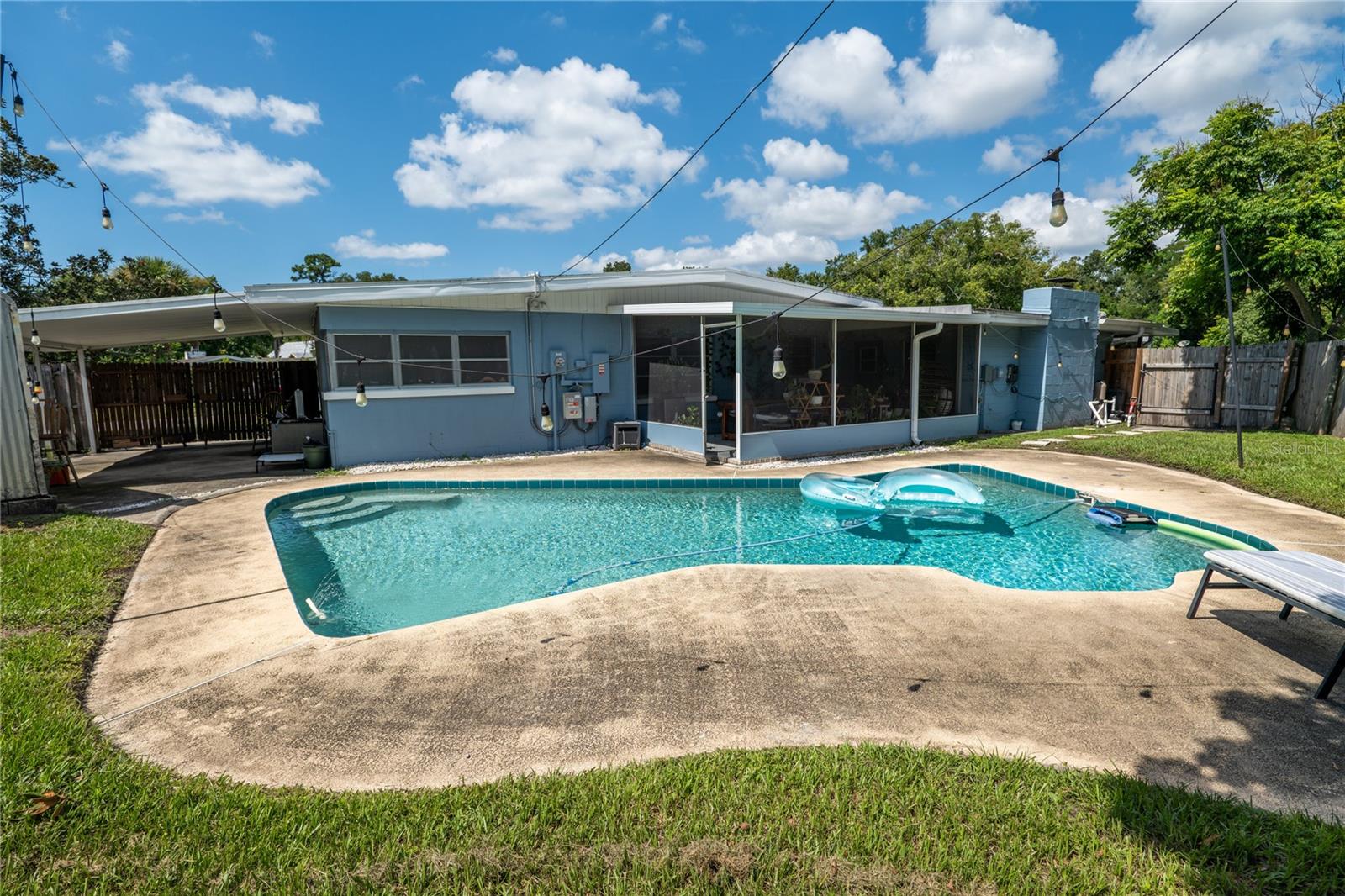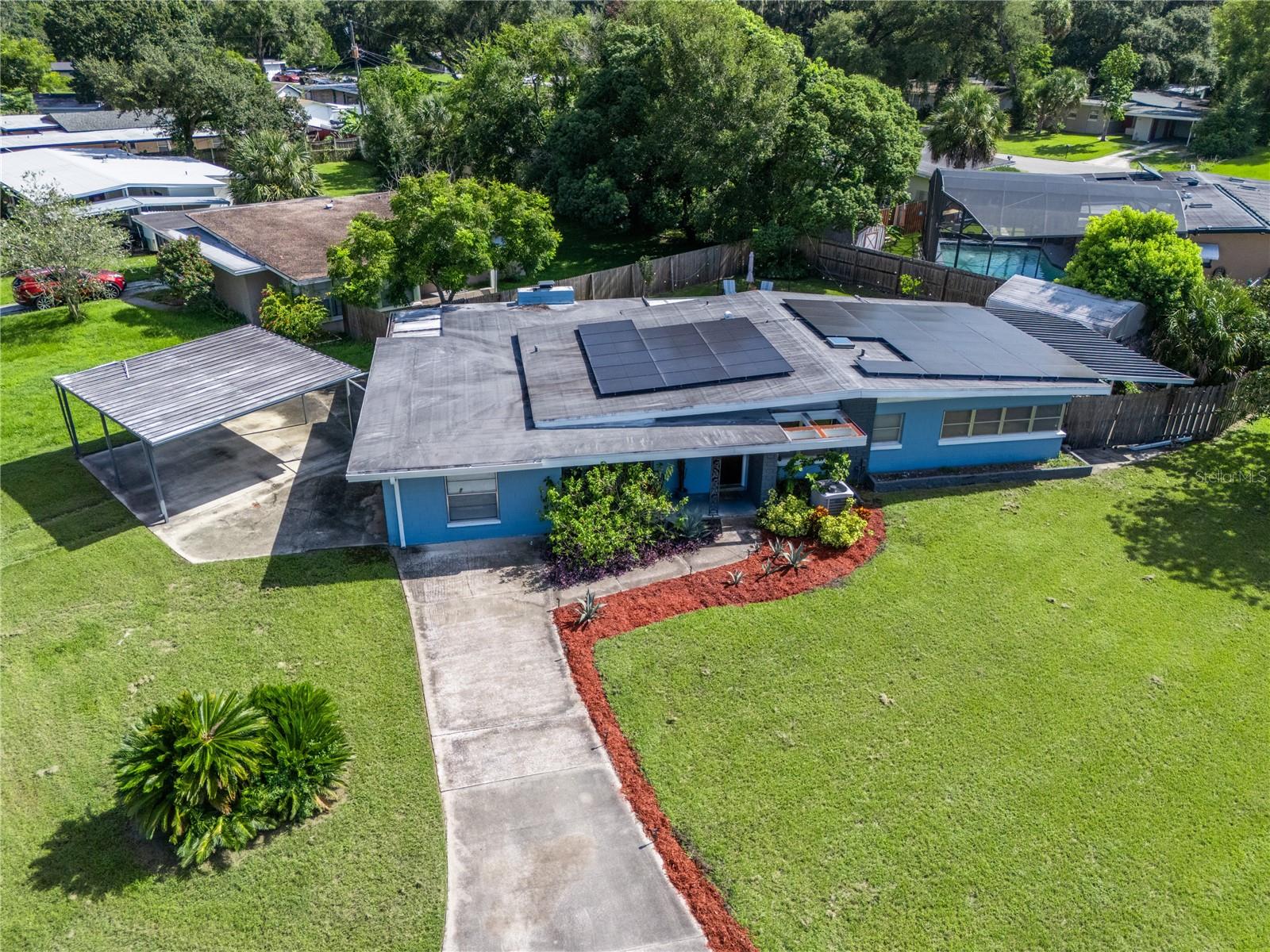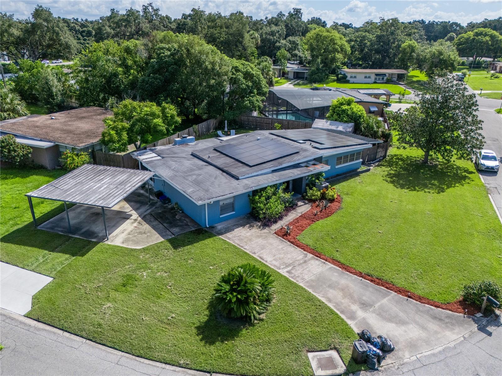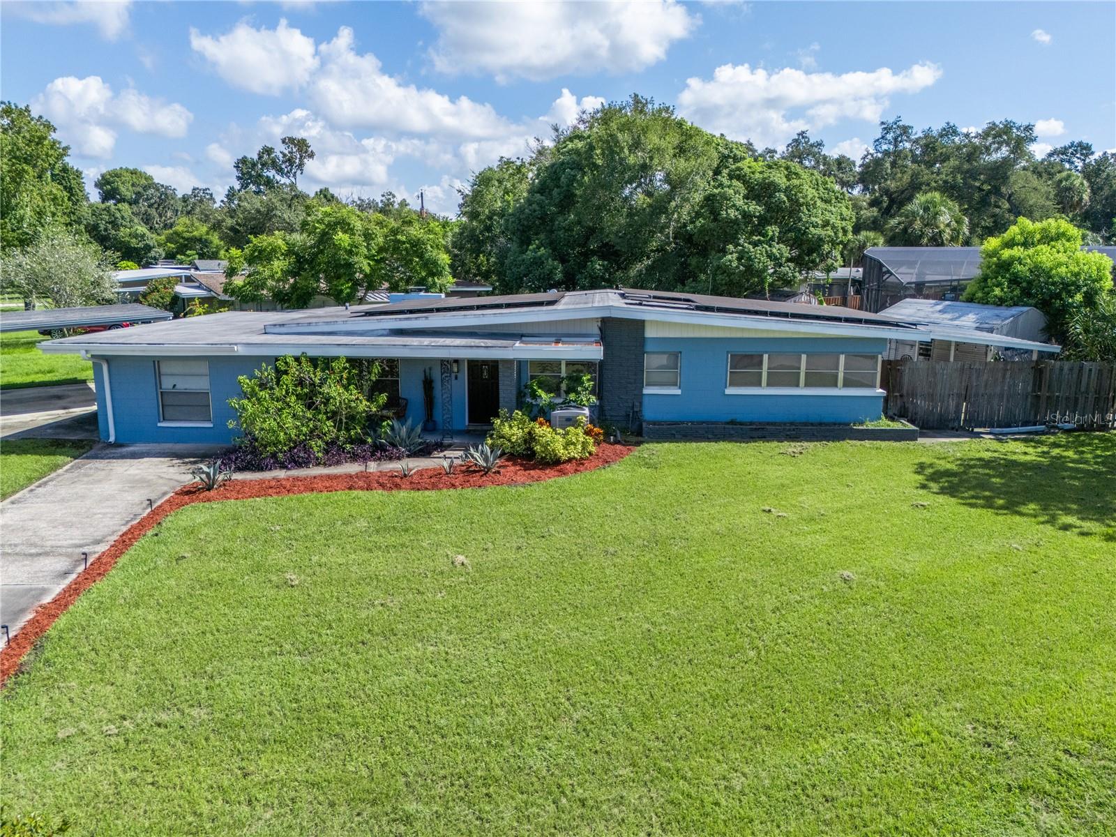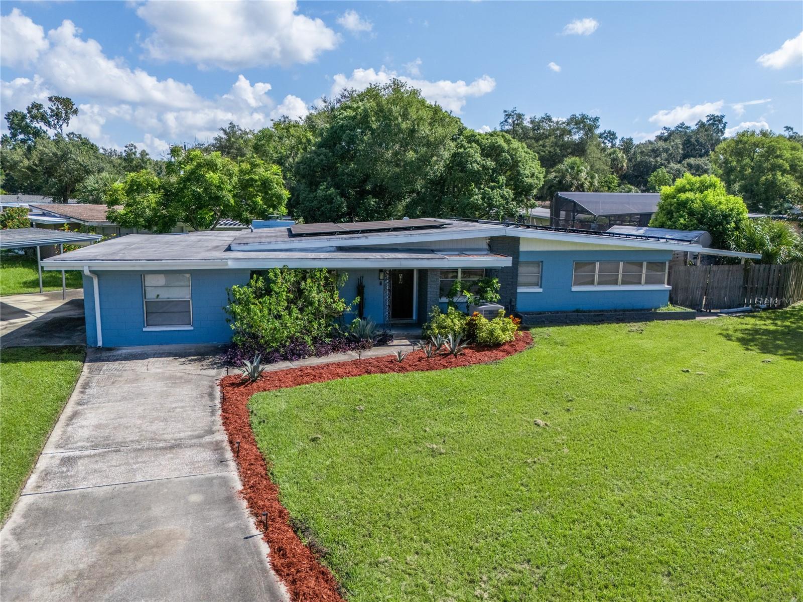 To experience a fully immersive walk-through of this home click on the Video or Virtual Tour button on this page. Step into timeless style and modern comfort with this beautifully maintained three-bedroom, two-bath mid-century modern home on a spacious quarter-acre lot. From the moment you arrive, you’ll notice the home’s character and inviting curb appeal. Inside, a bright and airy open layout welcomes you, highlighted by a neutral color palette and plenty of natural light. The generous living room with tile floors offers the perfect place to relax after a long day or entertain guests. Just off the living space, a versatile bonus room, currently used as a gym, could easily transform into a home office, playroom, or even a fourth bedroom to fit your lifestyle needs. The stylish kitchen is a true standout, featuring porcelain counters and backsplash, terrazzo floors, gold accents, stainless steel refrigerator & dishwasher, a wall oven, cooktop, and a cozy eat-in area. Adjacent to the living room, the warm and inviting sitting room with a brick fireplace, rich wood ceilings, and plenty of space for gatherings makes the perfect spot for game nights, reading by the fire, or entertaining family and friends. The primary suite offers comfort with terrazzo flooring, a ceiling fan, and a private bath featuring a modern vanity and tiled shower/tub combo. Two additional bedrooms provide flexibility for family, guests, or work-from-home setups, and share a second full bath with shower/tub. Step outside to your private backyard oasis. The large screened-in patio overlooks a sparkling saltwater pool, perfect for summer fun or year-round entertaining. The fully fenced yard provides both privacy and peace of mind, complete with a storage shed, carport, and two separate driveways for extra parking. Practical upgrades include solar panels for energy savings and a new pool pump and, 2020 roof for peace of mind. With no HOA, ample space for toys, boats, and a move-in ready interior, this home offers both style and convenience.