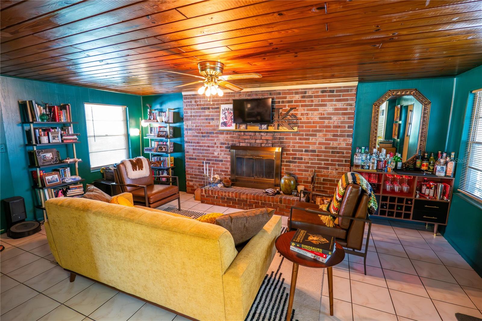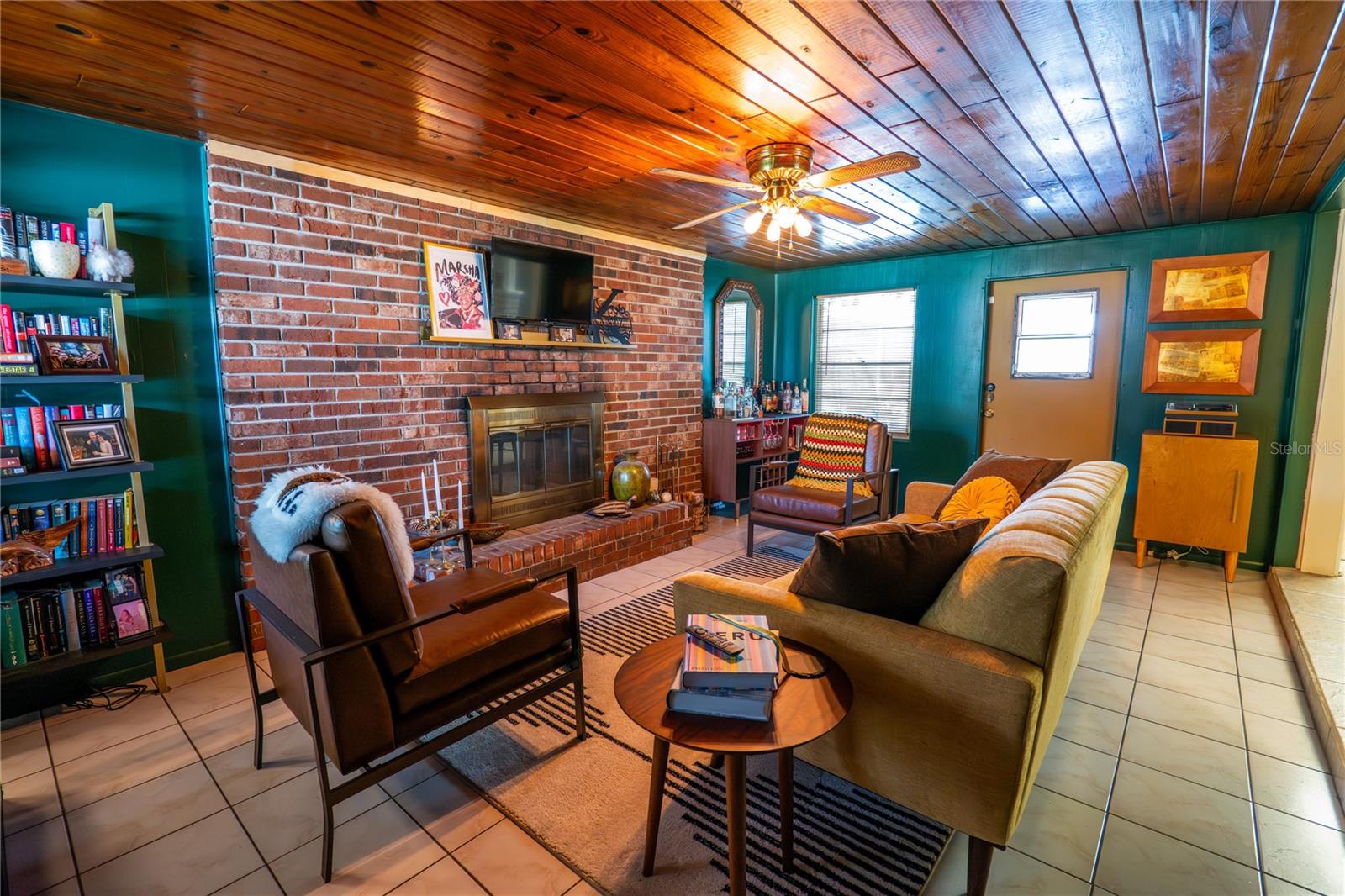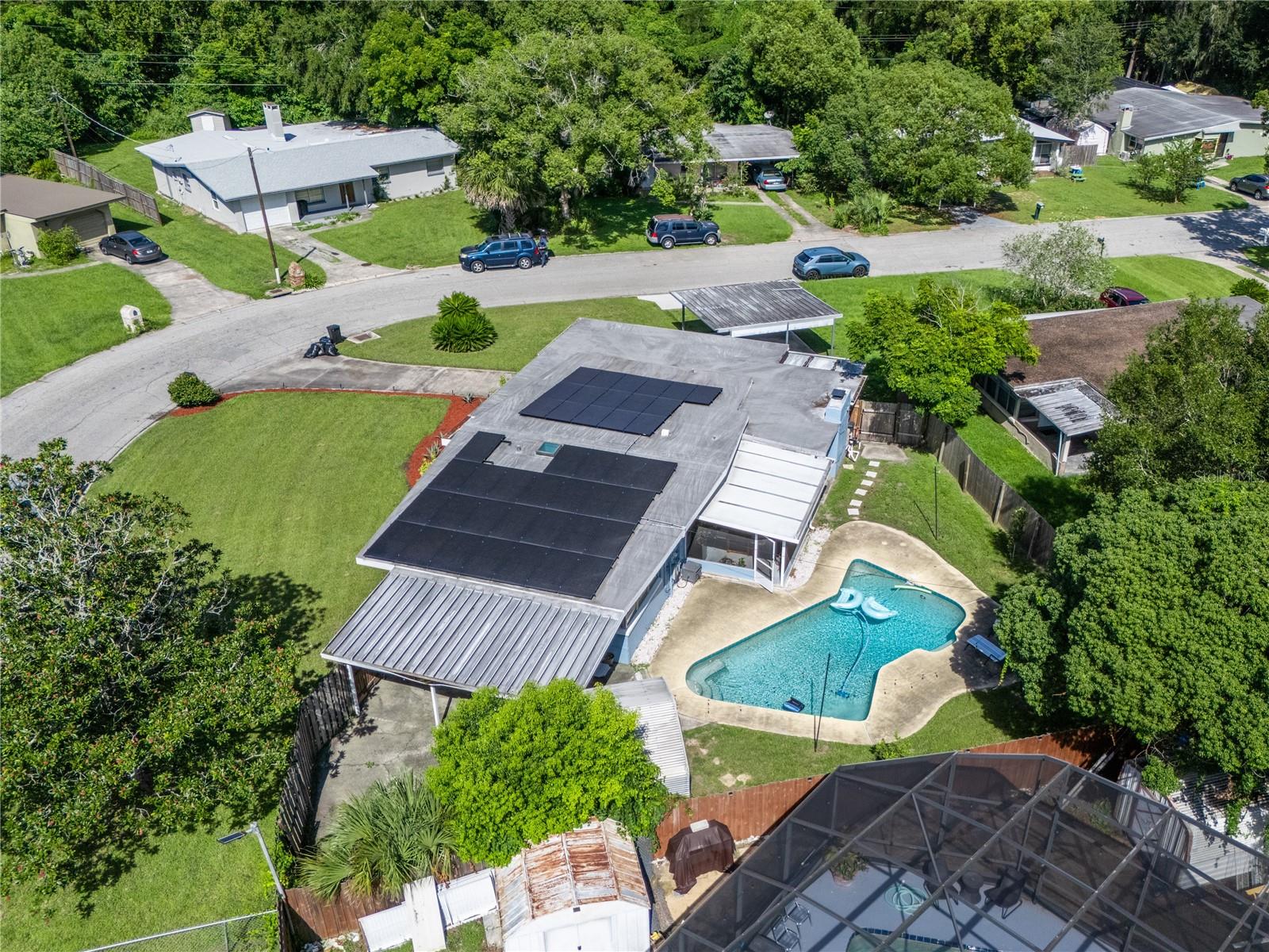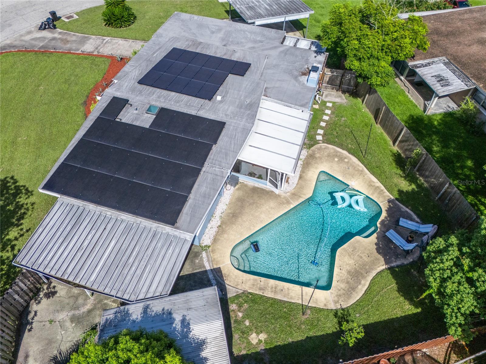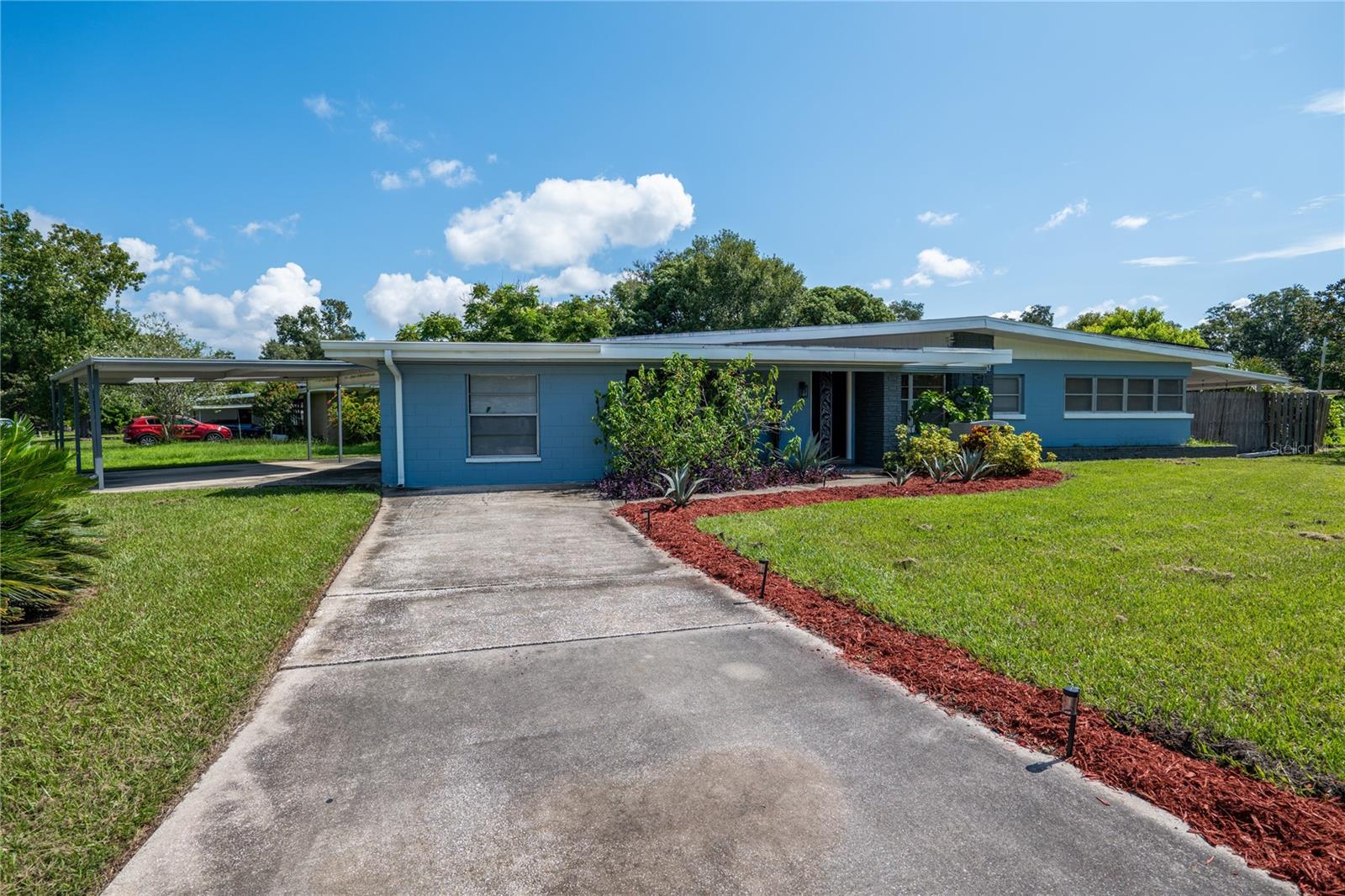 To experience a fully immersive walk-through of this home click on the Video or Virtual Tour button on this page. Step into timeless style and modern comfort with this beautifully maintained three-bedroom, two-bath mid-century modern home on a spacious quarter-acre lot. From the moment you arrive, you’ll notice the home’s character and inviting curb appeal. Inside, a bright and airy open layout welcomes you, highlighted by a neutral color palette and plenty of natural light. The generous living room with tile floors offers the perfect place to relax after a long day or entertain guests. Just off the living space, a versatile bonus room, currently used as a gym, could easily transform into a home office, playroom, or even a fourth bedroom to fit your lifestyle needs. The stylish kitchen is a true standout, featuring porcelain counters and backsplash, terrazzo floors, gold accents, stainless steel refrigerator & dishwasher, a wall oven, cooktop, and a cozy eat-in area. Adjacent to the living room, the warm and inviting sitting room with a brick fireplace, rich wood ceilings, and plenty of space for gatherings makes the perfect spot for game nights, reading by the fire, or entertaining family and friends. The primary suite offers comfort with terrazzo flooring, a ceiling fan, and a private bath featuring a modern vanity and tiled shower/tub combo. Two additional bedrooms provide flexibility for family, guests, or work-from-home setups, and share a second full bath with shower/tub. Step outside to your private backyard oasis. The large screened-in patio overlooks a sparkling saltwater pool, perfect for summer fun or year-round entertaining. The fully fenced yard provides both privacy and peace of mind, complete with a storage shed, carport, and two separate driveways for extra parking. Practical upgrades include solar panels for energy savings and a new pool pump and, 2020 roof for peace of mind. With no HOA, ample space for toys, boats, and a move-in ready interior, this home offers both style and convenience.