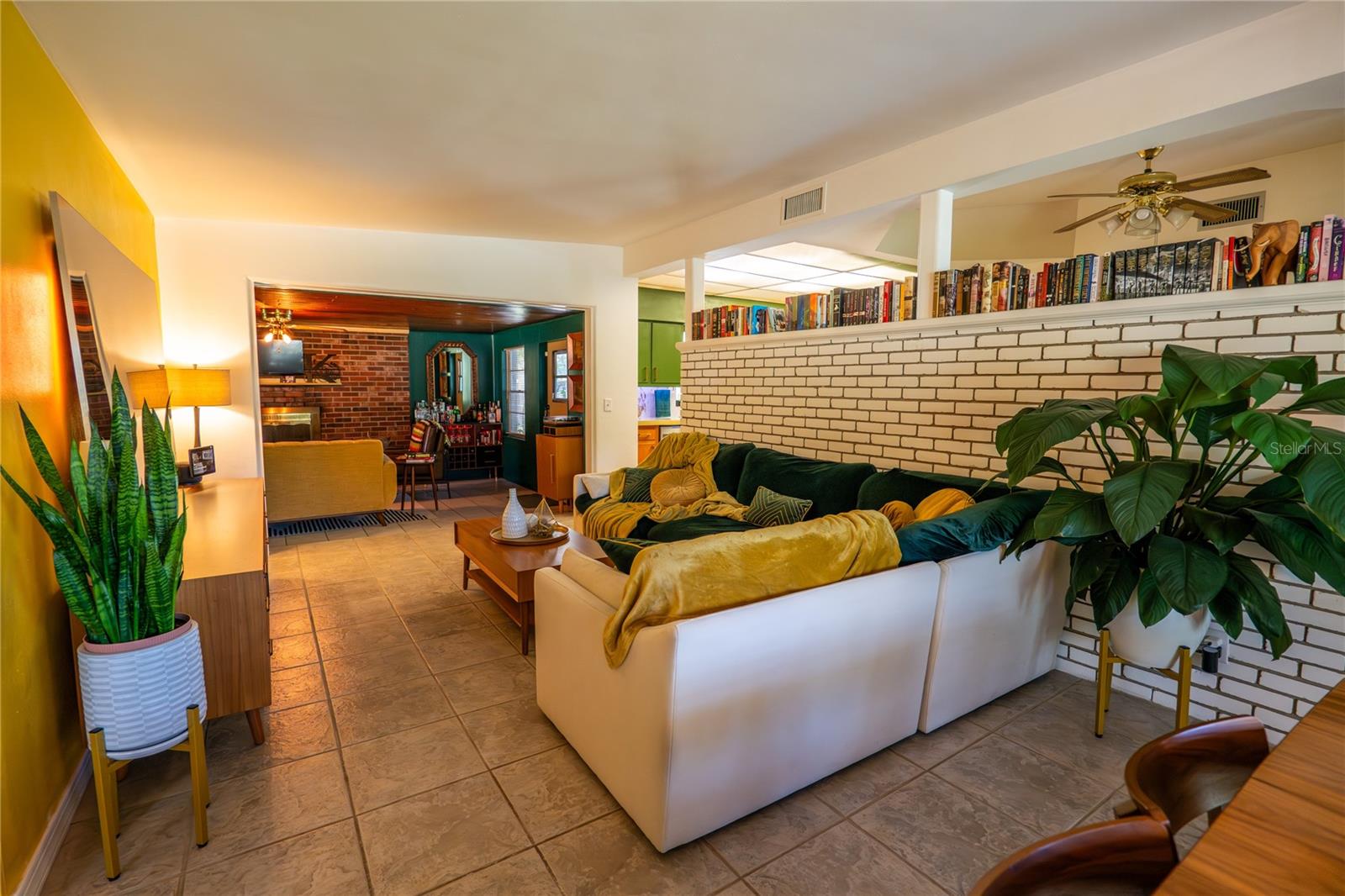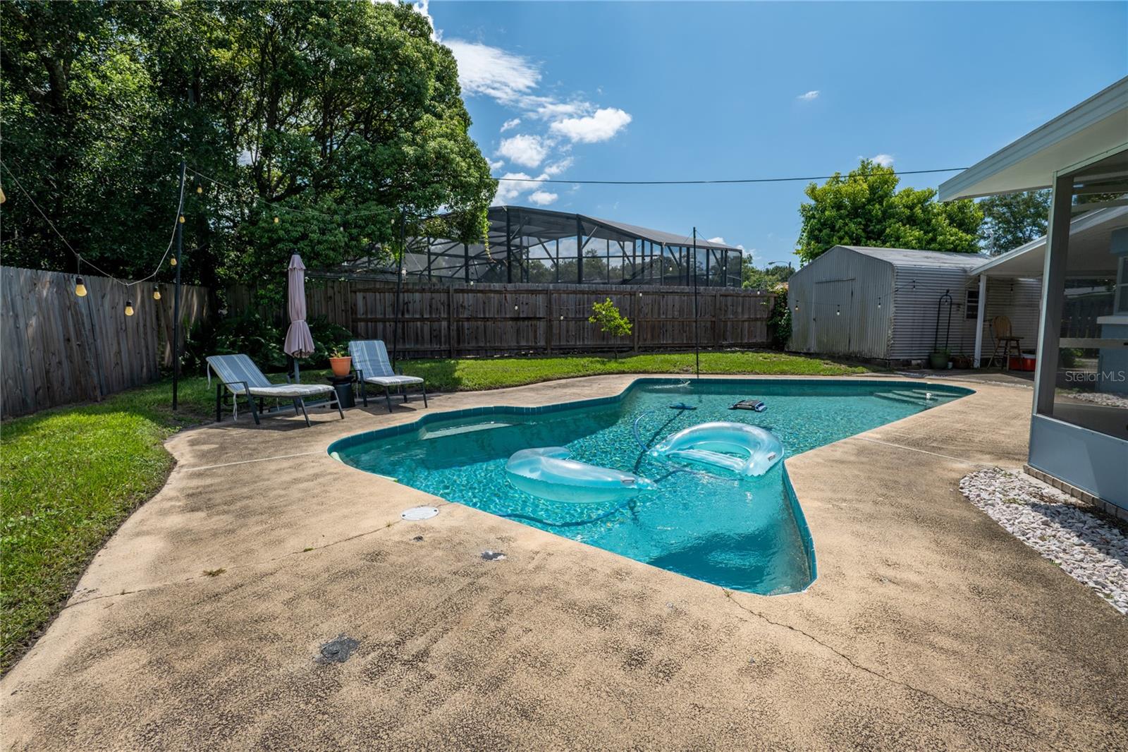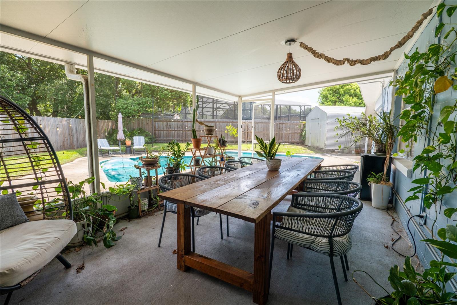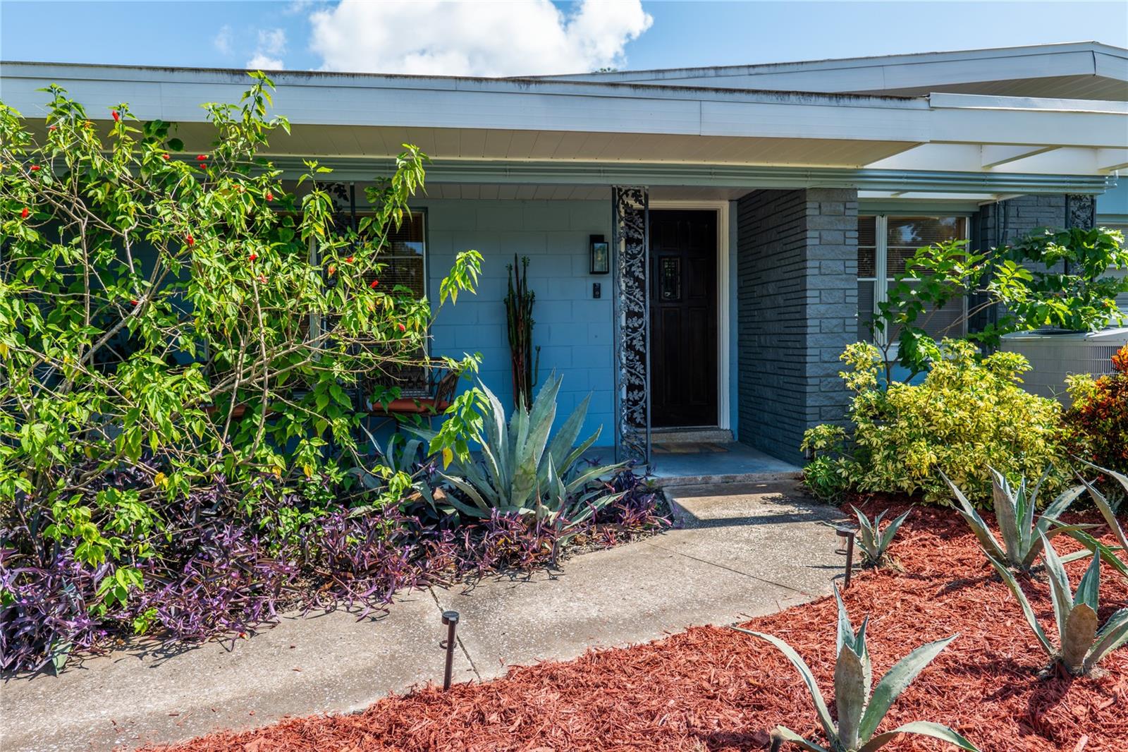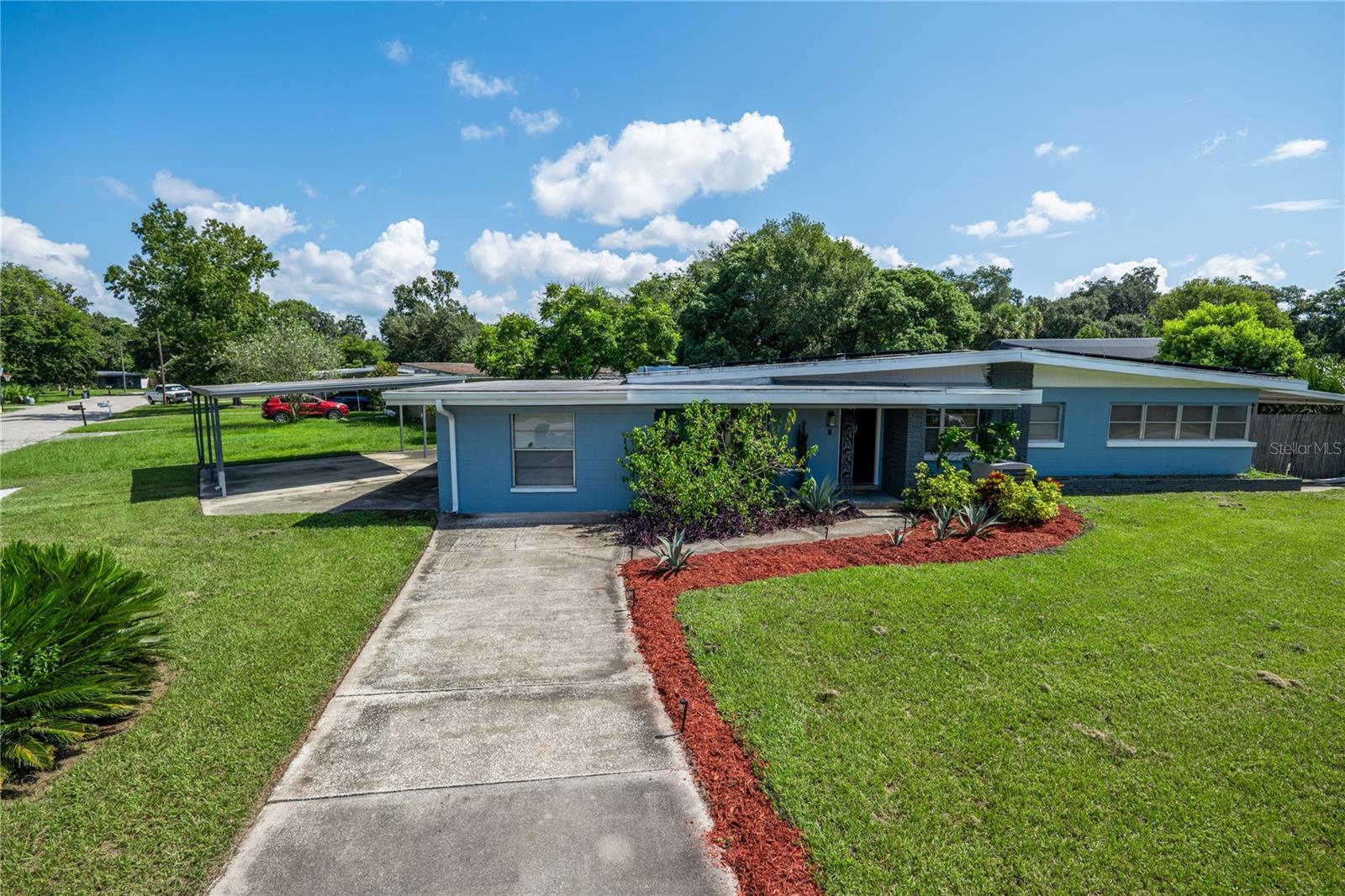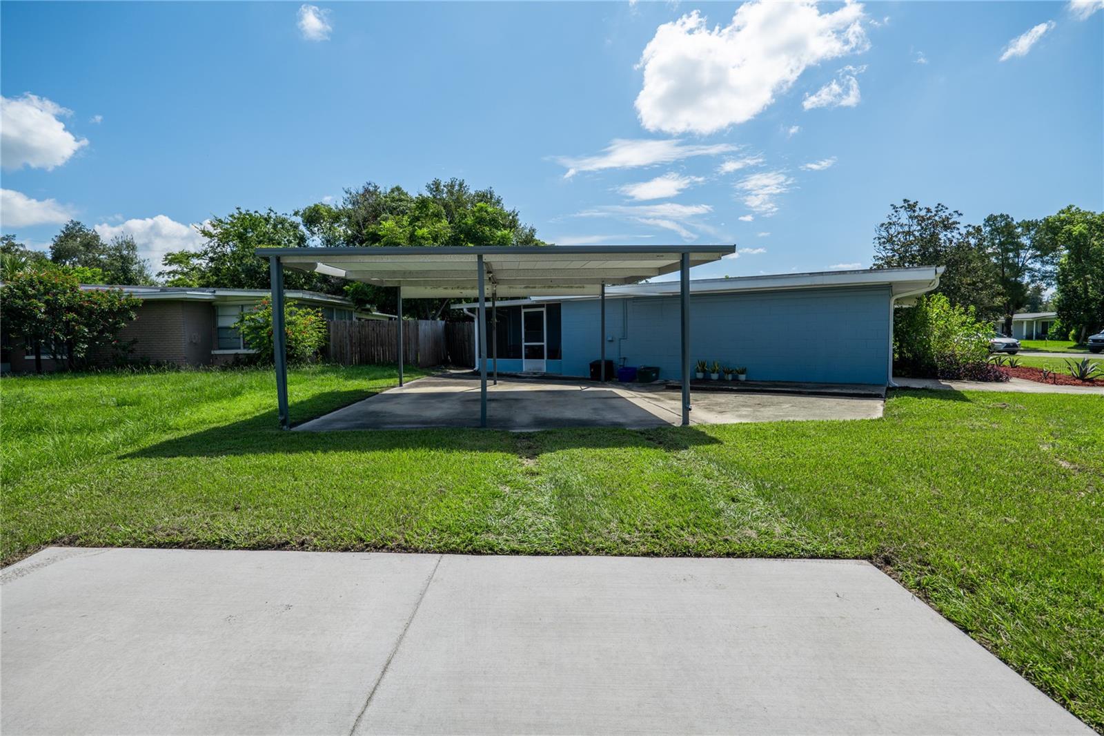 To experience a fully immersive walk-through of this home click on the Video or Virtual Tour button on this page. Step into timeless style and modern comfort with this beautifully maintained three-bedroom, two-bath mid-century modern home on a spacious quarter-acre lot. From the moment you arrive, you’ll notice the home’s character and inviting curb appeal. Inside, a bright and airy open layout welcomes you, highlighted by a neutral color palette and plenty of natural light. The generous living room with tile floors offers the perfect place to relax after a long day or entertain guests. Just off the living space, a versatile bonus room, currently used as a gym, could easily transform into a home office, playroom, or even a fourth bedroom to fit your lifestyle needs. The stylish kitchen is a true standout, featuring porcelain counters and backsplash, terrazzo floors, gold accents, stainless steel refrigerator & dishwasher, a wall oven, cooktop, and a cozy eat-in area. Adjacent to the living room, the warm and inviting sitting room with a brick fireplace, rich wood ceilings, and plenty of space for gatherings makes the perfect spot for game nights, reading by the fire, or entertaining family and friends. The primary suite offers comfort with terrazzo flooring, a ceiling fan, and a private bath featuring a modern vanity and tiled shower/tub combo. Two additional bedrooms provide flexibility for family, guests, or work-from-home setups, and share a second full bath with shower/tub. Step outside to your private backyard oasis. The large screened-in patio overlooks a sparkling saltwater pool, perfect for summer fun or year-round entertaining. The fully fenced yard provides both privacy and peace of mind, complete with a storage shed, carport, and two separate driveways for extra parking. Practical upgrades include solar panels for energy savings and a new pool pump and, 2020 roof for peace of mind. With no HOA, ample space for toys, boats, and a move-in ready interior, this home offers both style and convenience.