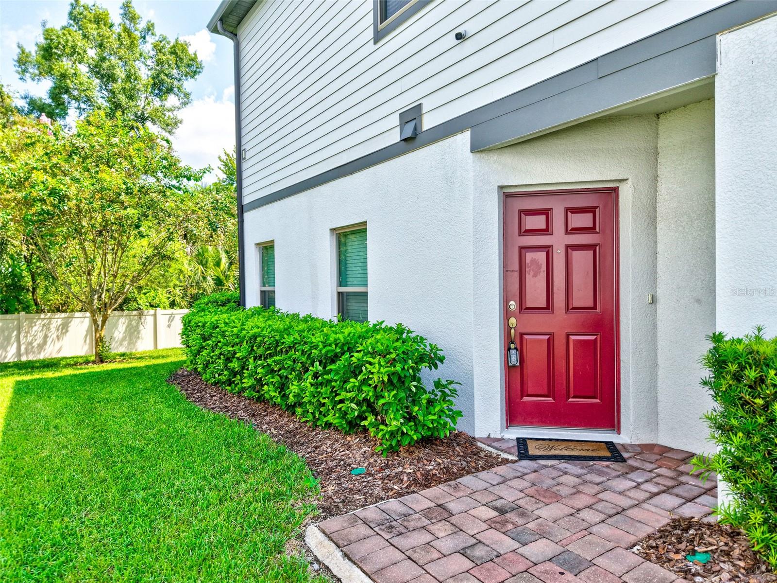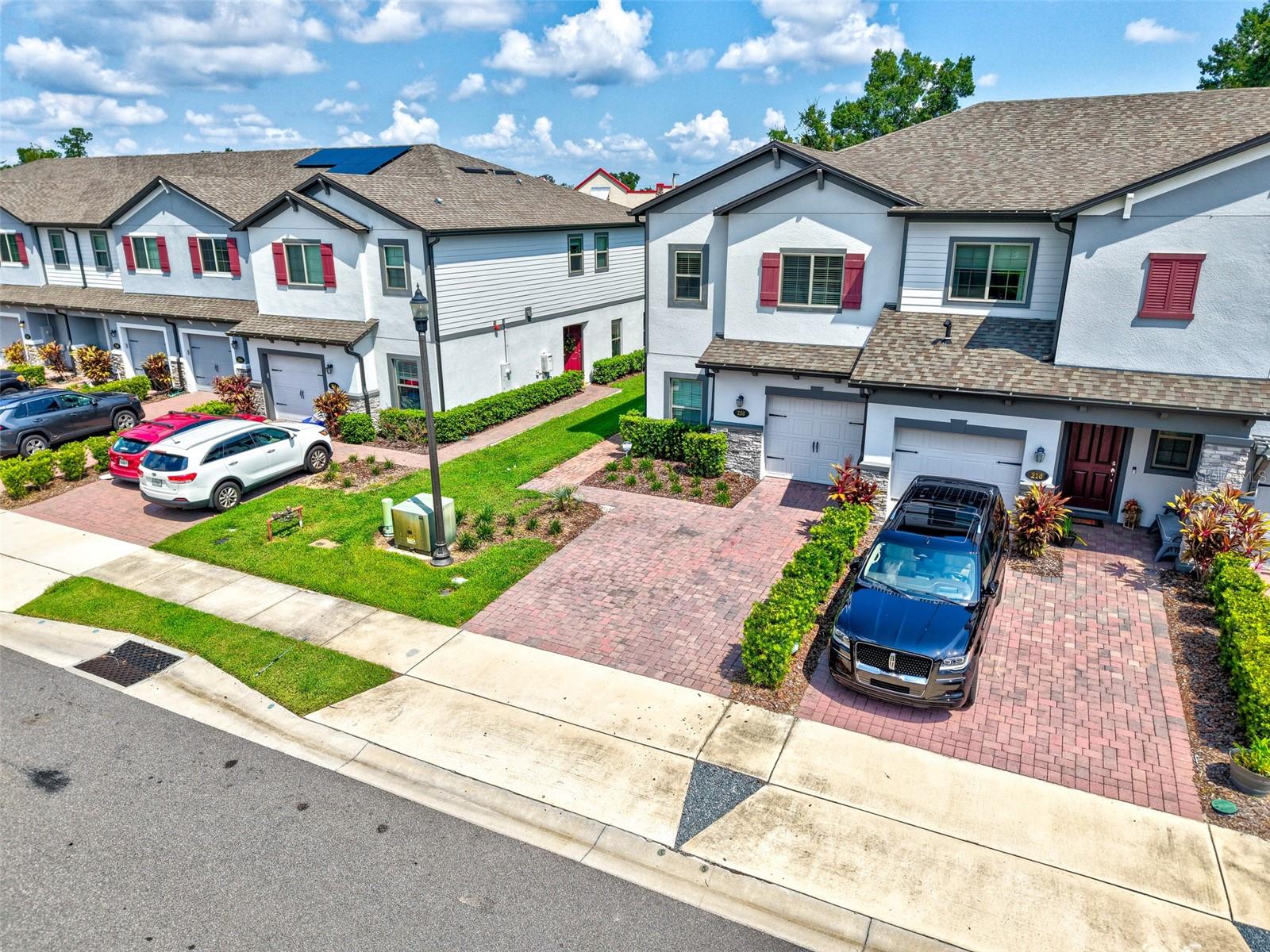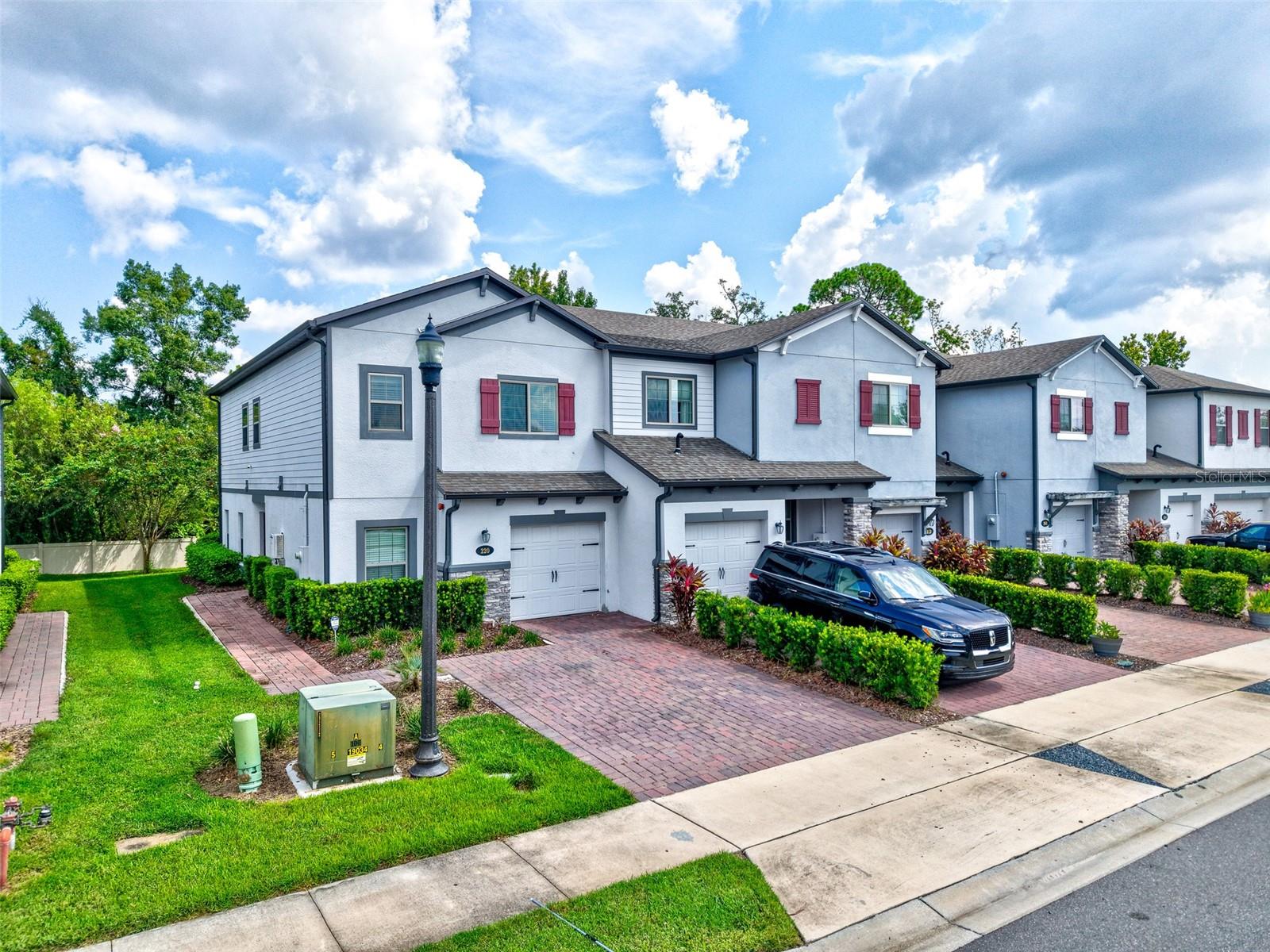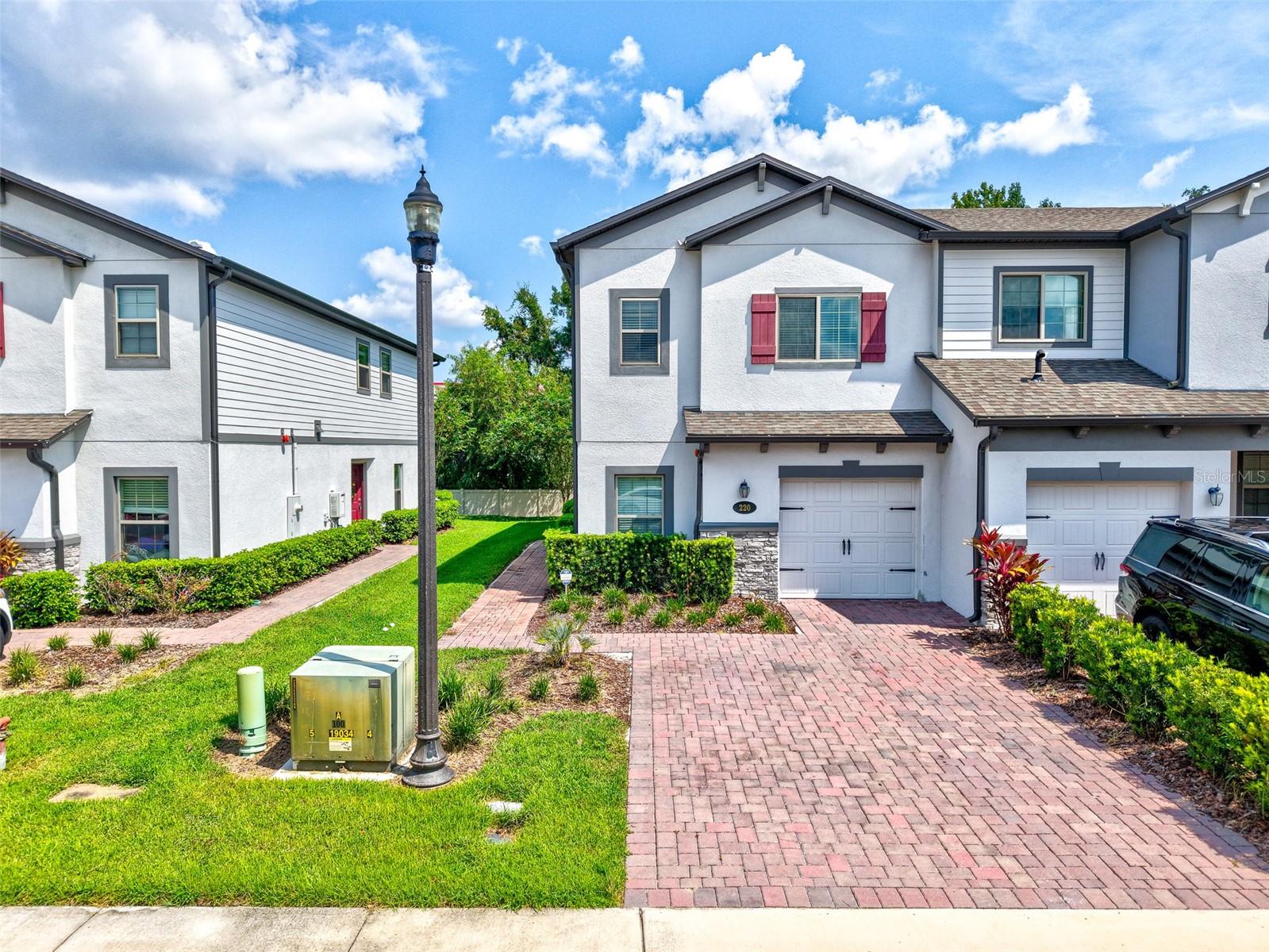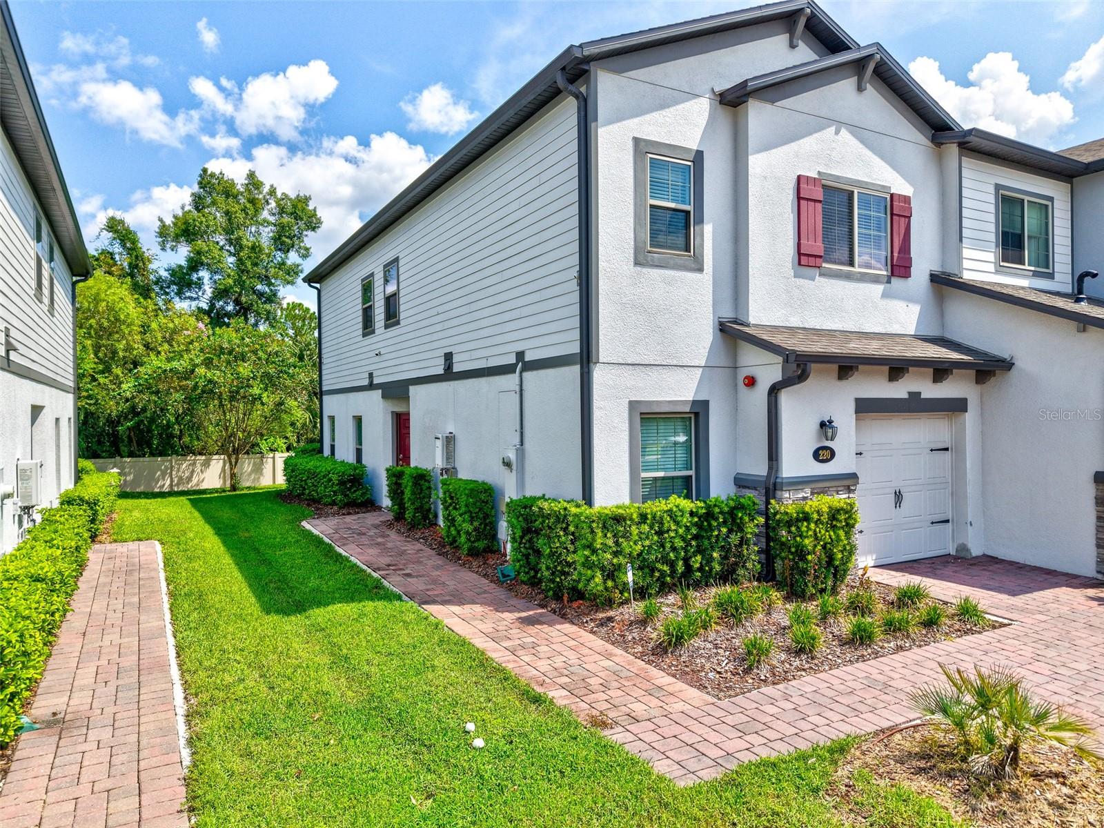 Stunning End-Unit Townhome – Former Model with Upgrades Throughout! This beautifully designed 1,745 sq. ft. end-unit townhome (former model home) offers 4 bedrooms, 3 full baths, a 1-car garage, and a 2-car wide brick-paved driveway. Its end-unit placement provides extra privacy, additional outdoor living space, and the feel of a single-family home. Inside, the open-concept floorplan seamlessly connects the kitchen, dining, and great room. Stylish floating shelves around the TV create a clean, modern look, while a feature trim wall and statement light fixtures—including sconces and a chandelier—add sophistication to the dining area, which comfortably seats six. The chef’s kitchen is a true highlight, featuring granite countertops, a center island with sink and seating, 42” linen cabinetry, subway tile backsplash, and a full suite of GE® stainless steel appliances including a gas range. The screened-in patio extends your living space, perfect for relaxing or entertaining year-round. The first floor also offers a versatile bedroom and full bath, along with wood-look tile flooring for easy care and style. Upstairs, a spacious loft, laundry room, and linen closet provide convenience, while two secondary bedrooms and a hall bath sit toward the back. At the front, the owner’s suite impresses with a massive walk-in closet and a spa-like en-suite featuring dual sinks, a large walk-in shower with subway tile, and plenty of storage. This rare opportunity to own a model-quality home with thoughtful upgrades in a prime location won’t last long. Schedule your private showing today!