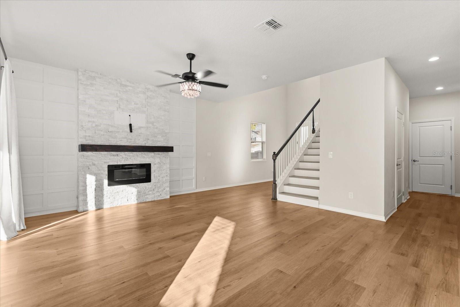 Welcome home to this beautiful Toll Brothers designed two-story residence in the gated Parkview Place community. Featuring a grand entryway with vaulted ceiling that leads to a bright, open-concept living area, this home is filled with natural light and a calming neutral color palette. The living room has a stunning accent wall featuring decorative paneling and stone framing an electric fireplace. Perfect for cozy movie watching nights! luxury vinyl plank flooring throughout the home gives a lux look while staying low maintenance and pet friendly. Head through the double paned glass sliders to the covered lanai that overlooks a fully fenced backyard. Upstairs, there’s a flex space that could be used as a home office or play area. The primary suite is a true retreat with his and hers walk in closets and en-suite bath with dual vanities and an oversized glass-enclosed shower. Residents of Parkview Place enjoy the convenience of a community pool and cabana but there’s no shortage of nearby outdoor activities if you’re feeling more adventurous! Just minutes from several horse riding facilities, hiking trails at Lake Jessup, the Riverwalk at Lake Monroe and the Central Florida Zoo, plus quick access to SR-417, I-4.