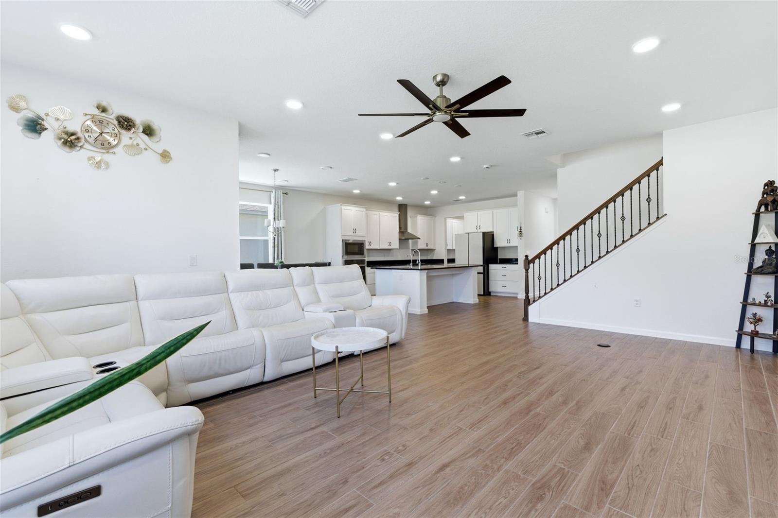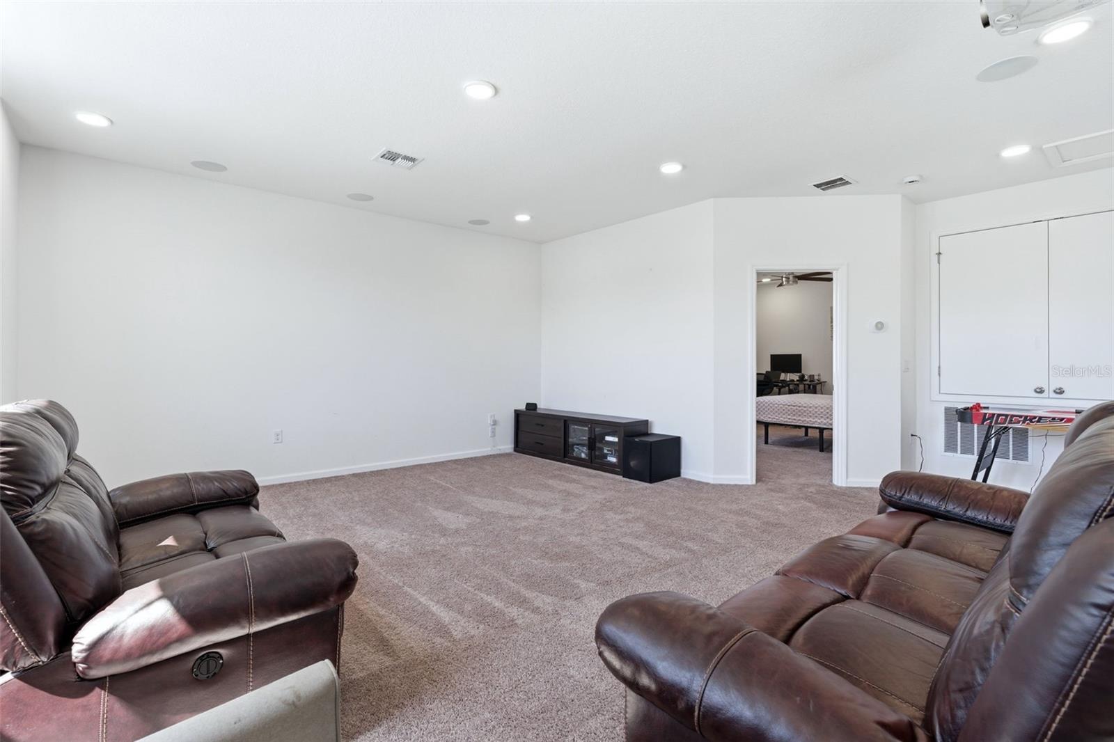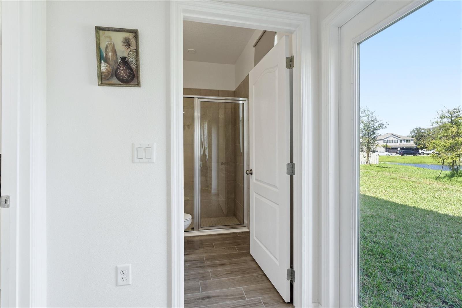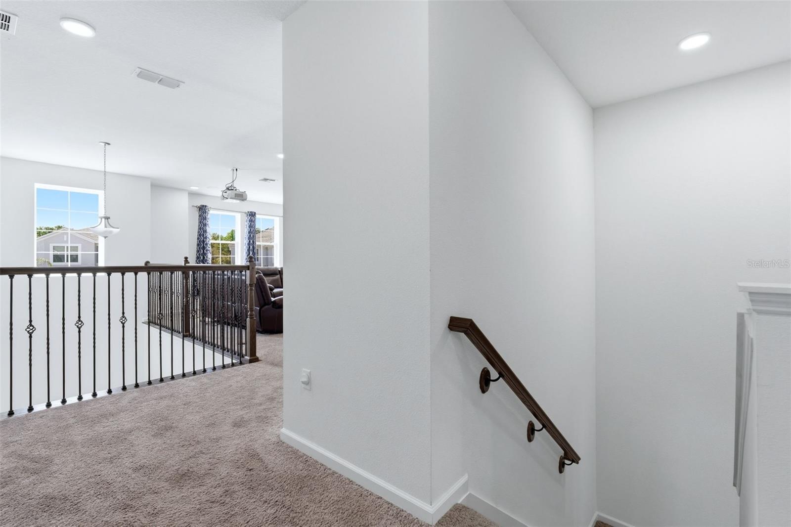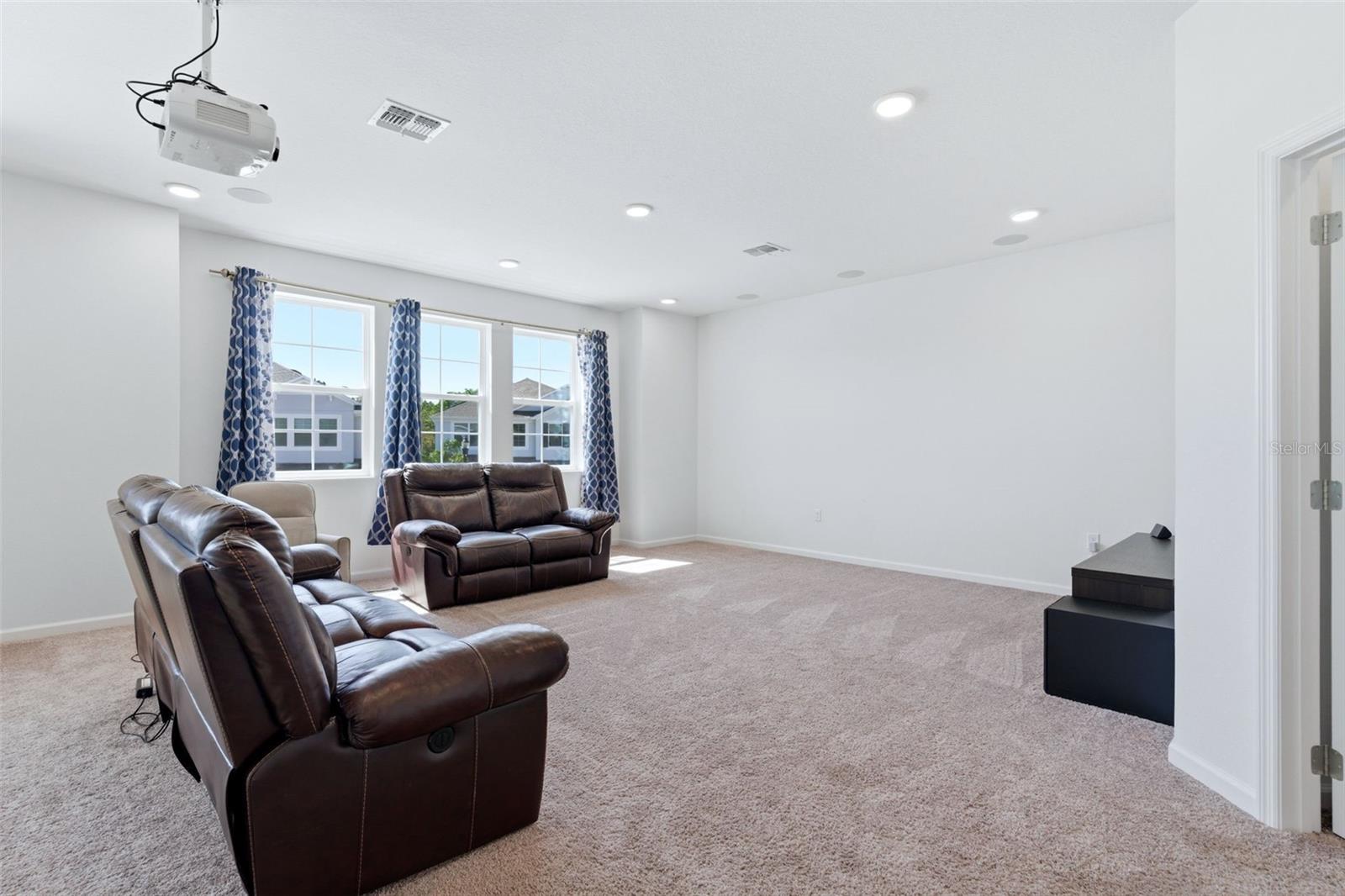 Welcome to this stunning, nearly new home located in the exclusive gated community of Bartrams Landing at St. Johns, a charming enclave of just 31 homes offering a peaceful, family-oriented lifestyle complete with a private playground. Built in 2023, this spacious and thoughtfully designed residence features 5 bedrooms, 4 bathrooms, and an expansive 3-car garage, with 3,779 square feet of beautifully appointed living space. From the moment you enter, you’ll be impressed by the soaring high ceilings, abundant natural light, and open-concept layout that seamlessly blends comfort and elegance—perfect for both everyday living and entertaining. The heart of the home is the oversized kitchen, showcasing stainless steel appliances, granite countertops, and a large center island that flows effortlessly into the family and dining areas, creating a true gathering space. A separate formal living room offers additional flexibility for hosting or relaxation. Designed with both style and functionality in mind, the home features luxury vinyl plank flooring throughout the main living areas and upgraded carpeting in the bedrooms. With two primary suites—one conveniently located on the first floor and another upstairs—this layout is ideal for multi-generational living or added privacy. The remaining three bedrooms are located upstairs, along with a spacious loft currently configured as a media room complete with a projector system and surround sound speakers. Enjoy ample storage throughout, including generous walk-in closets. Step outside to unwind on the covered upstairs balcony or relax on the ground-level covered patio overlooking a large backyard with serene pond views—perfect for enjoying Florida’s beautiful weather. Additional highlights include a whole-house water purification and filtration system, enhancing both comfort and peace of mind. This move-in ready home truly has it all and is ideal for a growing family seeking space, style, and modern convenience. Conveniently located near dining, shopping, healthcare, and major highways for an easy commute.
