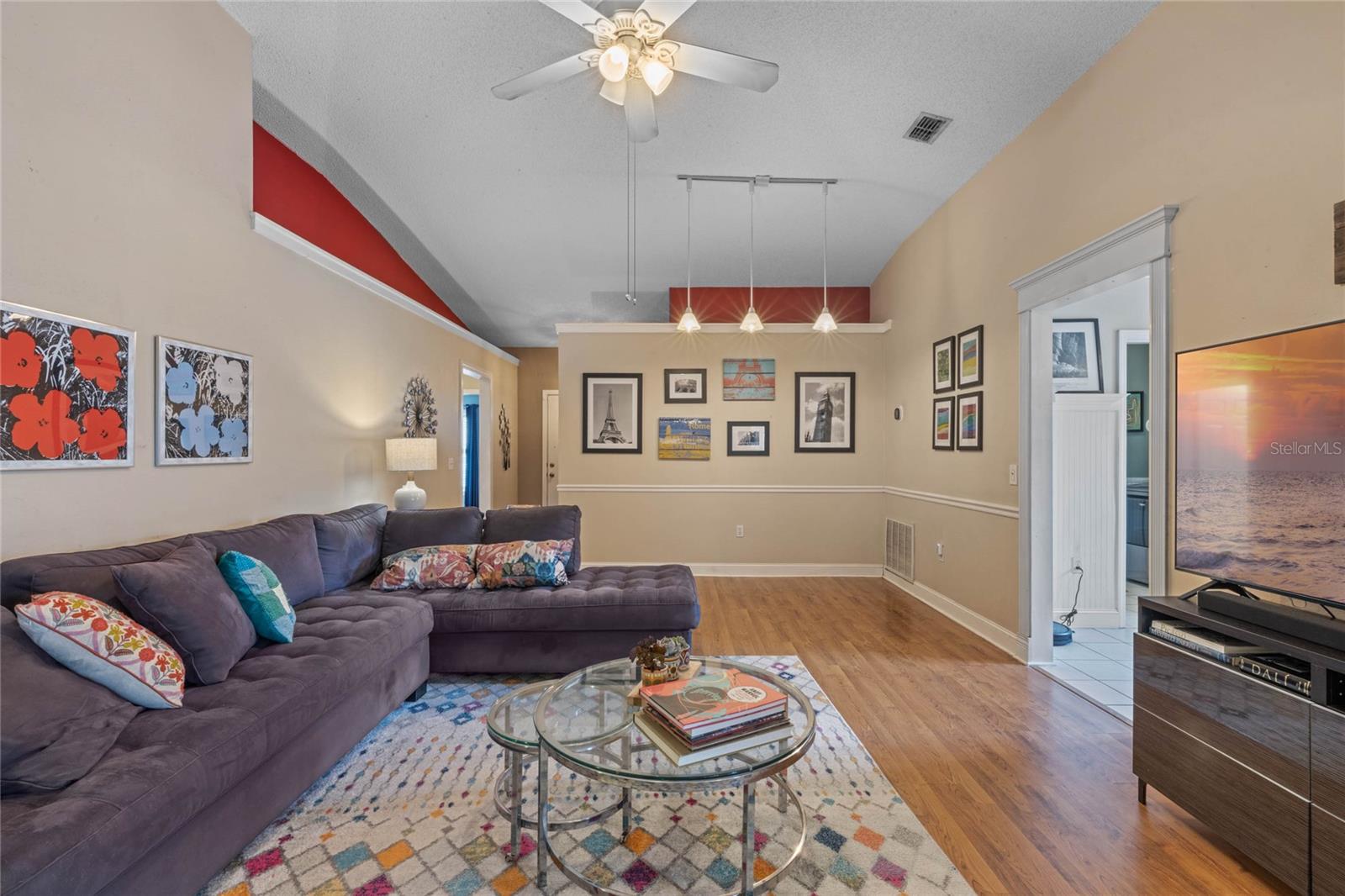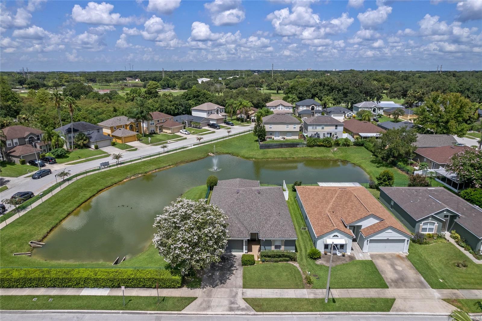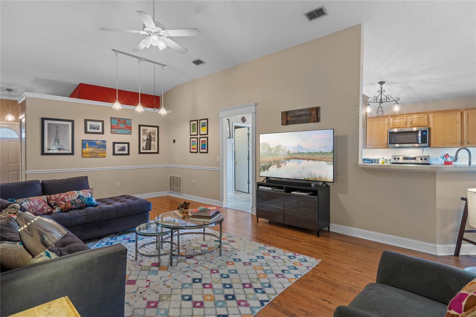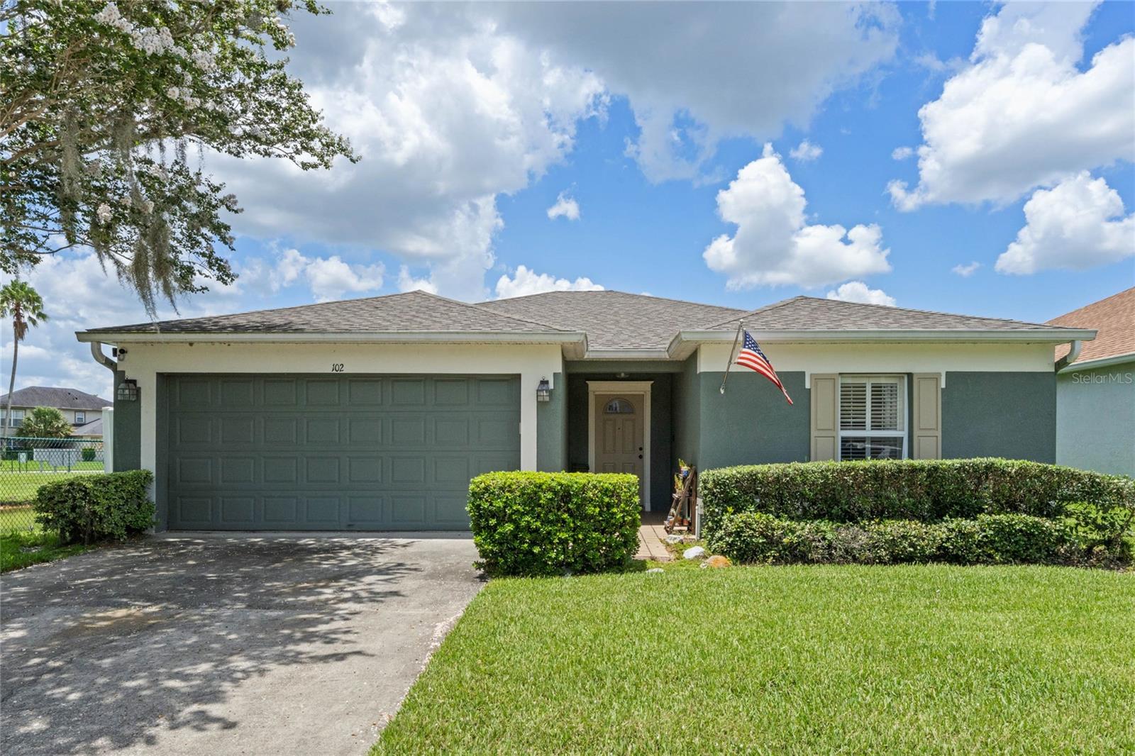 A bright & spacious 4-bedroom home near Mayfair Country Club in Sanford is just waiting for you to make it your own. This 2,114sf home features a classic stucco exterior, tidy landscaping, and a welcoming covered entrance. As you first step inside, you're met with a bright, open floor plan with vaulted ceilings and beautiful laminate wood flooring. The sizeable living room flows into a semi-open concept kitchen with solid wood cabinetry featuring stylish pulls, newer stainless steel appliances including an electric range/oven combo, refrigerator, built-in microwave and dishwasher, a breakfast area, and an adjoining family room with built-in bookcases and French doors leading to the bonus area. The fenced-in backyard is perfect for relaxation and entertaining, featuring a patio, a small green space, lovely water features views, and ample grilling room. Enjoy restful nights in the primary bedroom, which offers abundant closet space and an en suite bathroom with dual sinks, a soaking tub, and a separate shower. Three additional bedrooms provide comfortable living spaces with built-in features. The full guest bathroom includes a shower/tub combination. Other highlights of this home include an attached 2-car garage, an indoor laundry area, and an enclosed bonus room with a dedicated window A/C unit. The central A/C system was replaced in 2022, the roof in 2018, and the water heater in 2021. Additionally, this home has the advantage of no neighbors to the south or west. It is conveniently located just steps from Mayfair Country Club, a 20-mile drive from Downtown Orlando, and near I-4 and 417, shopping, restaurants, recreational activities, Trailblazer Park, schools, and much more! Call now to schedule your private tour!