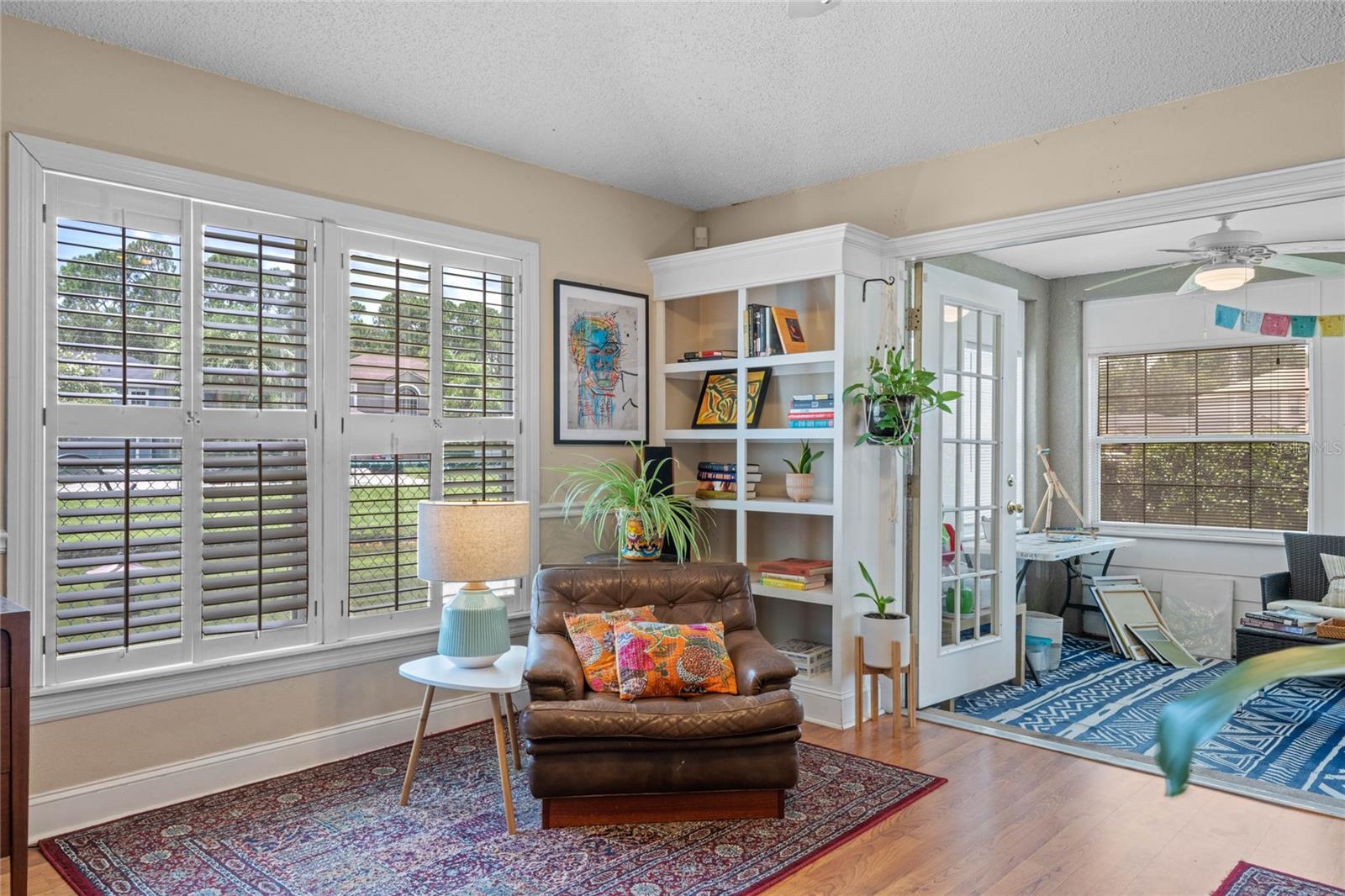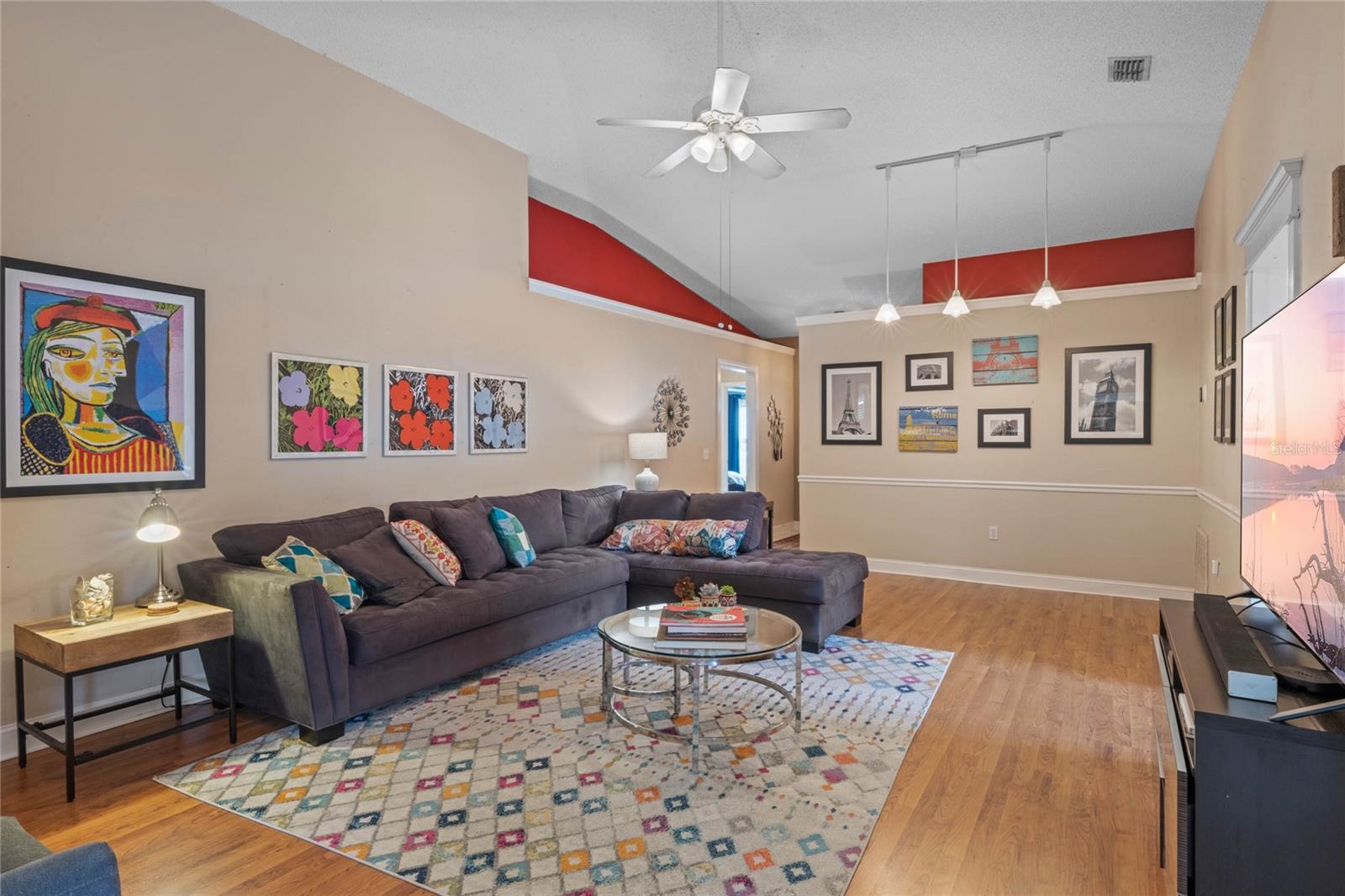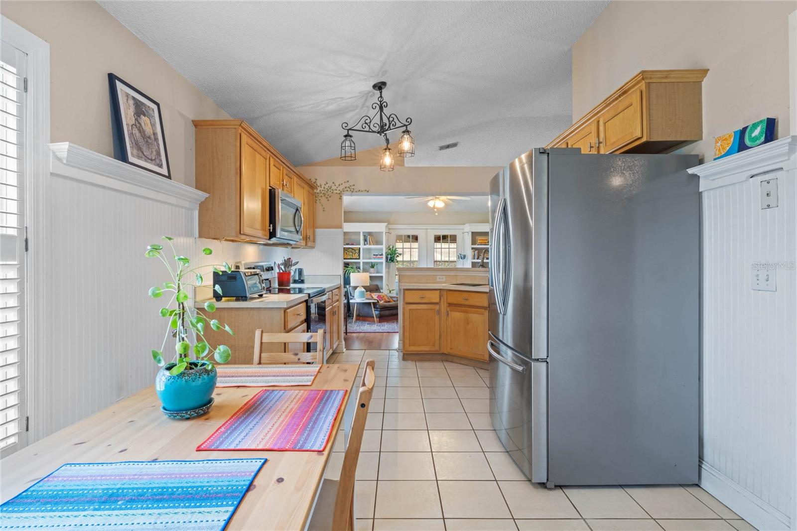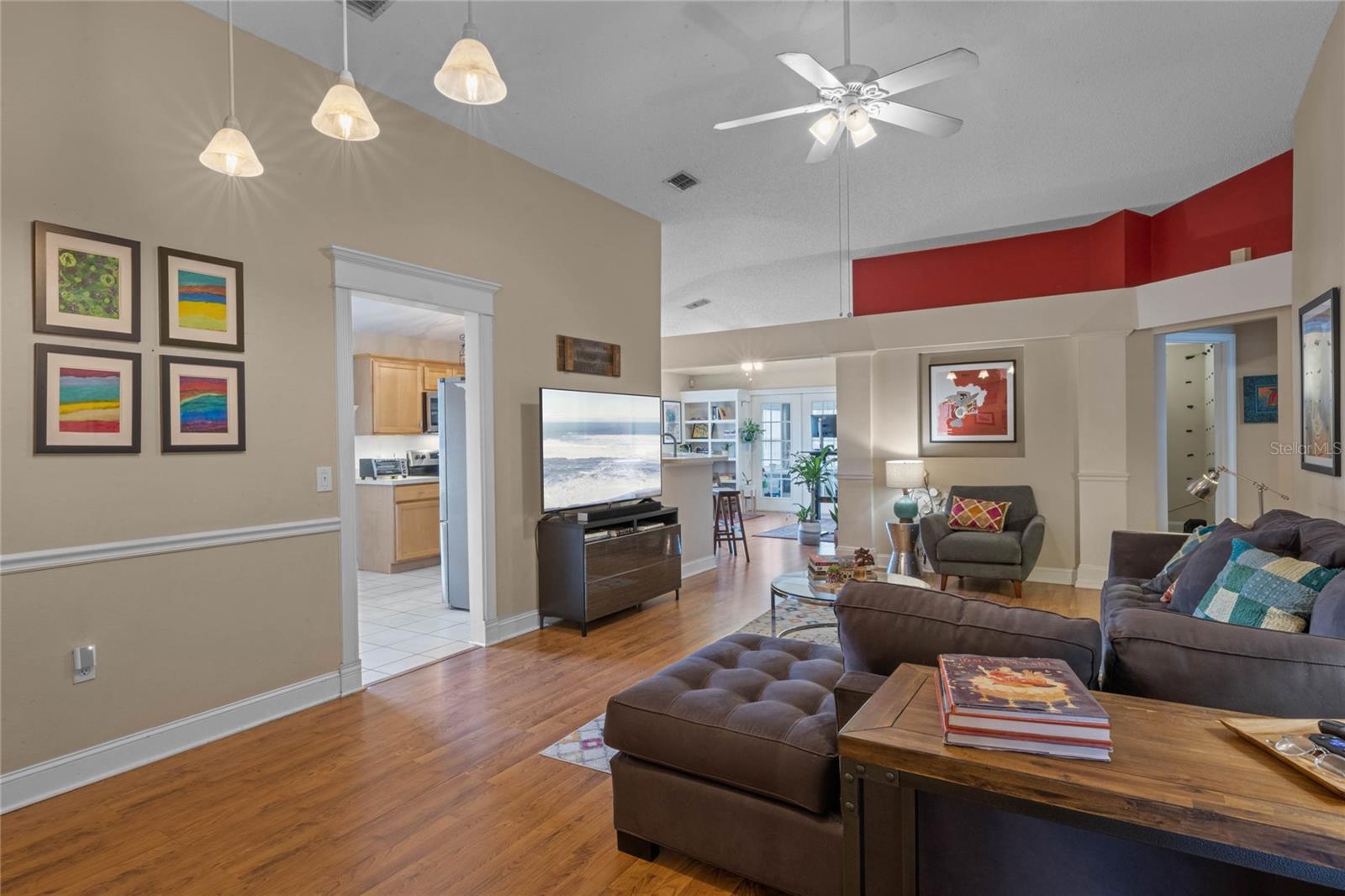A bright & spacious 4-bedroom home near Mayfair Country Club in Sanford is just waiting for you to make it your own. This 2,114sf home features a classic stucco exterior, tidy landscaping, and a welcoming covered entrance. As you first step inside, you're met with a bright, open floor plan with vaulted ceilings and beautiful laminate wood flooring. The sizeable living room flows into a semi-open concept kitchen with solid wood cabinetry featuring stylish pulls, newer stainless steel appliances including an electric range/oven combo, refrigerator, built-in microwave and dishwasher, a breakfast area, and an adjoining family room with built-in bookcases and French doors leading to the bonus area. The fenced-in backyard is perfect for relaxation and entertaining, featuring a patio, a small green space, lovely water features views, and ample grilling room. Enjoy restful nights in the primary bedroom, which offers abundant closet space and an en suite bathroom with dual sinks, a soaking tub, and a separate shower. Three additional bedrooms provide comfortable living spaces with built-in features. The full guest bathroom includes a shower/tub combination. Other highlights of this home include an attached 2-car garage, an indoor laundry area, and an enclosed bonus room with a dedicated window A/C unit. The central A/C system was replaced in 2022, the roof in 2018, and the water heater in 2021. Additionally, this home has the advantage of no neighbors to the south or west. It is conveniently located just steps from Mayfair Country Club, a 20-mile drive from Downtown Orlando, and near I-4 and 417, shopping, restaurants, recreational activities, Trailblazer Park, schools, and much more! Call now to schedule your private tour!