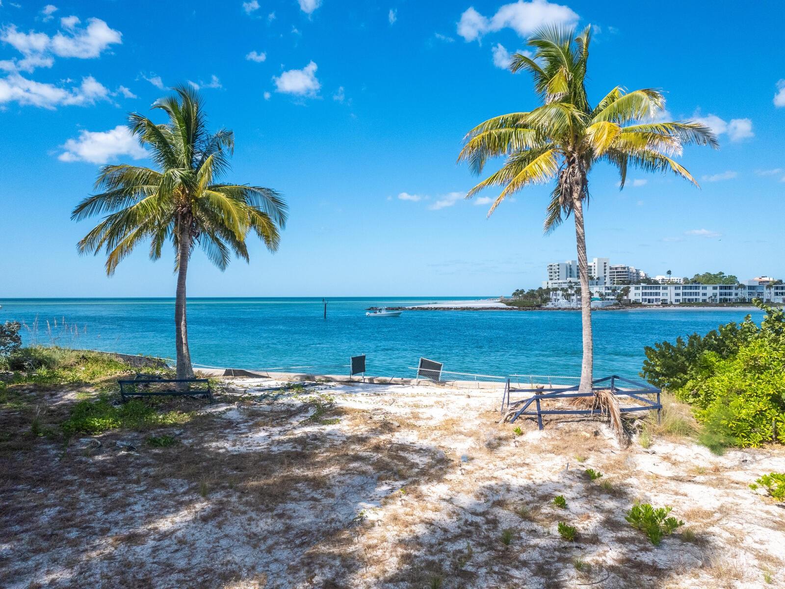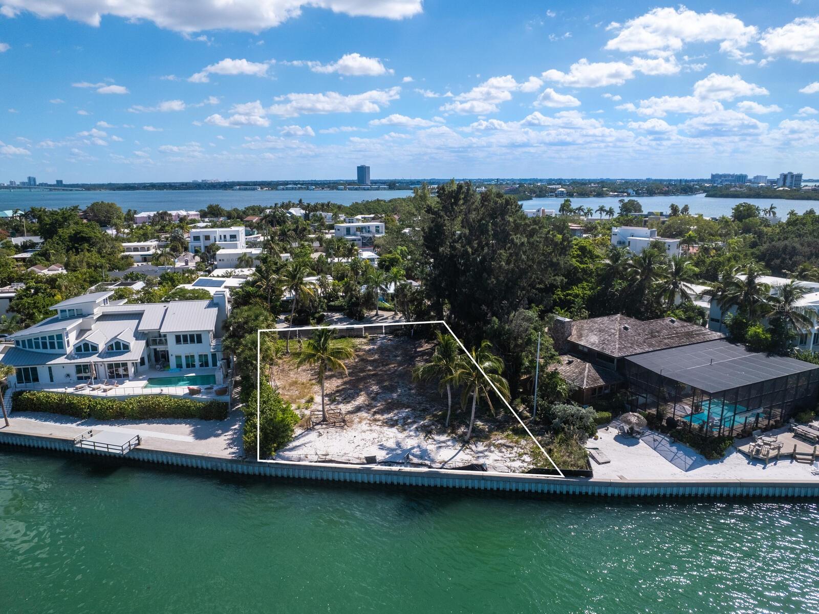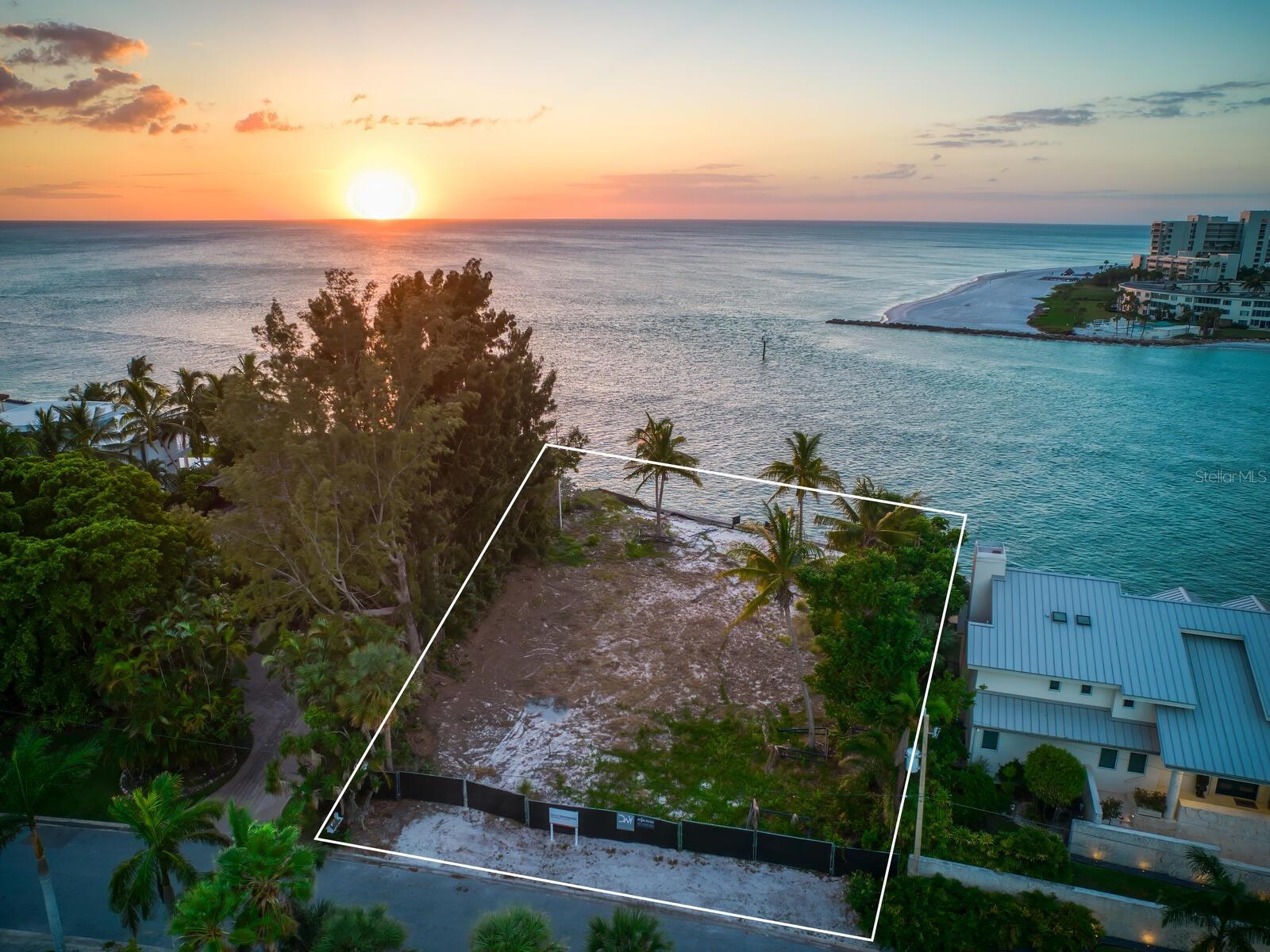 Spectacular once-in-a-lifetime opportunity to establish a personal estate on one of the most impressive waterfront lots of the Gulf Coast. This exceptional Gulf-front parcel offers a Lido Key address on Westway Drive, renowned for its globally recognized icons of midcentury modern design in the style of the Sarasota School of Architecture. The specific contour of this expansive .41-acre lot makes it the first Lido Shores address suitable for a deep-water dock and direct private boat access to the Gulf of Mexico. More than 120 feet of direct waterfront on the Gulf offers the opportunity for both private dock access and manicured landscaping or beach surface above the seawall, all with magnificent west-facing views of the water and the southern end of Longboat Key. Adding incalculable value, this lot is already cleared and permitted for immediate build potential of a large-scale estate. Architectural plans drawn by Jerry Sparkman of the famed design firm Sweet Sparkman are available with the land purchase. These plans honor the style of the Sarasota School of Architecture with dramatic angles, cantilevered living spaces, and the maximum elevation allowed in this enclave of Lido Key, showcasing the most spectacular views of any residence in Lido Shores at a height of 52 feet. With potential for worldwide recognition in modern design, these bespoke drawings encompass 6,885 square feet of living space under air across a magnificent primary home and separate pool house, with additional specifications including pool and spa, hardscaping, landscaping, and multi-story water features. Located in the most coveted position of the notable Lido Shores community, this Westway Drive parcel is uniquely poised for immediate groundbreaking. The address boasts acclaim not only for architectural distinction but for rare amenities that include private deeded beach access exclusive to Lido Shores residents, walking distance to the luxury boutiques and eateries of St. Armands Circle, and enviable proximity to the cosmopolitan core of Downtown Sarasota. With endless views and limitless potential, this is an incomparable and immediate opportunity to personalize ultra-luxury living on the Gulf Coast.