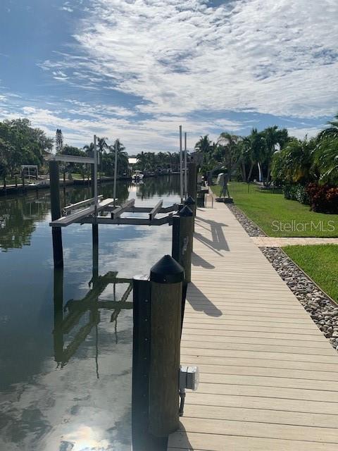 Attached pictures are pre-flood. Asking price reflects the land value only. See attached survey. This is an opportunity for the buyer to design and build a new waterfront home with 114 feet on a mainland canal in a convenient neighborhood that also connects to the intercoastal waterway and gulf. Siesta Key is just minutes away. Sailboat water, the entire seawall was replaced in 2023, the entire dock was replaced in 2023 and the 13,000lb lift was removed and reinstalled in, as well as the davit. Public sewer and water are connected. Flood damaged home is currently uninhabitable without restoration. Restoration is certainly an option. Floor coverings, damaged drywall and all cabinets were removed after flood waters receded.