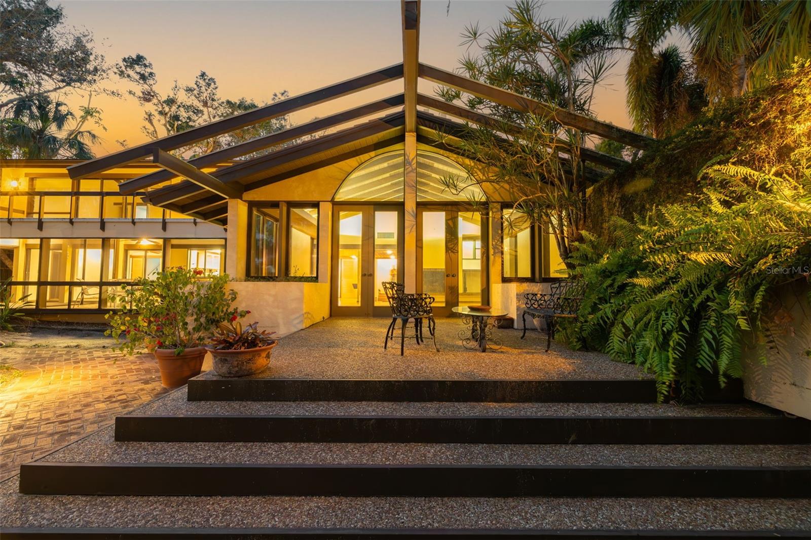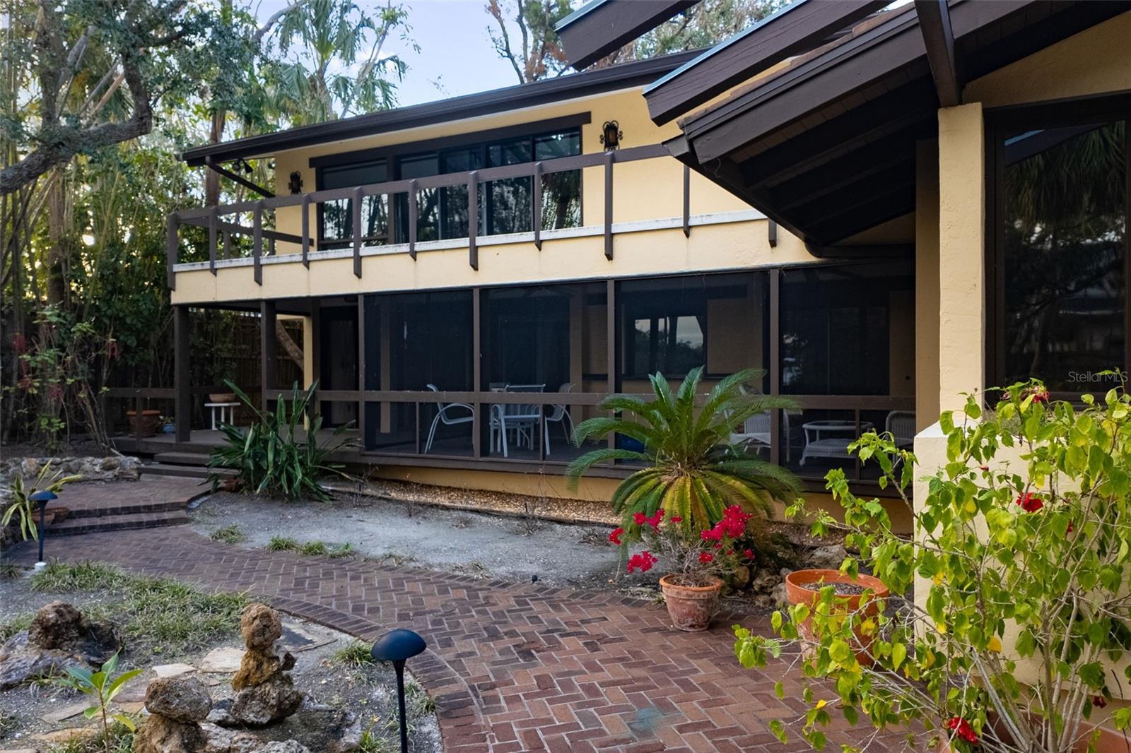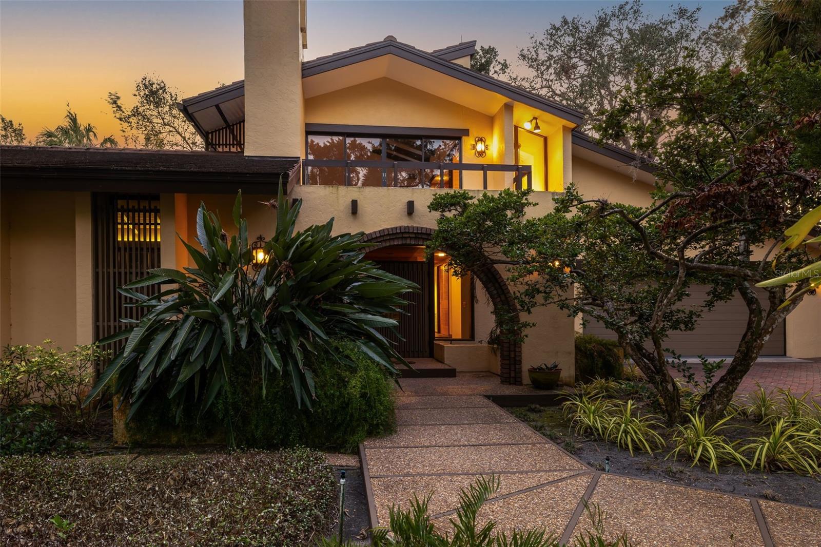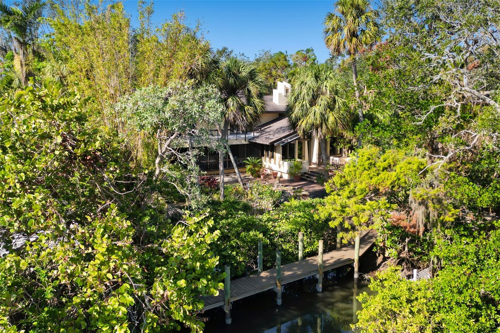 Attention architecture enthusiasts, this Mid-Century Modern waterfront home seamlessly blends timeless design with modern convenience. Resilient through three major storms, it sustained no damage beyond minor landscaping impacts and minimal water in the garage. Set on a lush .61-acre lot in the Hidden Harbor neighborhood, this jungle oasis offers an unparalleled living experience. The property boasts tropical landscaping, a tranquil koi pond and a canal-front boat dock. A circular paver driveway leads to a two-car attached garage, while the backyard oasis features a screened patio, multiple paver seating areas, and two upper-level balconies with breathtaking long canal views. Built for durability, the home includes a buried propane tank connected to a whole-house generator and an irrigation system fed by a dedicated well. Inside, the living room captivates with vaulted cypress ceilings, exposed beams, a wood-burning fireplace, hardwood flooring and double French doors that open to the patio overlooking the canal. The dining room, adjacent to the kitchen, offers hardwood flooring, sliding glass doors, and a charming chandelier. The kitchen combines functionality and elegance, featuring granite countertops, under-cabinet lighting, and a reverse osmosis water filtration system. Upstairs, the primary suite is a private retreat with vaulted ceilings, a spacious walk-in cedar closet, and sliding glass doors opening to a balcony with sweeping canal views. The en-suite bath features dual sinks, a soaking tub, a walk-in shower and vintage tile accents. An adjacent office/den offers built-in shelving, transom windows, and access to two balconies, one overlooking the canal and the other the front yard. On the main floor, the guest suite includes an 11-foot vaulted ceiling, private deck access and an en-suite bath. Additional spaces include a cozy family room with dual sliding glass doors to the patio and an interior atrium filled with lush plants. Conveniently just 1.3 miles from Siesta Key Beach and dining, two miles from shopping and a short drive to downtown Sarasota, Sarasota Memorial Hospital and the airport, this home offers serenity and accessibility. This is a rare opportunity to own a piece of architectural history in a prime location. Experience the fusion of timeless design, modern amenities and waterfront living in this Hidden Harbor gem.