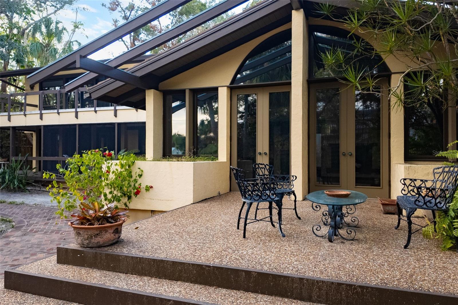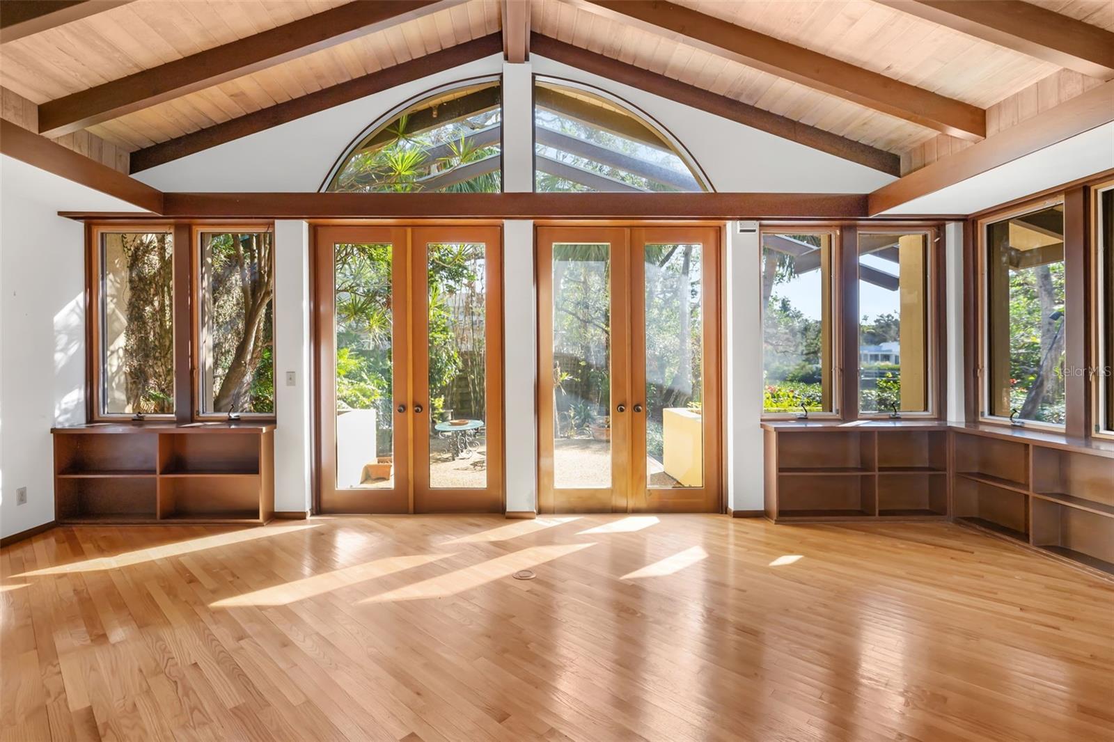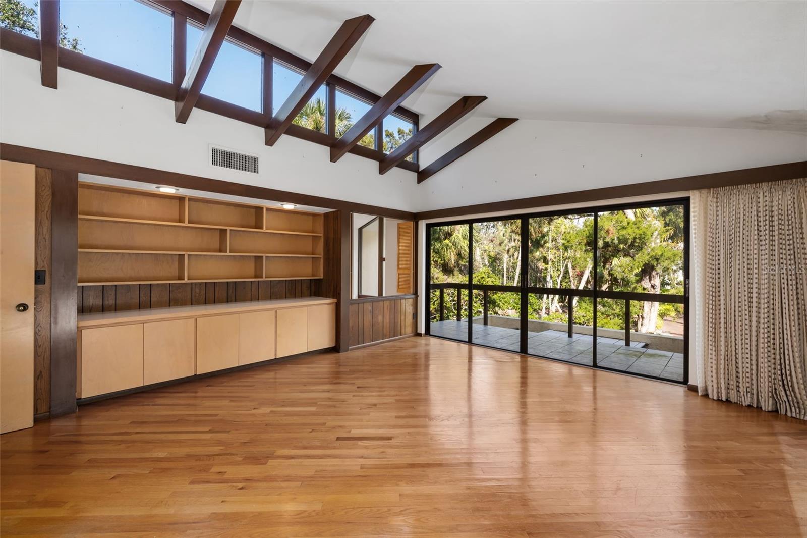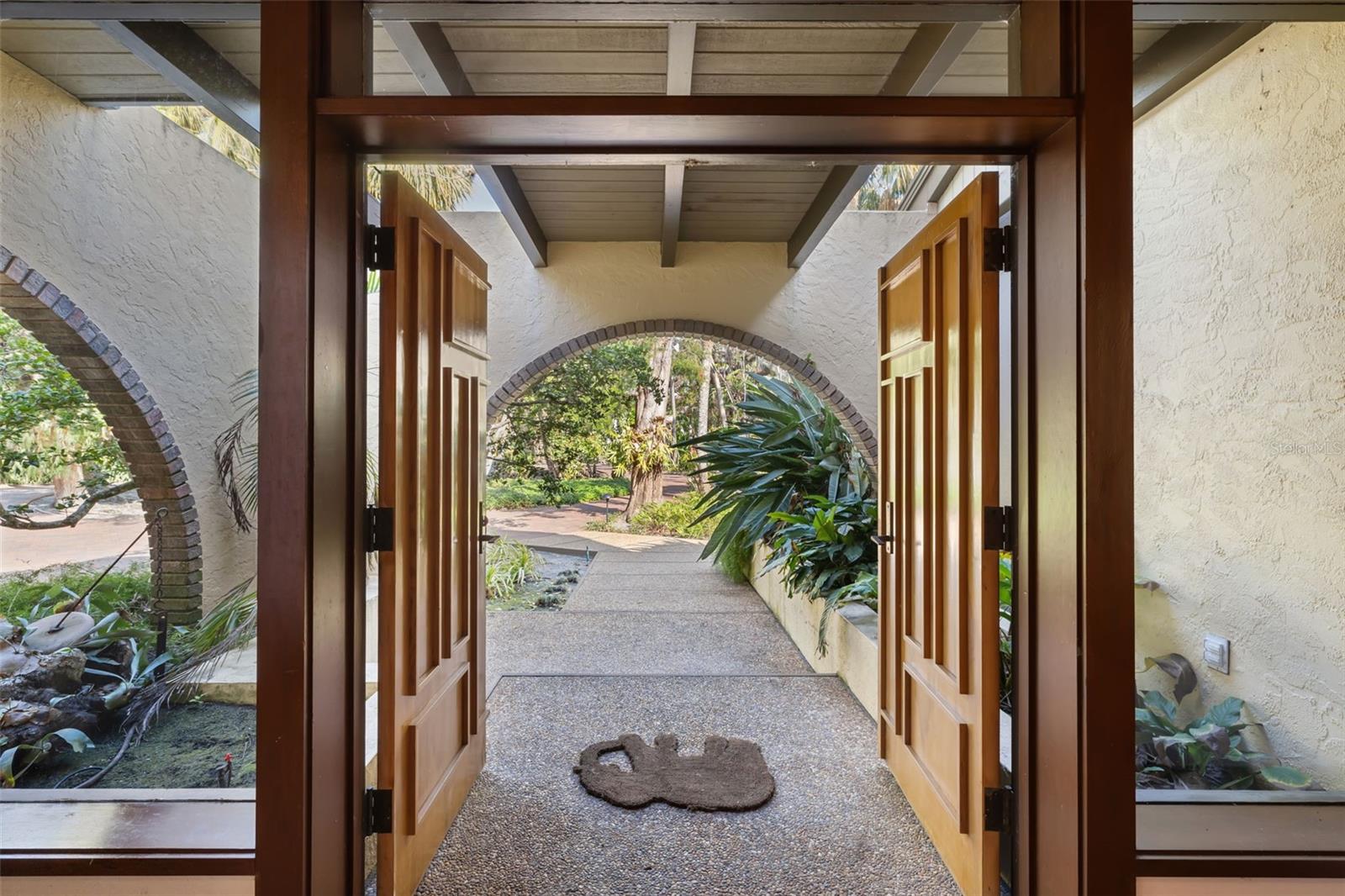 Attention architecture enthusiasts, this Mid-Century Modern waterfront home seamlessly blends timeless design with modern convenience. Resilient through three major storms, it sustained no damage beyond minor landscaping impacts and minimal water in the garage. Set on a lush .61-acre lot in the Hidden Harbor neighborhood, this jungle oasis offers an unparalleled living experience. The property boasts tropical landscaping, a tranquil koi pond and a canal-front boat dock. A circular paver driveway leads to a two-car attached garage, while the backyard oasis features a screened patio, multiple paver seating areas, and two upper-level balconies with breathtaking long canal views. Built for durability, the home includes a buried propane tank connected to a whole-house generator and an irrigation system fed by a dedicated well. Inside, the living room captivates with vaulted cypress ceilings, exposed beams, a wood-burning fireplace, hardwood flooring and double French doors that open to the patio overlooking the canal. The dining room, adjacent to the kitchen, offers hardwood flooring, sliding glass doors, and a charming chandelier. The kitchen combines functionality and elegance, featuring granite countertops, under-cabinet lighting, and a reverse osmosis water filtration system. Upstairs, the primary suite is a private retreat with vaulted ceilings, a spacious walk-in cedar closet, and sliding glass doors opening to a balcony with sweeping canal views. The en-suite bath features dual sinks, a soaking tub, a walk-in shower and vintage tile accents. An adjacent office/den offers built-in shelving, transom windows, and access to two balconies, one overlooking the canal and the other the front yard. On the main floor, the guest suite includes an 11-foot vaulted ceiling, private deck access and an en-suite bath. Additional spaces include a cozy family room with dual sliding glass doors to the patio and an interior atrium filled with lush plants. Conveniently just 1.3 miles from Siesta Key Beach and dining, two miles from shopping and a short drive to downtown Sarasota, Sarasota Memorial Hospital and the airport, this home offers serenity and accessibility. This is a rare opportunity to own a piece of architectural history in a prime location. Experience the fusion of timeless design, modern amenities and waterfront living in this Hidden Harbor gem.