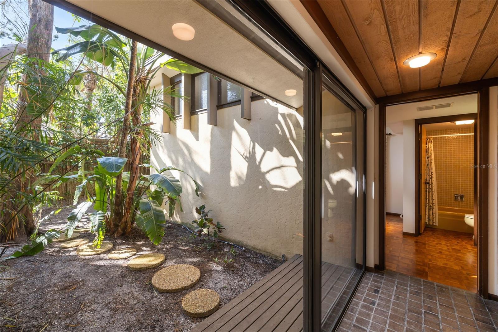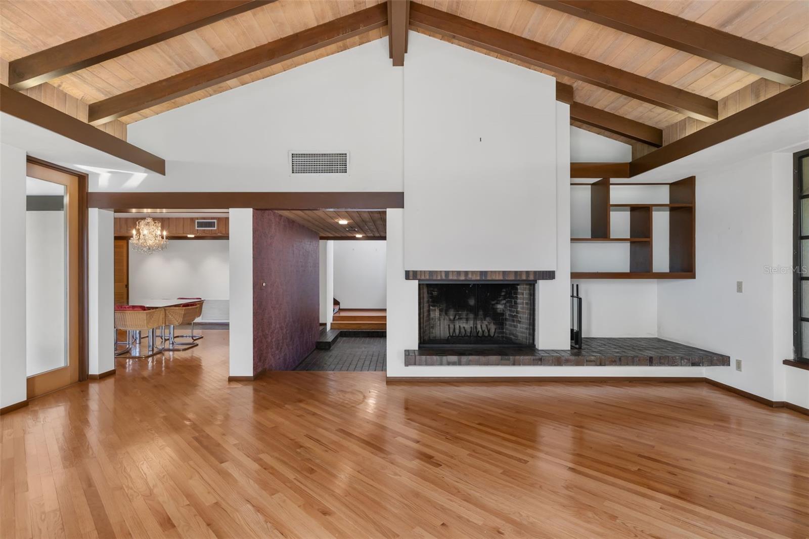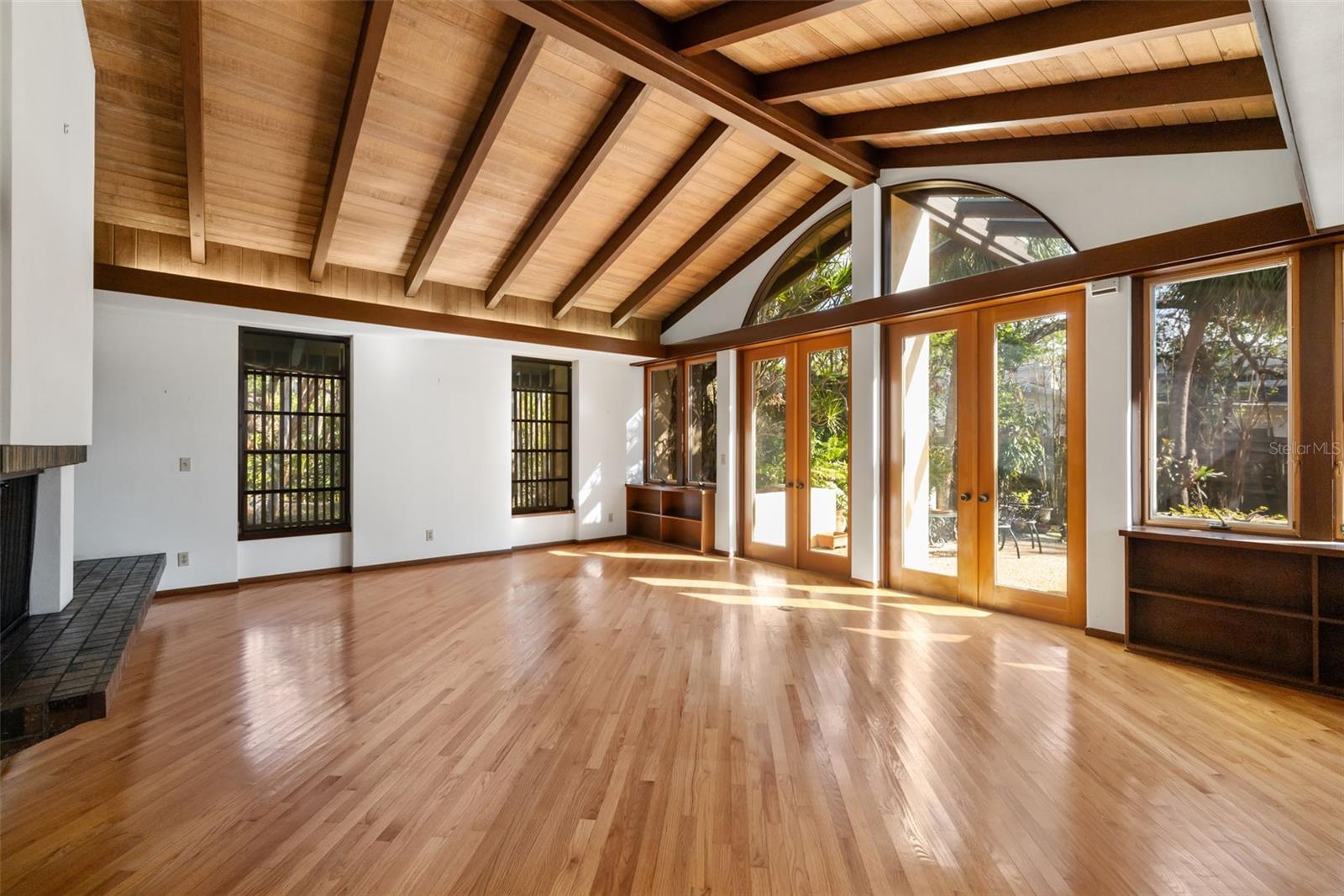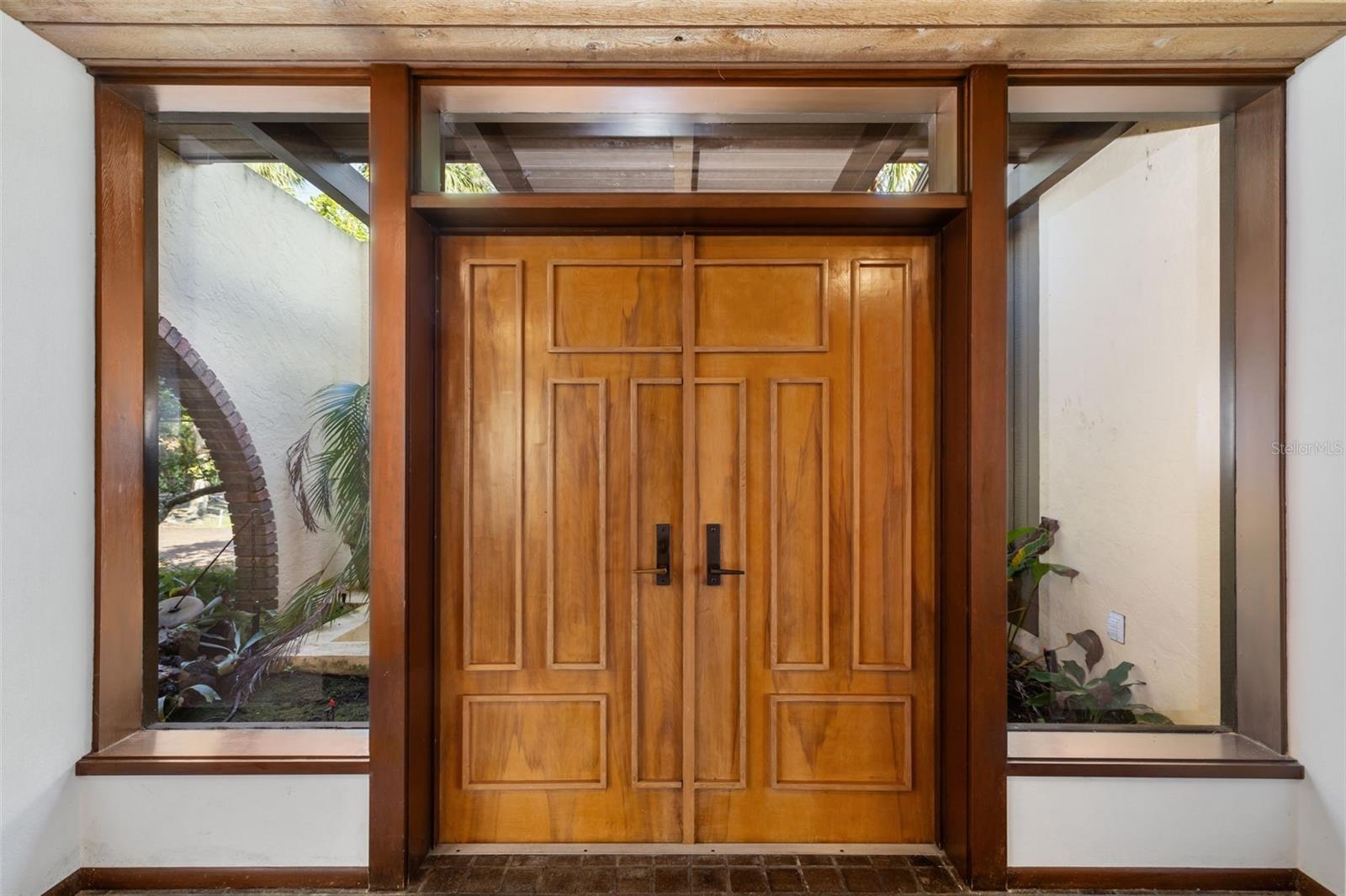 Attention architecture enthusiasts, this Mid-Century Modern waterfront home seamlessly blends timeless design with modern convenience. Resilient through three major storms, it sustained no damage beyond minor landscaping impacts and minimal water in the garage. Set on a lush .61-acre lot in the Hidden Harbor neighborhood, this jungle oasis offers an unparalleled living experience. The property boasts tropical landscaping, a tranquil koi pond and a canal-front boat dock. A circular paver driveway leads to a two-car attached garage, while the backyard oasis features a screened patio, multiple paver seating areas, and two upper-level balconies with breathtaking long canal views. Built for durability, the home includes a buried propane tank connected to a whole-house generator and an irrigation system fed by a dedicated well. Inside, the living room captivates with vaulted cypress ceilings, exposed beams, a wood-burning fireplace, hardwood flooring and double French doors that open to the patio overlooking the canal. The dining room, adjacent to the kitchen, offers hardwood flooring, sliding glass doors, and a charming chandelier. The kitchen combines functionality and elegance, featuring granite countertops, under-cabinet lighting, and a reverse osmosis water filtration system. Upstairs, the primary suite is a private retreat with vaulted ceilings, a spacious walk-in cedar closet, and sliding glass doors opening to a balcony with sweeping canal views. The en-suite bath features dual sinks, a soaking tub, a walk-in shower and vintage tile accents. An adjacent office/den offers built-in shelving, transom windows, and access to two balconies, one overlooking the canal and the other the front yard. On the main floor, the guest suite includes an 11-foot vaulted ceiling, private deck access and an en-suite bath. Additional spaces include a cozy family room with dual sliding glass doors to the patio and an interior atrium filled with lush plants. Conveniently just 1.3 miles from Siesta Key Beach and dining, two miles from shopping and a short drive to downtown Sarasota, Sarasota Memorial Hospital and the airport, this home offers serenity and accessibility. This is a rare opportunity to own a piece of architectural history in a prime location. Experience the fusion of timeless design, modern amenities and waterfront living in this Hidden Harbor gem.