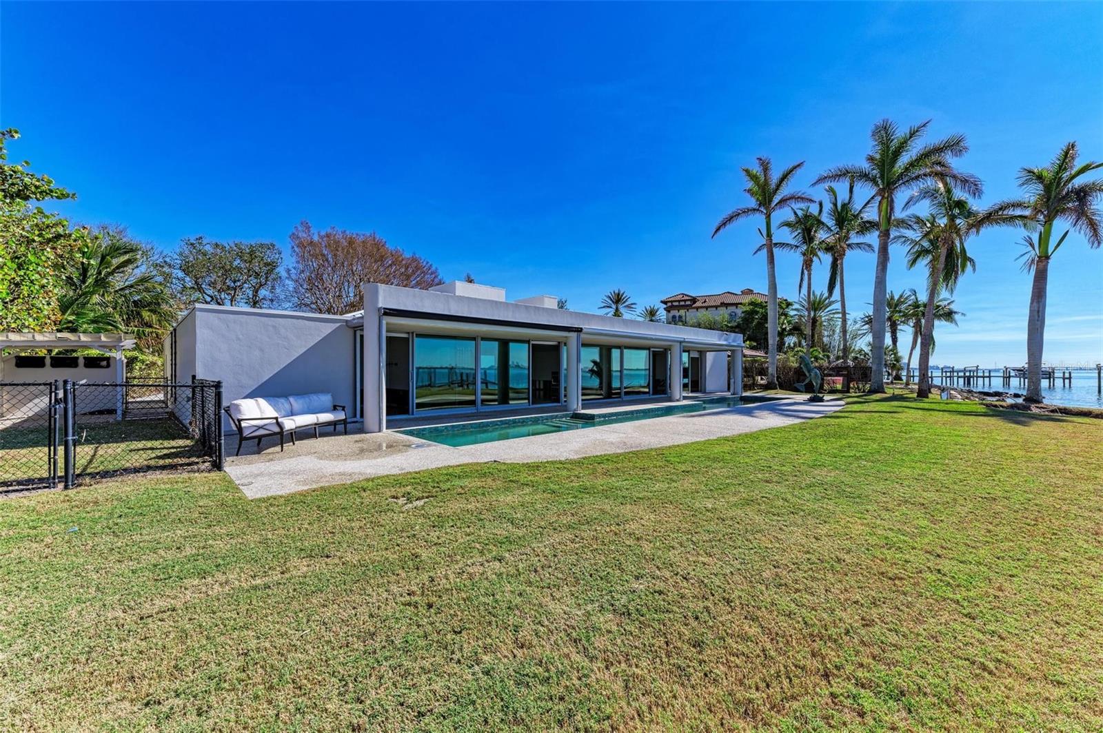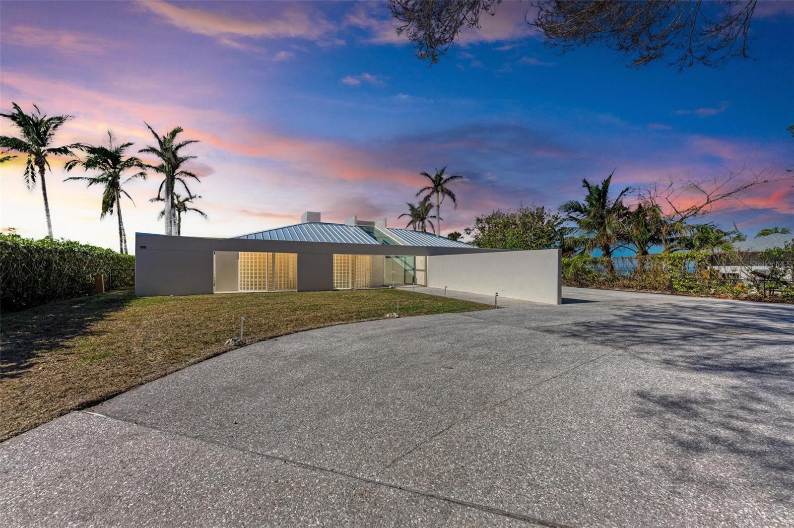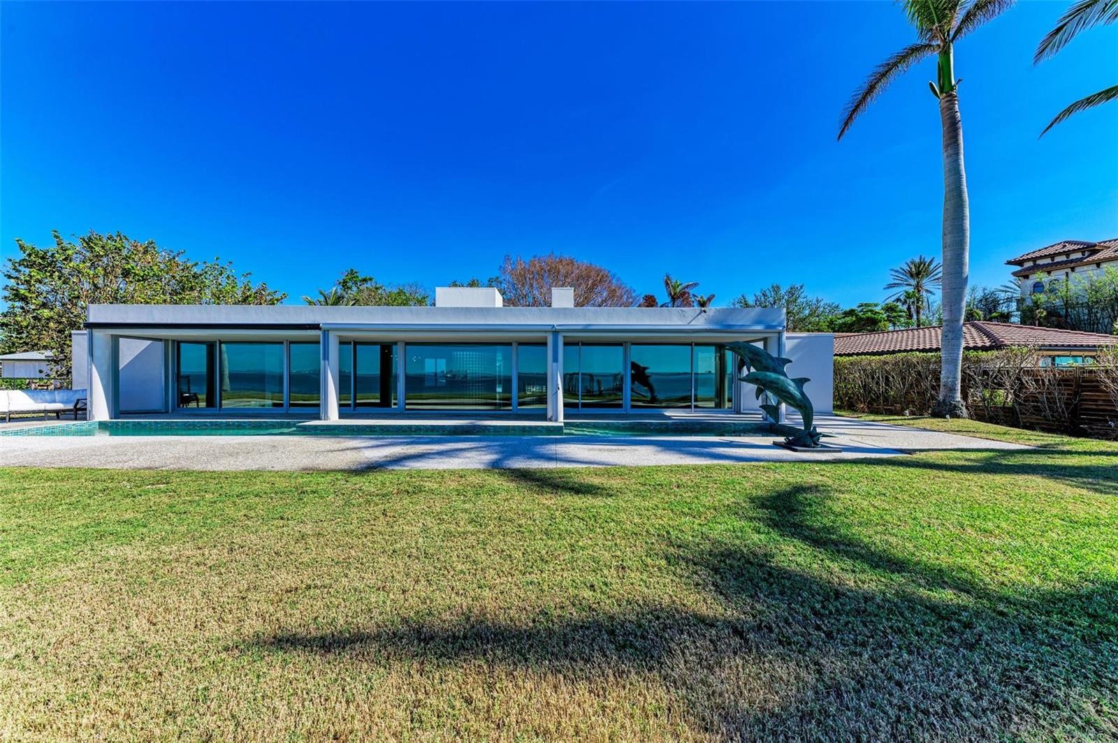 Exquisite Sarasota bayfront estate. Iconic modern design with unmatched views. At the apex of Stephens Point, this exceptional property offers one of the desirable locations in Sarasota, with panoramic, 180-degree views of North Sarasota Bay, the sparkling downtown lights and architectural beauty of the Ringling Bridge. Whether you're captivated by the vibrant sunset skies or the tranquil waters below, this home delivers a living experience that is simply unparalleled. Recognized as one of the most architecturally significant homes in the area, the former Baker Residence stands as a beacon of modern design. Designed by the award-winning architect Michael Shepherd and reimagined in 1992, the home embraces an open-concept floor plan that harmoniously connects the indoors with the stunning natural surroundings. Floor-to-ceiling windows flood the space with natural light, offering breathtaking vistas from almost every room. From the moment you step into the all-glass foyer and pass the sleek privacy wall, you’ll be captivated by the incredible water views that stretch as far as the eye can see. Set on nearly half an acre of gated and fenced land, this legacy estate boasts an impressive 120 feet of direct waterfront on North Sarasota Bay. A dream come true for boating enthusiasts, water sports aficionados and fishing lovers, the private dock provides effortless access to the bay for all your aquatic adventures. Nature enthusiasts will be equally delighted, with dolphins, marine life and a variety of bird species gracing the waters just outside your door. This stunning residence has undergone extensive updates in the last four years, ensuring a blend of modern comforts and timeless design. Recent improvements include a new metal roof, impact-resistant glass windows and sliding doors, retractable Kevlar storm panels and a completely refinished pool with contemporary glass tile. Inside, the gourmet kitchen is a chef's dream, featuring granite countertops, mahogany paneling and unobstructed views of the bay, making it an ideal space for cooking and entertaining. The spacious owner's suite is a serene retreat, with an indoor/outdoor spa, ideal for unwinding while taking in the waterfront vistas. The property also offers the ultimate in convenience and privacy, with a fully fenced perimeter, a Wi-Fi-enabled gate and a three-car garage with an epoxied floor. The lush front landscape is anchored by a stately banyan tree, adding a touch of grandeur to the estate. At the rear, the designer pool and expansive pool deck invite relaxation and entertaining, offering ample space for gatherings, while you enjoy the full sweep of Sarasota Bay views, second to none. Whether you're seeking a peaceful sanctuary to call home or an entertainer's paradise with incomparable vistas, this iconic Sarasota estate checks every box. Experience the beauty, serenity and exclusivity of one of the finest waterfront homes in the area. Minor flooding affected this home. It is being sold as-is.