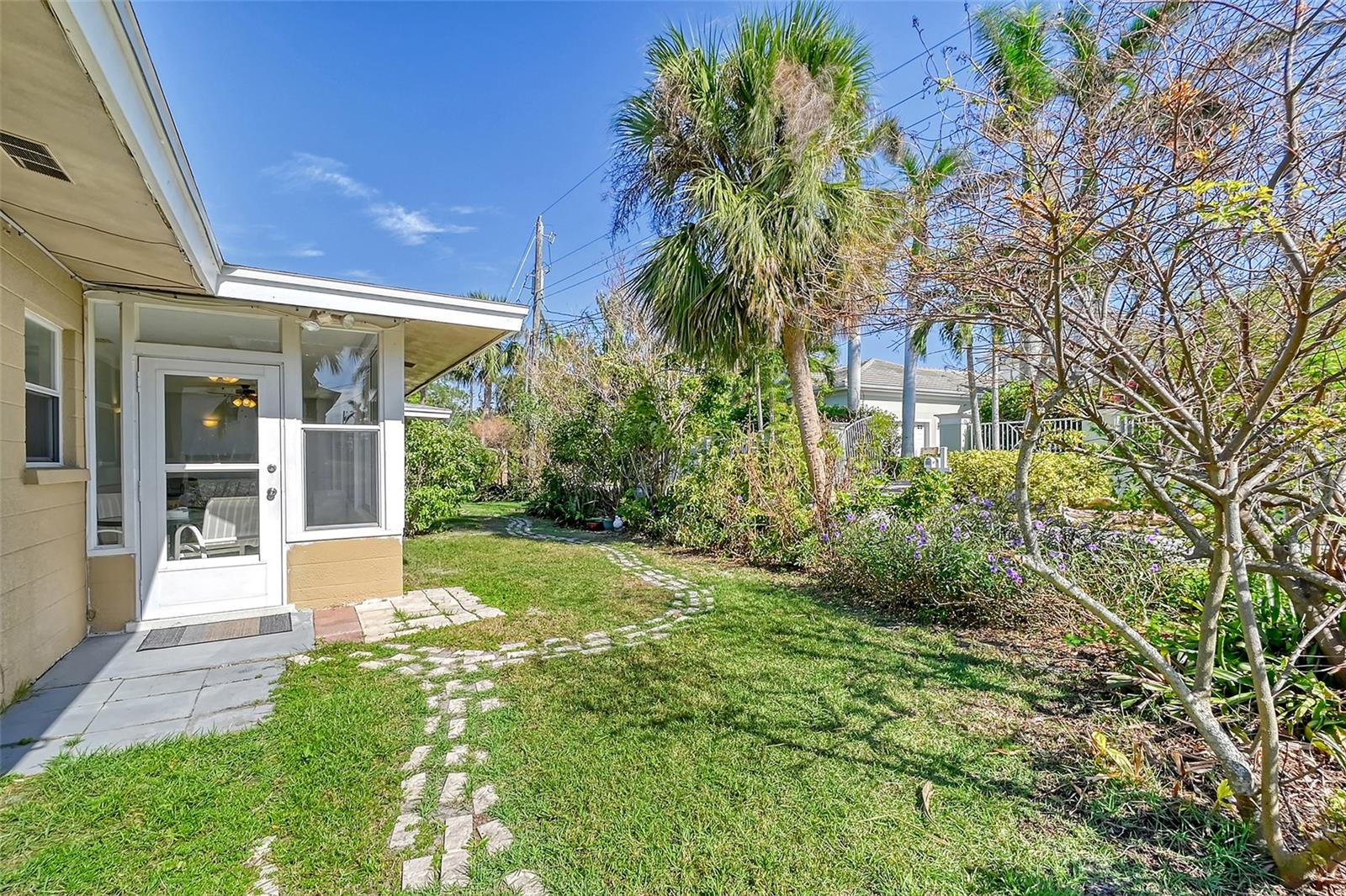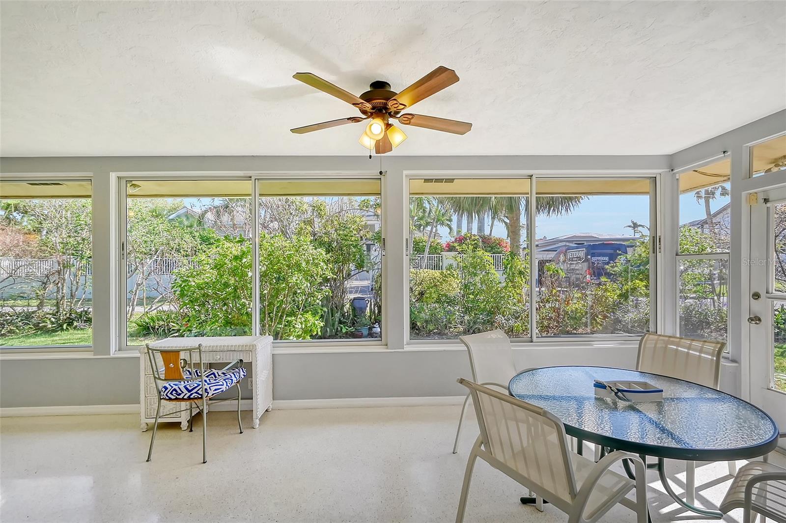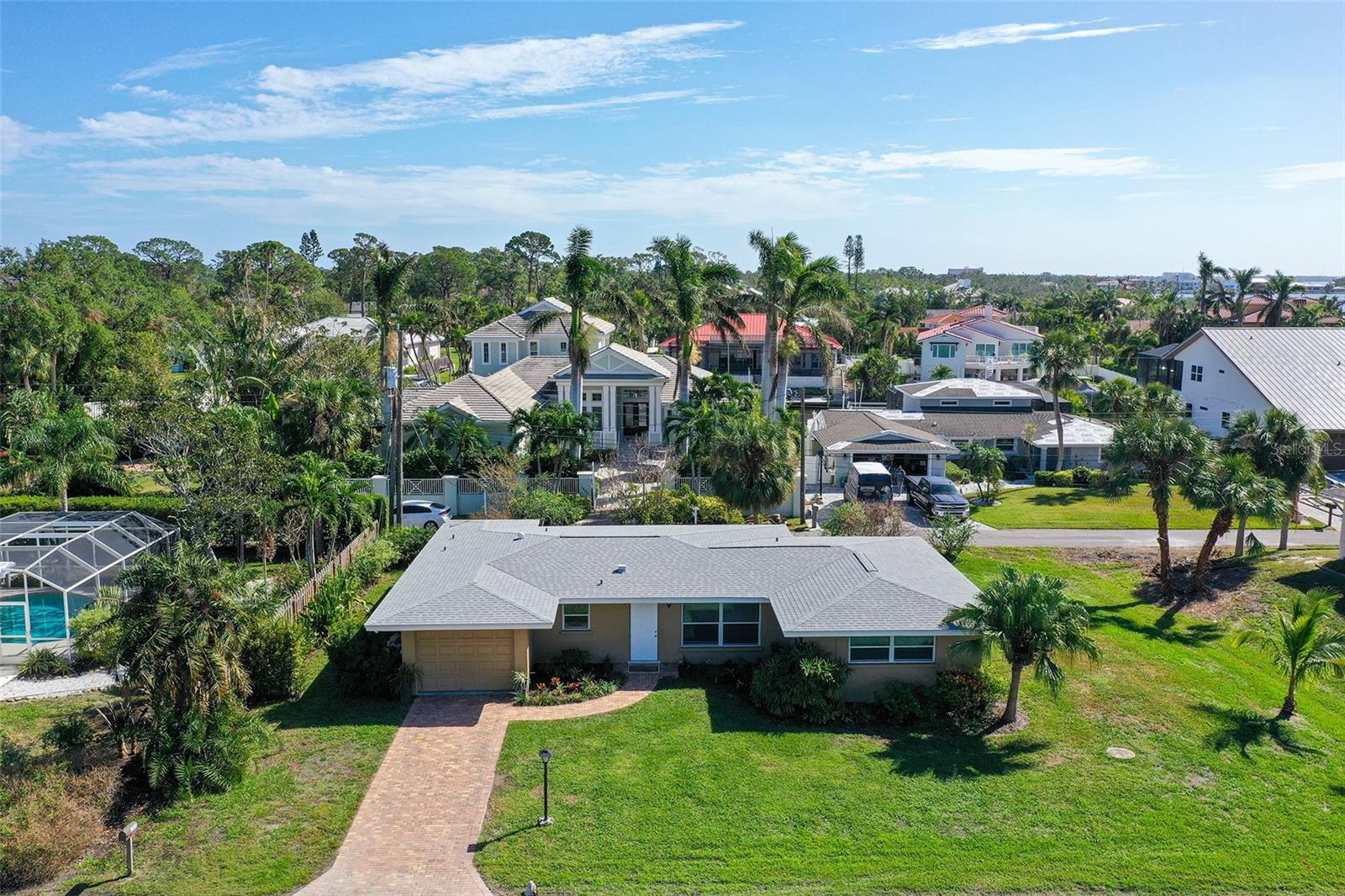 Ideally tucked away in a quiet, private neighborhood on the mainland in walking distance to #1 Siesta Key beach is this wonderful light & bright home. This well-maintained 2-bedroom 2-bath open-plan residence with large sunroom and 1-car garage is sold turnkey furnished ready for you as a primary home, vacation home or investment property. Rented continuously for the past 20 years as a successful Airbnb and annual rental with great rate of return. Approximately 1400 sq ft of air-conditioned space with an additional 232 sq ft laundry/utility room. The very spacious sunroom/Florida room is glass-enclosed & air conditioned with large picture windows bringing in the light and overlooking a serene landscaped garden. The roof was replaced in 2023, newer windows, newer septic tank & lift station, electric service upgrade, polished terrazzo floors throughout, paver brick driveway. Effective year built is 1997. Come see this special home surrounded by multi-million dollar homes and less than a mile from shopping and restaurants in eclectic Gulf Gate Mall, watersports & the beach.