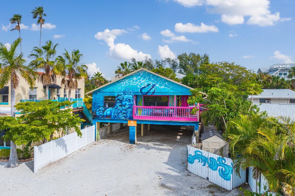 Presenting an exclusive opportunity on Siesta Key Beach – an exceptional duplex for your consideration. This is situated directly on Beach Road, boasting a consistent income stream. It can be retained as a lucrative investment or transformed into a grand three-story duplex with the potential for even greater returns. This property is divided into two separate units: a 2-bedroom, 2-bathroom unit and a 2-bedroom, 1-bathroom unit. With its rare zoning approval for short-term and nightly rentals, this property is perfect for use as a primary home, vacation home, or income-generating investment. This home's revenue is sure to exceed your expectations. All aspects of the rental, including cleaners, management, and handyman services, are already in place, ensuring a seamless and hassle-free transition. This property has earned a 4.9-star rating as a VRBO 'Premier Host and is recognized as an Airbnb 'SuperHost'. Included is an already preapproved plan with permits paid and engineered drawings approved to enclose the bottom garage area, adding an additional 2,000 square foot of space. Custom murals throughout the house making it one of the most sought after and unique homes on Siesta Key. Both units have undergone recent upgrades, including new floors, fresh paint, new bathrooms, and stylish new furnishings. Local artist-created custom murals provide pops of color to the traditional shiplap walls, and built-ins. The kitchens feature granite countertops and stainless-steel appliances, and the exteriors offer new fencing, a stone-paved patio with two grills, 2 private hot tubs, 2 tiki huts and a large heated pool. Entire in-house property management, cleaners, handyman, etc to stay with the sale making it turnkey and easy to operate. The management fee cost is about 3.5%, not the standard 20% as in most cases. The home brought in over $386,000 gross in last 12 months. Gross cap rap is at 11%. This is unheard of on such a great property that will continue to grow in value.