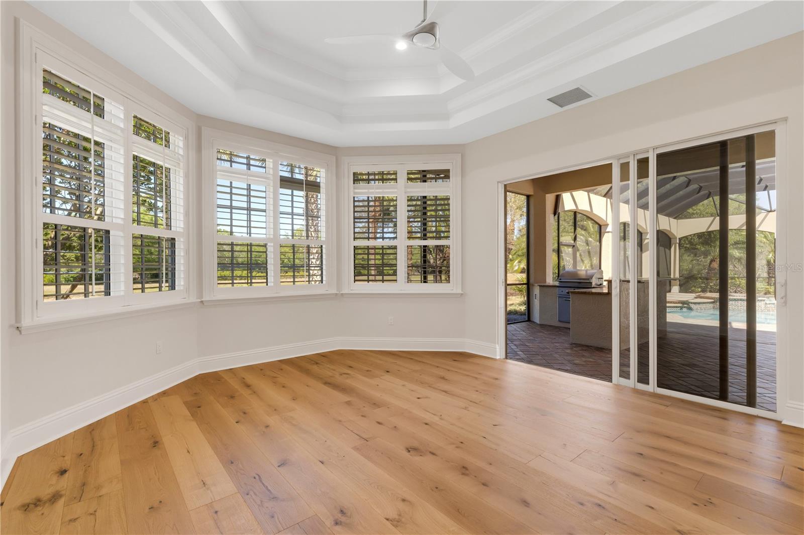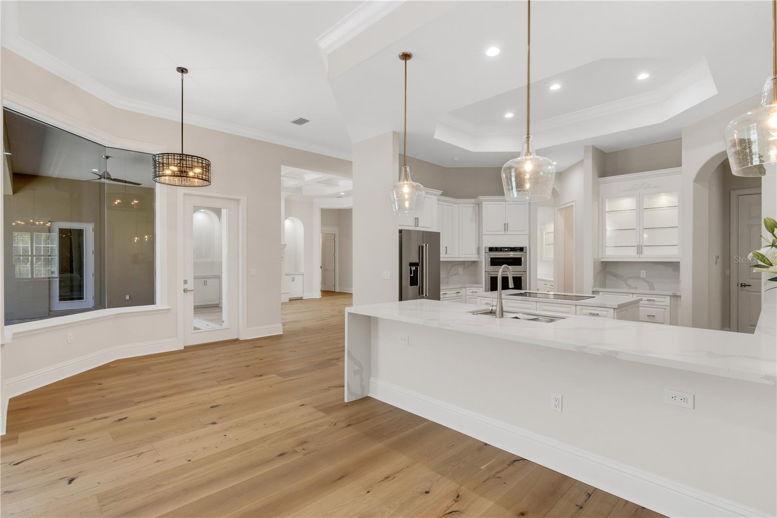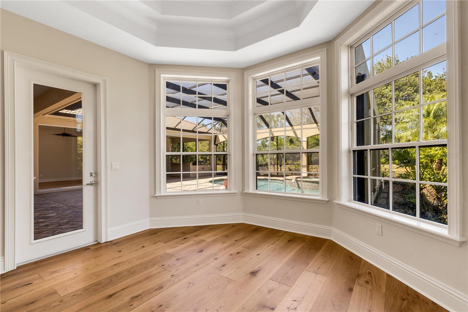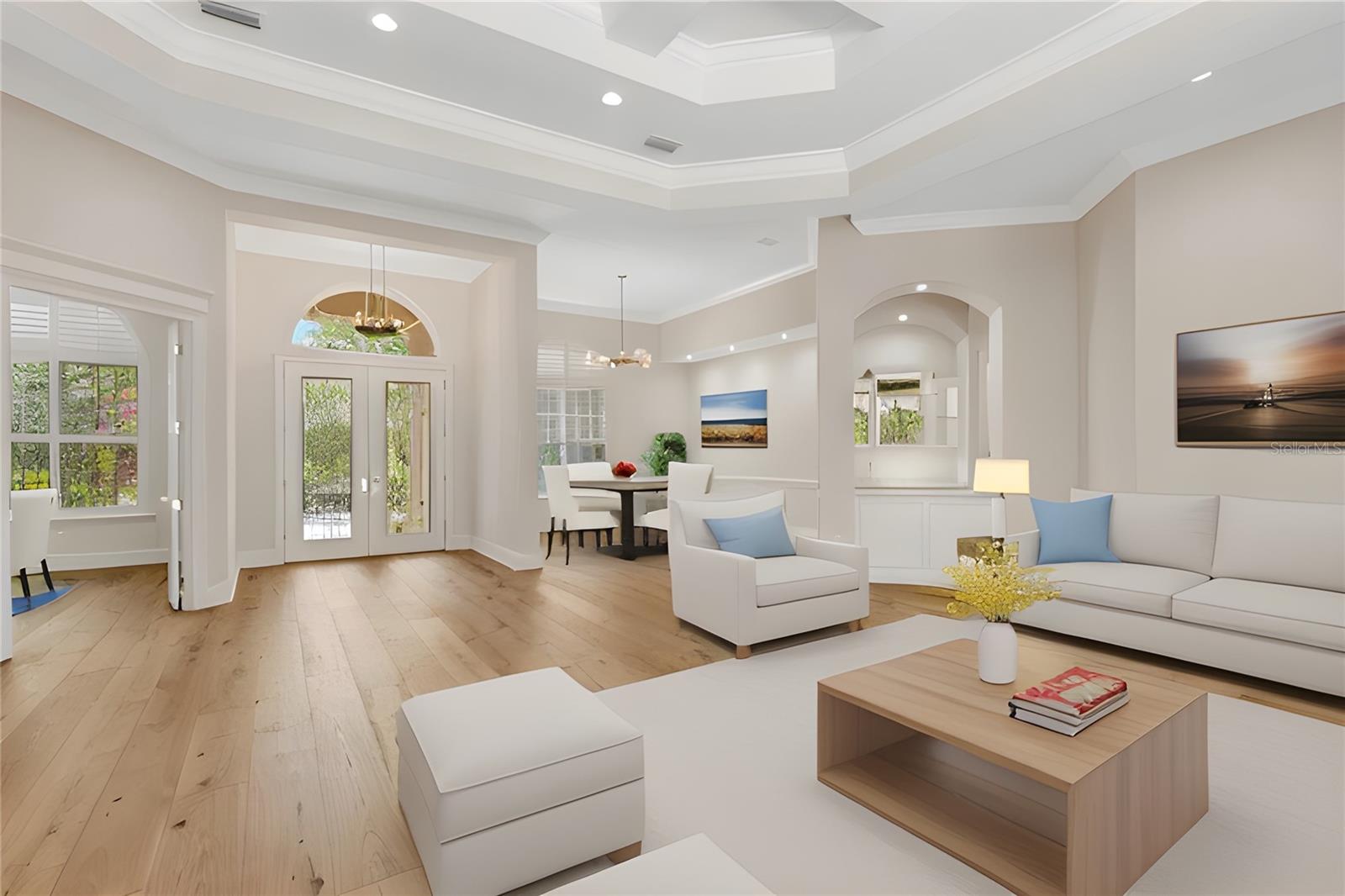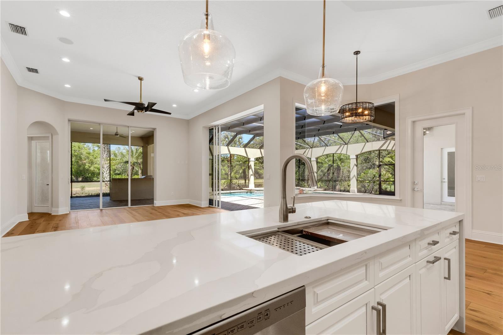 Beautifully updated home in the coveted Founders Club! Featuring 3 Bedrooms, 4 Baths, Den and a flexible Bonus Room which could function as a 4th Bedroom, Game Room, Media Room, or additional Office Space. Major renovation to this home includes: Gorgeous Wood Flooring throughout, New Paint inside and out, New Light Fixtures, New Wine Room, New Baths, and a Spectacular New Kitchen, creating an Updated, Contemporary Atmosphere with a Open, Light and Bright Feel! The Kitchen is a Chef's Dream with Calcutta Gold Quartz Countertops with a Stunning Waterfall Edge, Large Island with Cooktop, Custom Cabinetry, New Kitchen Aide Appliances including Built In Wall Oven and Microwave, New Light Fixtures, Breakfast Nook, Butler's Pantry with Wet Bar, and a New Wine Closet with extra Cabinets for Storage, Wine Cooler and Beverage Cooler. Owner's Suite is nicely appointed with tranquil views of the Lake and Expansive Lanai, as well as two large Walk In Closets with Closet Organizers, and an updated Bath with Dual Vanities, Soaking Tub, Separate Shower, and Water Closet. This Impressive Home is perfect for Relaxing or Entertaining as it features a Family Gathering Room adjacent to the Kitchen, Separate Formal Living Room with Gas Fireplace, Formal Dining Room, Open Floor Plan, Split Bedroom Plan, and Pocket Sliding Glass Doors that open to the Stunning Lanai with Heated Pool and Spa, Covered Outdoor Living Area, and Outdoor Kitchen, all overlooking Lush Landscaping and Lake View. Other High End touches include Crown Molding, Tray and Coffered Ceilings, a beautifully updated Laundry Room, and a Large Side Entry 3 Car Garage with extra storage. Enjoy the Florida Lifestyle in the gated community of The Founders Club, with it's exclusive Robert Trent Jones Jr 18-hole Championship Golf Course, Tennis/Pickle Ball Courts, Basketball Court, Fitness Center and an option to join as a Social Member which would include the Active, 24,000 sf Clubhouse with Restaurant, Bar, and Dining Patio overlooking the Gorgeous 18th Green. Prime Sarasota location with close proximity to Downtown Sarasota, St Armand's Circle, Lido and Siesta Key Beaches, University Town Center, I-75, Sarasota Airport, Medical Centers, and is also adjacent to the new Lakewood Ranch Waterside Main Street with restaurants, shopping, and Farmer's Market. This is truly an excellent opportunity to own a Move In Ready, Completely Updated Home in a Highly Desirable Area! Schedule an appointment today, this Spectacular Home will not disappoint!