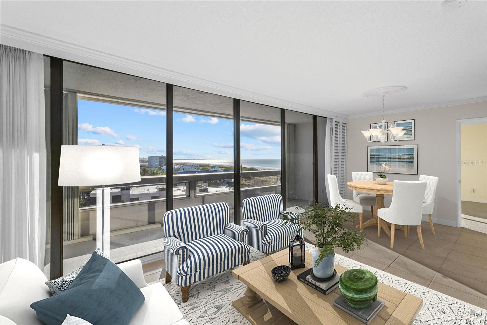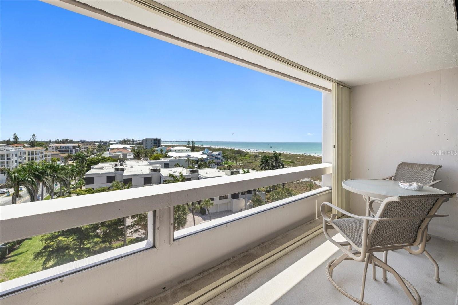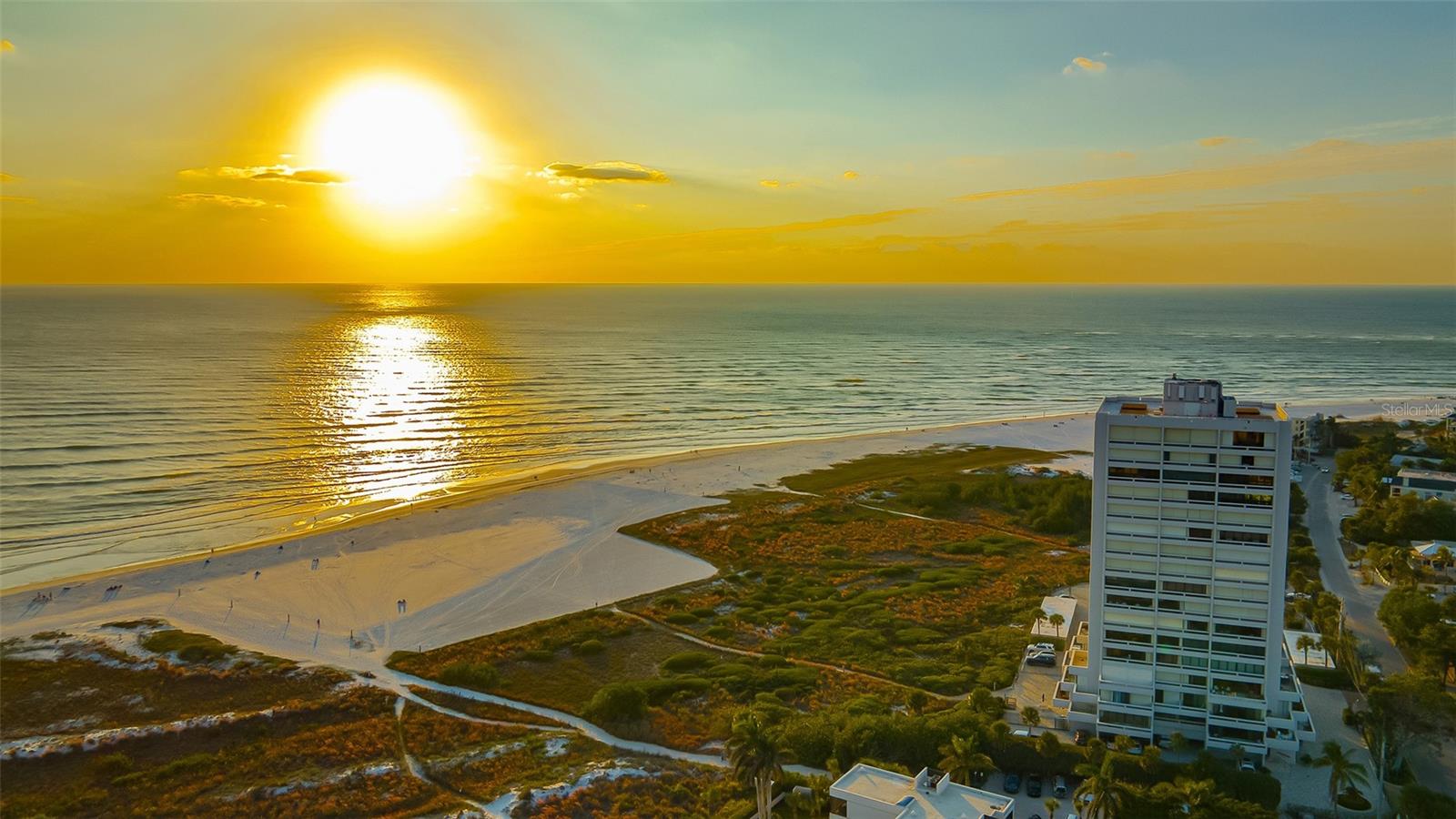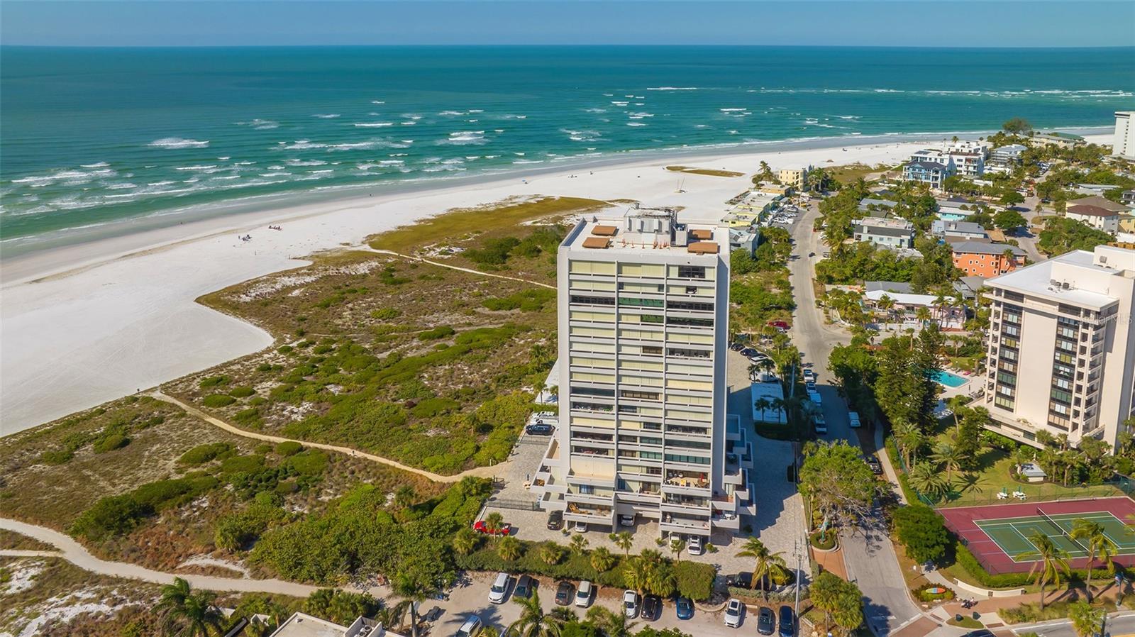 One or more photo(s) has been virtually staged. Discover an unparalleled coastal living experience at Beach Terrace, one of the most coveted addresses on Siesta Key. This unfurnished 2-bedroom, 2-bath corner condominium offers an extraordinary blend of luxury and location, perfectly positioned with a direct Gulf of Mexico oceanfront setting. Nestled at the end of Siesta Key Village, the property provides panoramic vistas spanning the beach, village, and sparkling aqua waters. The spacious corner unit features three expansive balconies that invite you to savor every moment of coastal living. From morning coffee to evening sunsets, residents can enjoy stunning views of downtown Sarasota's skyline while imagining their perfect personalized decor. The split floor plan maximizes privacy and provides an ideal canvas for your unique design vision. The kitchen boasts updated cabinetry, high-end appliances, elegant granite countertops, and sophisticated lighting. The large living area features dual sliding doors that flood the space with natural light and provide unobstructed views of Siesta Key's pristine beach. The generous dining area offers the perfect backdrop for creating your ideal entertaining space. The primary bedroom offers a private balcony with captivating gulf and village views, complemented by an en-suite bathroom featuring updated tile and countertops. The second bedroom provides an additional full sliding door with dazzling gulf views and a separate full bathroom, Residents of Beach Terrace enjoy resort-style amenities including an elevated heated saltwater pool, community room with kitchen, fitness equipment and on-site management. All while offering direct access to a private beach and a short distance to all the dining and shopping of Siesta Key Village. This unfurnished property represents a blank canvas ready for you to transform into your dream coastal home. One or more of the photos have been virtually staged with furniture for inspiration. Call for your personal tour today.