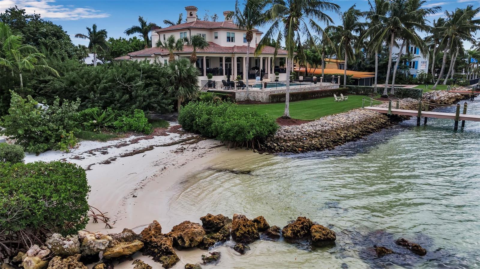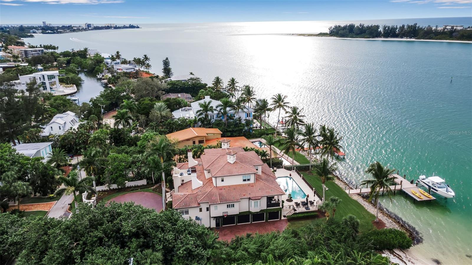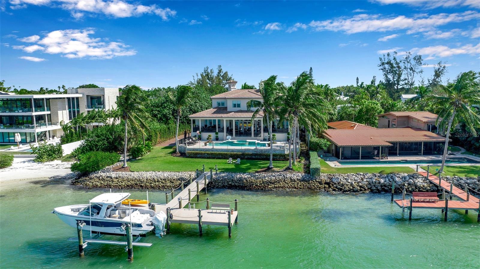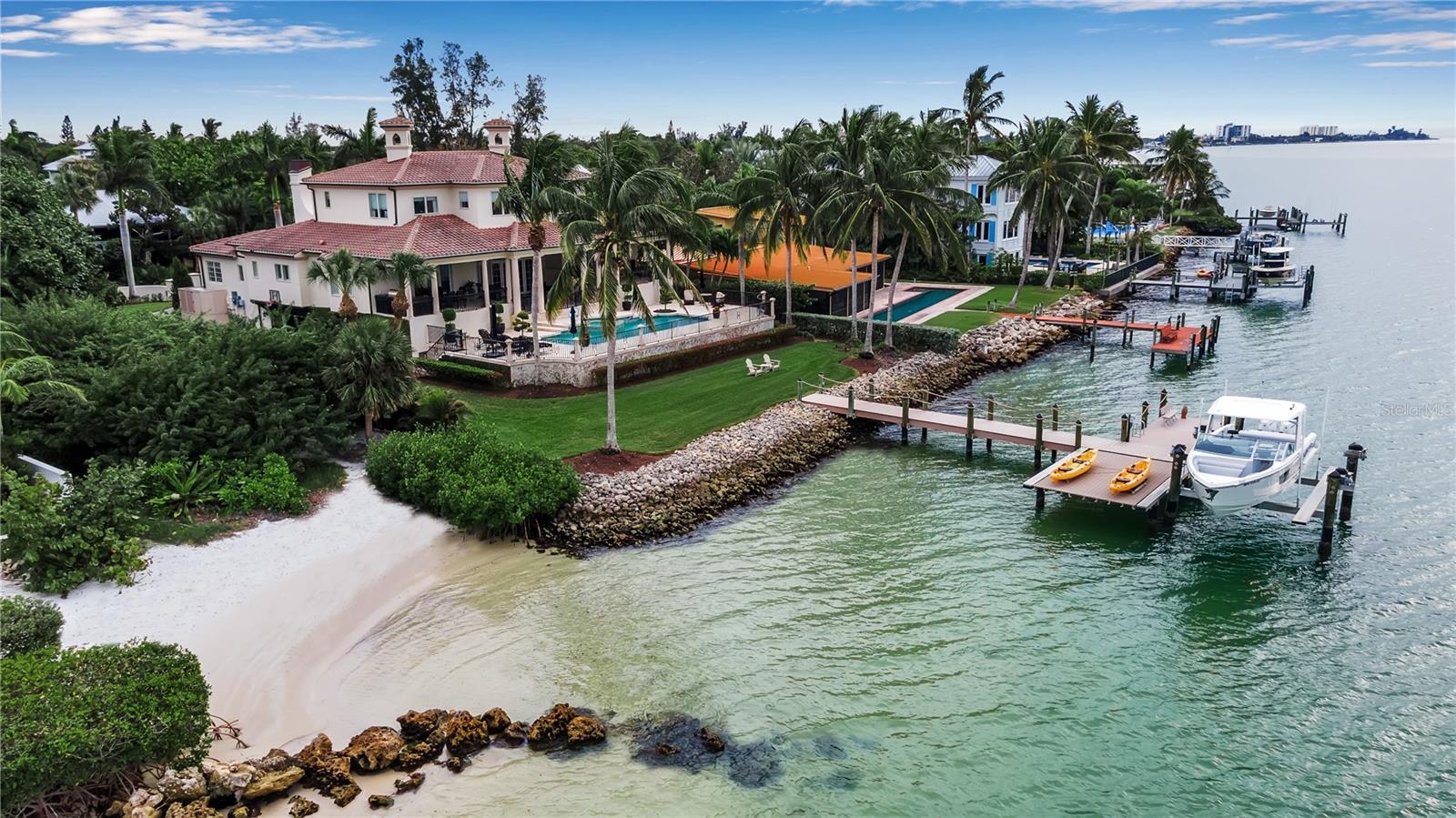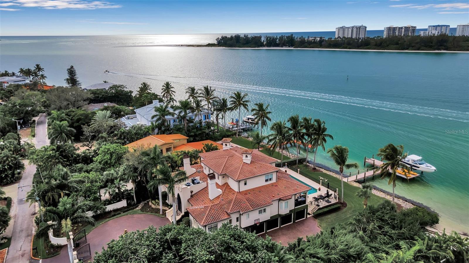 PRICE IMPROVEMENT on this exquisite home also, now being offered fully furnished, ensuring a seamless transition for new owners and providing instant enjoyment to create memories for a lifetime. Sellers have taken proactive measures by contracting and paying for a new roof, even though the existing roof has an estimated 5-7 years of life remaining. This enhancement provides added peace of mind and long term value. Furthermore, the home has shown no signs of water intrusion following the recent tropical storm, highlighting its robust construction. Welcome to your sanctuary on the famous Siesta Key, located on Big Pass at the entrance to the Gulf of Mexico. This extraordinary timeless residence offers beach access, boat dock, and, of course, those incredible views that never go out of style. You can have it all in this exquisite home! This home is the epitome of "Location! Location! Location!" Brilliantly designed and lavishly appointed, it showcases the very best of everything as far as the eye can see. Imagine instant enjoyment, with coveted sunrises, sunsets, and the serenity of the island living in this exquisite waterfront estate on the coveted north end of Siesta Key steps away from beach access. Step inside and be greeted by the stunning vistas you've only dreamed about, and embrace every day with the 5-star lifestyle that Sarasota and her islands are famous for, including the world-renowned crystal white sands of Siesta Beach. The open-concept living area, complete with high-end appliances, offers the perfect space for intimate gatherings and grand entertaining. A private elevator whisks you between levels, while high ceilings and floor-to-ceiling impact glass windows frame an expansive 180-degree view that seems to go on forever. Every generous bedroom—five in total—has an ensuite bathroom, allowing you and your guests to bask in natural light and gorgeous views from every corner of the home. Waterfront properties like 3500 Bayou Louise Lane are truly a rarity, making this a once-in-a-lifetime opportunity to acquire a true gem. One of Architect Thorning Little's most transcendent designs, this home boasts a distinctive symmetry, beautifully balanced by the ever-changing canvas of Big Pass and the Gulf of Mexico. Nearly every room offers breathtaking views of the Caribbean turquoise waters, providing a perfect escape from the hustle and bustle of the outside world. With over $3 million in upgrades since 2020, no detail has been overlooked. Bespoke finishes adorn every room, including Italian plaster, book-matched Calcutta Gold slab marble, hand-carved limestone, a hand-finished Clive Christian kitchen, custom-designed authentic wood floors, a Palm Beach Designer ceiling, and a custom American walnut library. Thoroughly modern and automated, the home features Lutron lighting, a hardwired camera and security system, and commercial-quality Wi-Fi in every room for seamless coverage. The amenities continue with a four-car garage, a 40x20 pool and spa, a 24K lbs. beamless boat lift, three fireplaces (outdoor, library, and living room), ample storage, two Tesla high-speed charging stations, a cellular gate call box, and Seura TV mirrors in the master and in-law bathroom suites. Programmable motorized window blinds complete the package, adding a touch of luxury and convenience to every day.