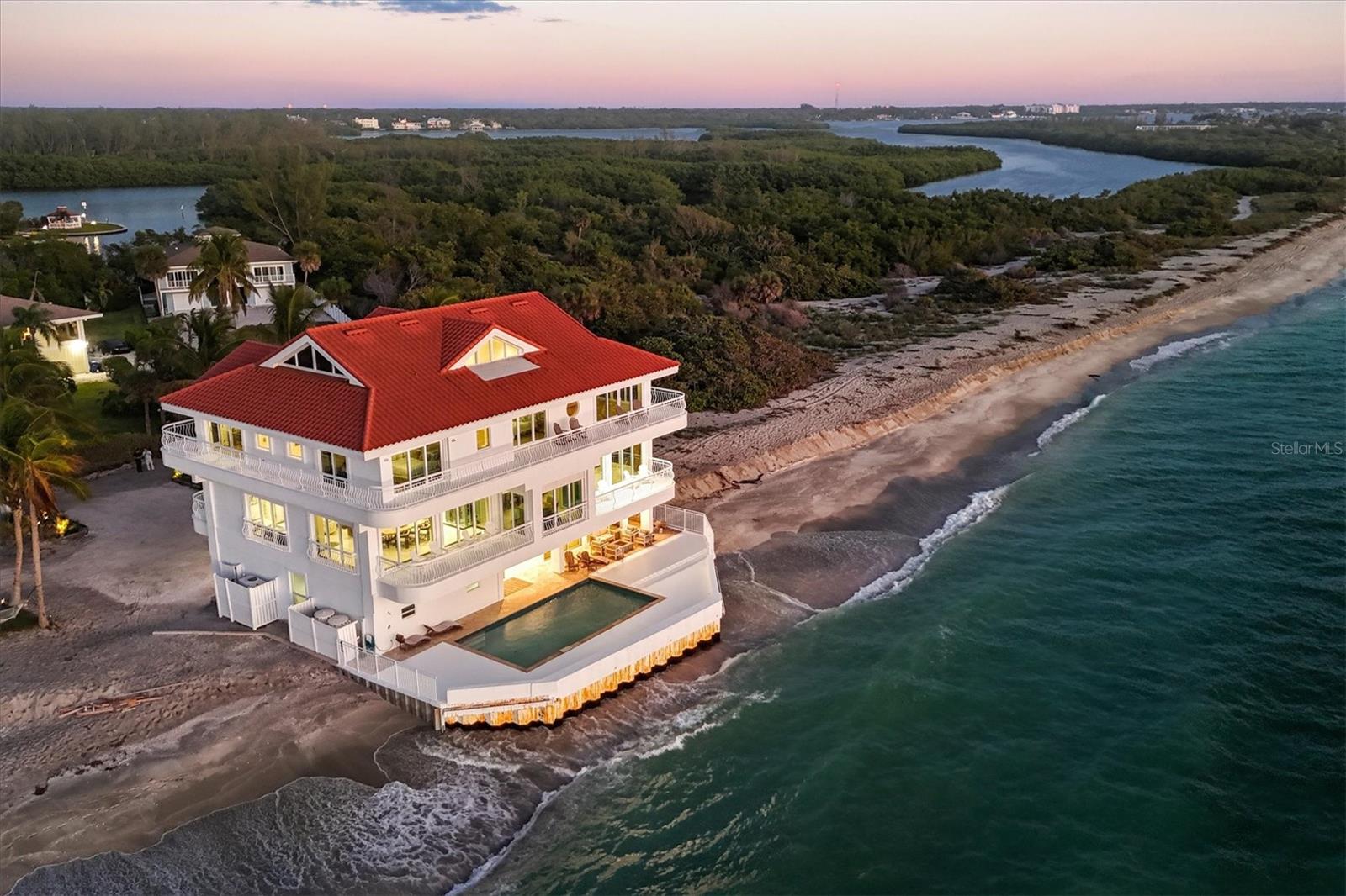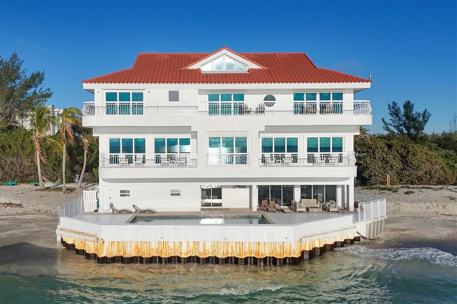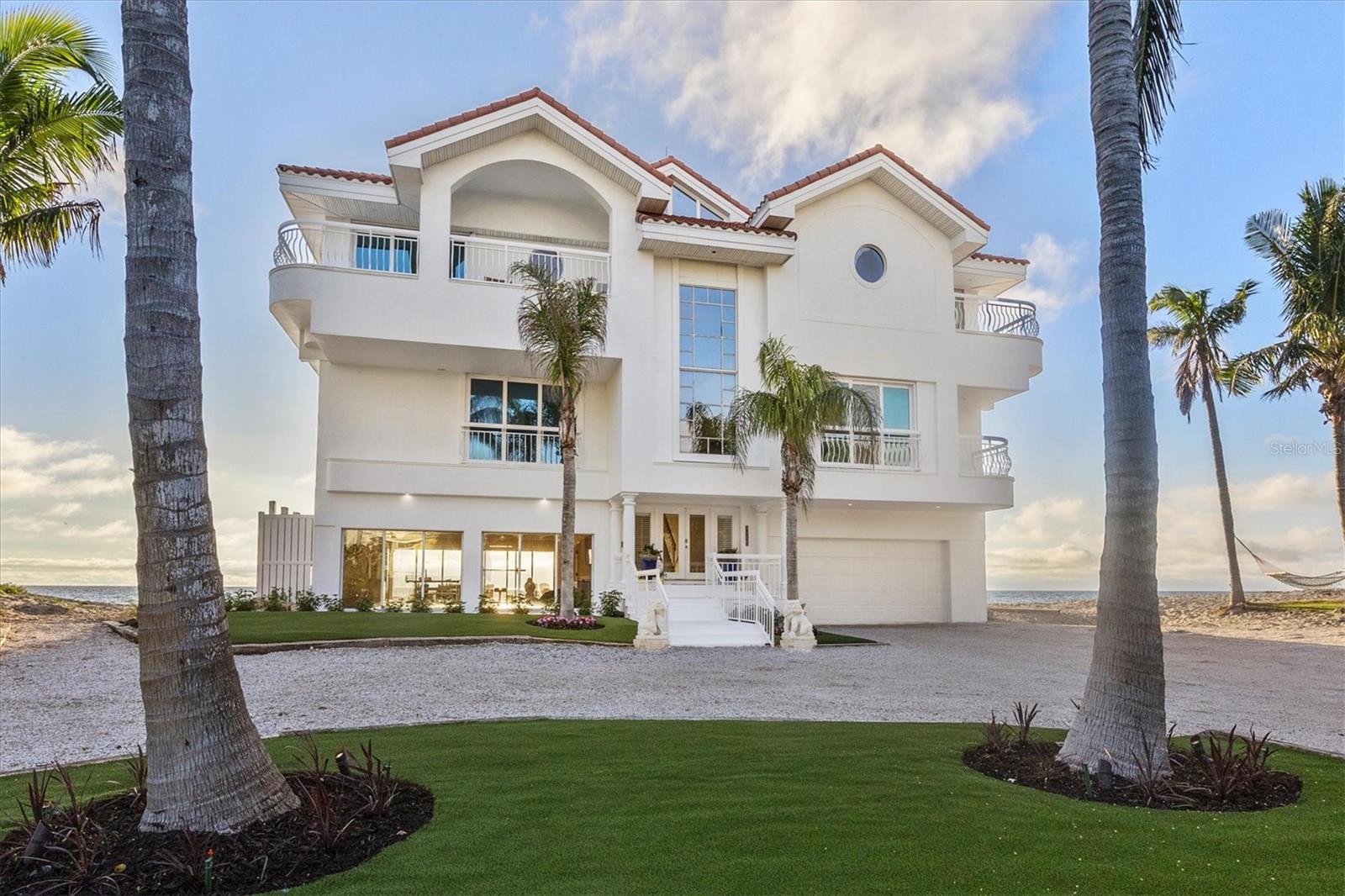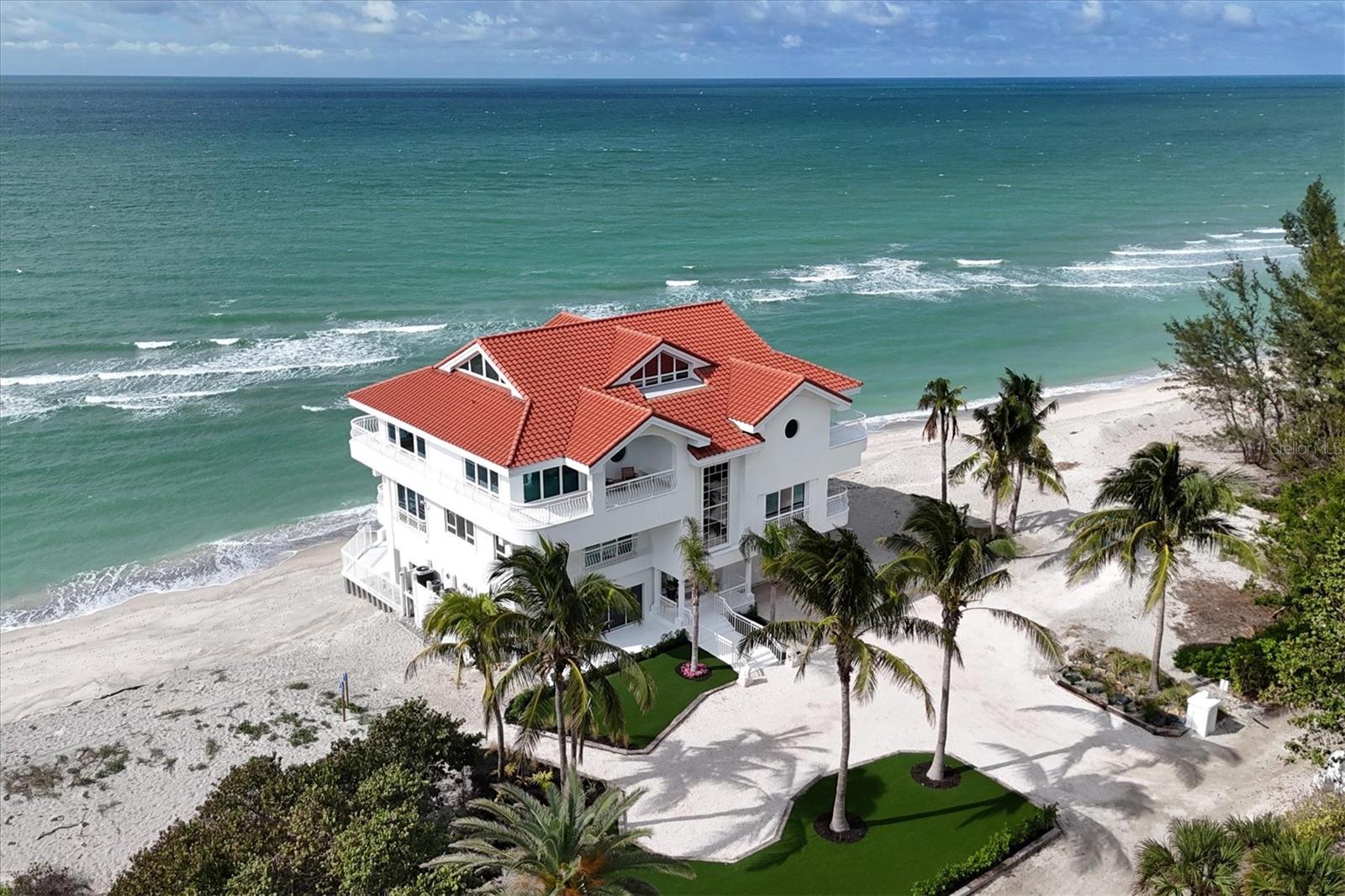 This is island living at its best on world-famous Siesta Key! Revel in unparalleled proximity to the Gulf of Mexico, as this residence places you literally on one of the best beaches in the country, where you can watch the gentle waves roll in and admire the ever-changing sunsets over the calm blue gulf water. Accessed via a private sandy road on the south end of Siesta Key, this beach house is a true island escape. Sited on a Gulf-front lot with 85 feet of frontage with pristine crystal sand beach, this residence stands as a testament to architectural significance and superior craftsmanship. Once inside, the grand staircase gives way to the expansive open floor plan revealing a living space that is both awe-inspiring and welcoming. Immerse yourself in the panoramic vistas of the Gulf of Mexico through floor-to-ceiling sliding glass doors that grace the formal living, dining, kitchen, and family rooms. The kitchen, featuring stunning cabinetry, top-of-the-line stainless steel appliances, and a long rectangular island with counter-height seating, is perfectly positioned between the formal and informal living areas to create one generous entertaining space. The wine enthusiast will love the large, lighted wine display cabinet. Finishing up the main living level is an office and a sitting area. The primary suite is an oasis and boasts tray ceilings, custom closets, and a spa-like bathroom with built-in beverage cooler and sliding glass doors onto a balcony wrapping around the house. Additional bedrooms offer spacious accommodations with walk-in closets and en-suite bathrooms. For added privacy, there is an upper bonus room that could be used as a bedroom, playroom, home gym, or extra office space. The multiple terracing outdoor spaces, private gulf-side pool, firepit, and downstairs game room offer plenty of options to relax and enjoy island living. Turf landscaping and an oversized two-car garage with a charging station complete this incredible property. Start enjoying all that island life on Siesta Key has to offer. Incredible rental potential - sellers have been quoted $50,000 per month.