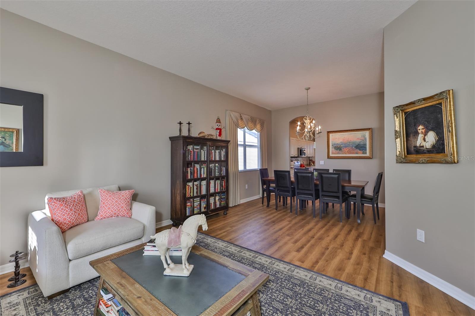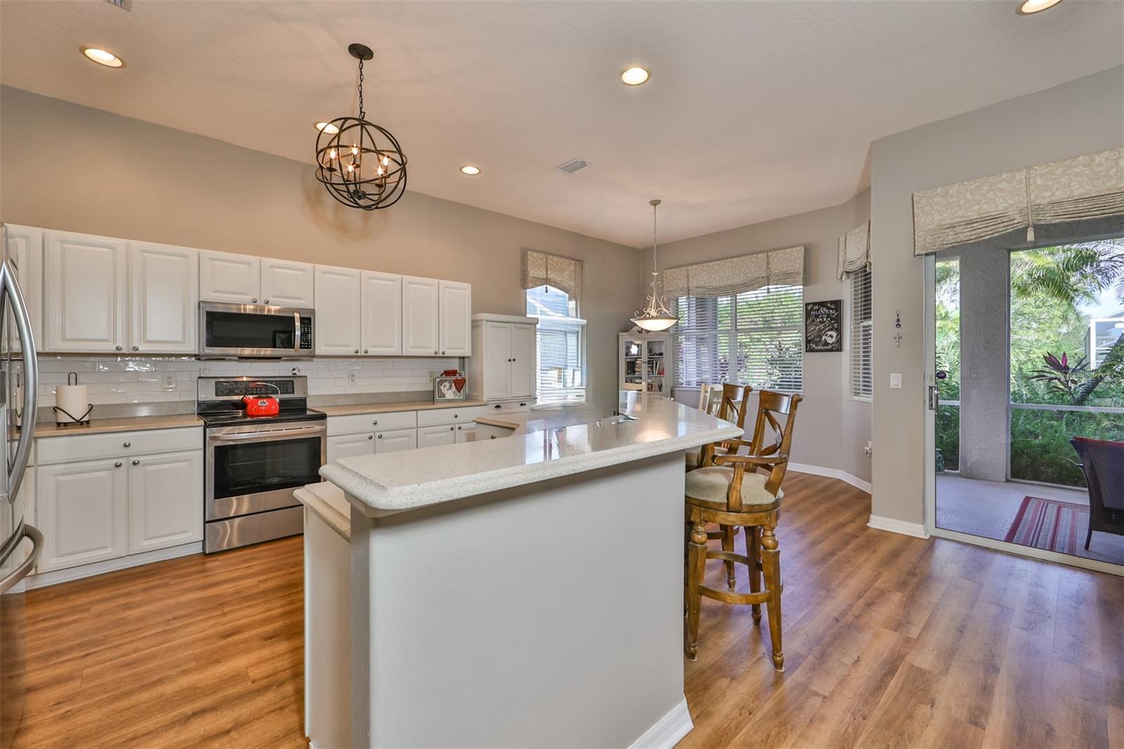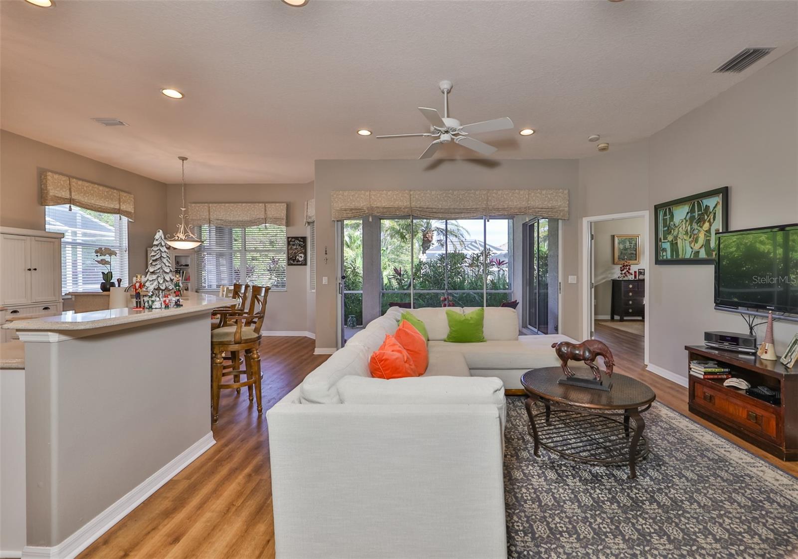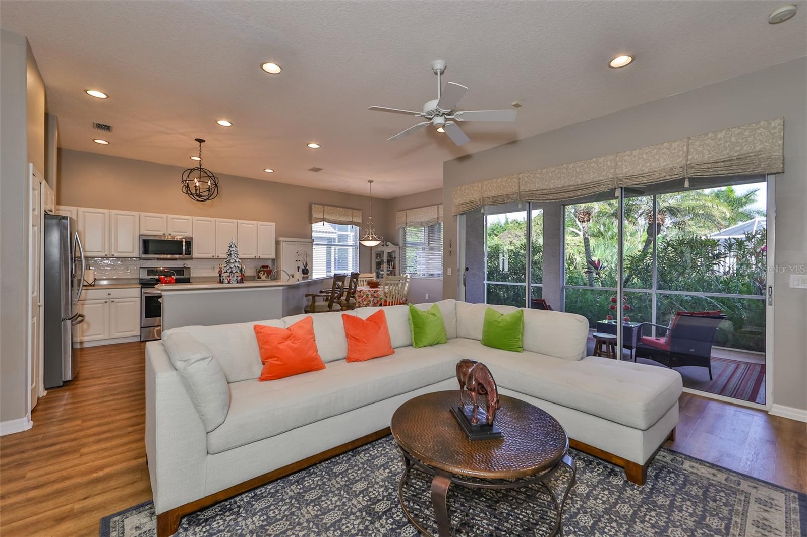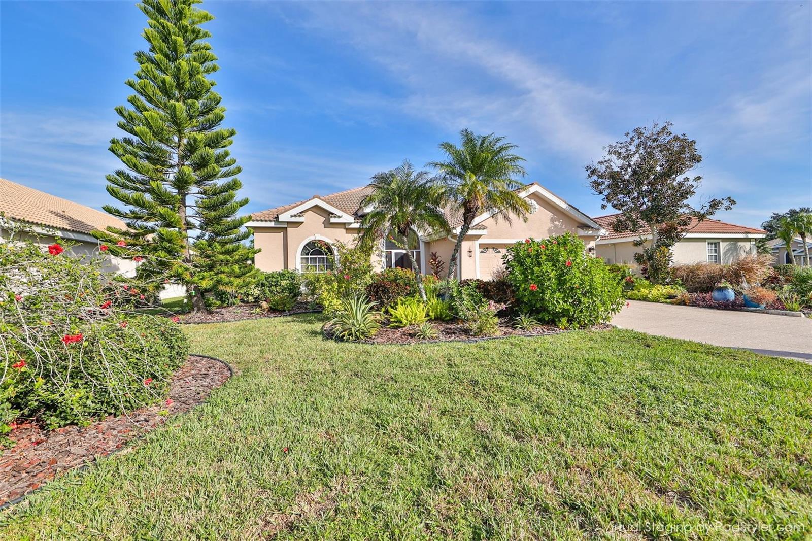 Welcome to your piece of paradise! Nestled in the serene Chaparral neighborhood of Mote Ranch, this executive-style home embodies the quintessential Florida lifestyle. Conveniently situated, it offers easy access to premium shopping and delectable restaurants in Sarasota and Manatee County and is just minutes away from some of Florida's most pristine beaches. As you approach the front walkway, lush tropical landscaping beckons you toward the entrance. Open the door and be prepared to be awestruck. Premier vinyl flooring seamlessly guides you through the home, accentuating the high ceilings and the spacious open floor plan. The extra-large foyer boasts a unique cove area that captures attention from the moment you step inside. To the left, a generously sized open-concept living and dining room awaits, creating the perfect setting for entertaining guests. To the right, a hallway leads to a full bathroom, flanked by two spacious bedrooms adorned with ceiling fans and ample closets. Continuing forward from the foyer, the expansive family room and kitchen seamlessly blend, featuring a dinette area overlooking the large, screened lanai. The kitchen, a culinary haven, boasts a pantry, a two-tiered island bar with cabinets, and a cozy seating area. A three-section sliding glass door in the living room opens to the lanai, surrounded by lush landscaping by nature preserves, providing a private and tranquil oasis. Adjacent to the living room lies the Owner’s suite. Step inside to discover a room adorned with a tray ceiling, creating a light and airy ambiance. The ensuite bathroom indulges with dual sink vanities, separated by makeup vanities, a spacious garden tub, a tiled walk-in shower, and a private toilet area. This bedroom further spoils with a spacious walk-in closet and a sliding glass door leading to the lanai, offering breathtaking views of your personal tropical retreat. Start your mornings with the picturesque sight of your lush surroundings or venture to the community amenity center. Take a refreshing dip in the heated pool, explore the community’s private launch area for kayaking or paddleboarding, or simply unwind and cast a line from the dock for a leisurely fishing experience. This property seamlessly combines luxury living with the allure of natural beauty, making it an unparalleled haven for those seeking the best of both worlds. Don't miss the opportunity to make this exquisite home your own!
