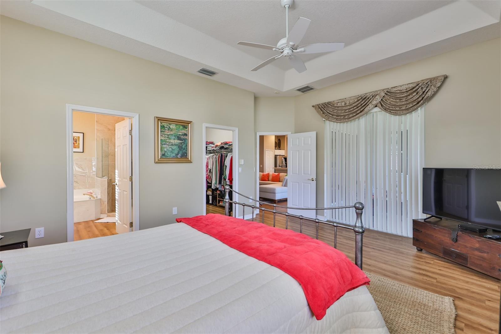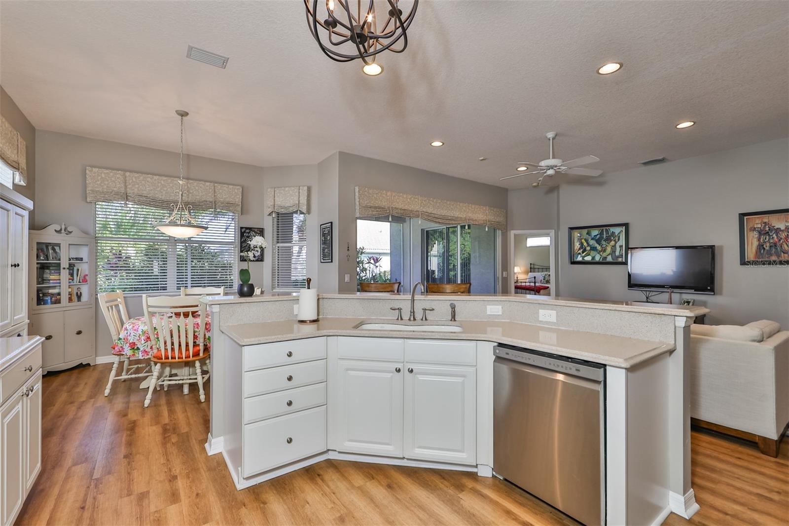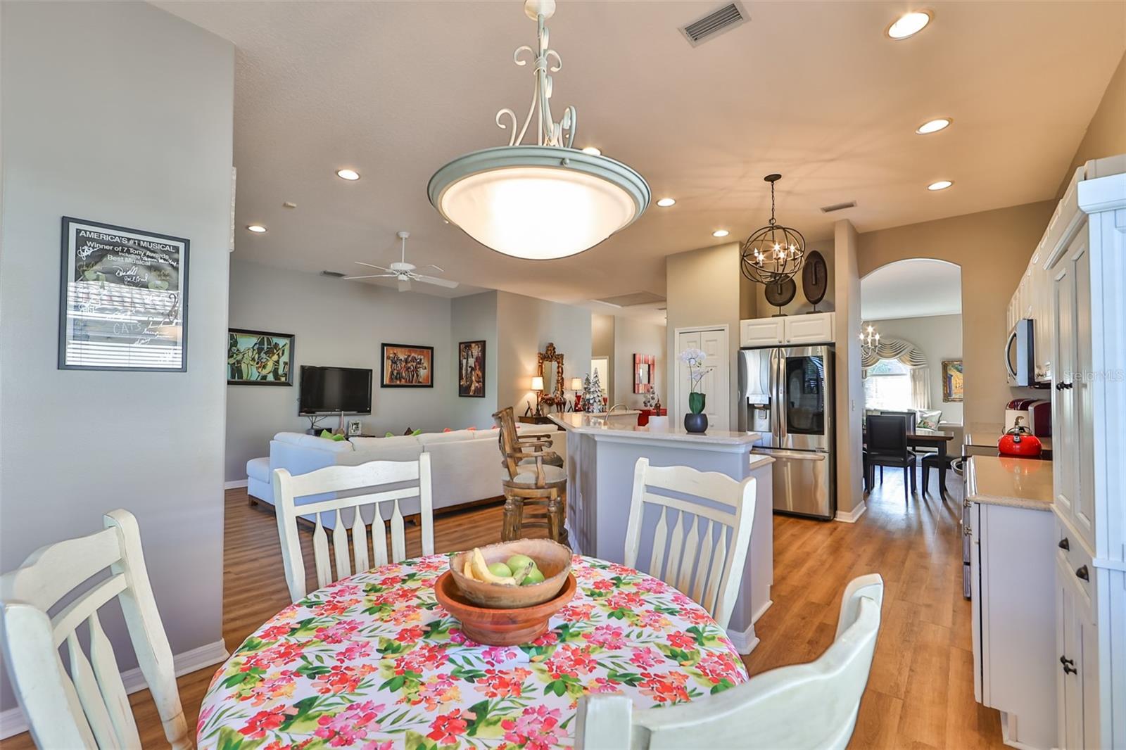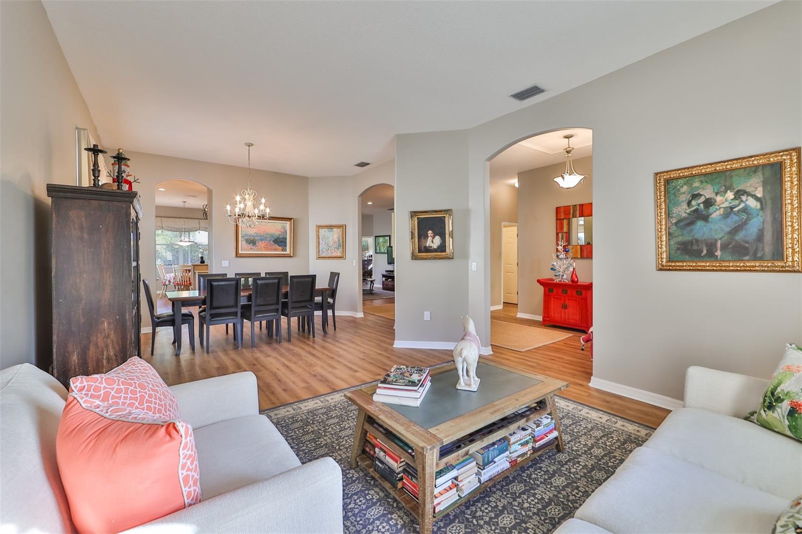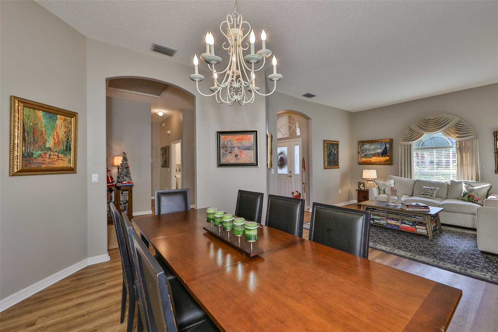 Welcome to your piece of paradise! Nestled in the serene Chaparral neighborhood of Mote Ranch, this executive-style home embodies the quintessential Florida lifestyle. Conveniently situated, it offers easy access to premium shopping and delectable restaurants in Sarasota and Manatee County and is just minutes away from some of Florida's most pristine beaches. As you approach the front walkway, lush tropical landscaping beckons you toward the entrance. Open the door and be prepared to be awestruck. Premier vinyl flooring seamlessly guides you through the home, accentuating the high ceilings and the spacious open floor plan. The extra-large foyer boasts a unique cove area that captures attention from the moment you step inside. To the left, a generously sized open-concept living and dining room awaits, creating the perfect setting for entertaining guests. To the right, a hallway leads to a full bathroom, flanked by two spacious bedrooms adorned with ceiling fans and ample closets. Continuing forward from the foyer, the expansive family room and kitchen seamlessly blend, featuring a dinette area overlooking the large, screened lanai. The kitchen, a culinary haven, boasts a pantry, a two-tiered island bar with cabinets, and a cozy seating area. A three-section sliding glass door in the living room opens to the lanai, surrounded by lush landscaping by nature preserves, providing a private and tranquil oasis. Adjacent to the living room lies the Owner’s suite. Step inside to discover a room adorned with a tray ceiling, creating a light and airy ambiance. The ensuite bathroom indulges with dual sink vanities, separated by makeup vanities, a spacious garden tub, a tiled walk-in shower, and a private toilet area. This bedroom further spoils with a spacious walk-in closet and a sliding glass door leading to the lanai, offering breathtaking views of your personal tropical retreat. Start your mornings with the picturesque sight of your lush surroundings or venture to the community amenity center. Take a refreshing dip in the heated pool, explore the community’s private launch area for kayaking or paddleboarding, or simply unwind and cast a line from the dock for a leisurely fishing experience. This property seamlessly combines luxury living with the allure of natural beauty, making it an unparalleled haven for those seeking the best of both worlds. Don't miss the opportunity to make this exquisite home your own!