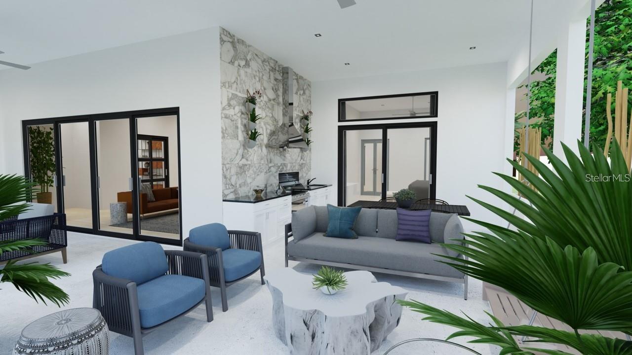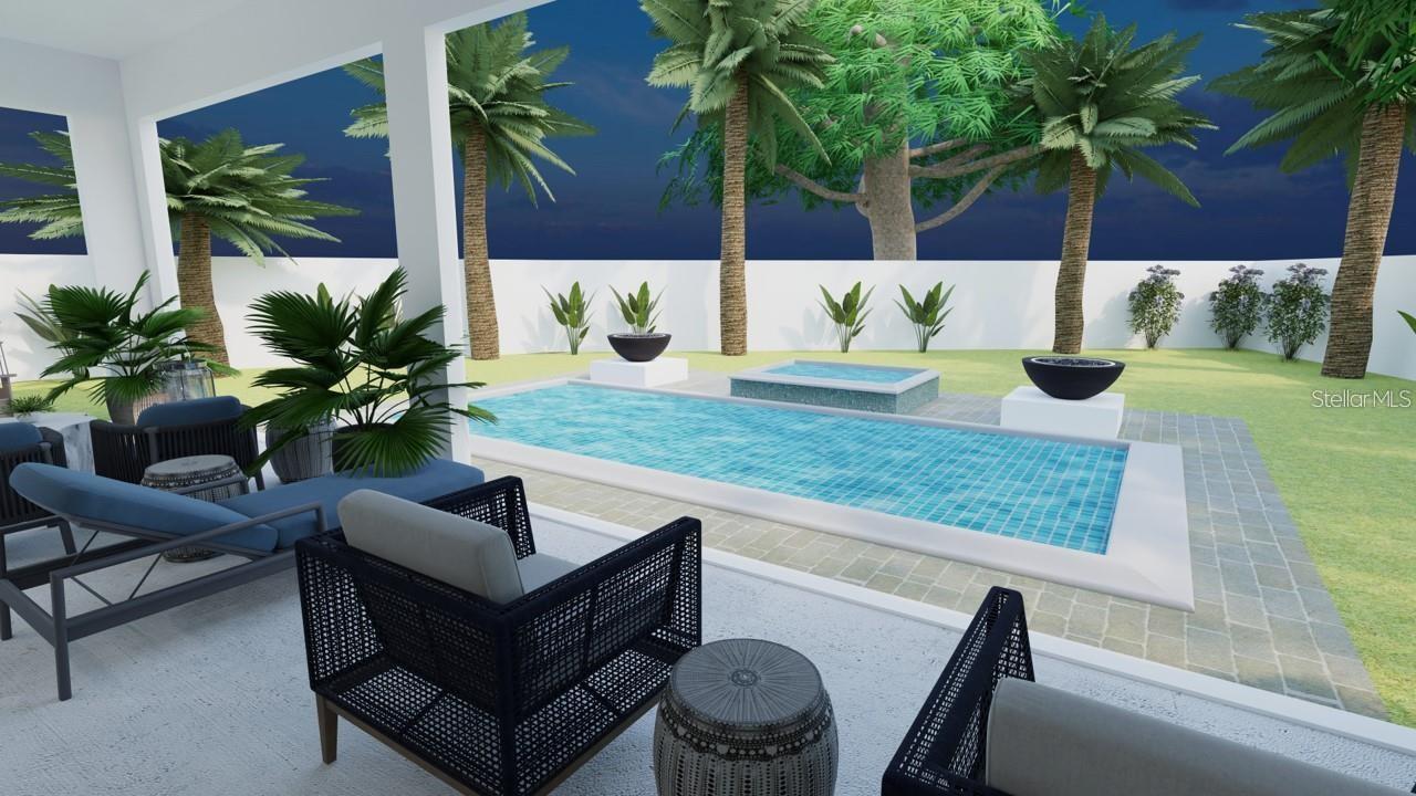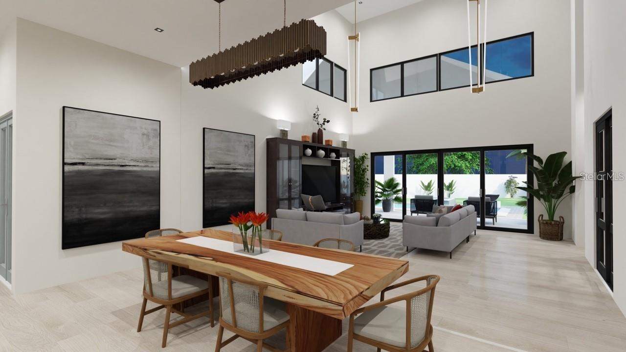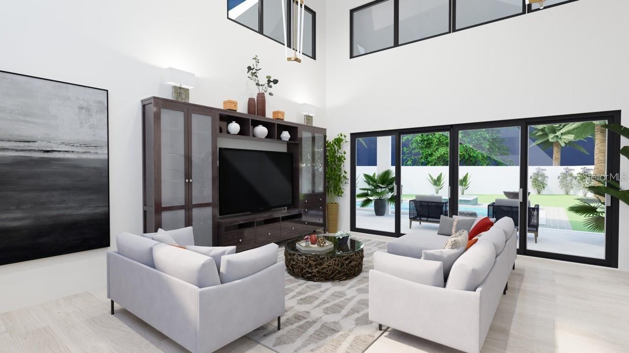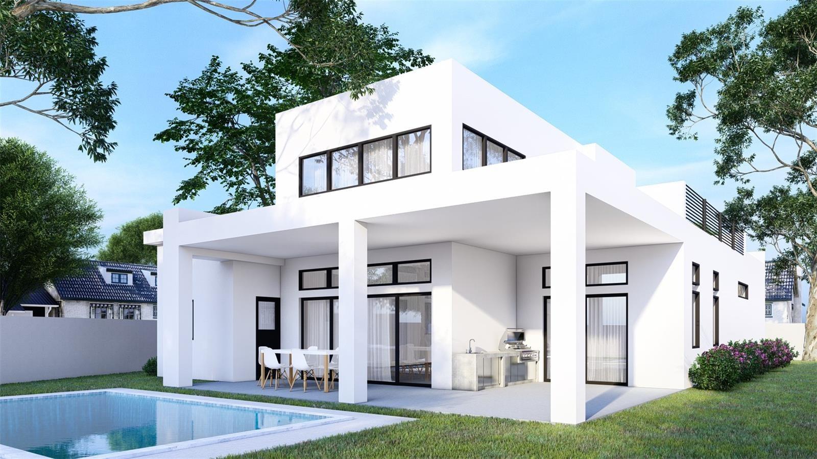 One or more photo(s) has been virtually staged. Under Construction. Beautiful Urban Contemporary home with globally inspired design by award-winning Valencia Builders Group. The “Brooklyn” is a 3,167 square foot, 3-bedroom, 4-full bath, 2-car garage home on a cul-de-sac with office/den/4th bedroom and inviting pool/spa/outdoor kitchen on a quiet side street within walking distance of downtown Sarasota. The new home was designed with a focus on the grand indoor living area, with dramatic 20 ft ceilings and an oversized kitchen, dining, and great room combination - perfect for entertaining family and friends. An oversized driveway leads a spectacular entranceway, with contemporary yet soft finishes including woodwork and stacked stone. Once inside you’ll be immediately struck by soaring ceilings, large open spaces, luxurious finishes & features, a modern yet comfortable feel, and picturesque views of the pool and large yard beyond. The gourmet kitchen features a huge center island, white custom wood cabinetry w/soft close drawers, luxurious quartz countertops, stainless steel appliances, and a 6-burner natural gas range. The kitchen opens into the large great room, ideal for engaging with family and friends, with a coffered/beamed treatment on the ceilings. A den/office space at the front of the home add a flexible space for kids, working from home, or overflow 4th bedroom with closet and nearby full bath if needed. The primary suite is on the main floor and offers total seclusion, including a huge walk-in closet and glamorous en suite bath with dual vanity, huge walk-in shower, and separate tub. Two additional en suite bedrooms upstairs, with an open to below loft that carries light through and gives the homes a stately appeal. The designer’s favorite area is the upstairs outside balcony, an outside retreat providing a “terrace in the trees” sanctuary for your guests. Wood floors throughout soften the modern design, with tile in the baths, and carpet under your feet in the bedrooms, all replaceable at this point in construction. Impact-rated hurricane windows and doors. Options for wine walls, dry/wet bars, and built-in features. The list price includes almost all the bells and whistles but schedule a meeting now to finalize your choices. Photos are artist renderings and may include furnishings and features not included.