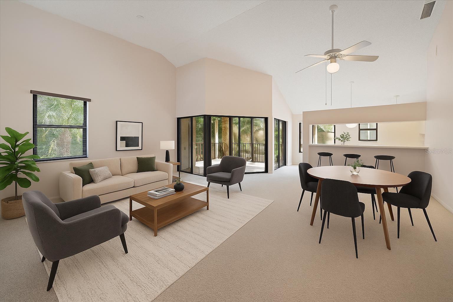 One or more photo(s) has been virtually staged. Discover the perfect blend of space, comfort, and opportunity in this desirable three-bedroom, two-bath end-unit condominium located in the highly sought-after gated community of The Landings. Enter through the welcoming first-level foyer and ascend to the light-filled main living area, where vaulted 13-foot ceilings create an airy, open ambiance. With approximately 1,775 square feet of living space, this residence offers a well-designed split floor plan that ensures privacy while maintaining an effortless flow for everyday living and entertaining. The living and dining areas seamlessly connect to the kitchen, complete with a convenient pass-through bar—perfect for hosting gatherings or casual dining. The spacious primary suite serves as a relaxing retreat, featuring a large walk-in closet and an oversized ensuite bath with dual sinks and a spa-inspired shower. Two inviting guest bedrooms provide comfortable accommodations for family or visitors. Enjoy peaceful moments on the screened lanai, surrounded by lush natural scenery, or take advantage of the attached one-car garage for added convenience. As a resident, you’ll have access to The Landings Racquet Club, offering 8 Har-Tru tennis courts, pickleball, a heated swimming pool and spa, fitness center, meeting rooms, and a library—the perfect extension of your home and lifestyle. Set within a secure, 24-hour guard-gated community, The Landings is renowned for its scenic walking trails, lush tropical setting, and direct access to Sarasota Bay. Ideally situated near top-rated schools, world-class dining, shopping, arts, and the beautiful Gulf Coast beaches, this community embodies Sarasota living at its finest.
