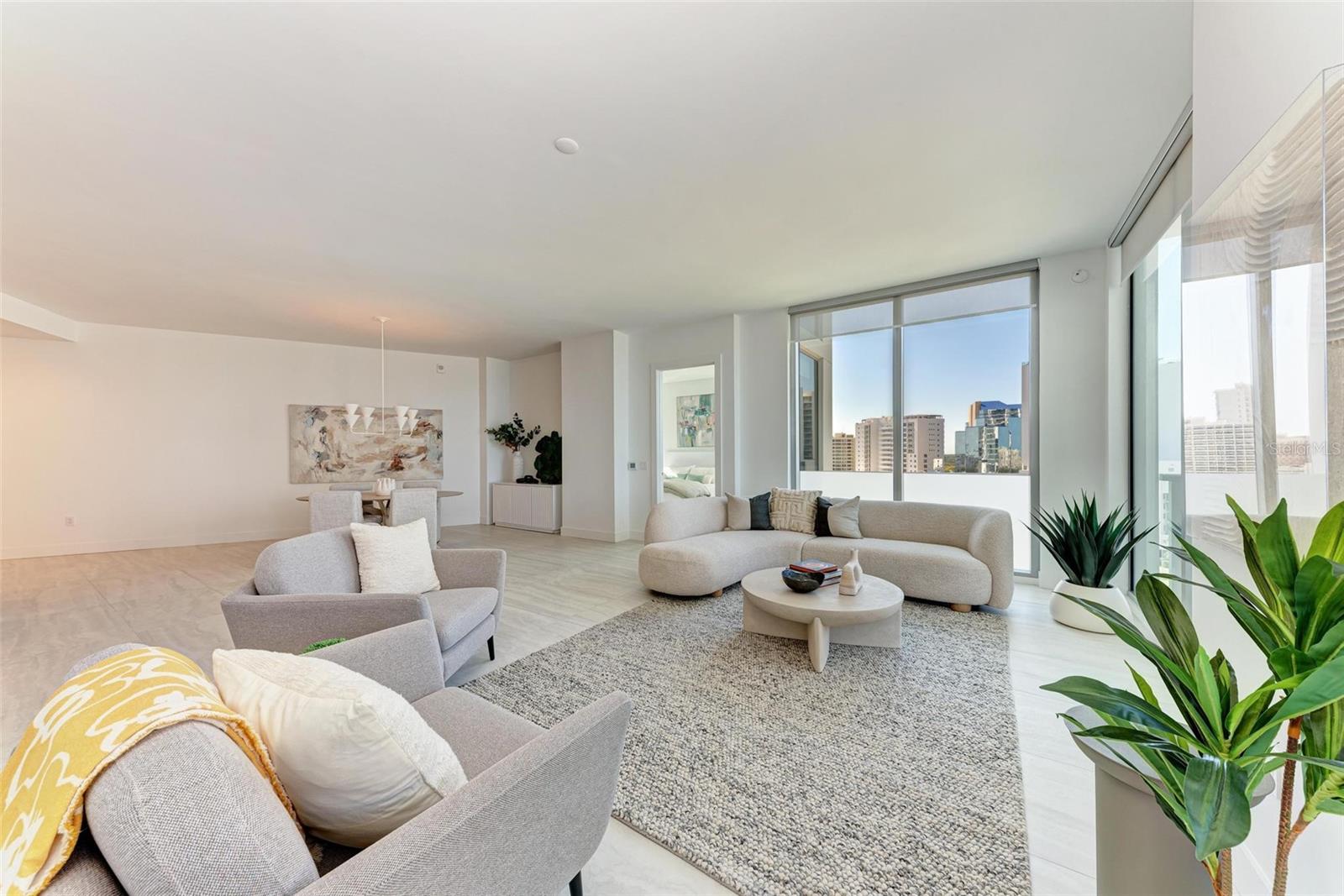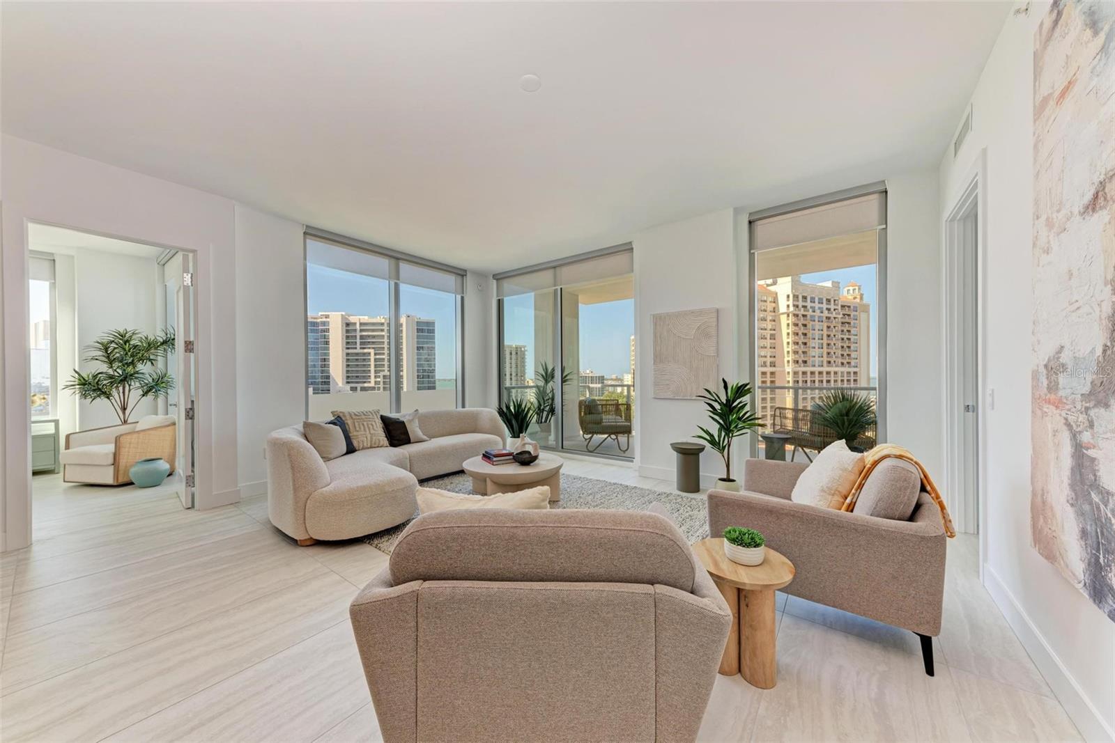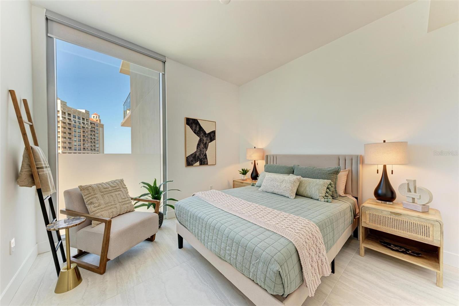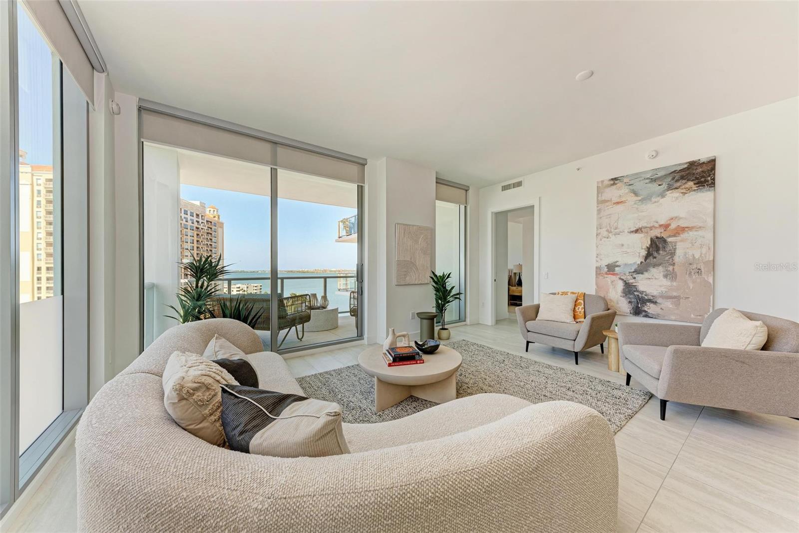 PRICE IMPROVEMENT! Welcome home to this newly furnished and beautifully appointed condominium in the highly sought after K floorplan in the BAYSO! Recently enhanced with sleek, remote operated blinds throughout, as well as a custom kitchen and laundry room backsplash, this unit is being sold turnkey, if desired. BAYSO is Sarasota’s newest downtown crown jewel in luxury condominium living. Nestled within the newly designed Quay, residents will enjoy the convenience of living close to all of the culinary and cultural delights that downtown Sarasota has come to be known for. Located on the 8th floor, this condominium boasts one of the few western facing waterfront views in this unique and spacious 2,185 square foot split plan design. Immerse yourself in this beautiful residence surrounded by impact rated floor to ceiling windows and sliding glass doors with a European inspired contemporary kitchen with Italkraft cabinetry, quartz countertops and an upgraded JennAir stainless steel appliance package. The spacious owners’ suite contains two walk- in closets with a luxurious spa like ensuite with double vanities, soaker tub and separate oversized shower. The second bedroom also provides its own privacy with a full bathroom and walk-in closet. The bonus den offers flexibility for more guest space or a home office with an adjacent third full bathroom for your guests. The BAYSO features an abundance of amenities as you enter the inviting 1st floor lobby with 24/7 attendants, onsite property management, a beautiful club lounge with a catering kitchen for events, a state-of-the-art fitness center and movement studio for personal training or group classes and a private conference room including several common glass enclosed workstations for residents' private use. The 5th level highlights include the elevated resort style pool and spa, a community recreation area with a pergola-covered grilling station and a dog park for any pet owners to enjoy while being surrounded by picturesque views. Ensuring convenience, the property also includes two (2) highly sought after parking spaces, extra owner humidity-controlled storage on the first level as well as a separate bicycle storage area. Enjoy walks next door at The Bay Sarasota, on one of the many walking paths along the 53 acre waterfront park for a short stroll, take in some live music or simply bask in the beauty of the Sarasota sunsets. Discover BAYSO today and experience urban luxury living at its finest.
