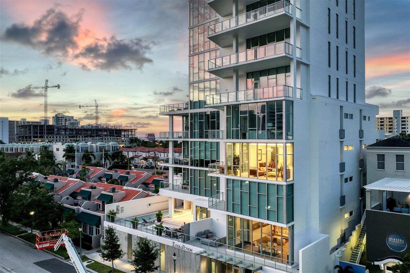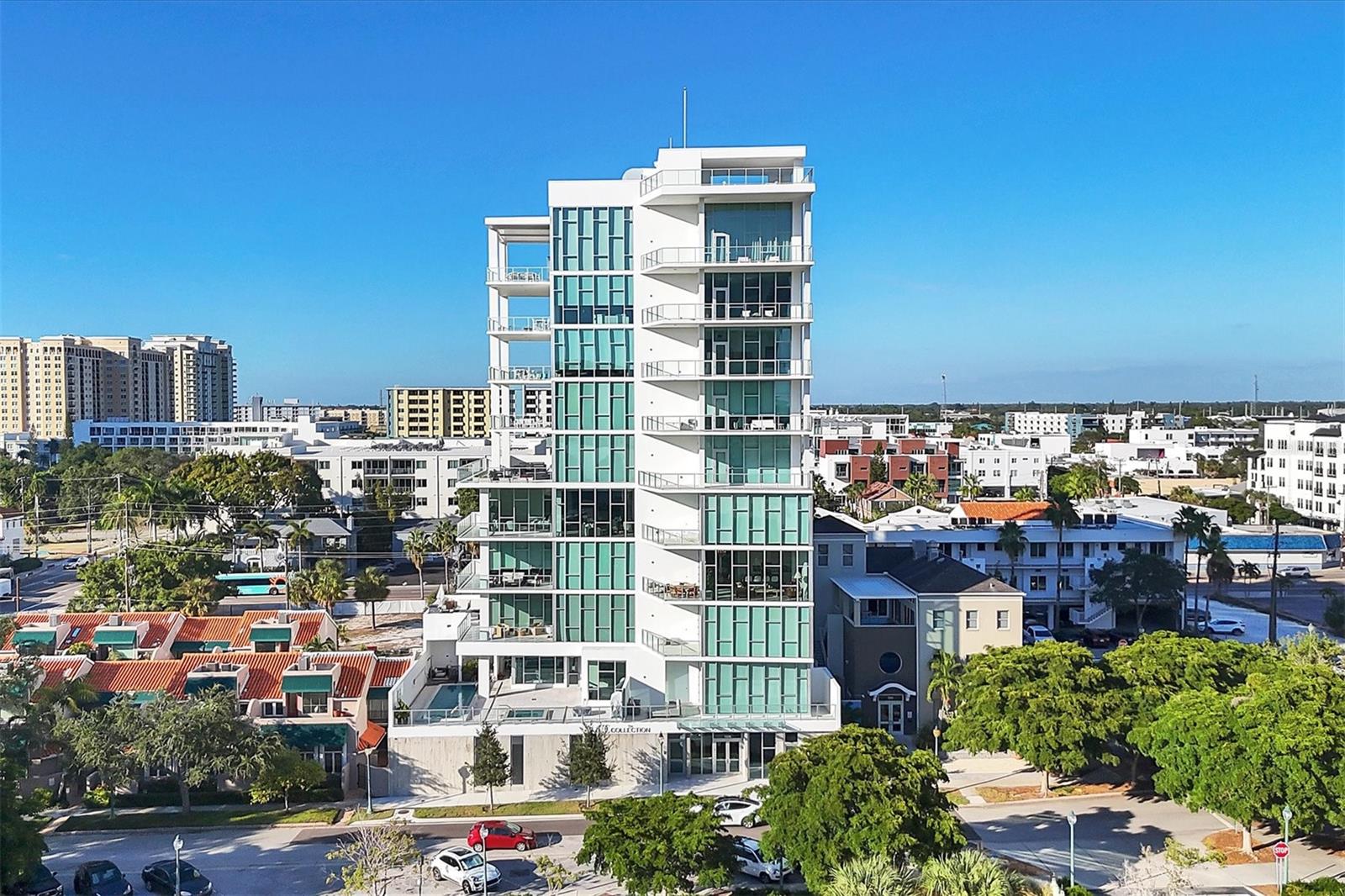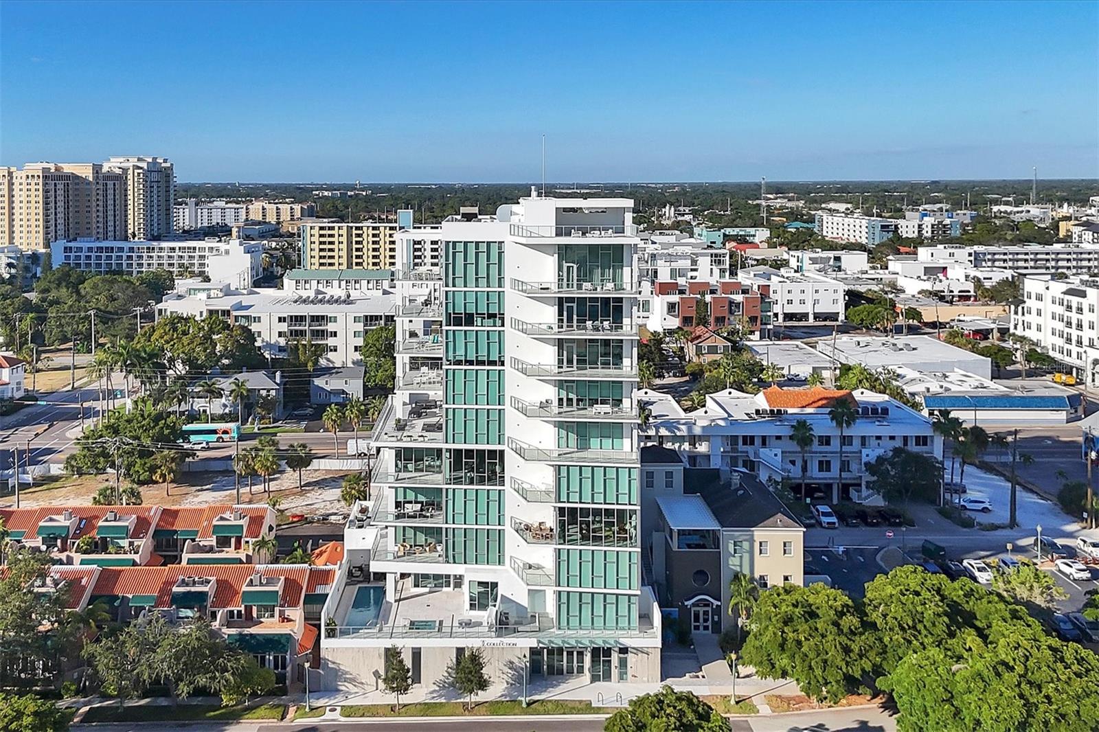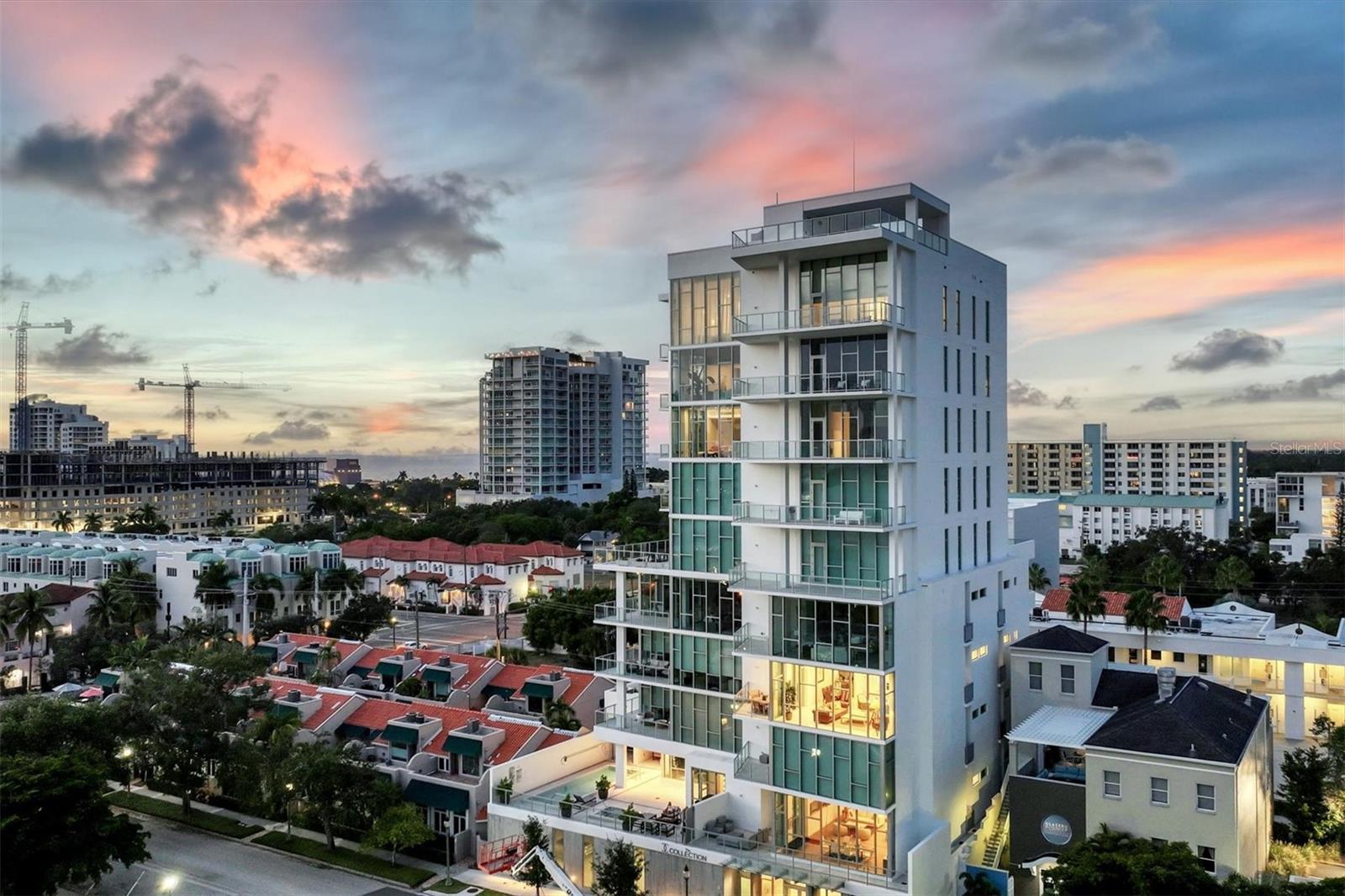 Absolutely exquisite condominium at The Collection Residences in Downtown Sarasota is now available! Perfectly appointed and finished with the most updated styles, this picture-perfect blend of modern luxury and convenience is in a prime location of Sarasota. Situated in the heart of The Art District in Downtown Sarasota, this beautifully finished home provides easy access to various cultural, dining and entertainment options, including restaurants, libraries, theaters, the marina and world-famous white sand beaches. Boasting 2550 square feet of living space, the residence has over 12-foot airy ceilings and floor-to-ceiling windows featuring remote controlled shades. The condo offers breathtaking city and sunset views with two private balconies and terrace for relaxation and enjoyment. Private elevator entrance is included for convenience, exclusivity and security. Modern and contemporary kitchen design is integrated into the open great room, perfect for entertainment and comfort. An entertainer's dream, the kitchen and great room boast light and bright cabinetry, quartz countertops, and built-in stainless-steel Miele appliances. Within the kitchen are a Miele GAS range, a coffee maker connected to the water line and a gorgeous island providing plenty of room for dining and cooking. The dining room has a fantastic bar with wine fridge to make your favorite night cap. The primary suite boasts a massive walk in closet and spacious primary bath. Both secondary bedrooms offer en suite bathrooms for the most comfort and convenience. Each bath has floating, lighted vanities and floor to ceiling marble tiling. The entire home has beautiful, enlarged tile throughout! Enjoy the magic of the city on your terrace while listening to music from the built in Sonos system which operates in every room throughout the house! Or take an evening stroll to one of the endless number of restaurants, the Selby Library, Whole Foods, the Ringling Bridge, the Sarasota Opera, the Marina, the Florida Studio Theatre, and more. The location of this home is truly incomparable. The Collection Condominium offers a wide array of luxurious amenities, including lap pool and hot tub for relaxation, a spacious deck with day beds, cabanas, and lounge chairs for outdoor enjoyment. A fire pit with designer furnishings, barbeque grill and custom amenities all create a functional and cozy atmosphere for outdoor entertaining. It also has a professionally designed fitness and yoga facility, sauna, boardroom, and restrooms. The Social Lounge area is directly connected to the outdoor amenity deck for social gatherings. The building offers secure, underground parking with two designated spaces, and a temperature-controlled storage unit for residents' convenience. The Collection Residences offer a rare combination of boutique luxury (only 12 residences), a serene environment in a quiet neighborhood, and access to an abundance of nearby amenities. It's an ideal opportunity for those seeking an urban yet luxurious lifestyle in Sarasota.