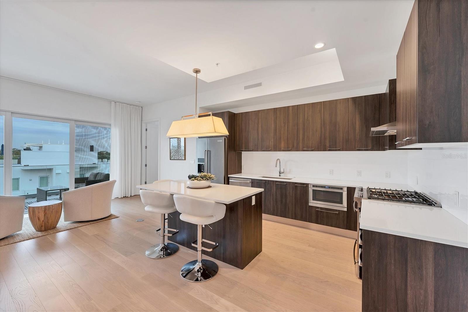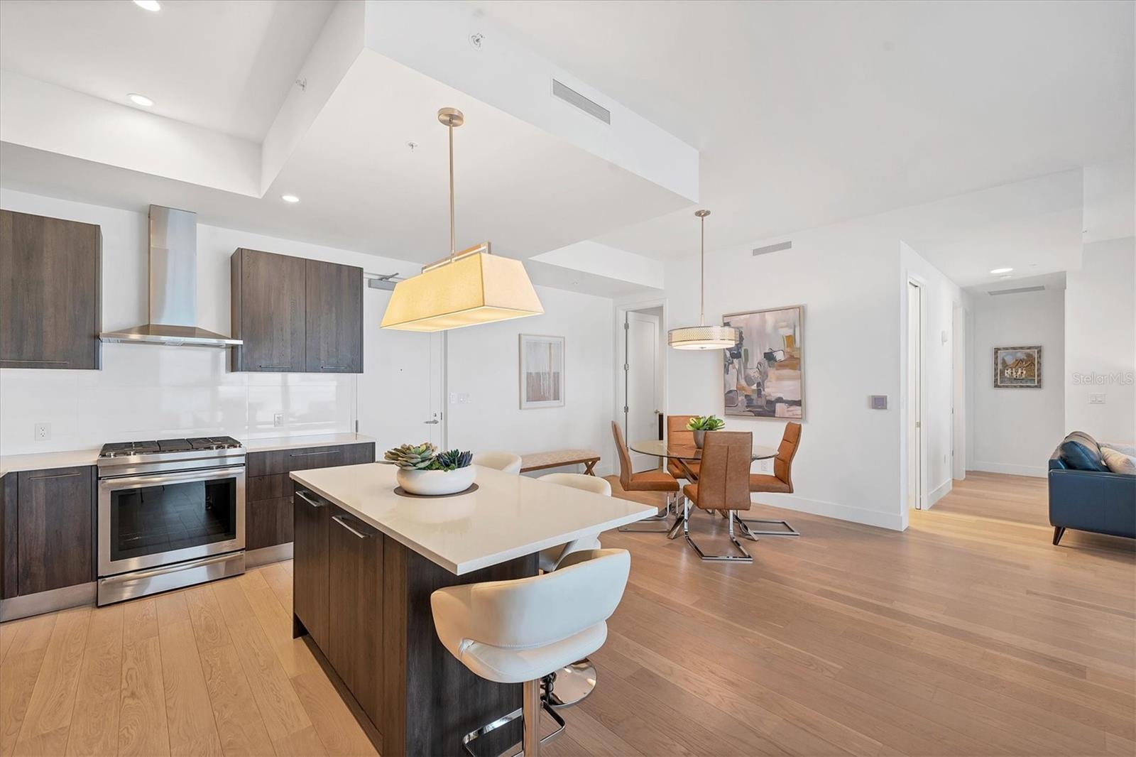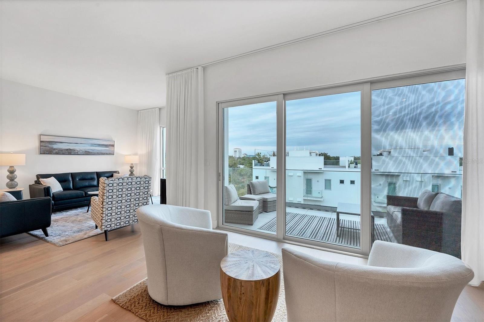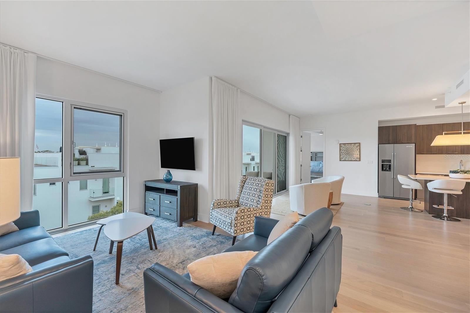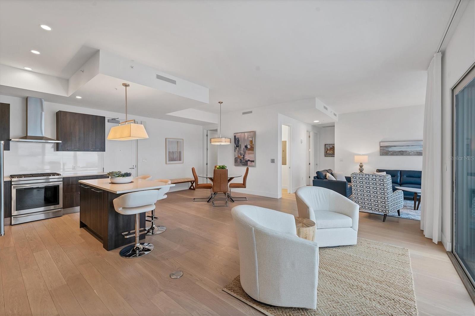 This elegant furnished residence, located on the top floor of the exclusive Orange Club community, seamlessly combines design with comfort. Positioned in an ideal downtown location within a boutique building of only 15 residences, this condominium is known for its Beach House floor plan and boasts over 1,400 square feet of living space. The open-concept layout extends to the central living space and opens to the balcony through floor to ceiling sliders. The expansive private balcony, complete with an overhead fan and a natural gas hook-up, provides comfortable lounge and dining space with the option for an exterior grill. The kitchen is thoughtfully designed for both efficiency and entertaining, equipped with a natural gas cooktop, wraparound countertops, and a large island for additional space and seating. Premium dark wood-grain cabinetry and stainless-steel appliances contribute to the home's luxurious feel. Adjacent to the kitchen is the open and spacious dining area. On one side, the primary suite spans the width of the residence, featuring a large, light-filled bedroom leading to a spa-inspired ensuite bathroom and an enormous walk-in closet. The primary bathroom showcases a glass-enclosed walk-in shower and an extra-long floating double vanity with ample built-in storage. Modern design elements, such as large-scale porcelain tiles, extend from the bathroom floor to a feature wall above the vanity. Currently, one bedroom serves as a designated study, easily transformable into guest space or a private media den. Positioned for privacy, the additional bedrooms are on the opposite side of the home, separated from the primary suite by the living space. Luxurious design elements throughout include luxury vinyl flooring, premium fixtures, and automated Lutron shades. In addition to the deeded and assigned covered parking space, multiple guest parking spaces are available on the property. Climate-controlled storage is on the ground level, and Orange Club residents enjoy access to a heated pool and patio area. Perfectly located near the historical Burns Court neighborhood and within a short walking distance of downtown and Sarasota Bay, Orange Club provides the perfect setting for experiencing urban amenities while enjoying a sense of privacy and tranquility.