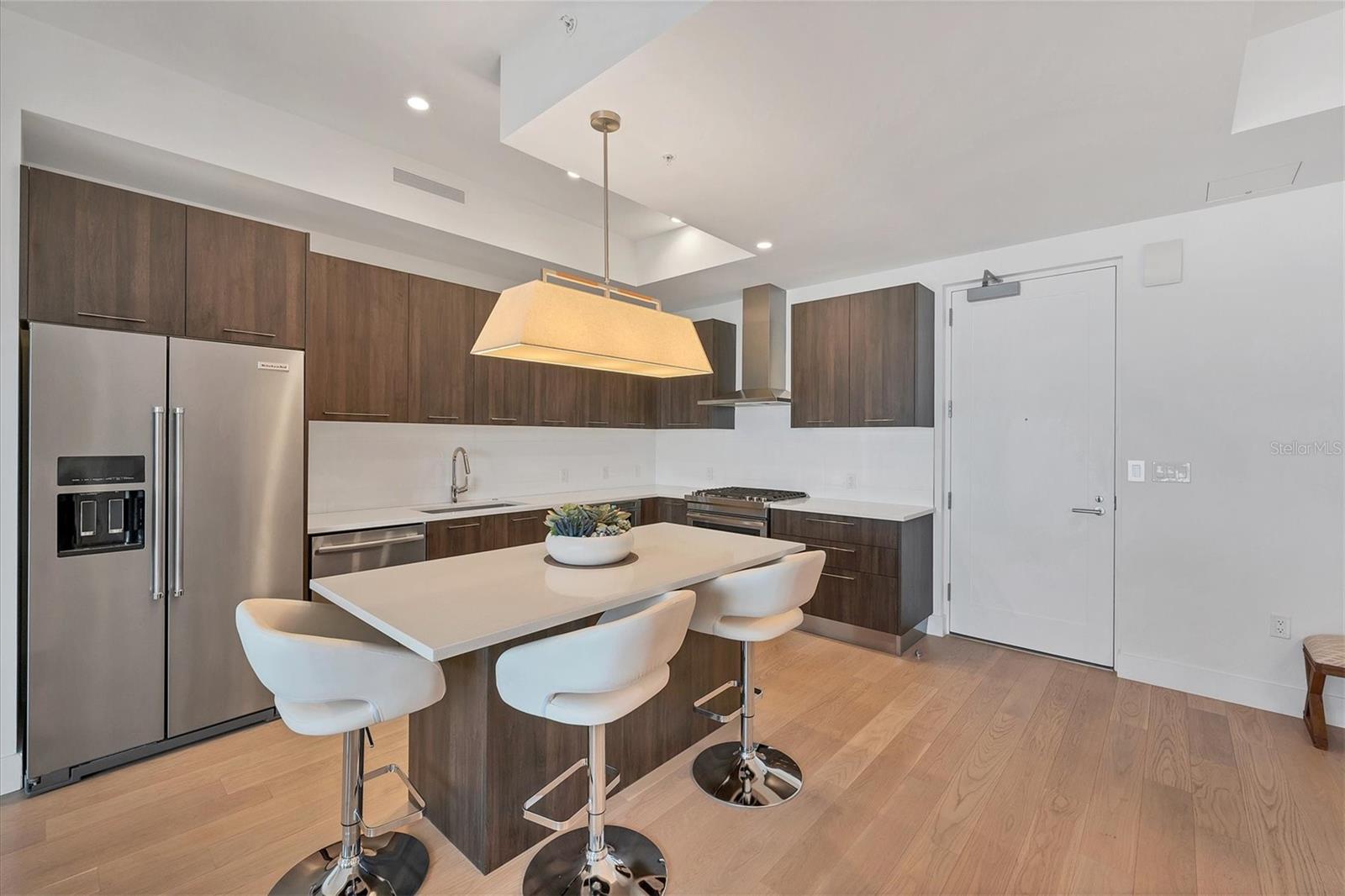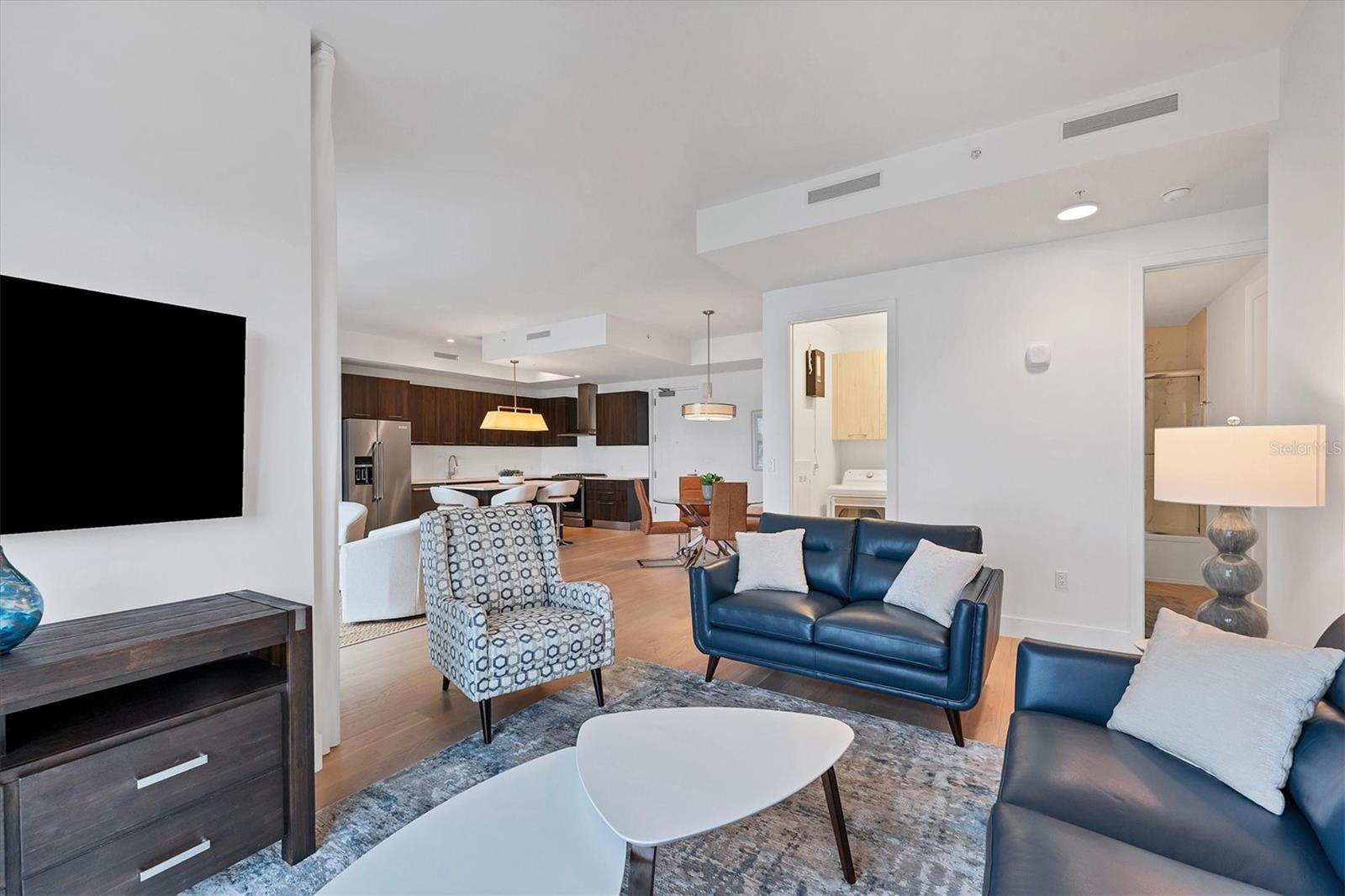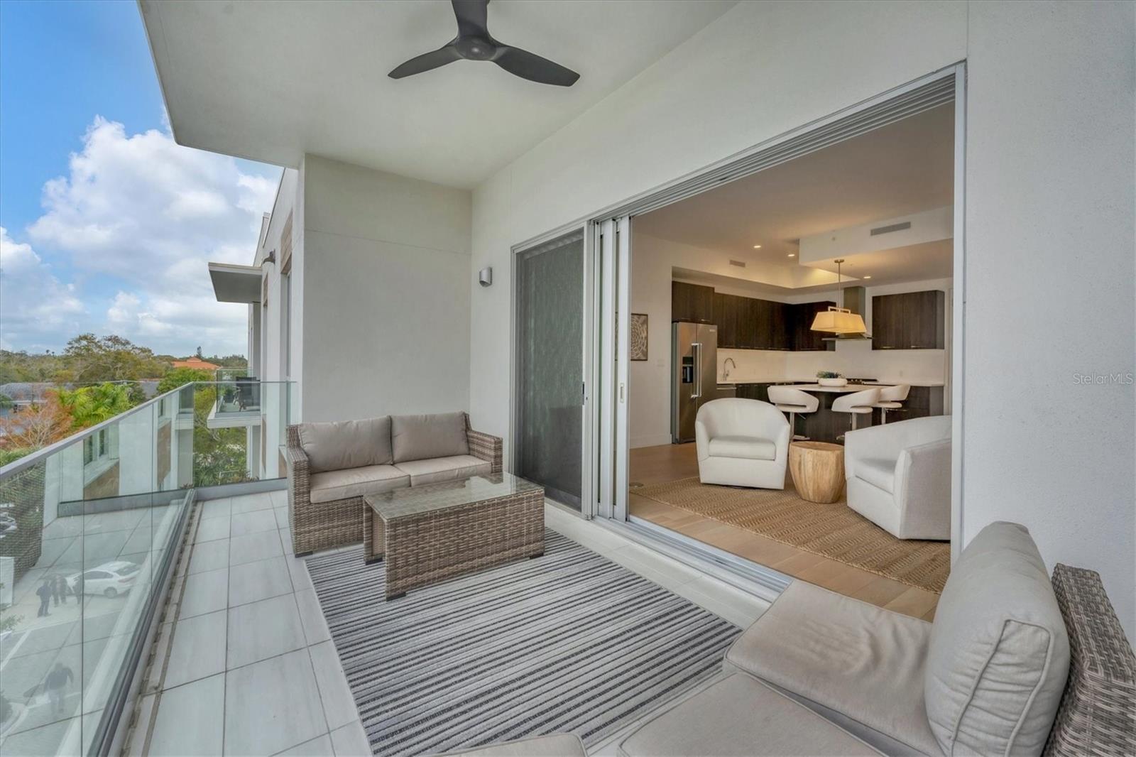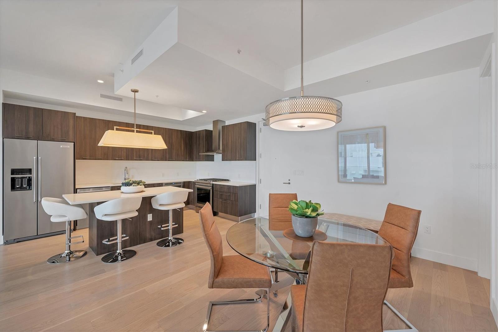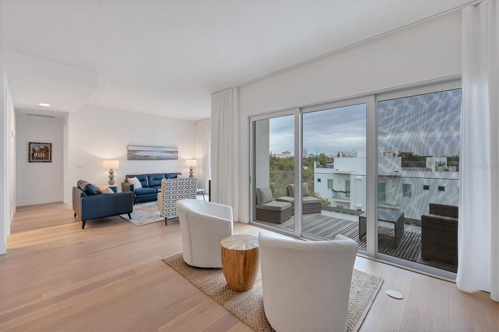 This elegant furnished residence, located on the top floor of the exclusive Orange Club community, seamlessly combines design with comfort. Positioned in an ideal downtown location within a boutique building of only 15 residences, this condominium is known for its Beach House floor plan and boasts over 1,400 square feet of living space. The open-concept layout extends to the central living space and opens to the balcony through floor to ceiling sliders. The expansive private balcony, complete with an overhead fan and a natural gas hook-up, provides comfortable lounge and dining space with the option for an exterior grill. The kitchen is thoughtfully designed for both efficiency and entertaining, equipped with a natural gas cooktop, wraparound countertops, and a large island for additional space and seating. Premium dark wood-grain cabinetry and stainless-steel appliances contribute to the home's luxurious feel. Adjacent to the kitchen is the open and spacious dining area. On one side, the primary suite spans the width of the residence, featuring a large, light-filled bedroom leading to a spa-inspired ensuite bathroom and an enormous walk-in closet. The primary bathroom showcases a glass-enclosed walk-in shower and an extra-long floating double vanity with ample built-in storage. Modern design elements, such as large-scale porcelain tiles, extend from the bathroom floor to a feature wall above the vanity. Currently, one bedroom serves as a designated study, easily transformable into guest space or a private media den. Positioned for privacy, the additional bedrooms are on the opposite side of the home, separated from the primary suite by the living space. Luxurious design elements throughout include luxury vinyl flooring, premium fixtures, and automated Lutron shades. In addition to the deeded and assigned covered parking space, multiple guest parking spaces are available on the property. Climate-controlled storage is on the ground level, and Orange Club residents enjoy access to a heated pool and patio area. Perfectly located near the historical Burns Court neighborhood and within a short walking distance of downtown and Sarasota Bay, Orange Club provides the perfect setting for experiencing urban amenities while enjoying a sense of privacy and tranquility.